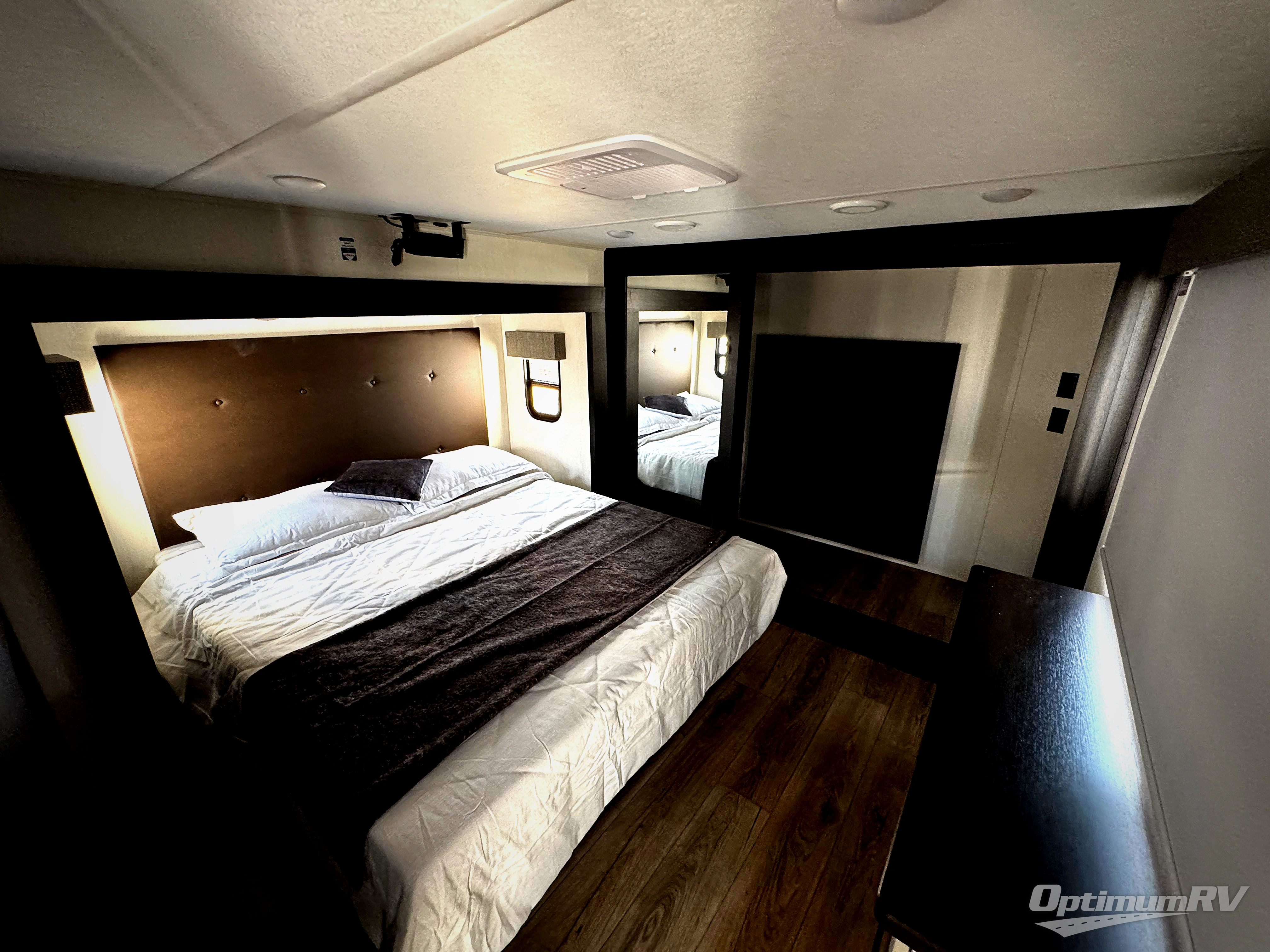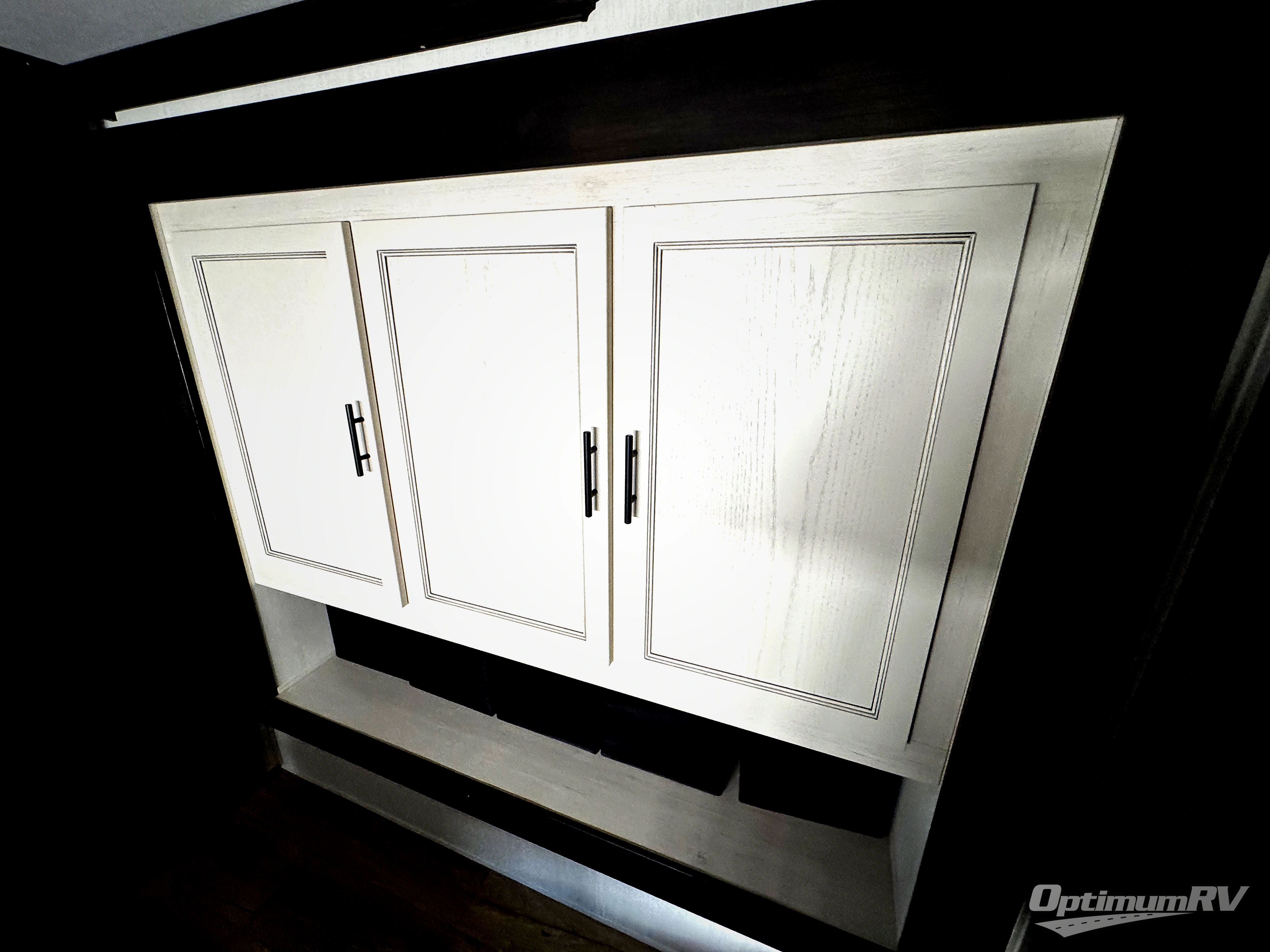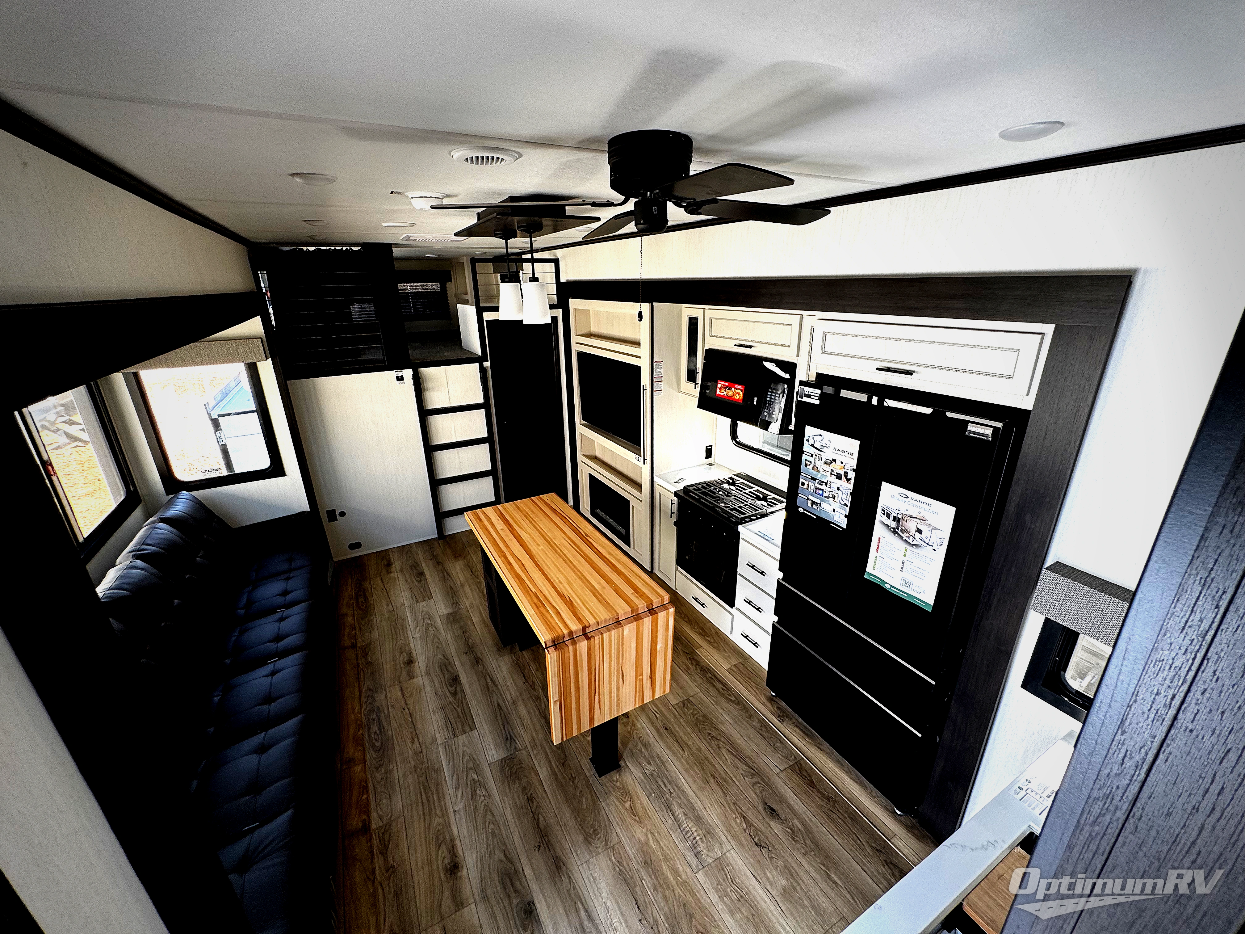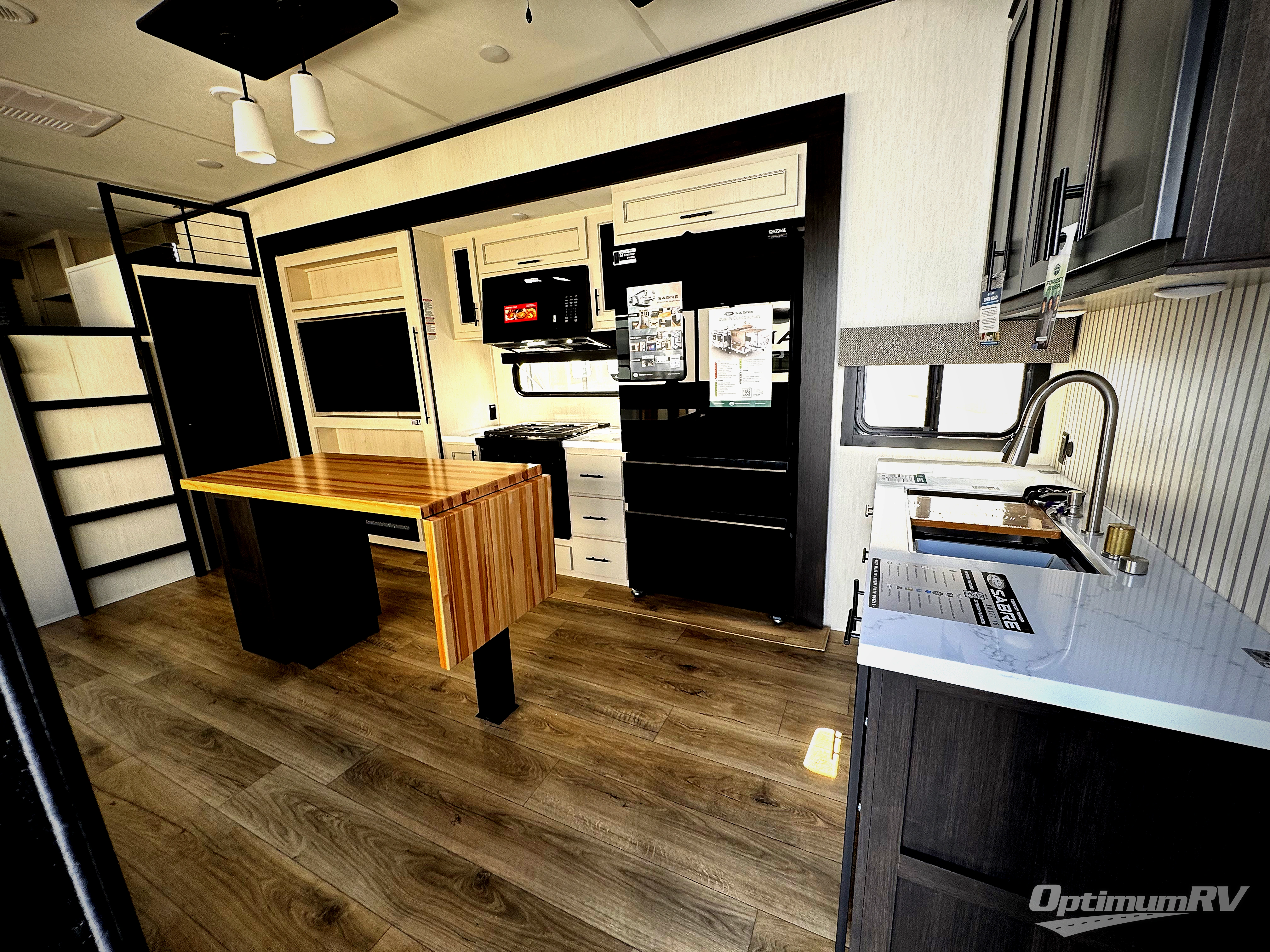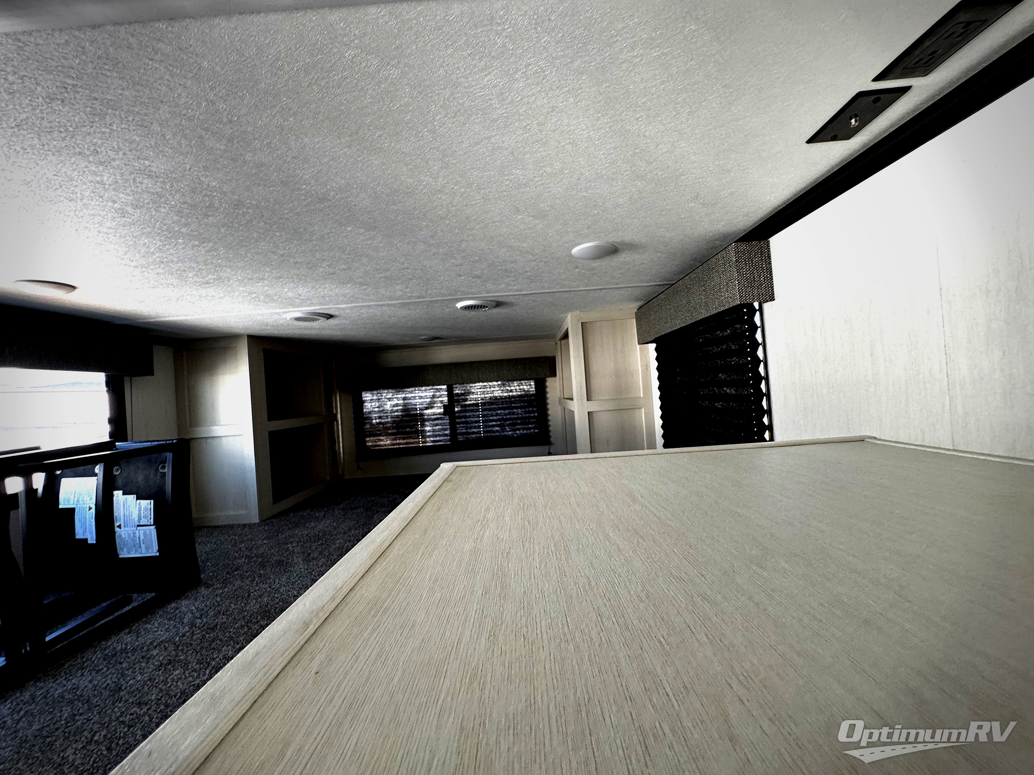 Are you looking for a fifth wheel where you can bring along your neighbor friends? You can do just that since there are two bedrooms in this unit, one of which includes a master bath with its own exterior entry door! The front bedroom is right next to the second full bath for convenience, and includes a camper king bed slide, a dresser, and front wardrobe. The rear master bedroom has a queen bed slide out across from a second slide for more floor space, and there is a loft above this room for more sleeping or storage space. Everyone can meet in the middle kitchen and living room since there are recliners, a ceiling fan, and kitchen island with four chairs. There is also storage below the island for kitchen necessities, and the hidden pantry behind the TV will be perfect for snacks, board games and more!