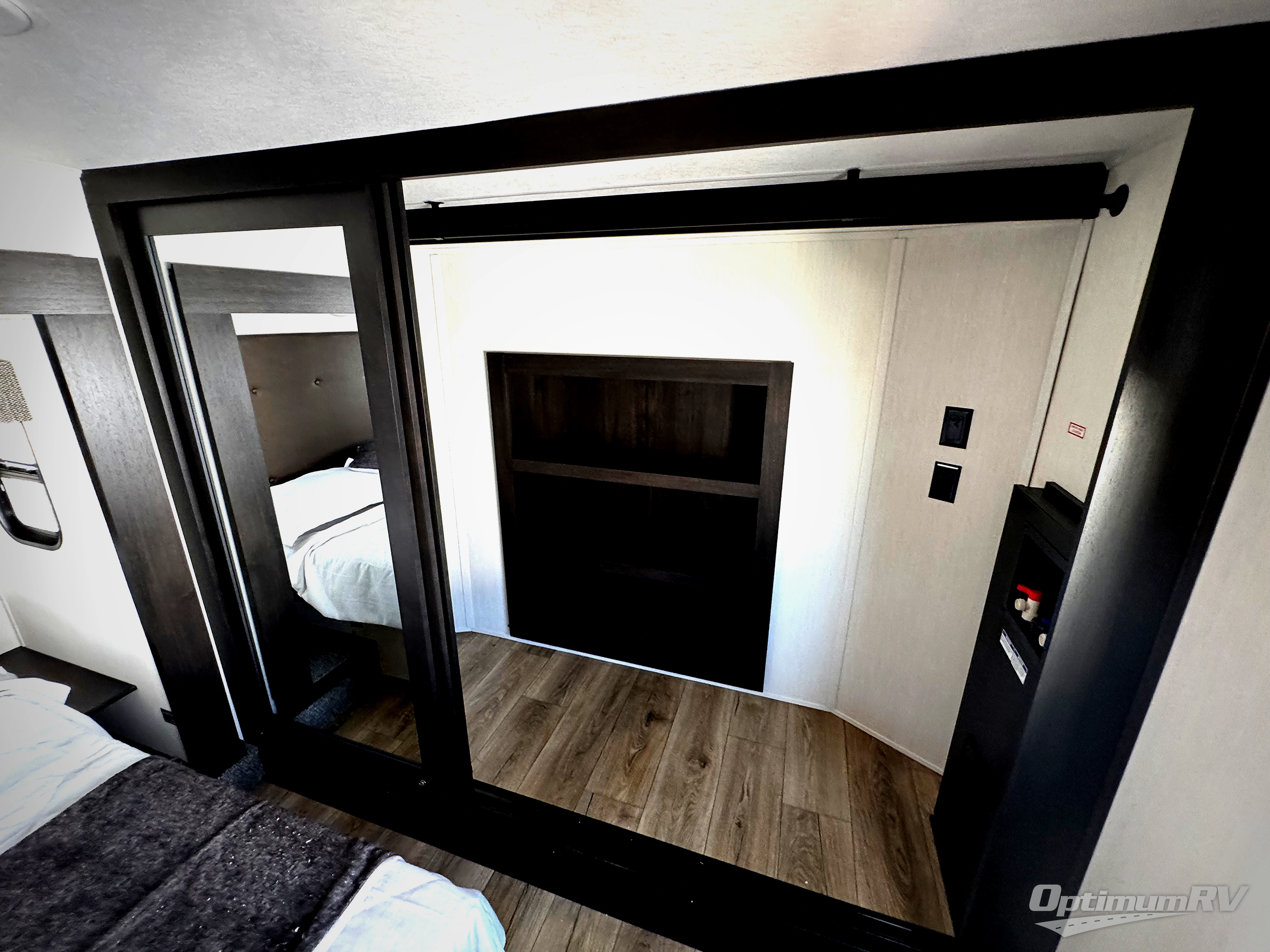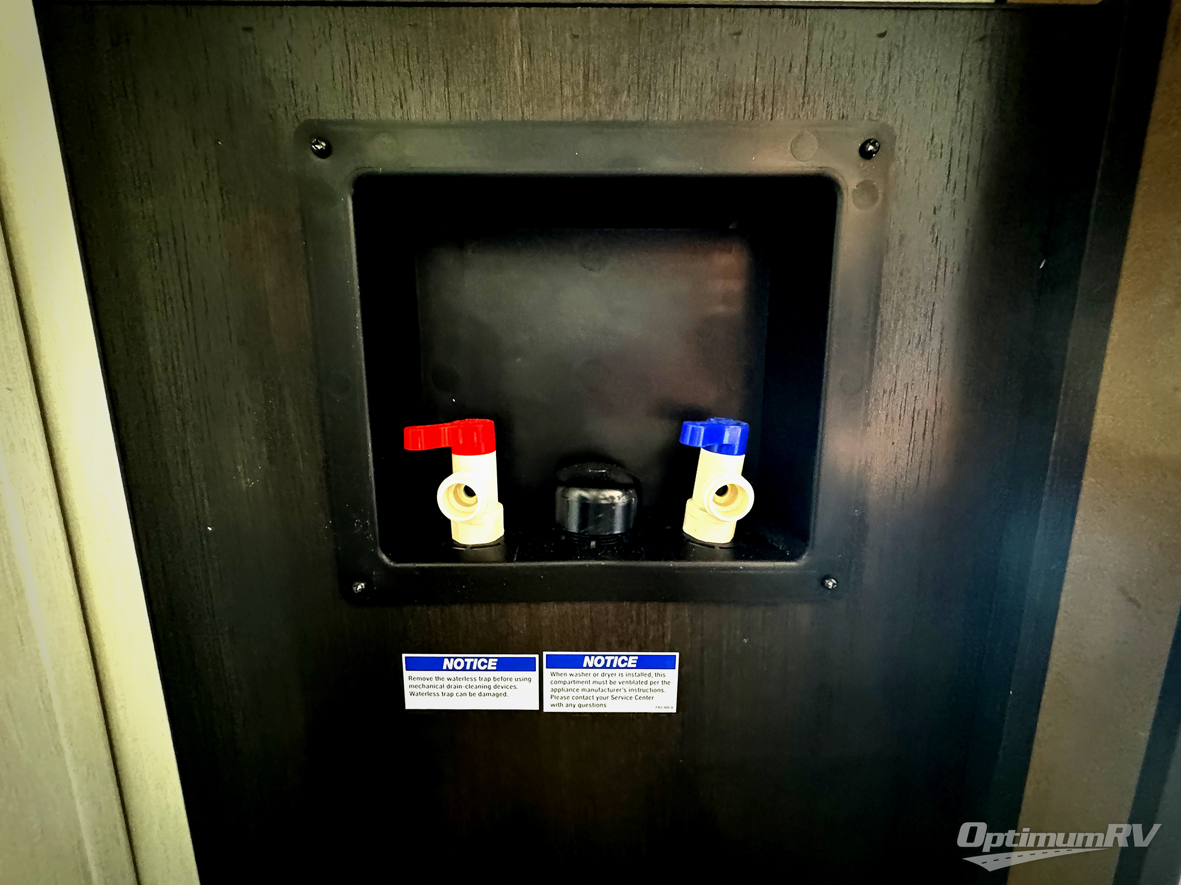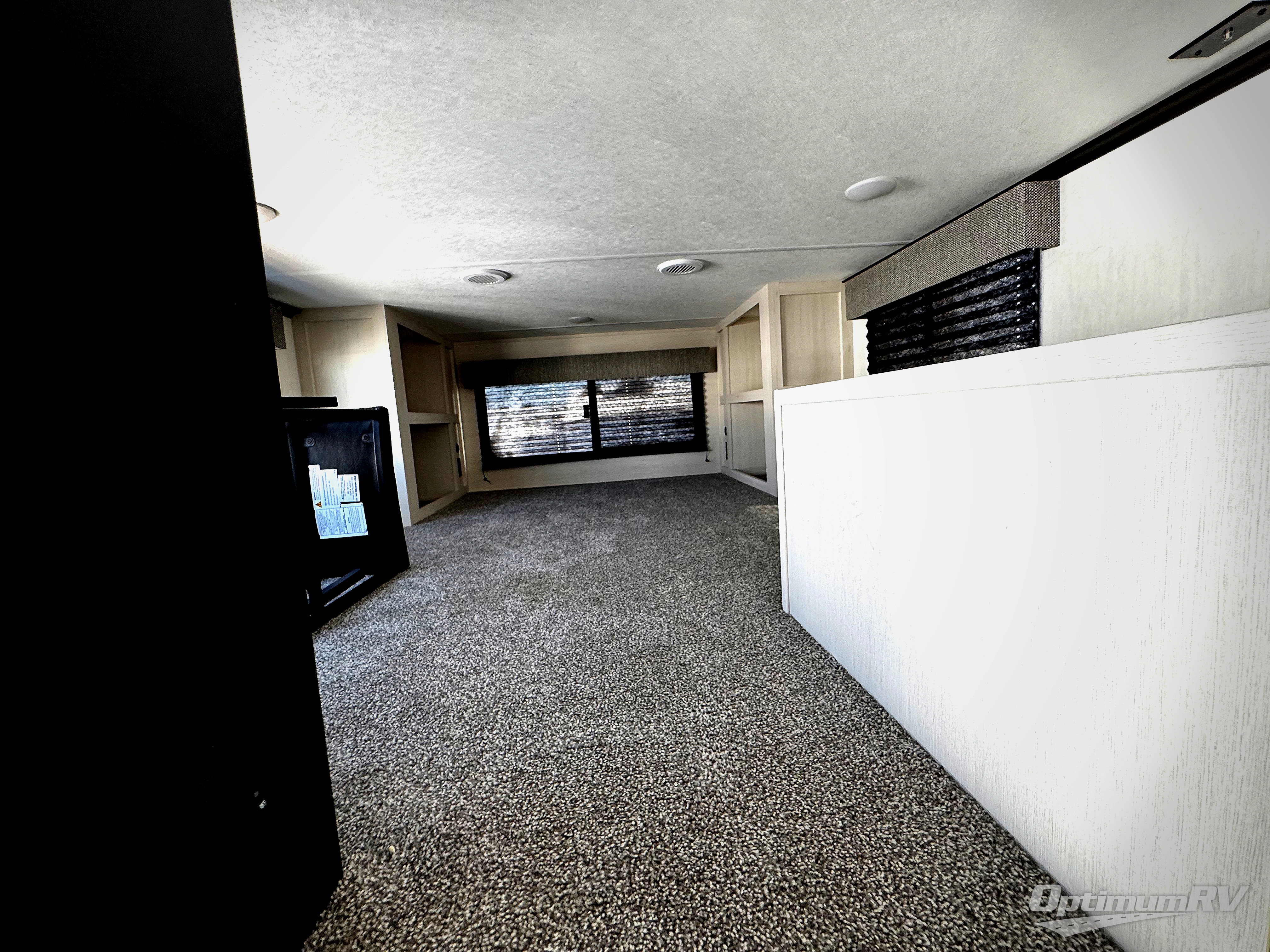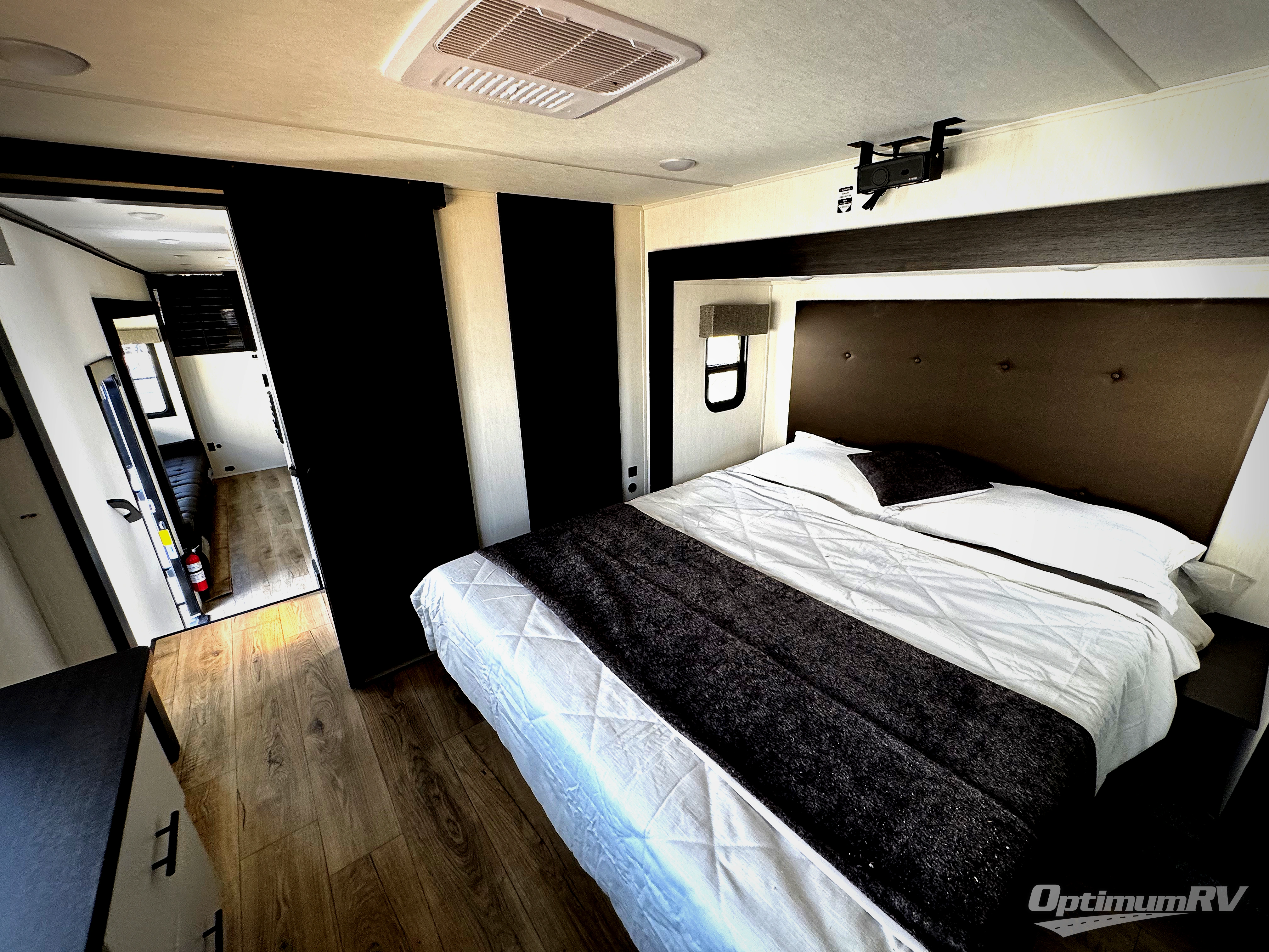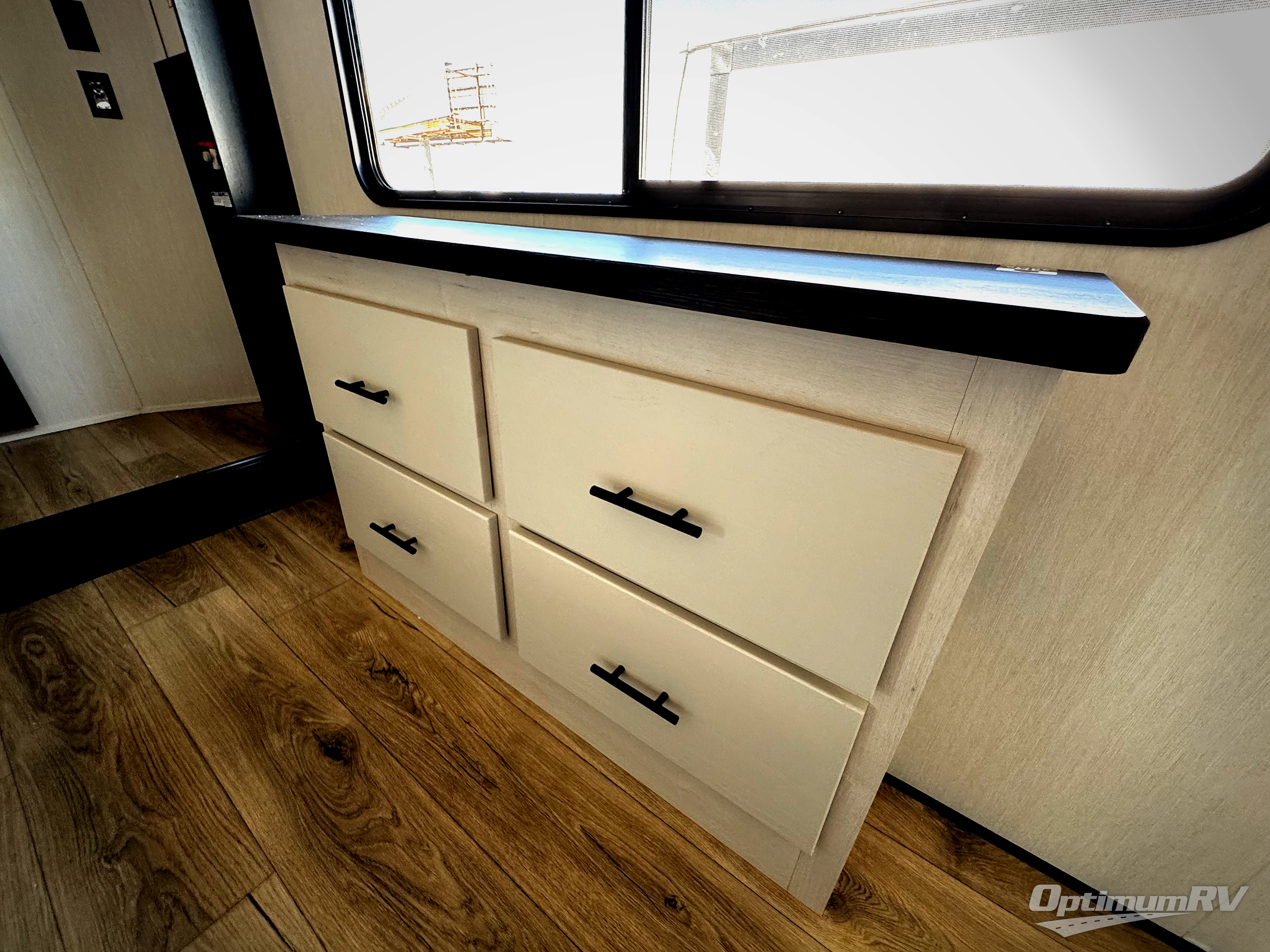 Are you looking for a fifth wheel where you can bring along your neighbor friends? You can do just that since there are two bedrooms in this unit, one of which includes a master bath with its own exterior entry door! The front bedroom is right next to the second full bath for convenience, and includes a camper king bed slide, a dresser, and front wardrobe. The rear master bedroom has a queen bed slide out across from a second slide for more floor space, and there is a loft above this room for more sleeping or storage space. Everyone can meet in the middle kitchen and living room since there are recliners, a ceiling fan, and kitchen island with four chairs. There is also storage below the island for kitchen necessities, and the hidden pantry behind the TV will be perfect for snacks, board games and more!