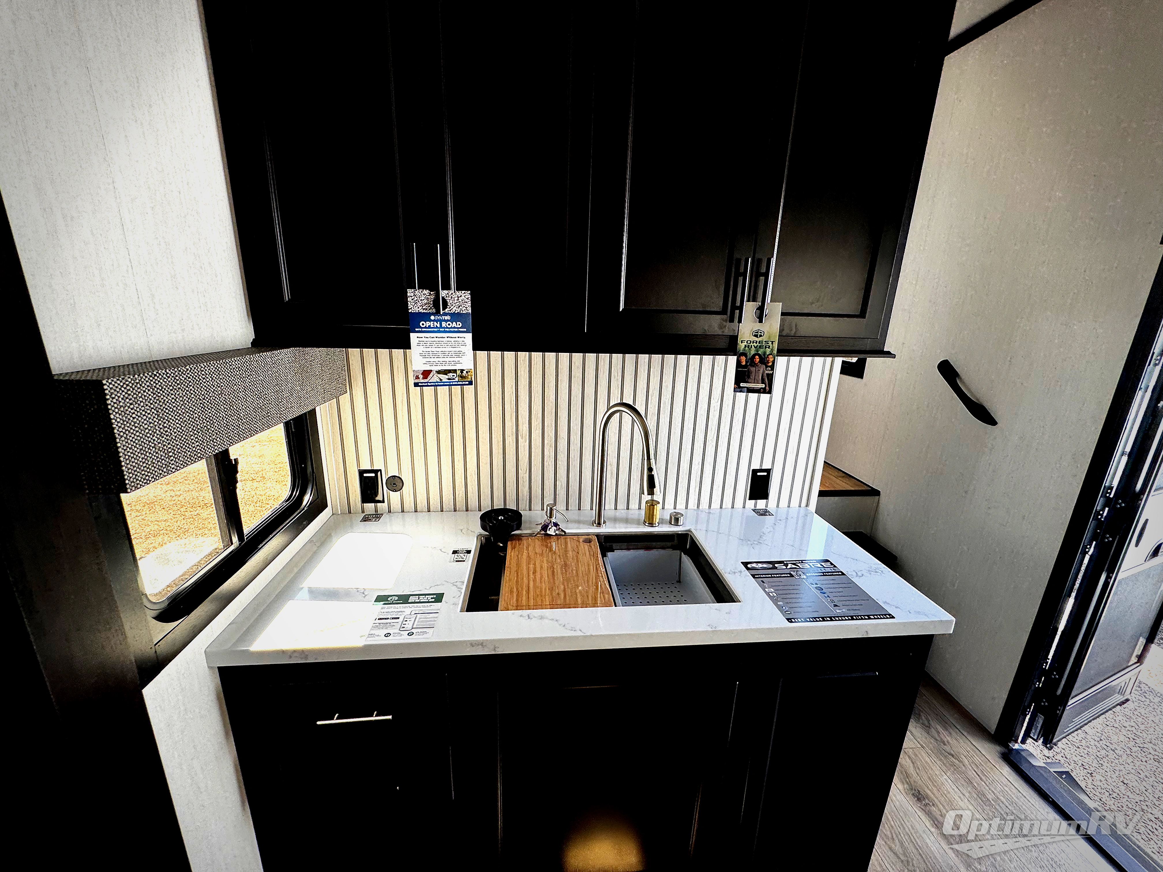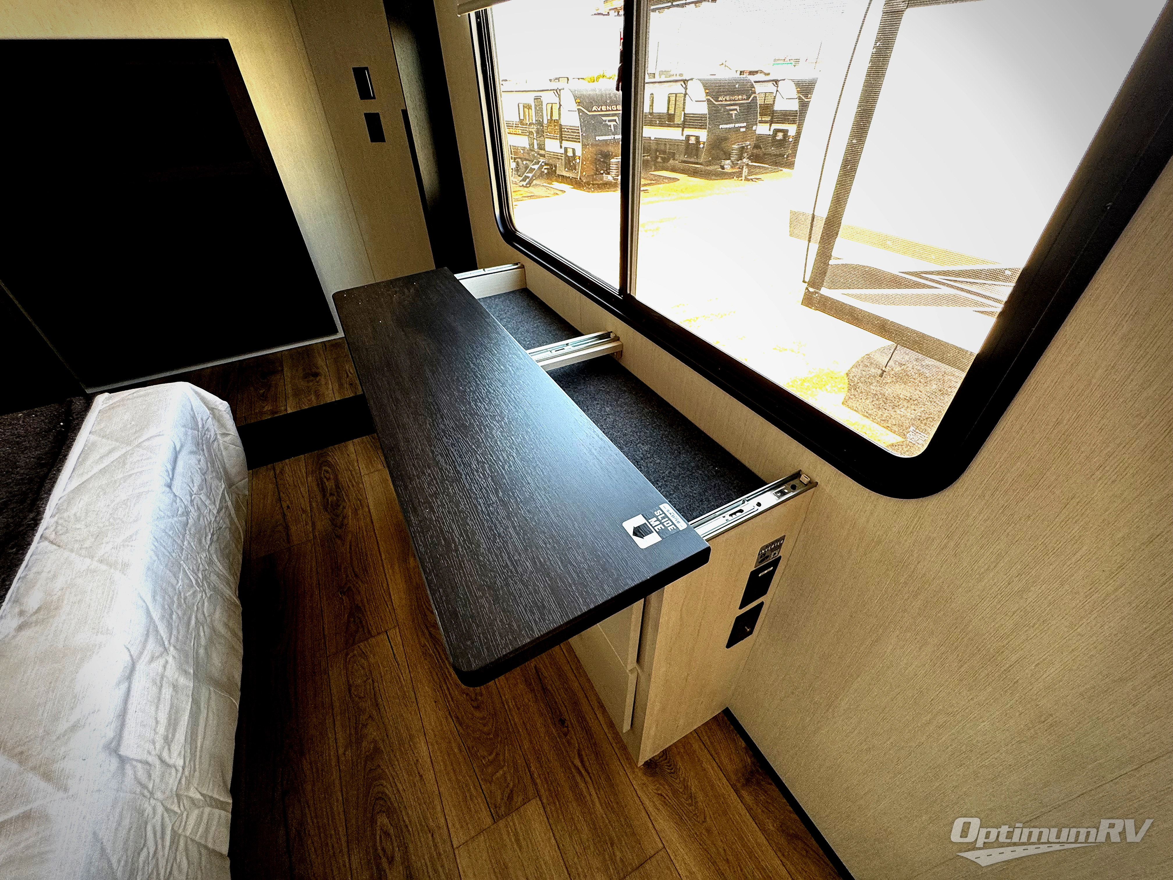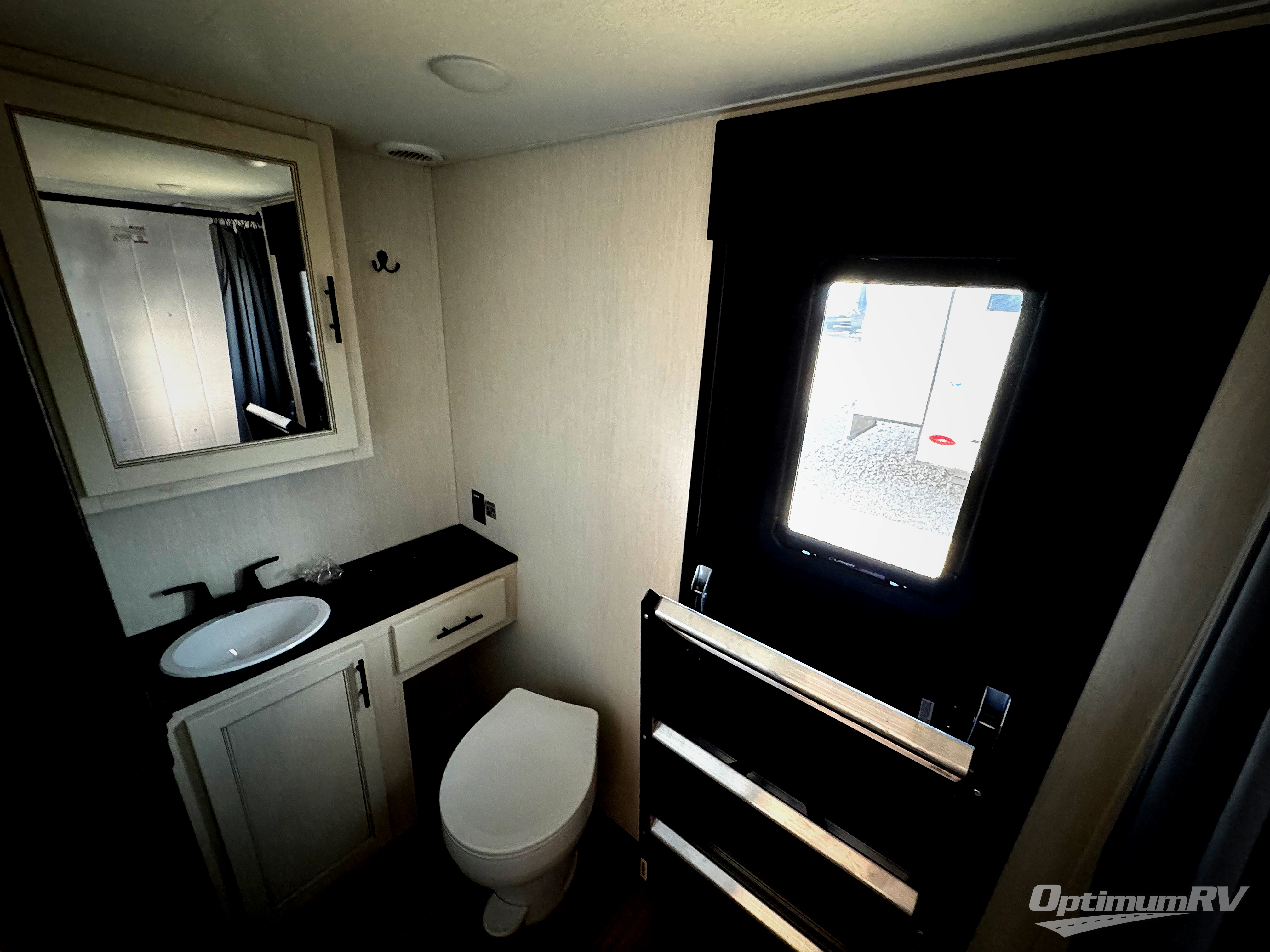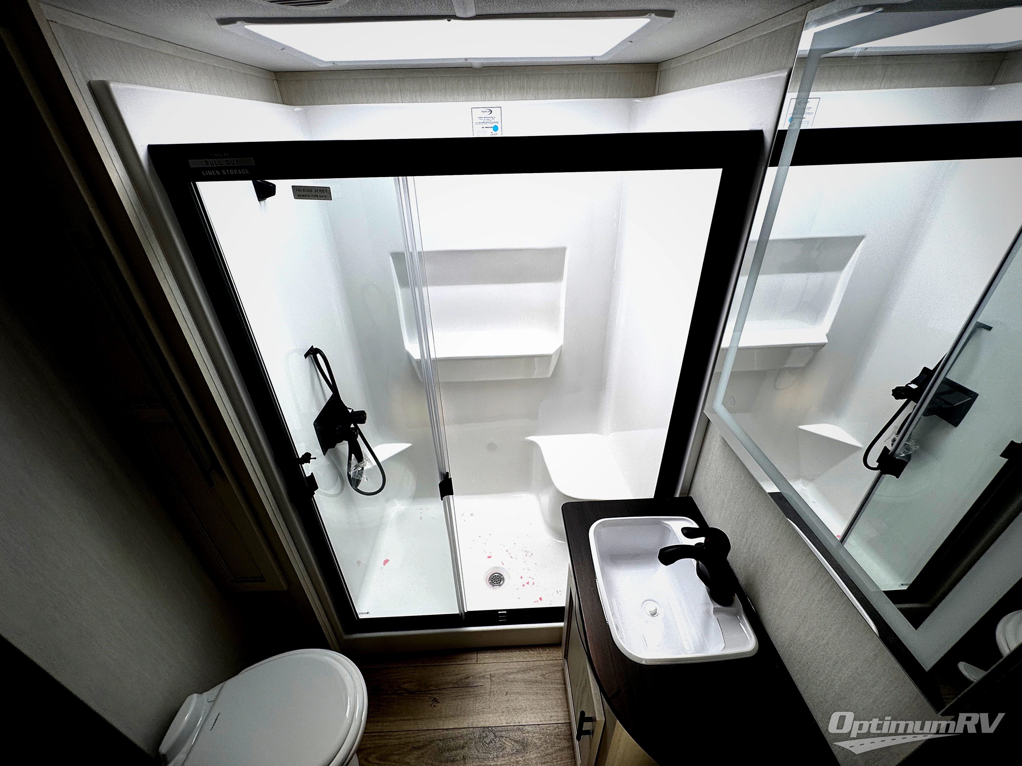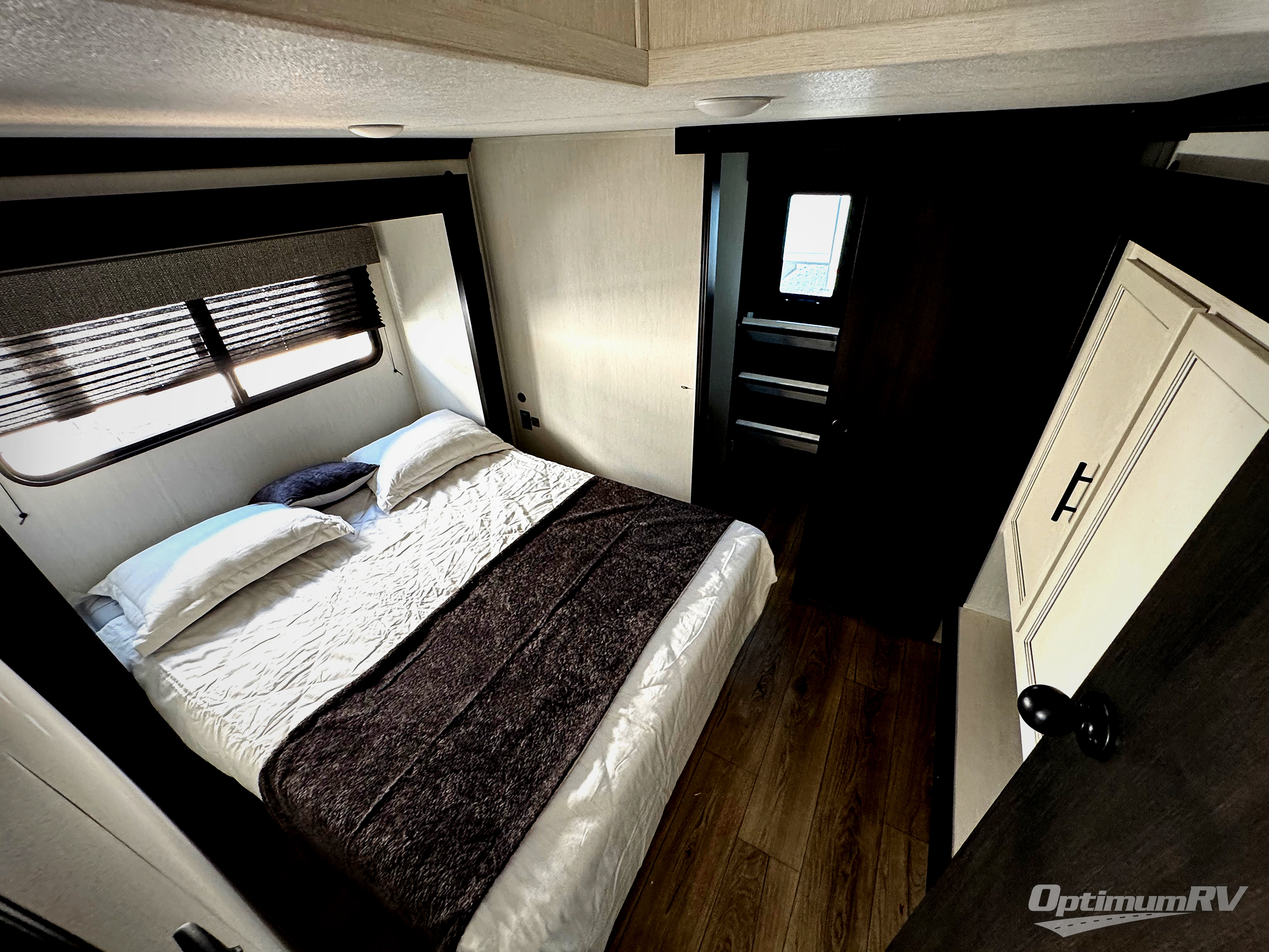 Are you looking for a fifth wheel where you can bring along your neighbor friends? You can do just that since there are two bedrooms in this unit, one of which includes a master bath with its own exterior entry door! The front bedroom is right next to the second full bath for convenience, and includes a camper king bed slide, a dresser, and front wardrobe. The rear master bedroom has a queen bed slide out across from a second slide for more floor space, and there is a loft above this room for more sleeping or storage space. Everyone can meet in the middle kitchen and living room since there are recliners, a ceiling fan, and kitchen island with four chairs. There is also storage below the island for kitchen necessities, and the hidden pantry behind the TV will be perfect for snacks, board games and more!