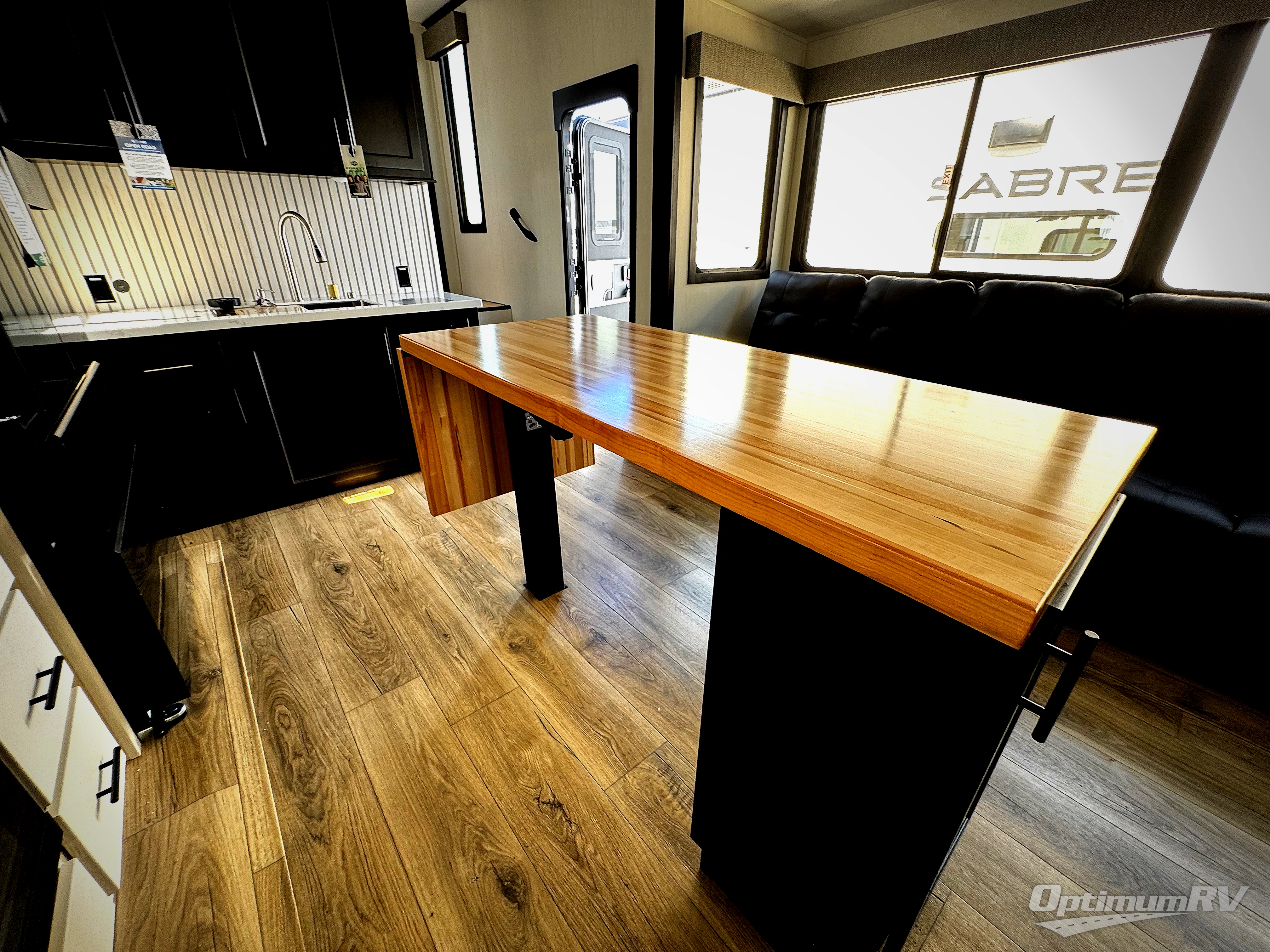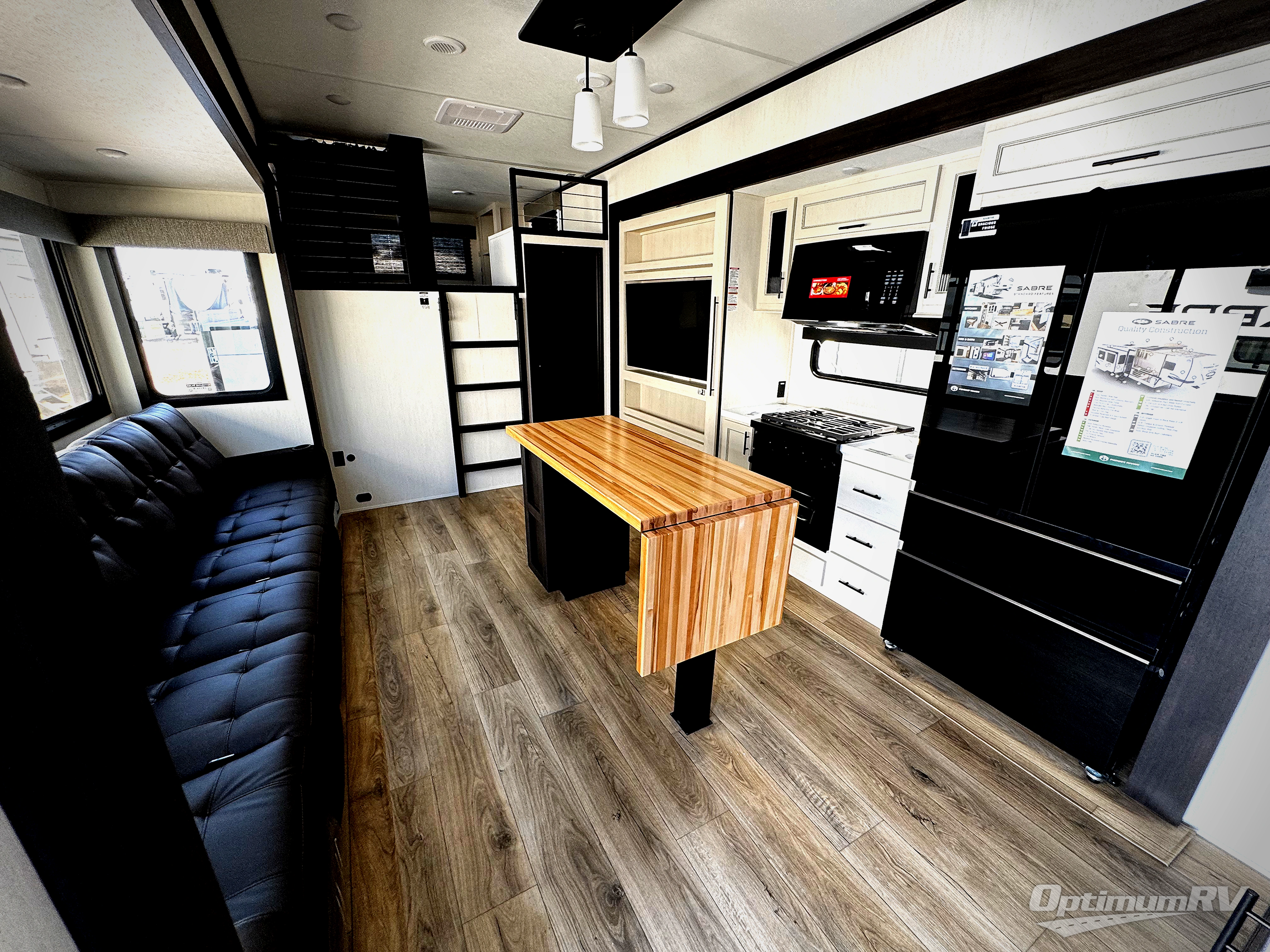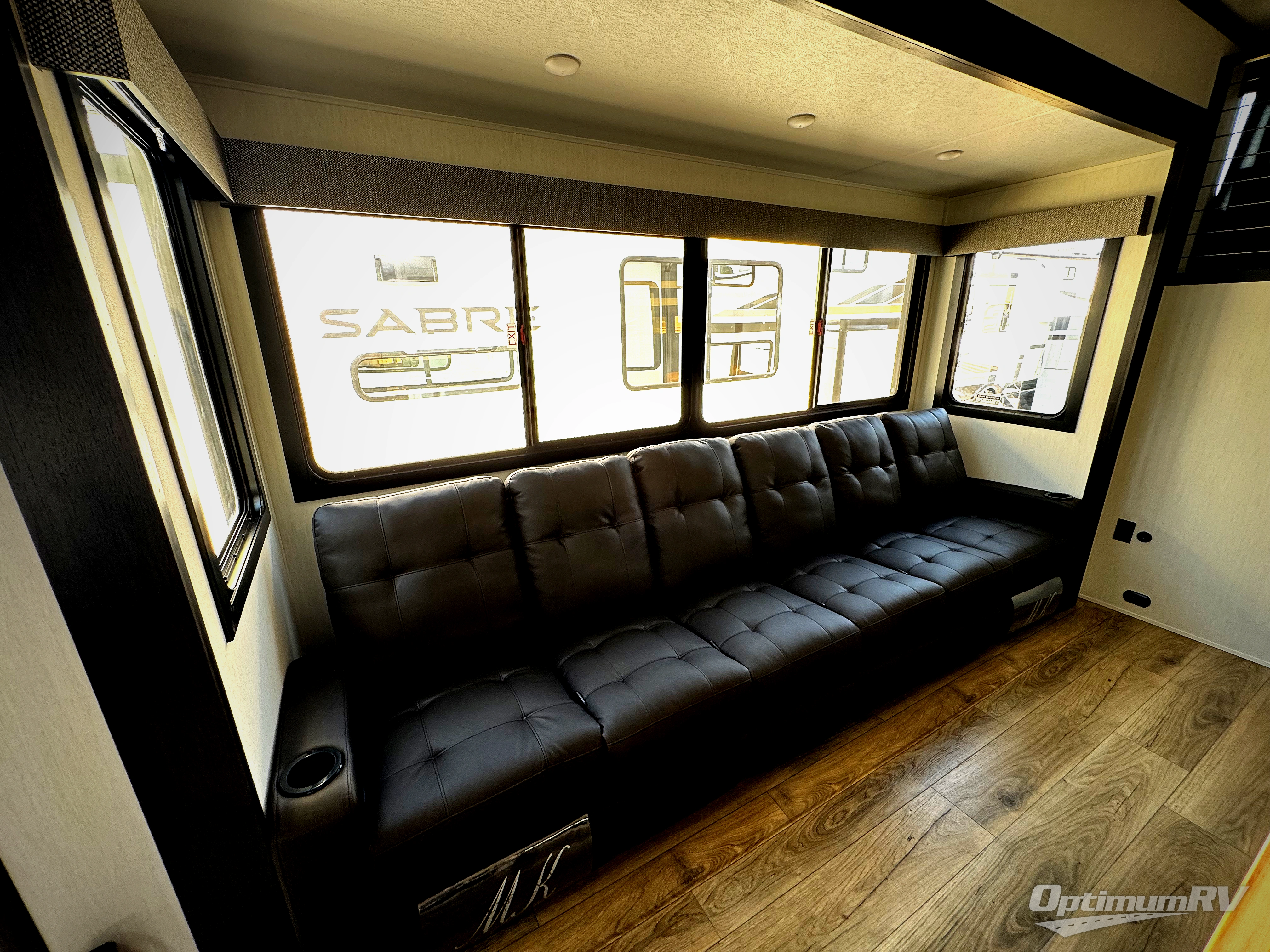 You will experience luxurious camping trips at an affordable price with any one of these Forest River Sabre fifth wheels! These models are durable and ready to travel anytime of the year thanks to features like the high-gloss gel-coat front cap with LED lighting, the PVC roof membrane, and the forced air underbelly with enclosed gate valves. The electric auto-leveling system makes setting up easy and safe, and the adjustable power awning with LED lighting will create an inviting outdoor living space. Each model includes a universal docking station which includes a black tank flush and an outside shower, and adjustable stable steps for you to enter and exit the unit safely. Inside, you will love the design of the ambient accent lighting in the living area, the real wood lumbercore cabinetry, and the linoleum flooring!