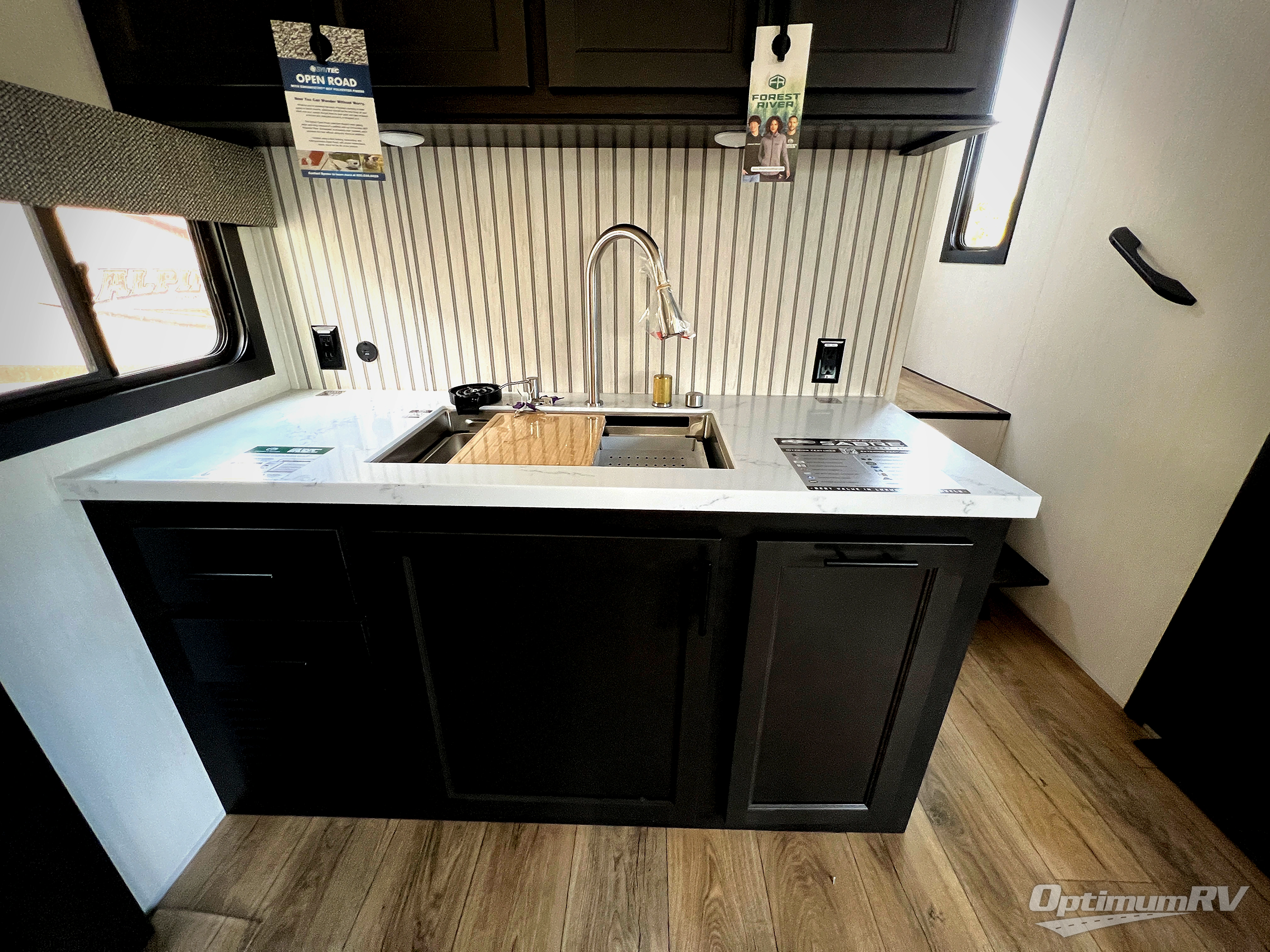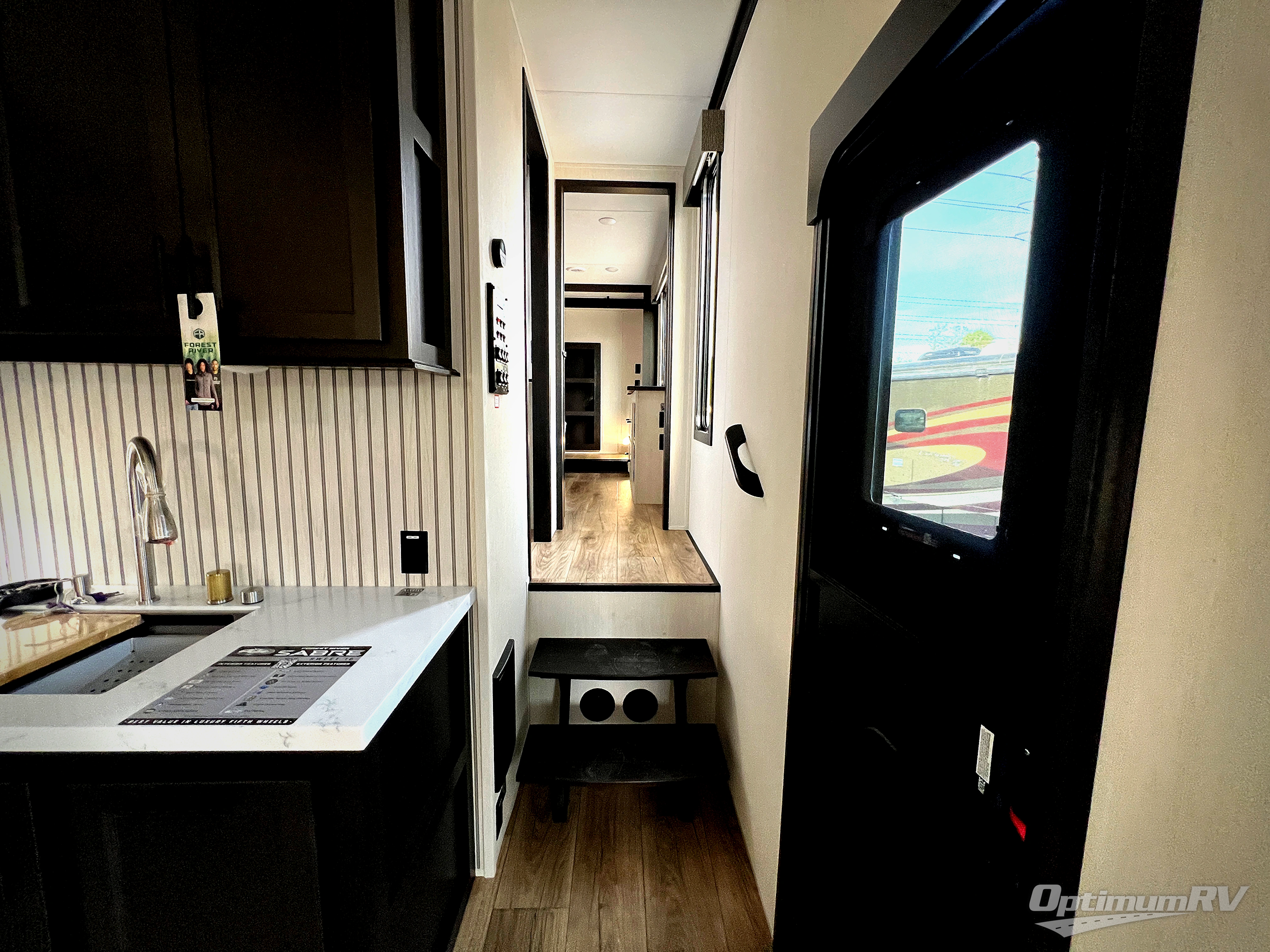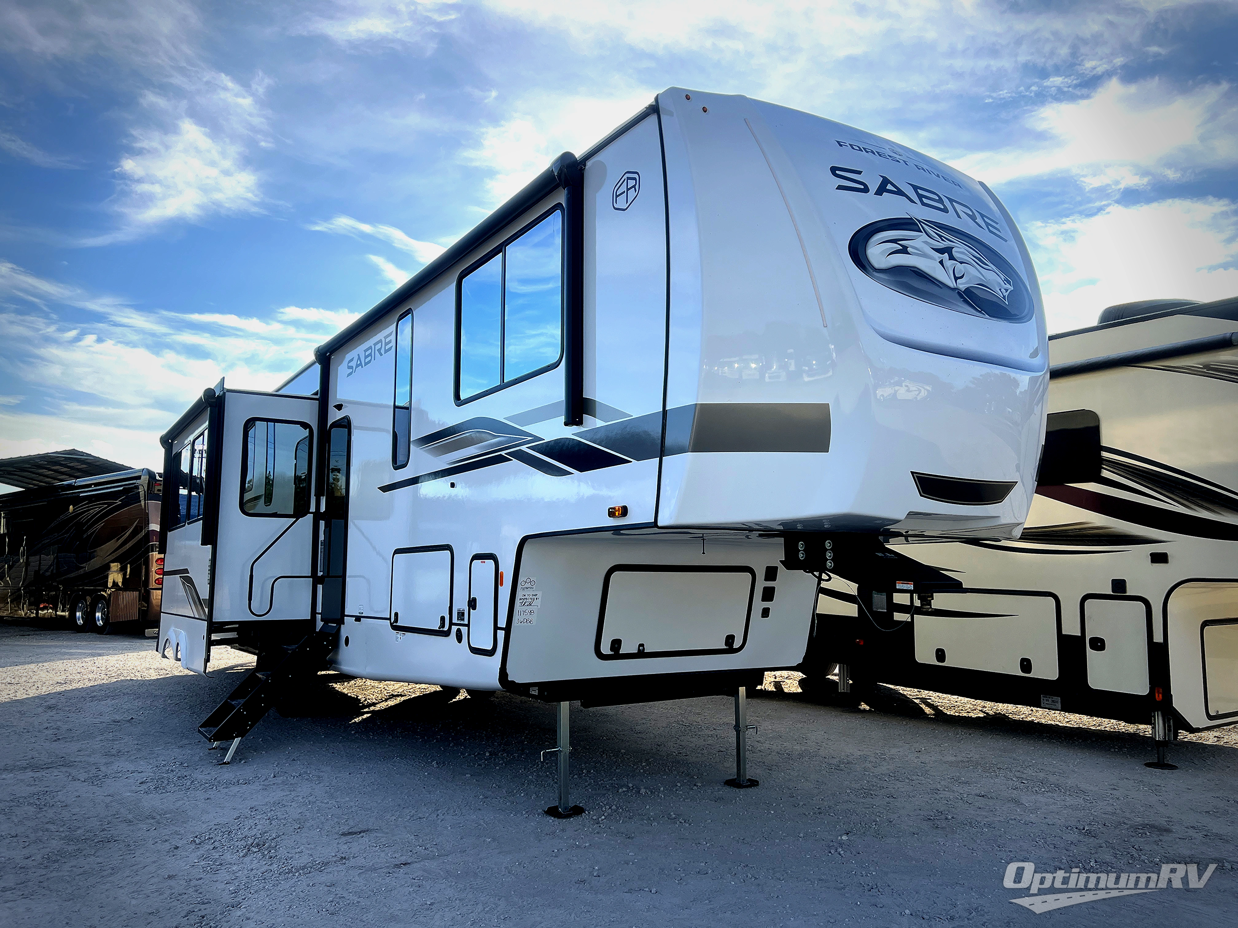 You will experience luxurious camping trips at an affordable price with any one of these Forest River Sabre fifth wheels! These models are durable and ready to travel anytime of the year thanks to features like the high-gloss gel-coat front cap with LED lighting, the PVC roof membrane, and the forced air underbelly with enclosed gate valves. The electric auto-leveling system makes setting up easy and safe, and the adjustable power awning with LED lighting will create an inviting outdoor living space. Each model includes a universal docking station which includes a black tank flush and an outside shower, and adjustable stable steps for you to enter and exit the unit safely. Inside, you will love the design of the ambient accent lighting in the living area, the real wood lumbercore cabinetry, and the linoleum flooring!