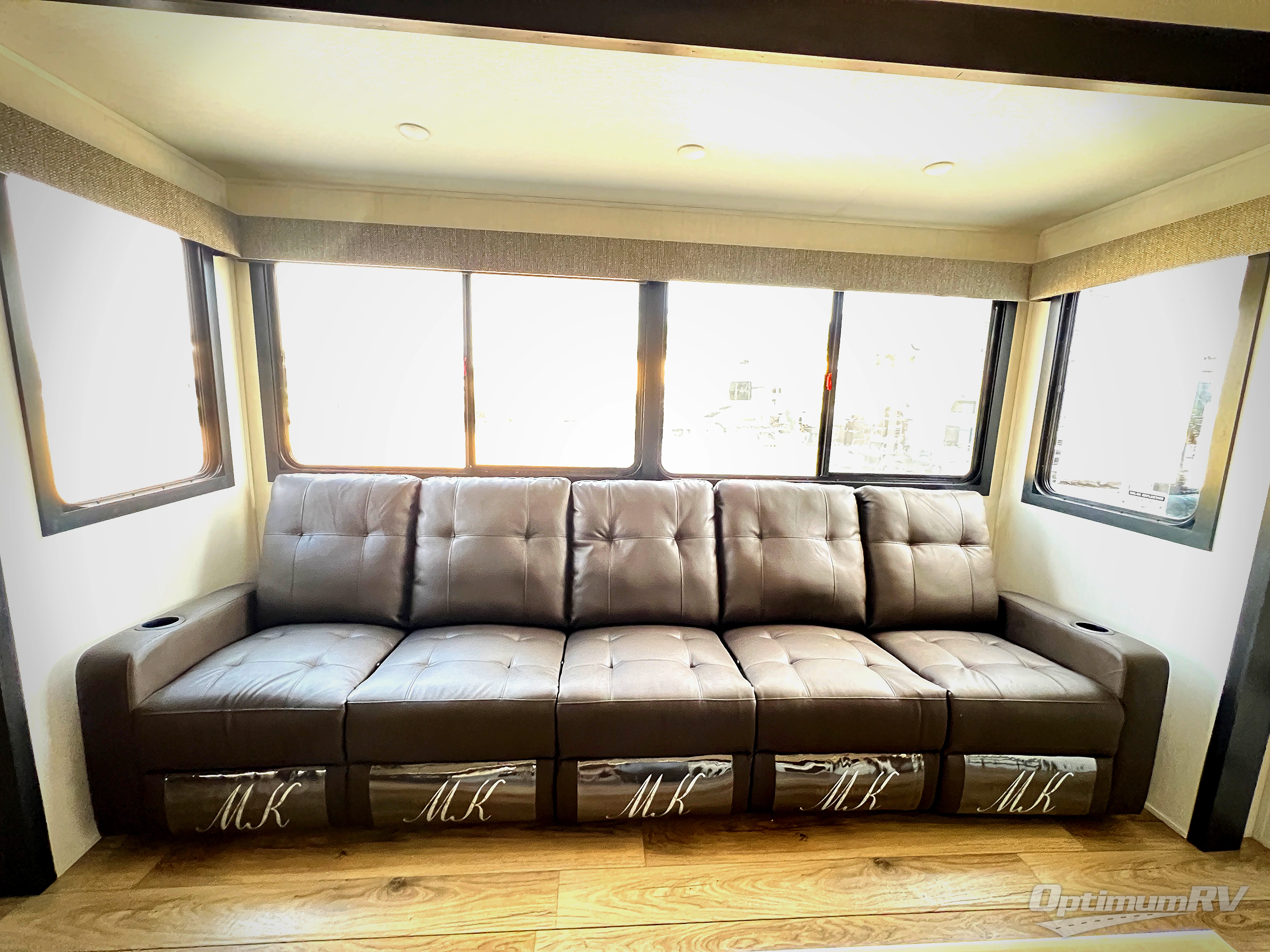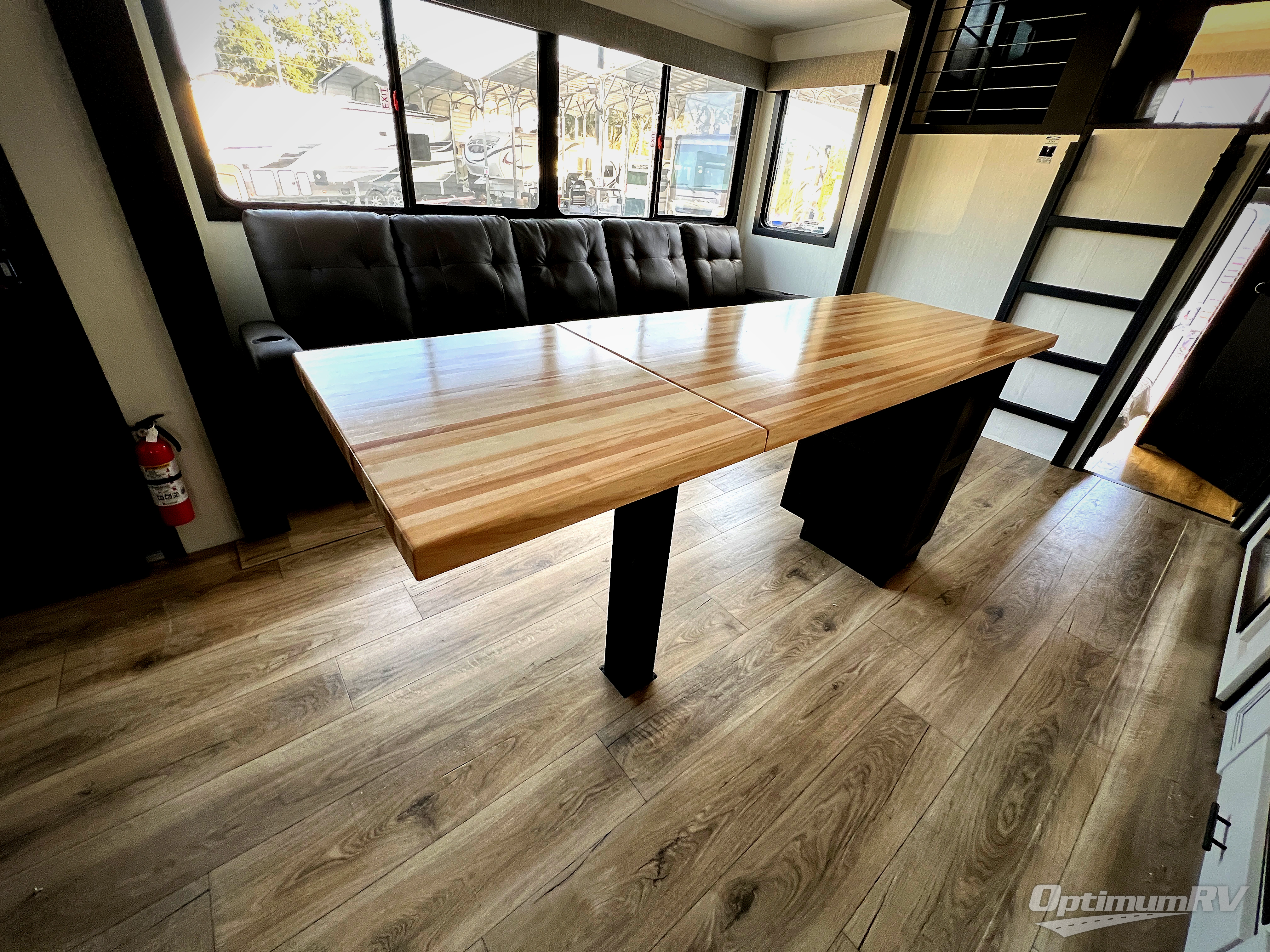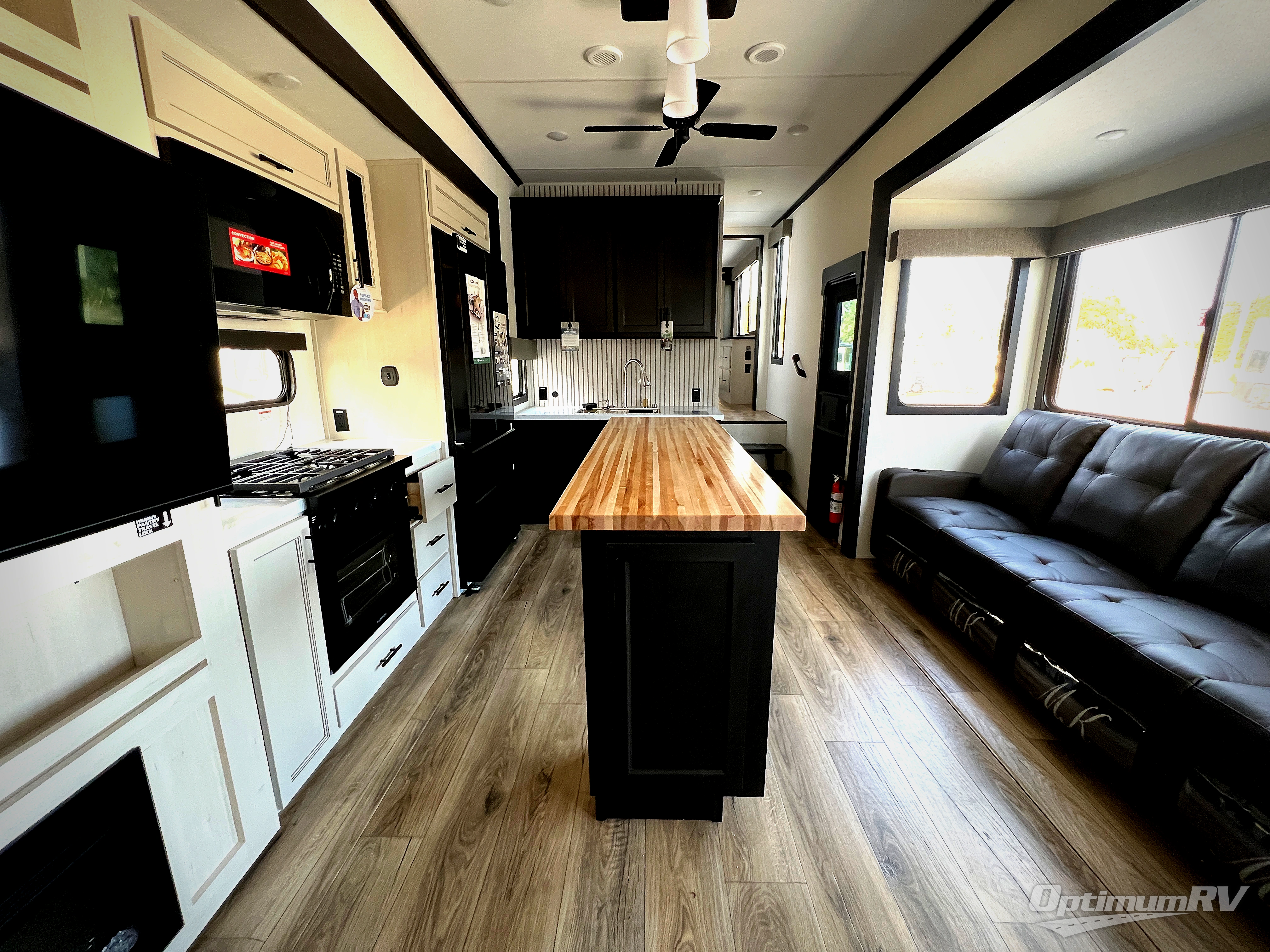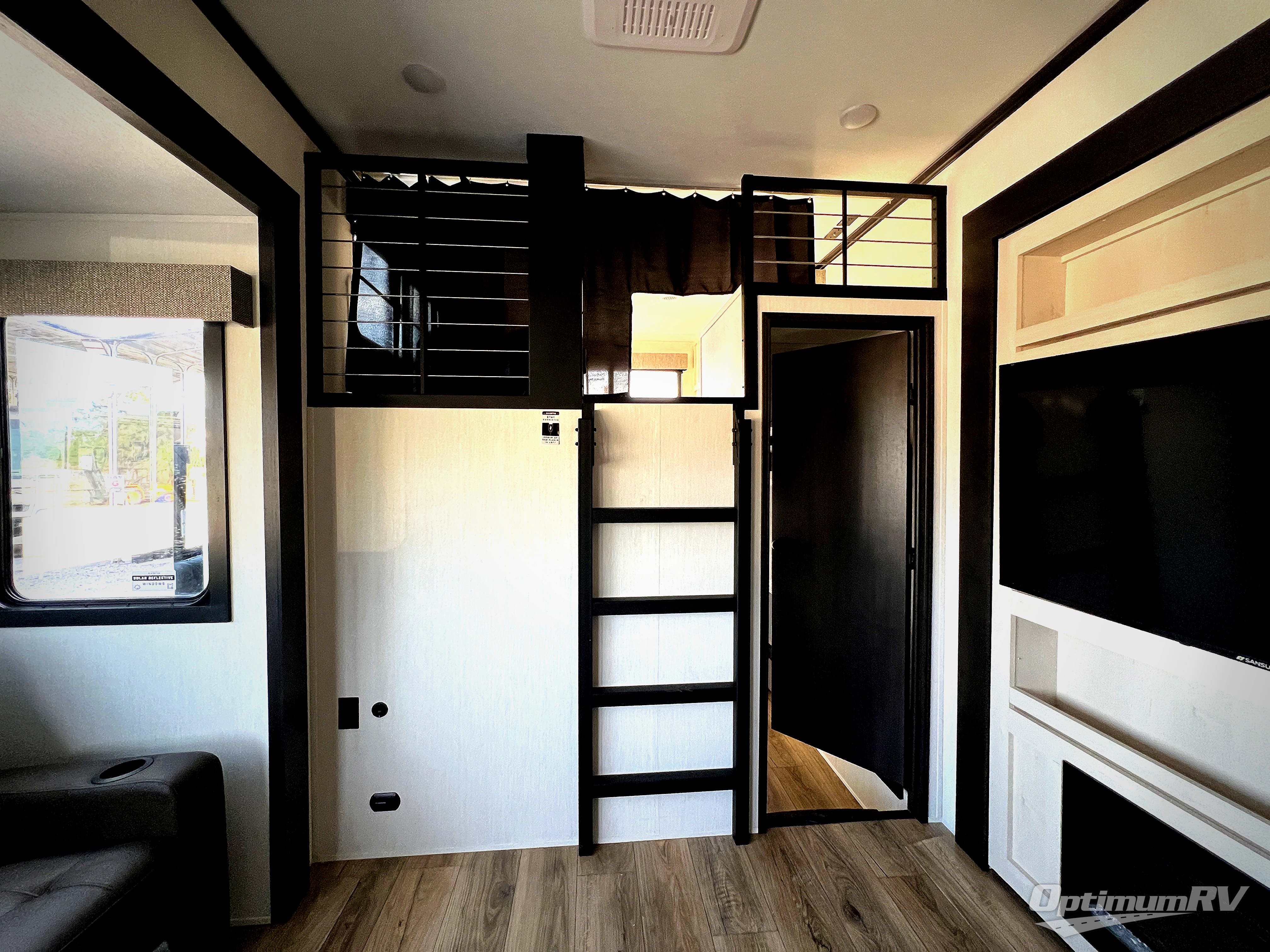 Are you looking for a fifth wheel where you can bring along your neighbor friends? You can do just that since there are two bedrooms in this unit, one of which includes a master bath with its own exterior entry door! The front bedroom is right next to the second full bath for convenience, and includes a camper king bed slide, a dresser, and front wardrobe. The rear master bedroom has a queen bed slide out across from a second slide for more floor space, and there is a loft above this room for more sleeping or storage space. Everyone can meet in the middle kitchen and living room since there are recliners, a ceiling fan, and kitchen island with four chairs. There is also storage below the island for kitchen necessities, and the hidden pantry behind the TV will be perfect for snacks, board games and more!