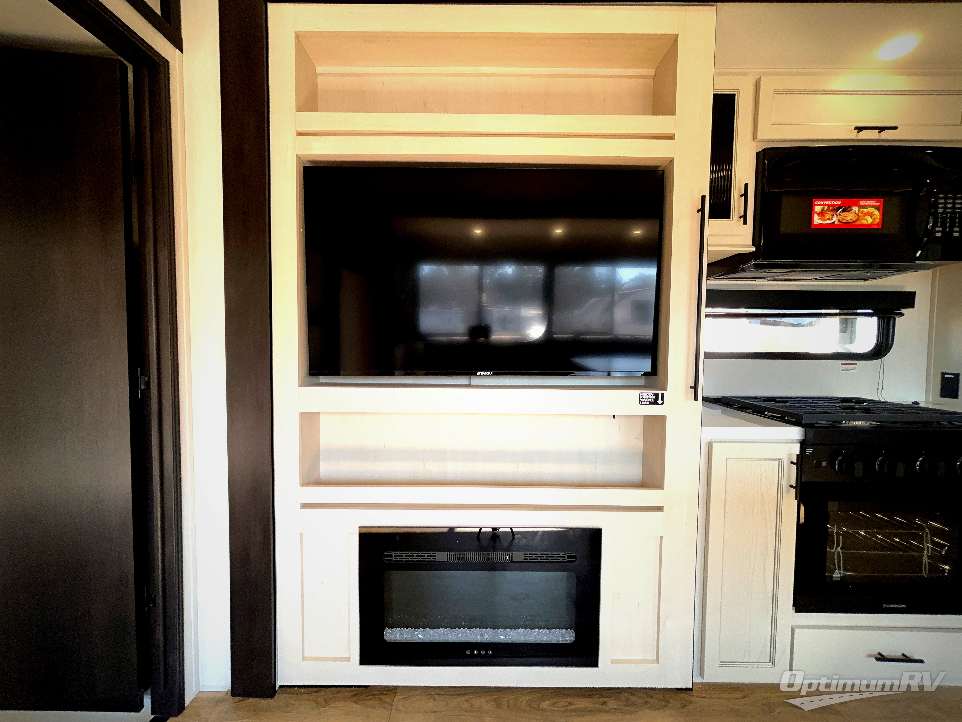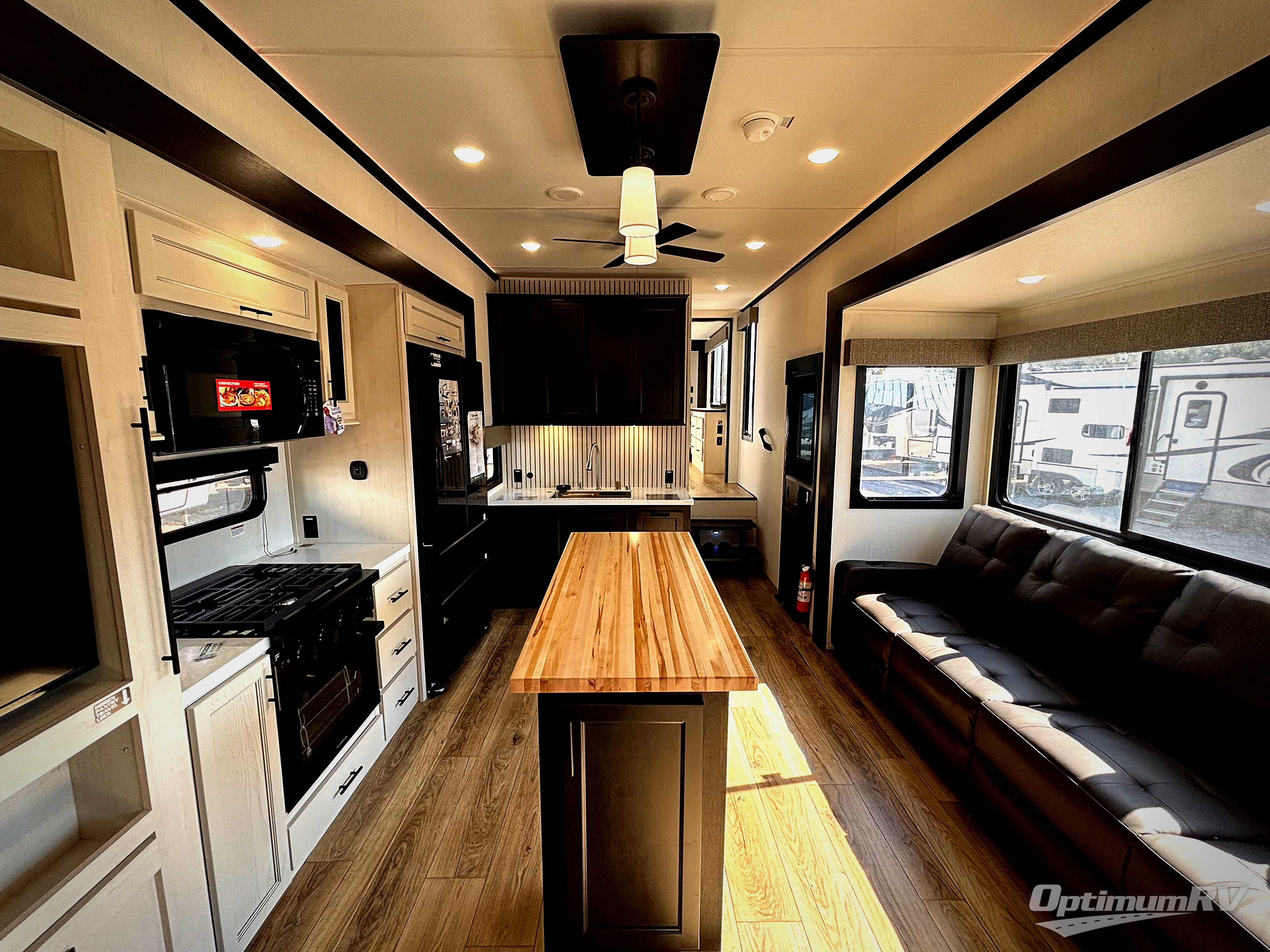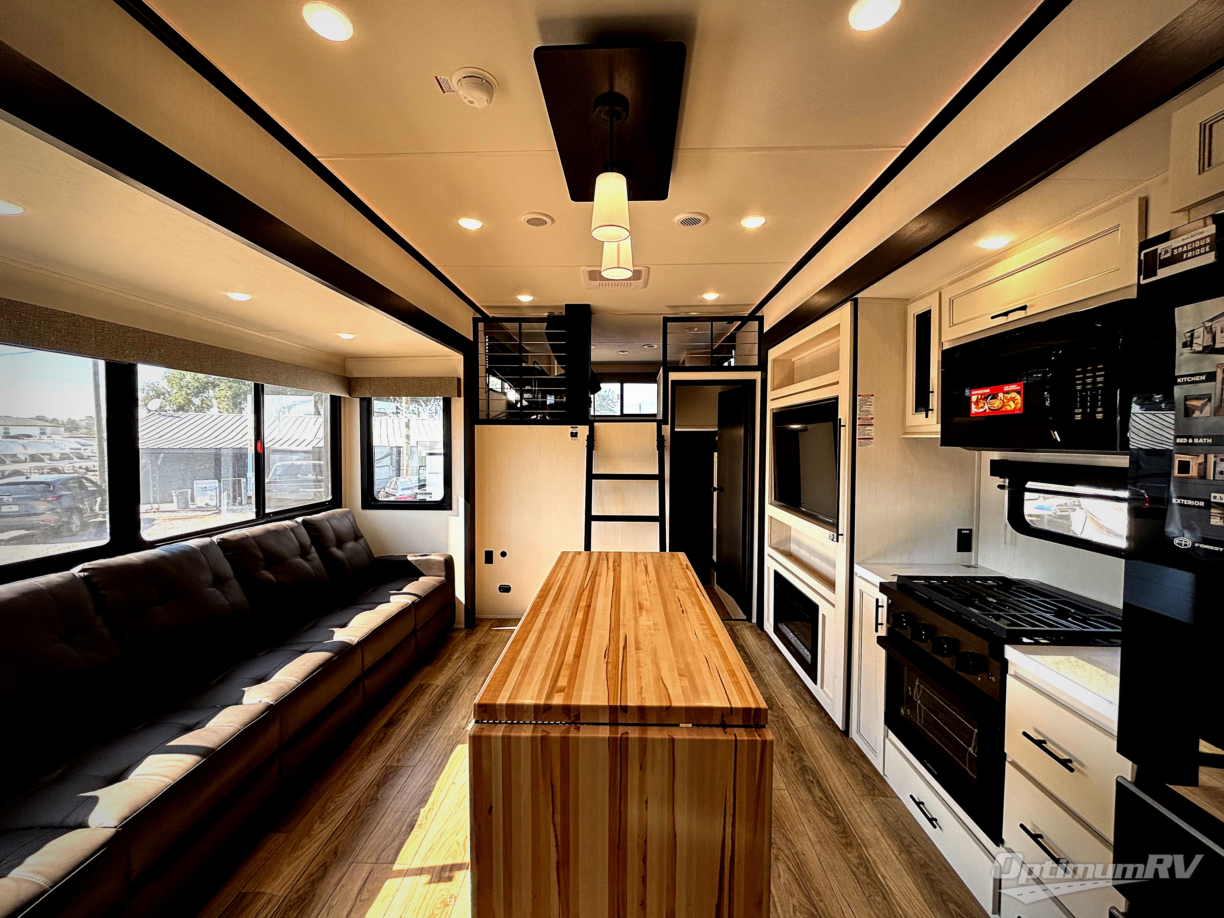 Are you looking for a fifth wheel where you can bring along your neighbor friends? You can do just that since there are two bedrooms in this unit, one of which includes a master bath with its own exterior entry door! The front bedroom is right next to the second full bath for convenience, and includes a camper king bed slide, a dresser, and front wardrobe. The rear master bedroom has a queen bed slide out across from a second slide for more floor space, and there is a loft above this room for more sleeping or storage space. Everyone can meet in the middle kitchen and living room since there are recliners, a ceiling fan, and kitchen island with four chairs. There is also storage below the island for kitchen necessities, and the hidden pantry behind the TV will be perfect for snacks, board games and more!