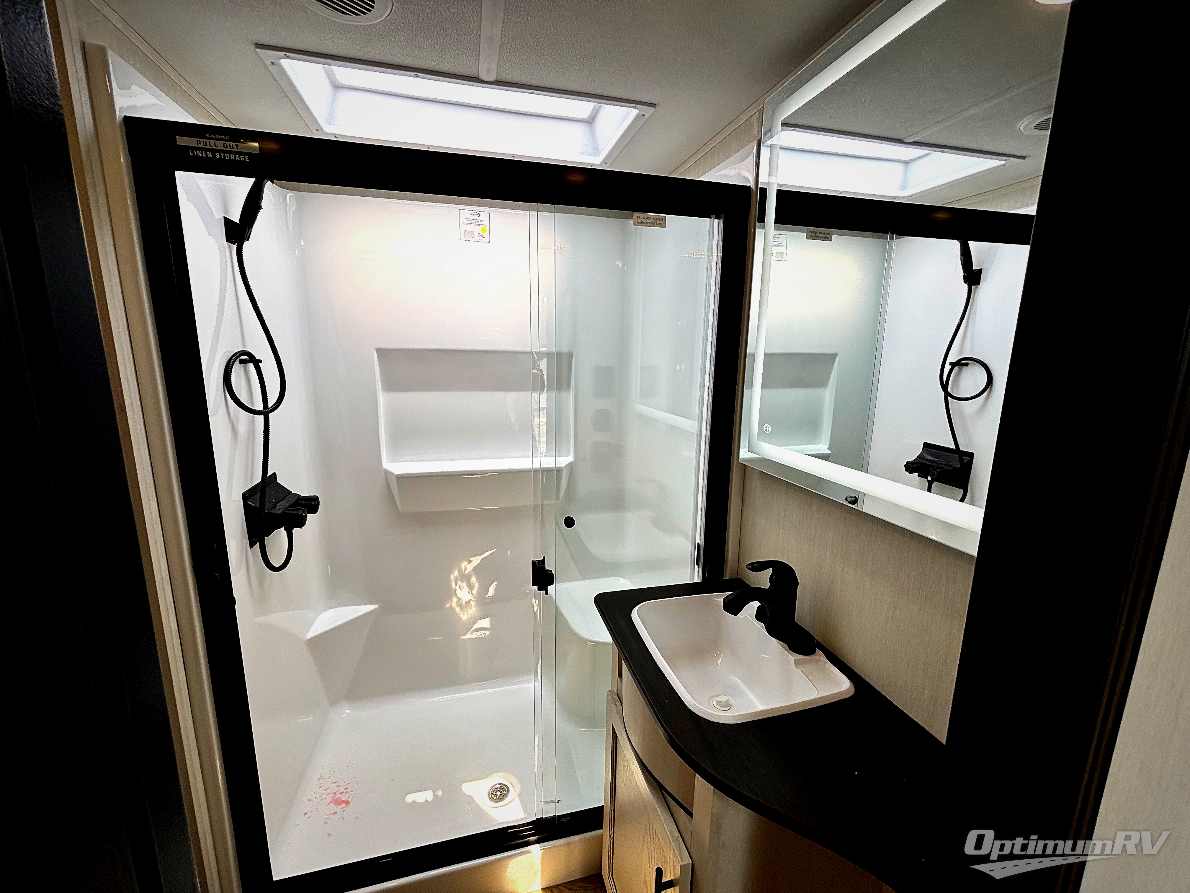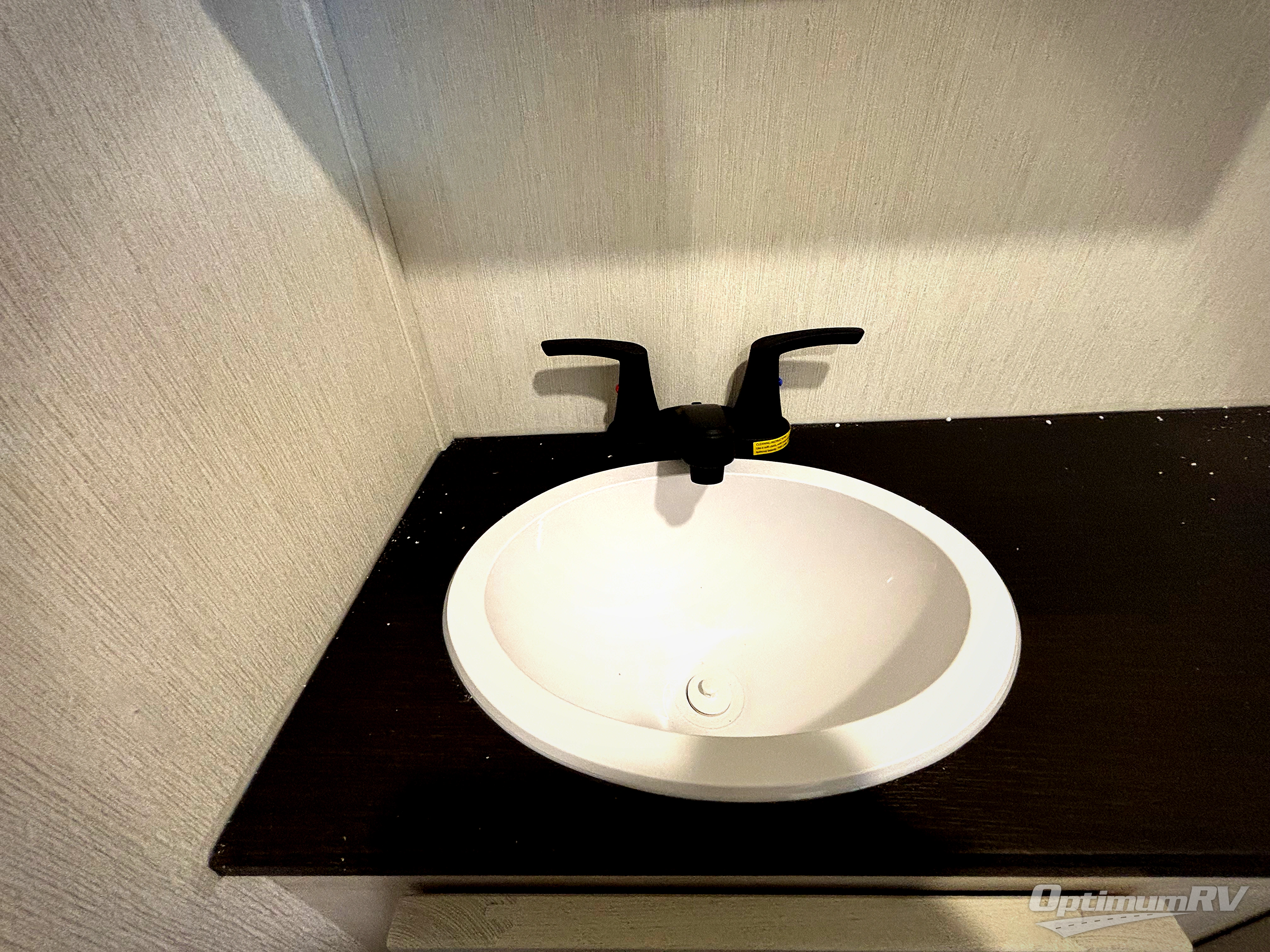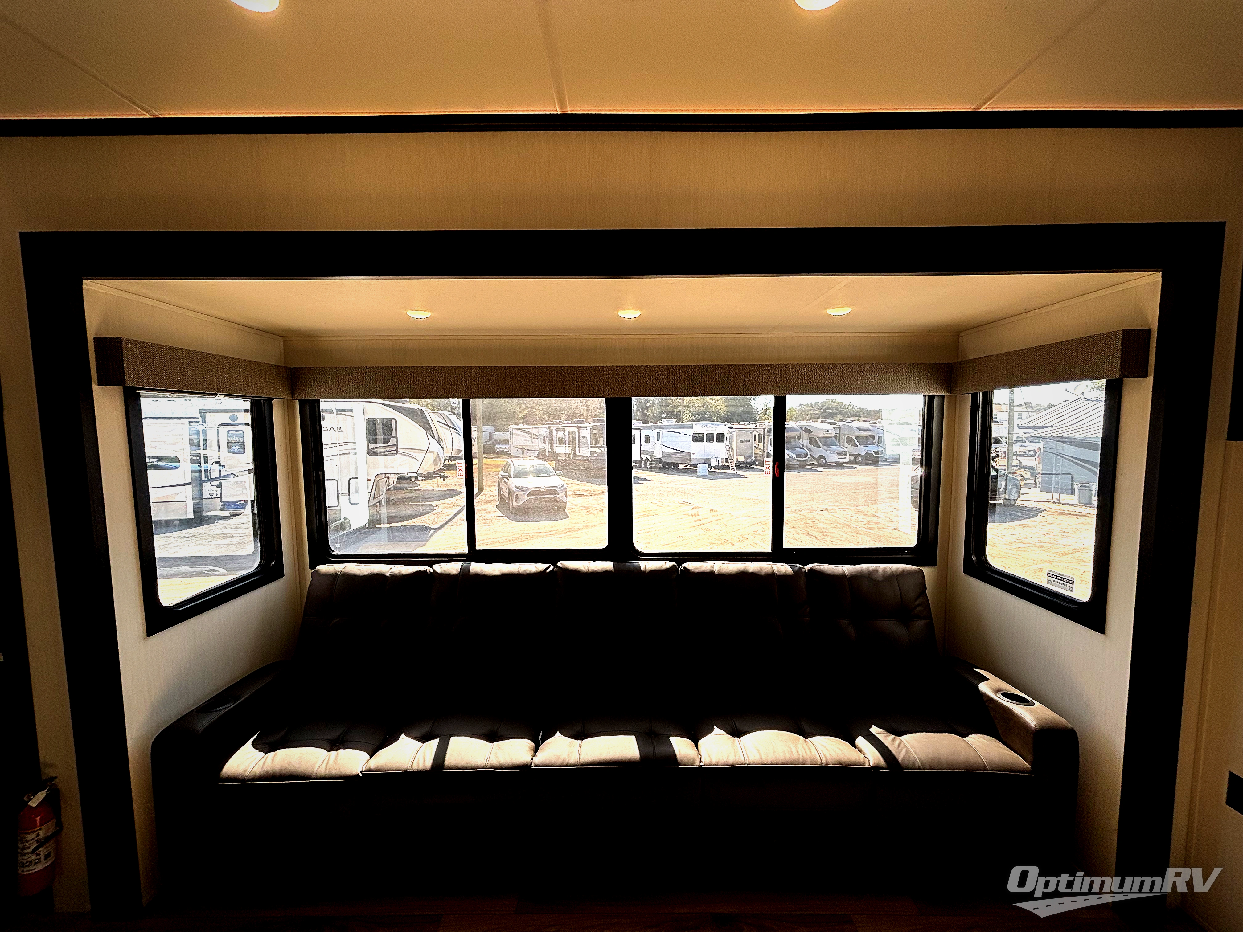 Are you looking for a fifth wheel where you can bring along your neighbor friends? You can do just that since there are two bedrooms in this unit, one of which includes a master bath with its own exterior entry door! The front bedroom is right next to the second full bath for convenience, and includes a camper king bed slide, a dresser, and front wardrobe. The rear master bedroom has a queen bed slide out across from a second slide for more floor space, and there is a loft above this room for more sleeping or storage space. Everyone can meet in the middle kitchen and living room since there are recliners, a ceiling fan, and kitchen island with four chairs. There is also storage below the island for kitchen necessities, and the hidden pantry behind the TV will be perfect for snacks, board games and more!