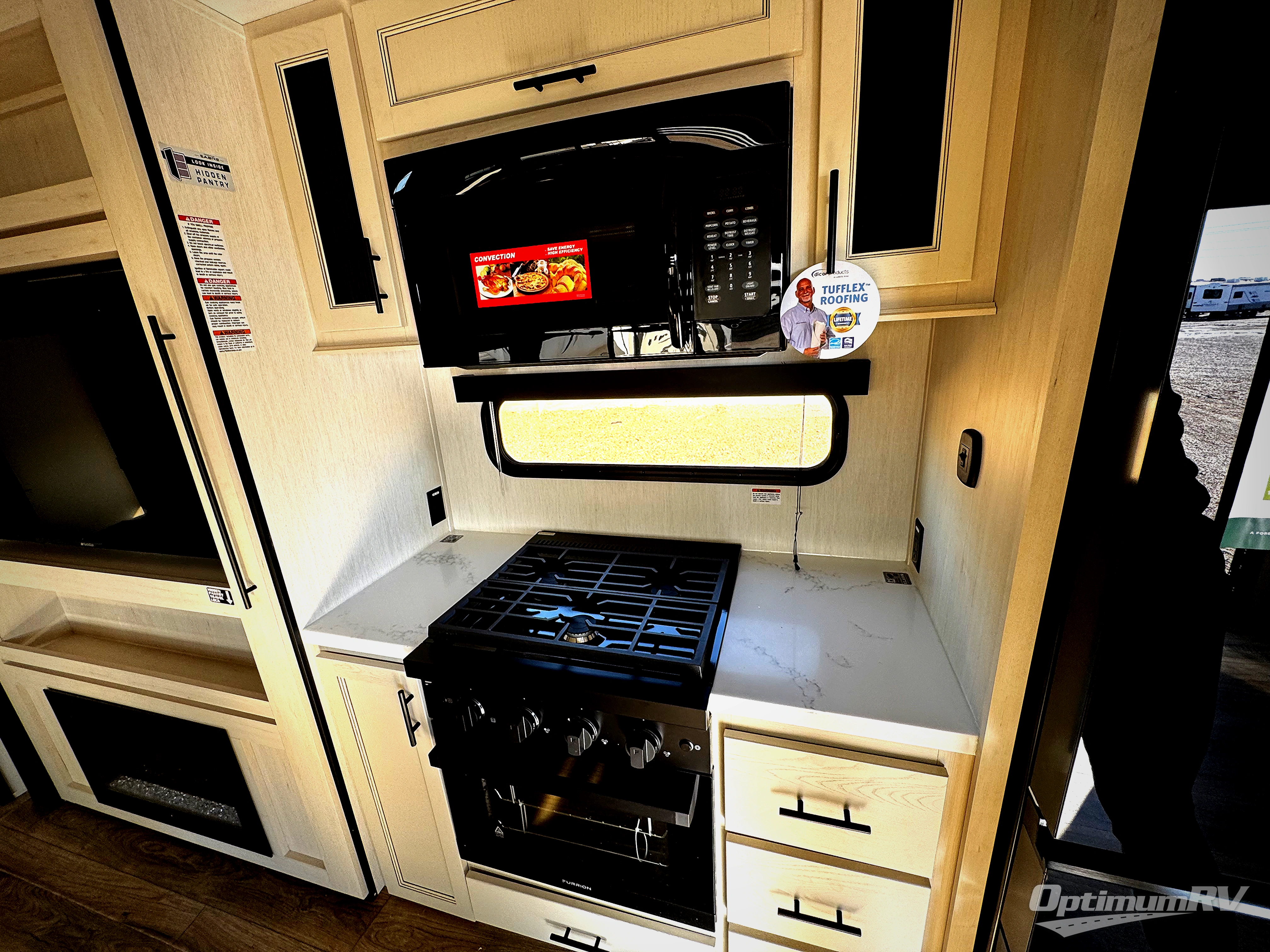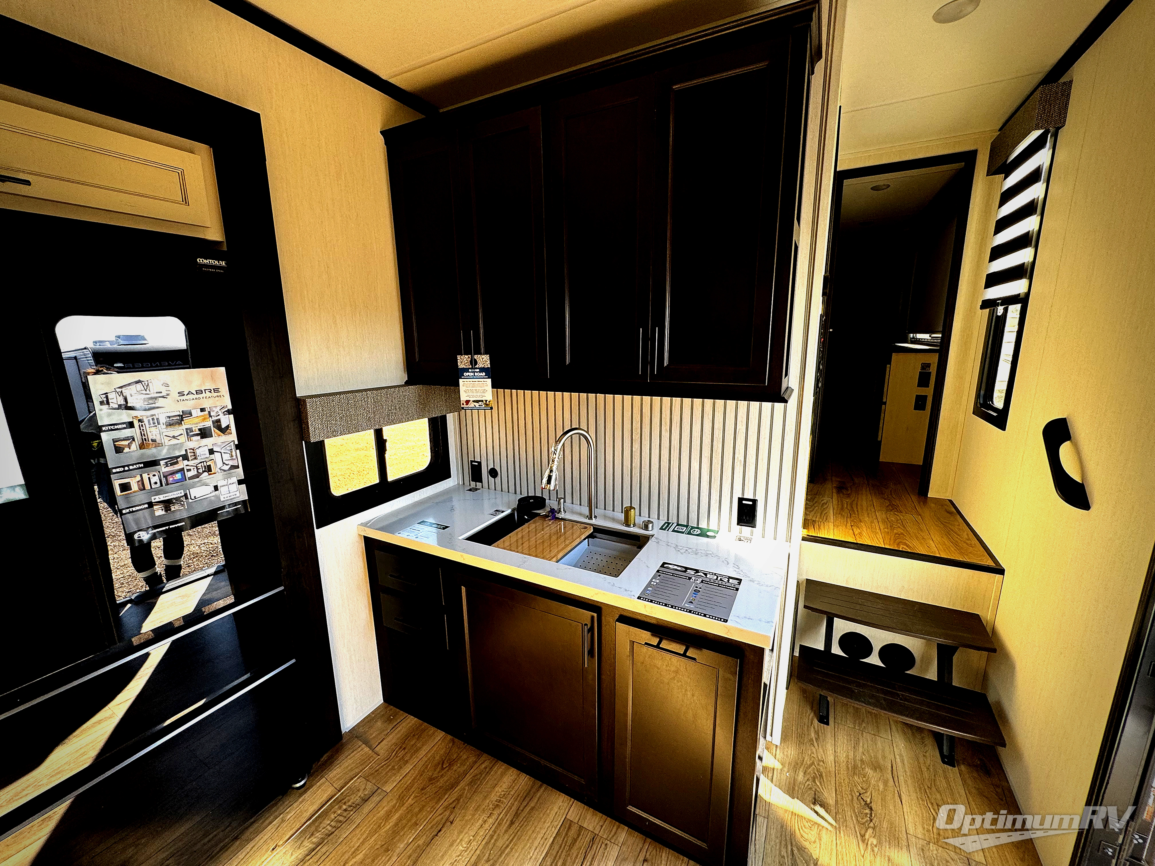 You will experience luxurious camping trips at an affordable price with any one of these Forest River Sabre fifth wheels! These models are durable and ready to travel anytime of the year thanks to features like the high-gloss gel-coat front cap with LED lighting, the PVC roof membrane, and the forced air underbelly with enclosed gate valves. The electric auto-leveling system makes setting up easy and safe, and the adjustable power awning with LED lighting will create an inviting outdoor living space. Each model includes a universal docking station which includes a black tank flush and an outside shower, and adjustable stable steps for you to enter and exit the unit safely. Inside, you will love the design of the ambient accent lighting in the living area, the real wood lumbercore cabinetry, and the linoleum flooring!