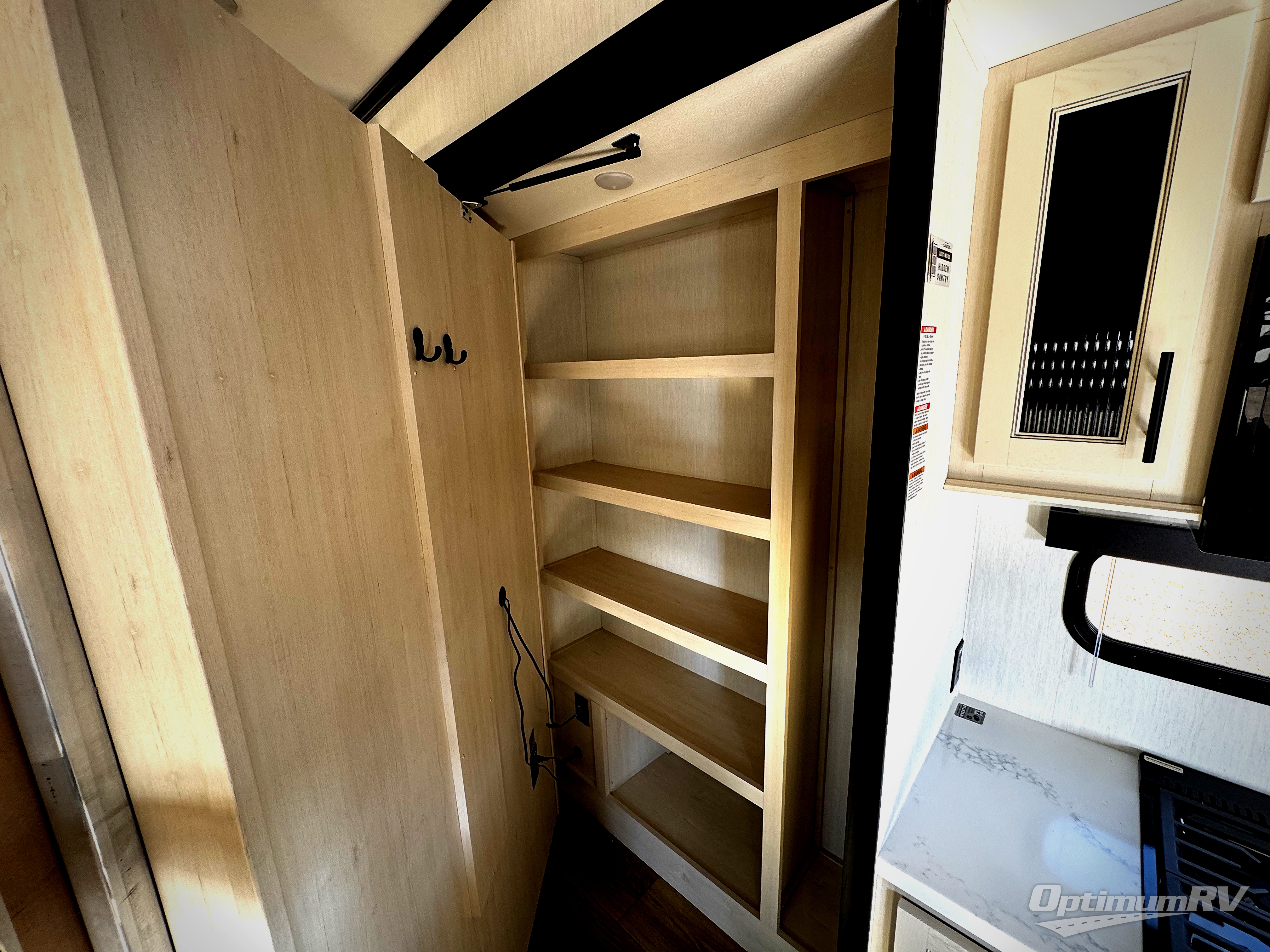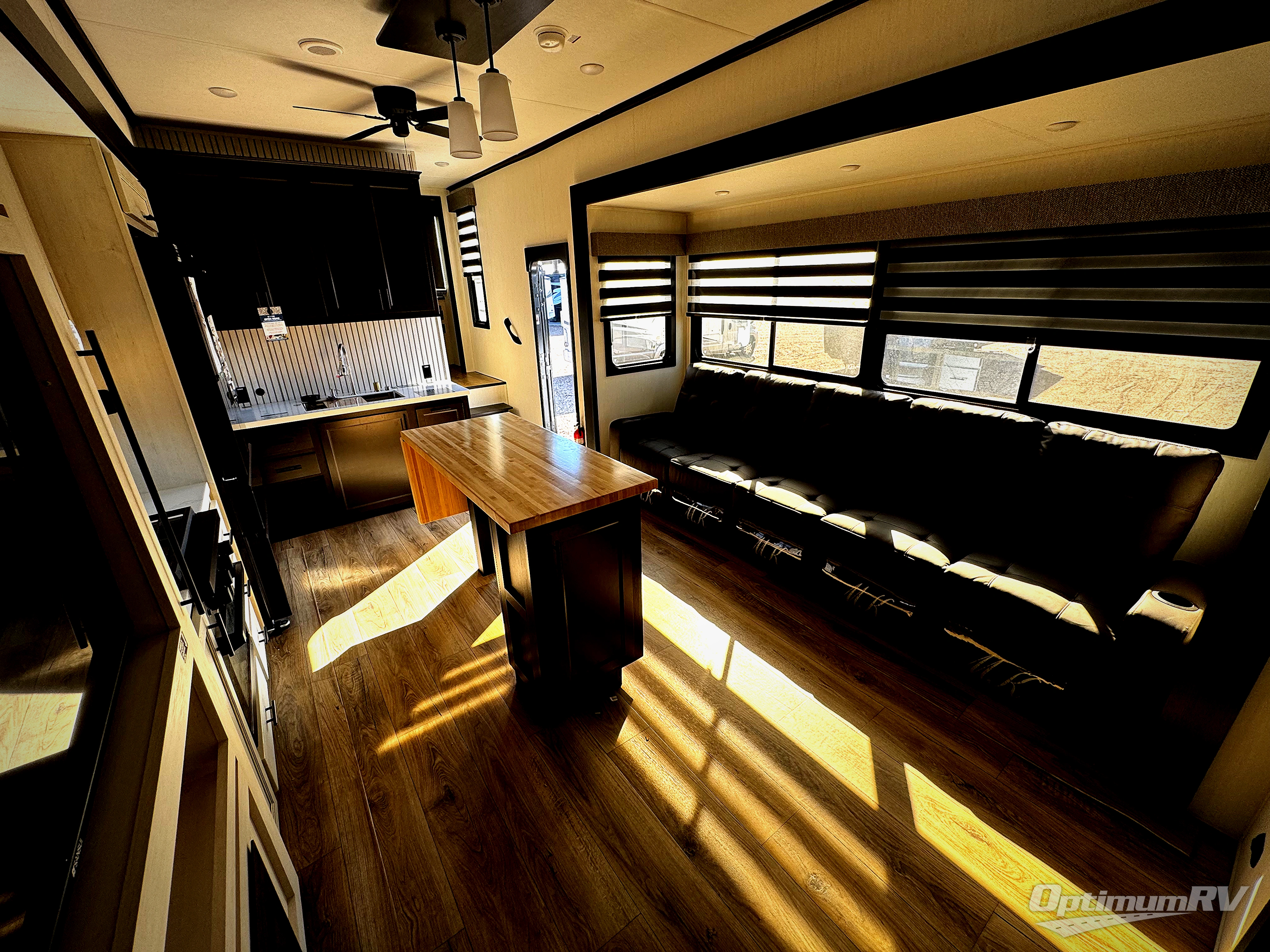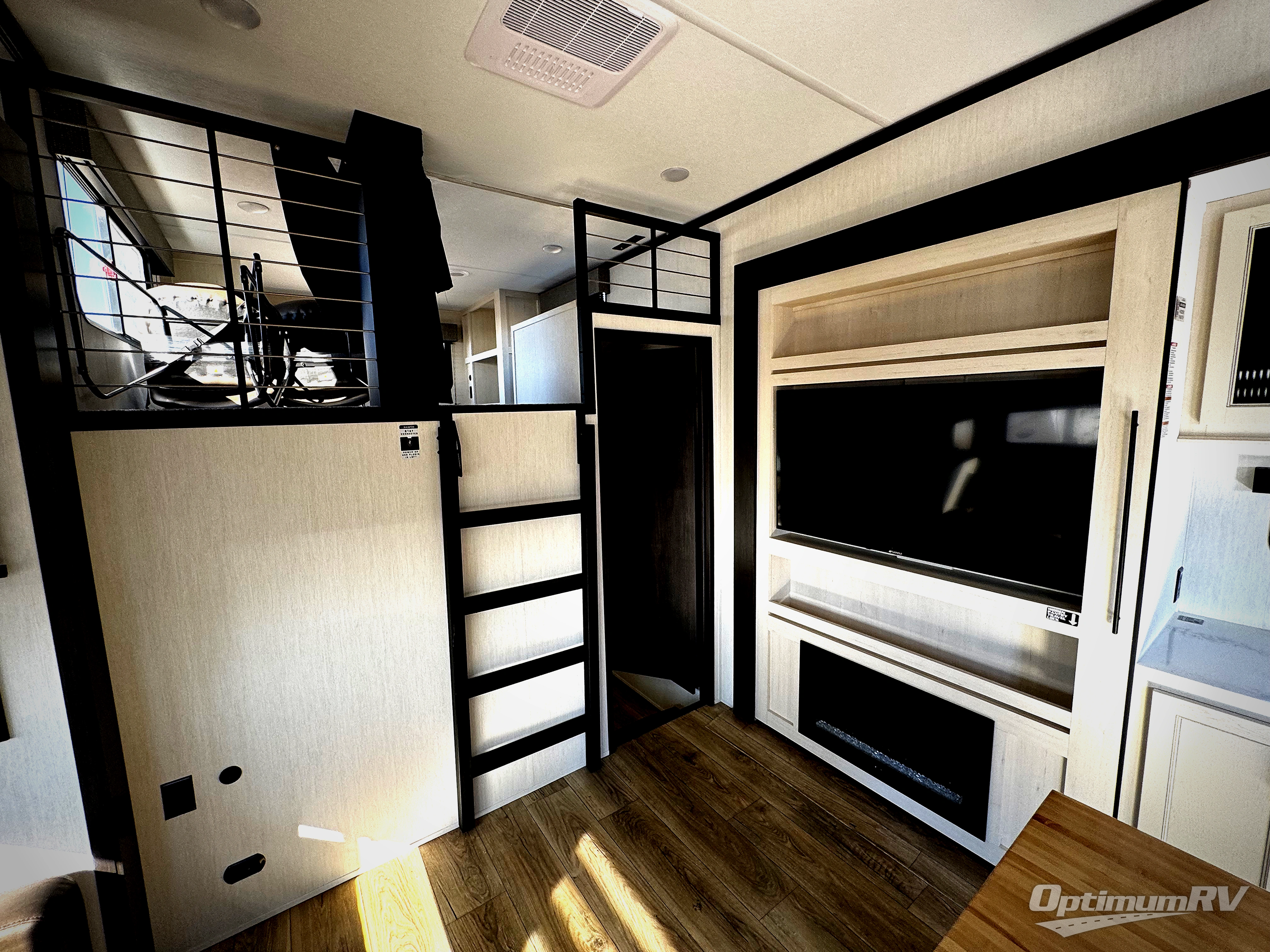 Are you looking for a fifth wheel where you can bring along your neighbor friends? You can do just that since there are two bedrooms in this unit, one of which includes a master bath with its own exterior entry door! The front bedroom is right next to the second full bath for convenience, and includes a camper king bed slide, a dresser, and front wardrobe. The rear master bedroom has a queen bed slide out across from a second slide for more floor space, and there is a loft above this room for more sleeping or storage space. Everyone can meet in the middle kitchen and living room since there are recliners, a ceiling fan, and kitchen island with four chairs. There is also storage below the island for kitchen necessities, and the hidden pantry behind the TV will be perfect for snacks, board games and more!