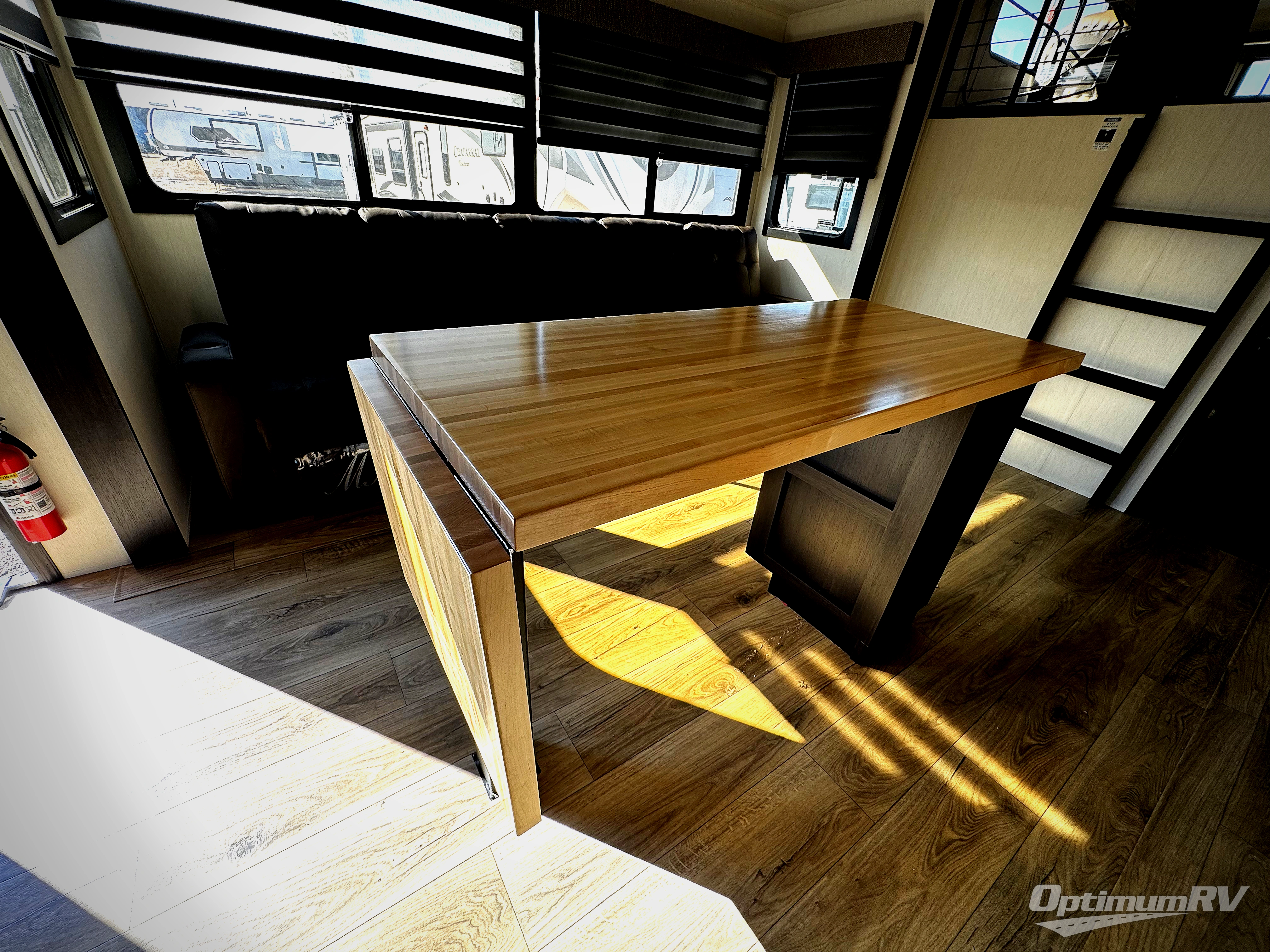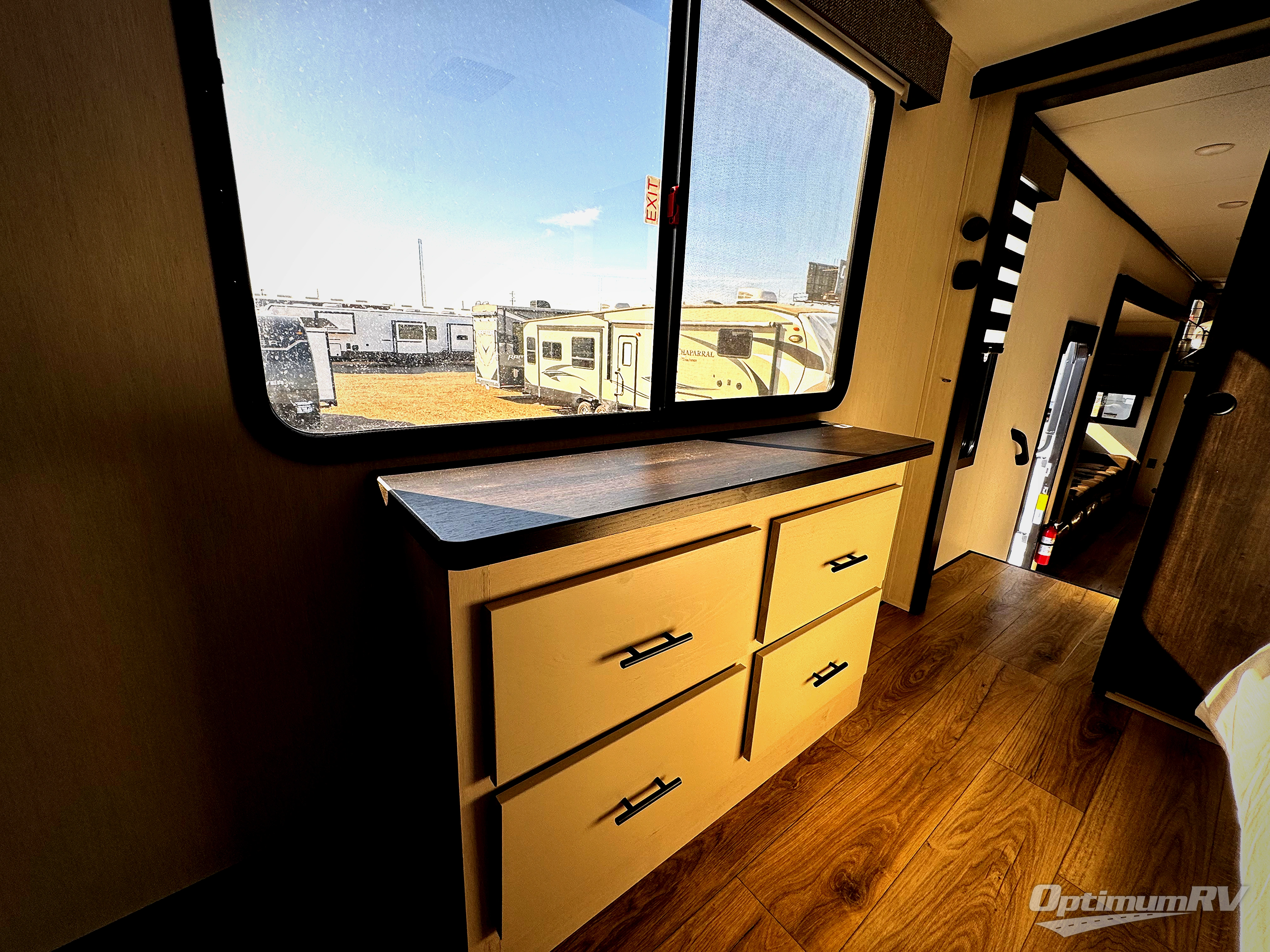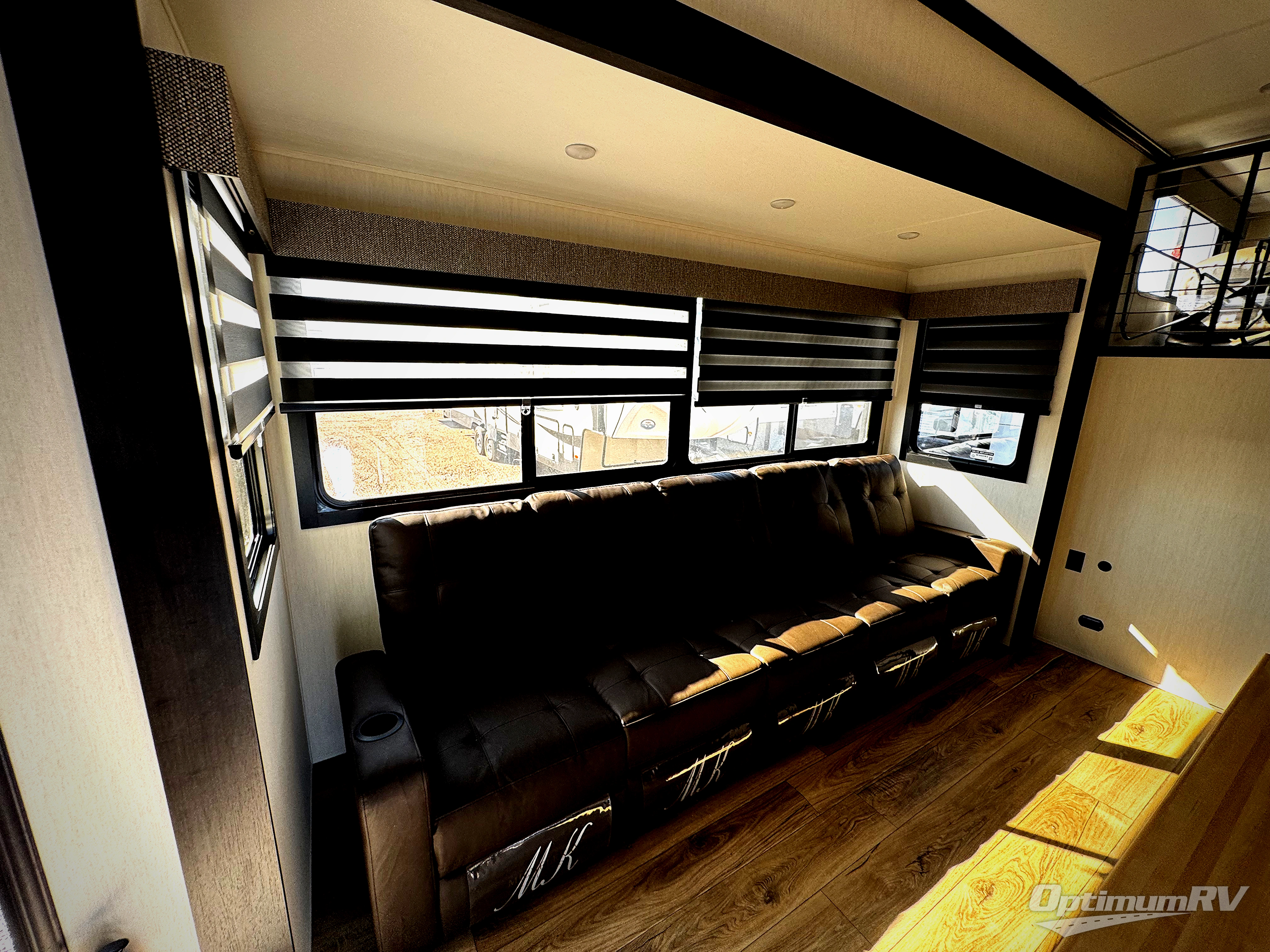 Are you looking for a fifth wheel where you can bring along your neighbor friends? You can do just that since there are two bedrooms in this unit, one of which includes a master bath with its own exterior entry door! The front bedroom is right next to the second full bath for convenience, and includes a camper king bed slide, a dresser, and front wardrobe. The rear master bedroom has a queen bed slide out across from a second slide for more floor space, and there is a loft above this room for more sleeping or storage space. Everyone can meet in the middle kitchen and living room since there are recliners, a ceiling fan, and kitchen island with four chairs. There is also storage below the island for kitchen necessities, and the hidden pantry behind the TV will be perfect for snacks, board games and more!