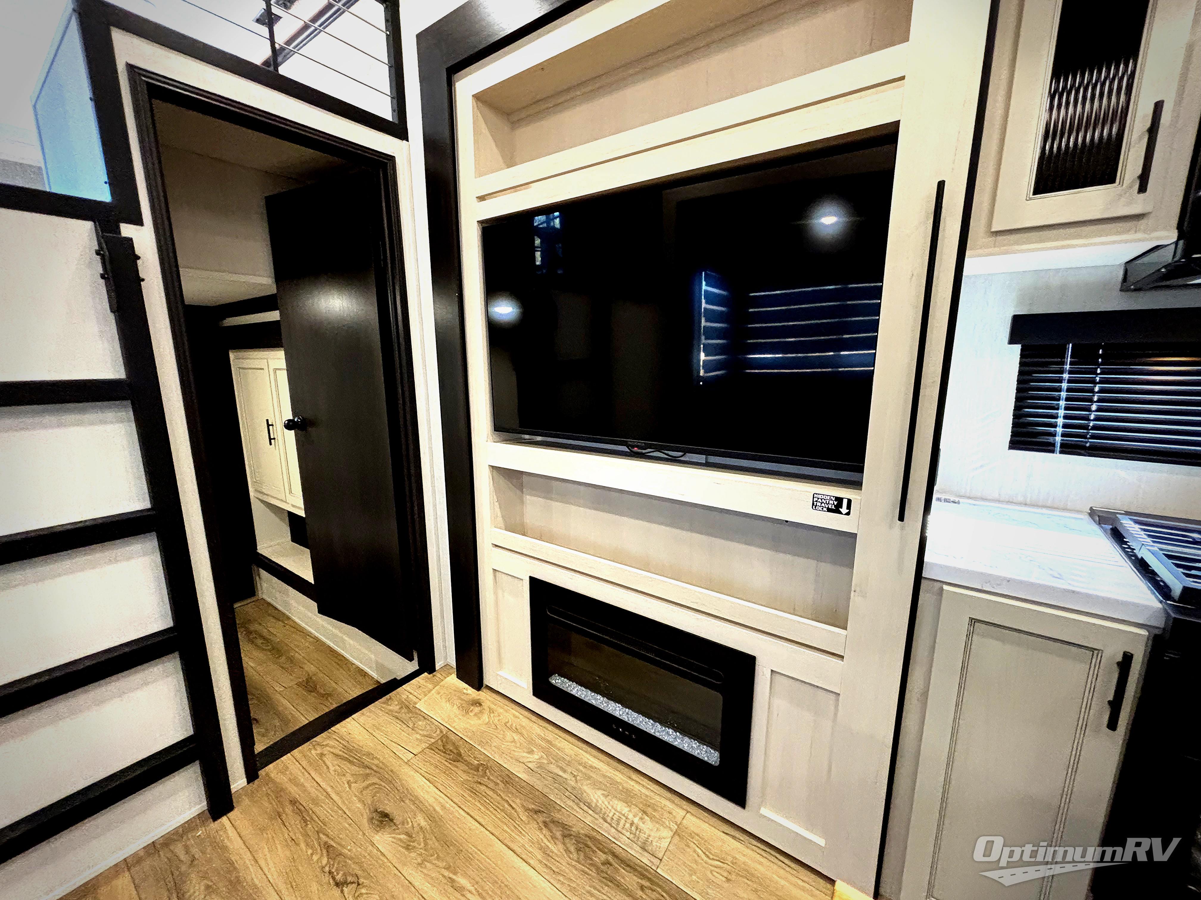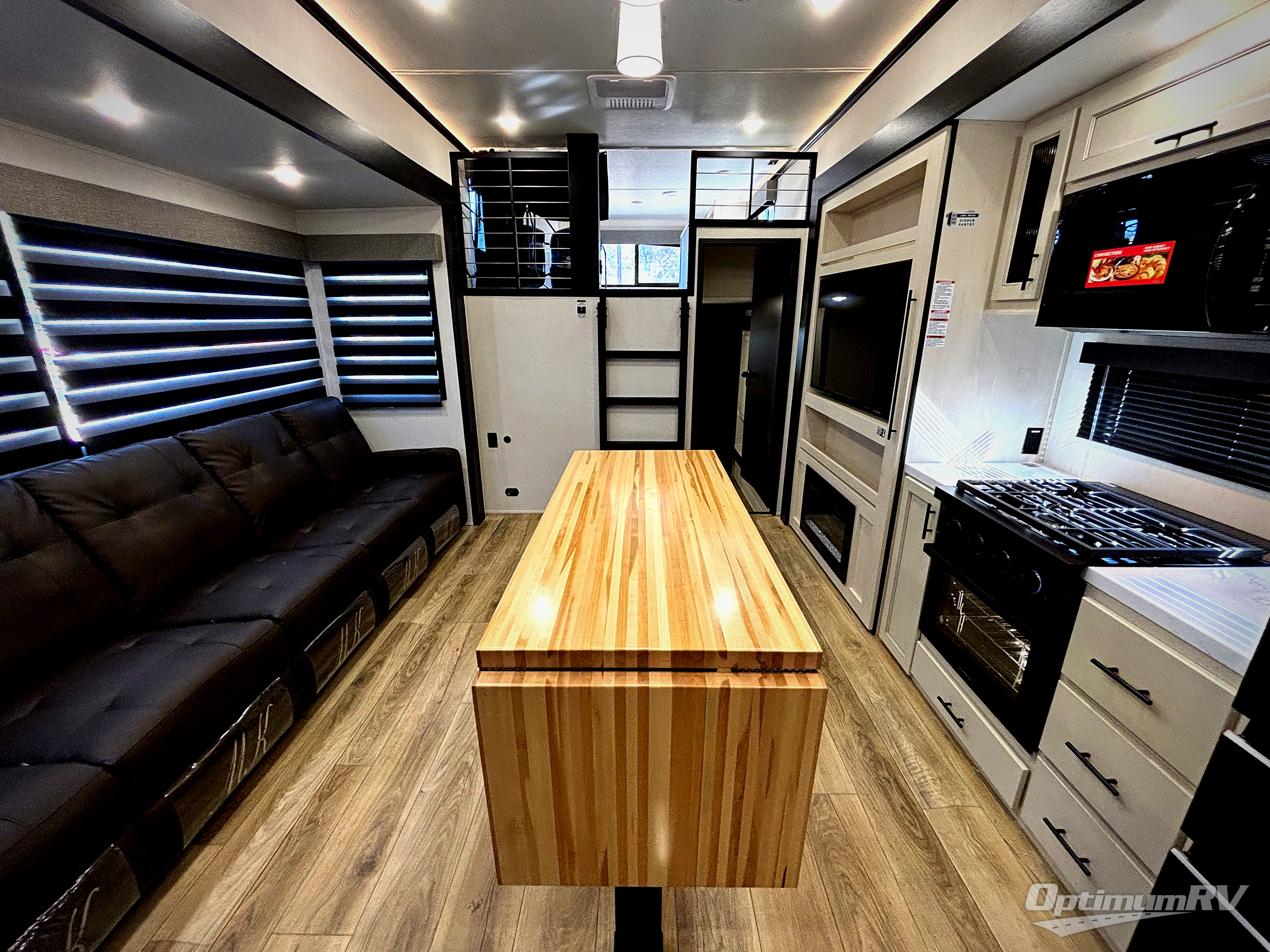 Are you looking for a fifth wheel where you can bring along your neighbor friends? You can do just that since there are two bedrooms in this unit, one of which includes a master bath with its own exterior entry door! The front bedroom is right next to the second full bath for convenience, and includes a camper king bed slide, a dresser, and front wardrobe. The rear master bedroom has a queen bed slide out across from a second slide for more floor space, and there is a loft above this room for more sleeping or storage space. Everyone can meet in the middle kitchen and living room since there are recliners, a ceiling fan, and kitchen island with four chairs. There is also storage below the island for kitchen necessities, and the hidden pantry behind the TV will be perfect for snacks, board games and more!