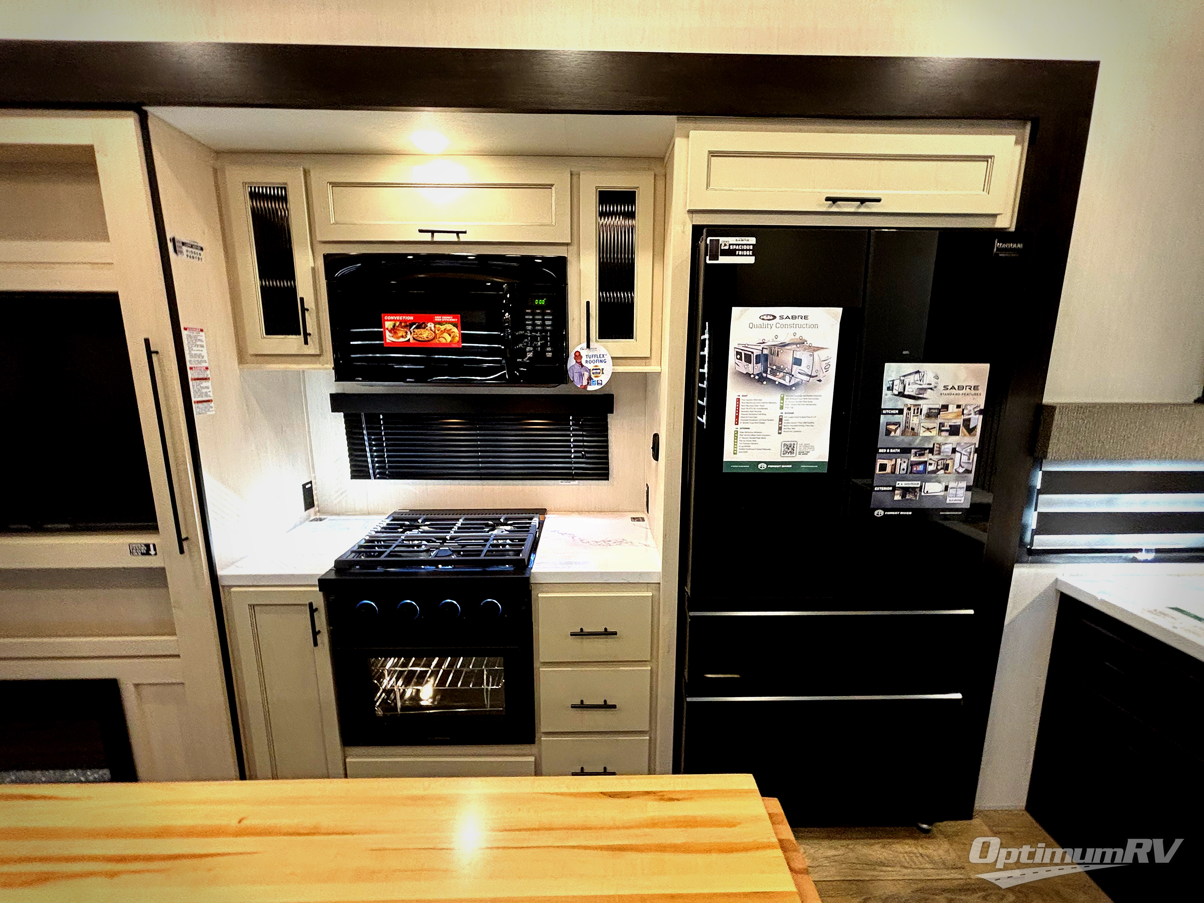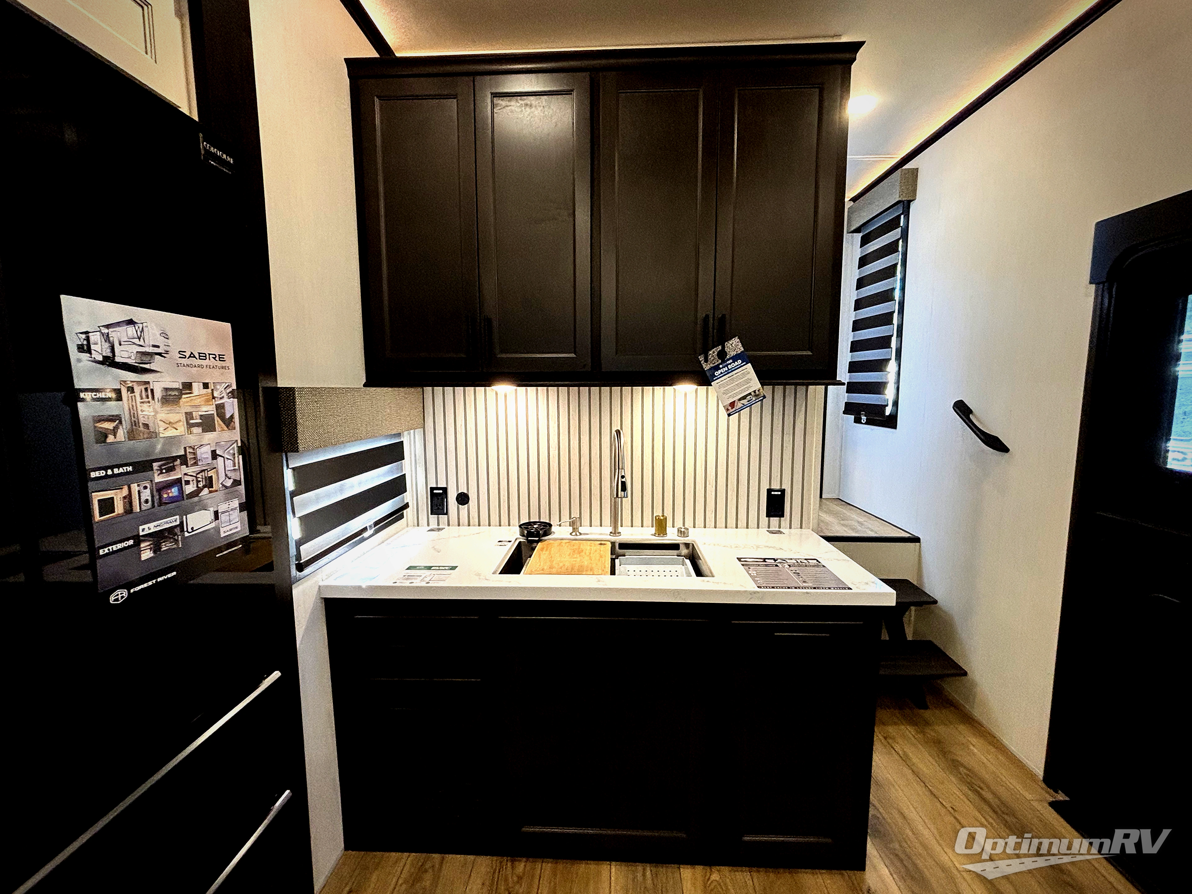 You will experience luxurious camping trips at an affordable price with any one of these Forest River Sabre fifth wheels! These models are durable and ready to travel anytime of the year thanks to features like the high-gloss gel-coat front cap with LED lighting, the PVC roof membrane, and the forced air underbelly with enclosed gate valves. The electric auto-leveling system makes setting up easy and safe, and the adjustable power awning with LED lighting will create an inviting outdoor living space. Each model includes a universal docking station which includes a black tank flush and an outside shower, and detachable and adjustable stable steps for you to enter and exit the unit safely. Inside, you will love the design of the ambient accent lighting in the living area, the real wood lumbercore cabinetry, and the linoleum flooring!