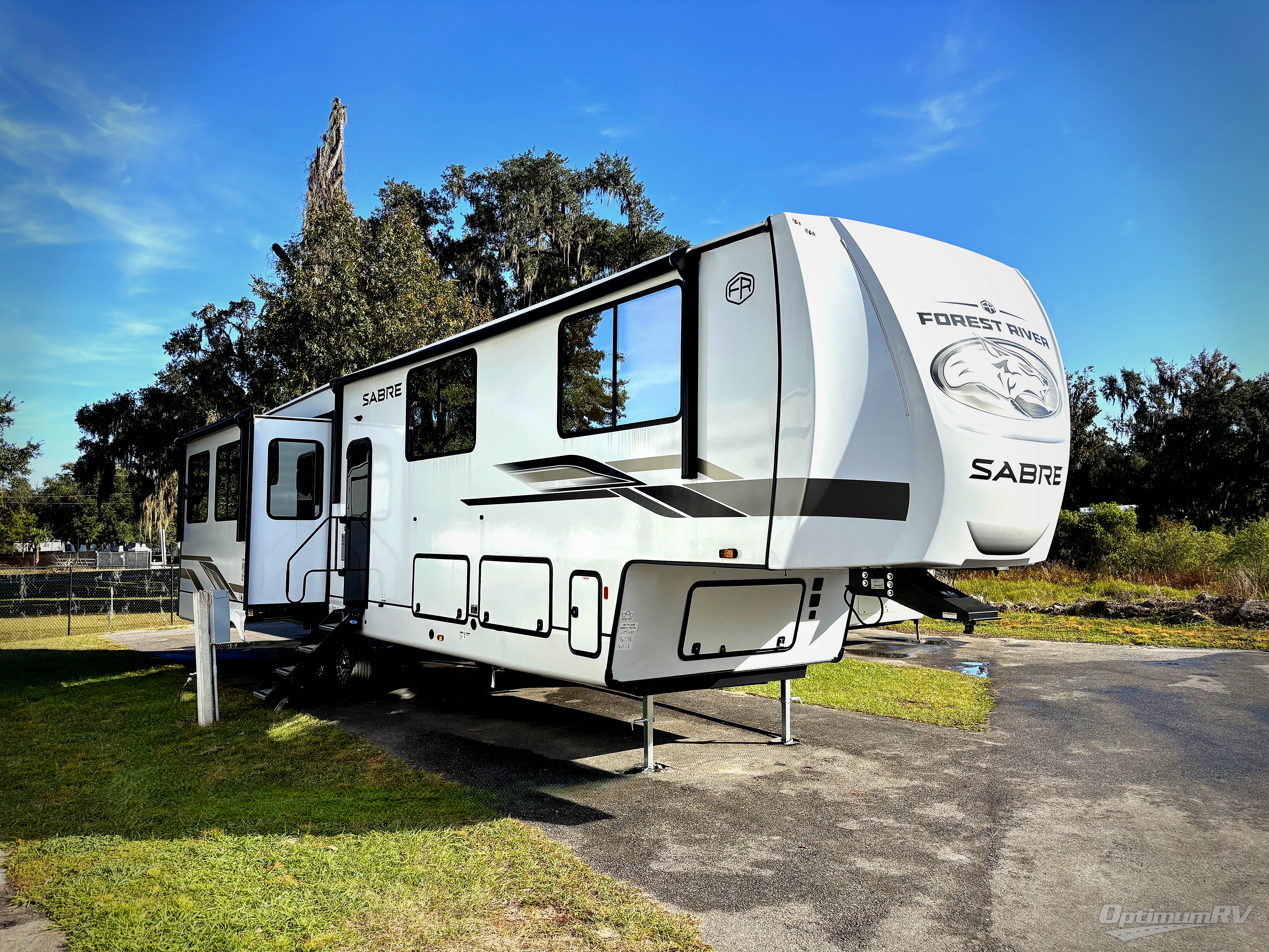 You will experience luxurious camping trips at an affordable price with any one of these Forest River Sabre fifth wheels! These models are durable and ready to travel anytime of the year thanks to features like the high-gloss gel-coat front cap with LED lighting, the PVC roof membrane, and the forced air underbelly with enclosed gate valves. The electric auto-leveling system makes setting up easy and safe, and the adjustable power awning with LED lighting will create an inviting outdoor living space. Each model includes a universal docking station which includes a black tank flush and an outside shower, and adjustable stable steps for you to enter and exit the unit safely. Inside, you will love the design of the ambient accent lighting in the living area, the real wood lumbercore cabinetry, and the linoleum flooring!