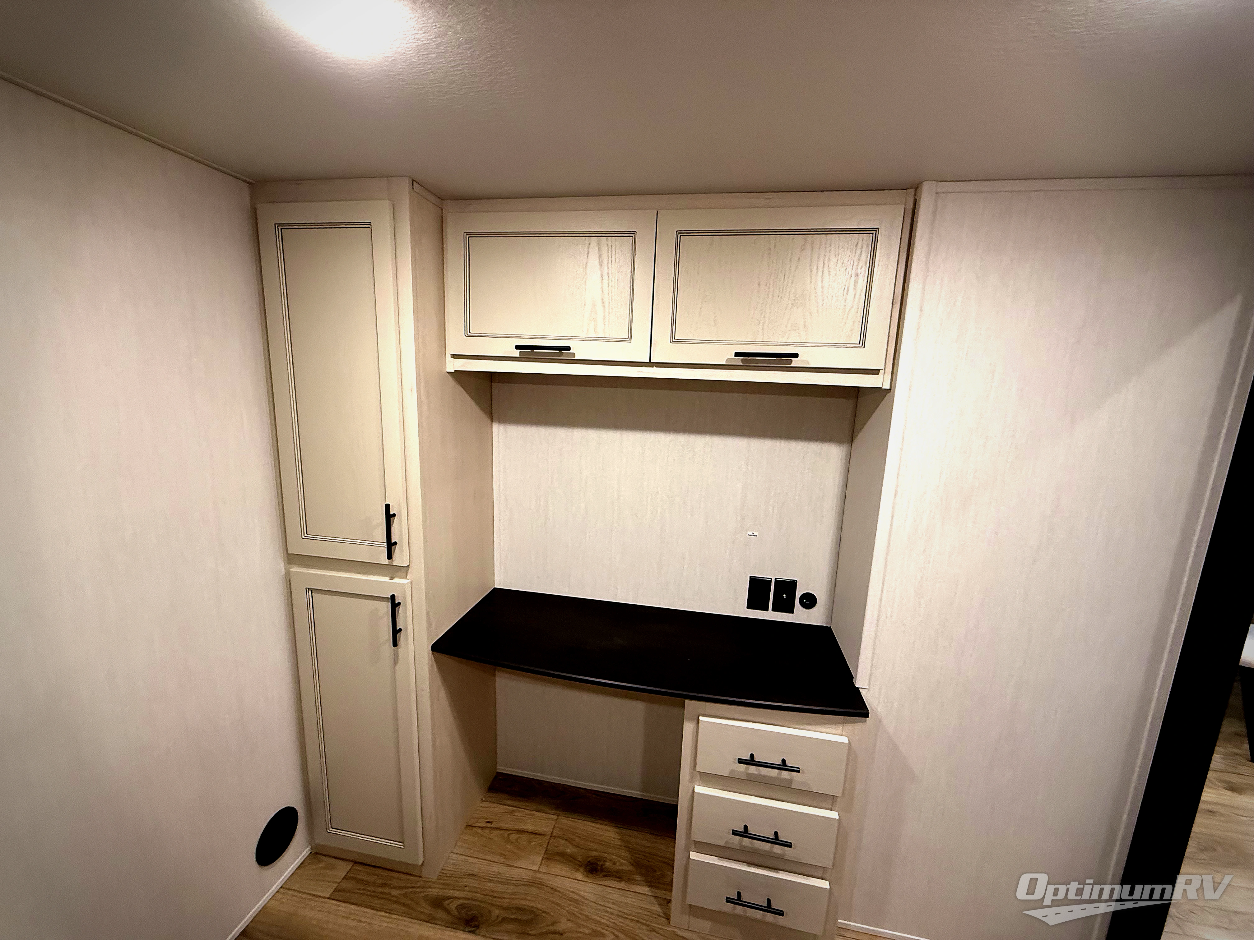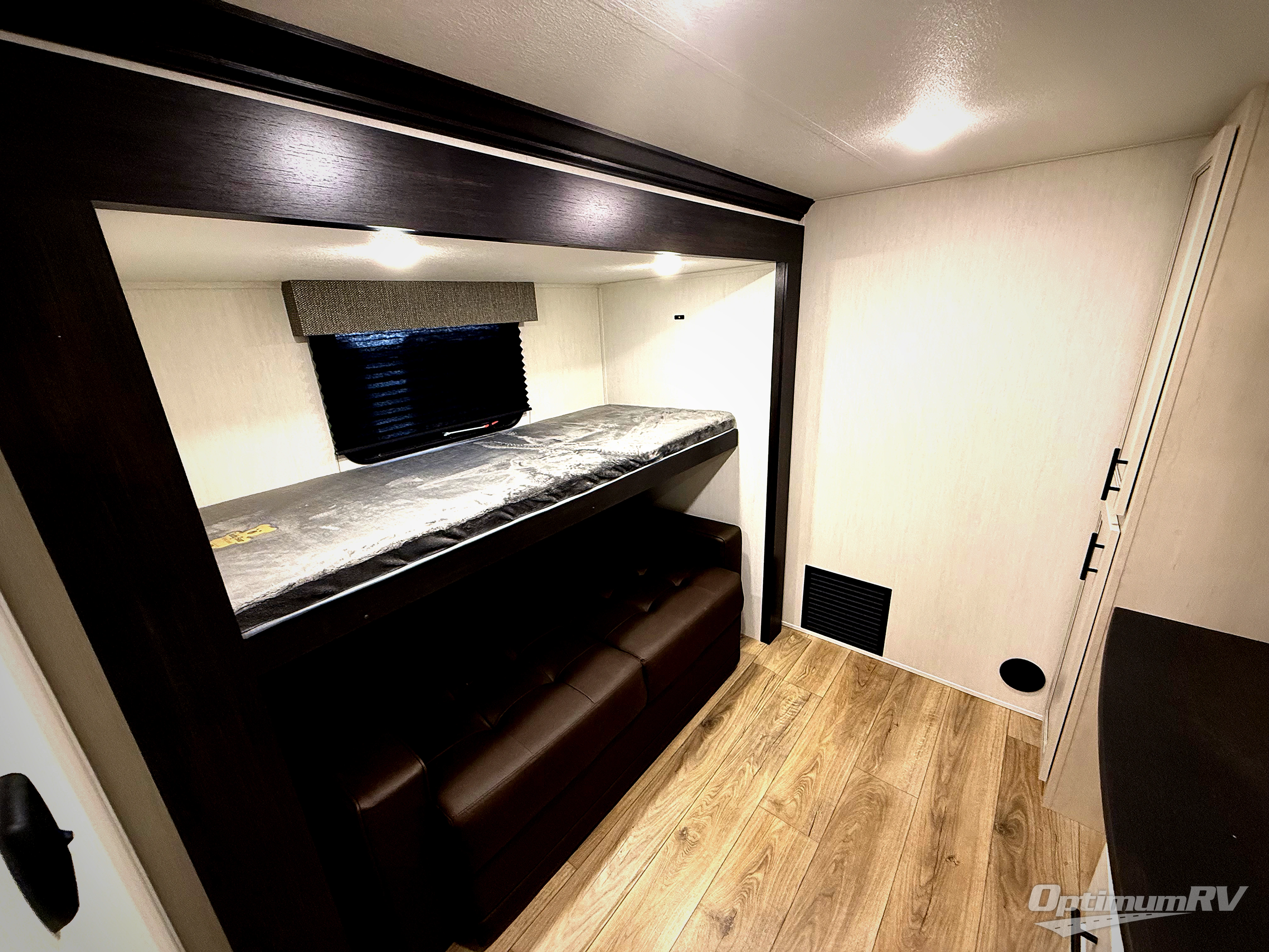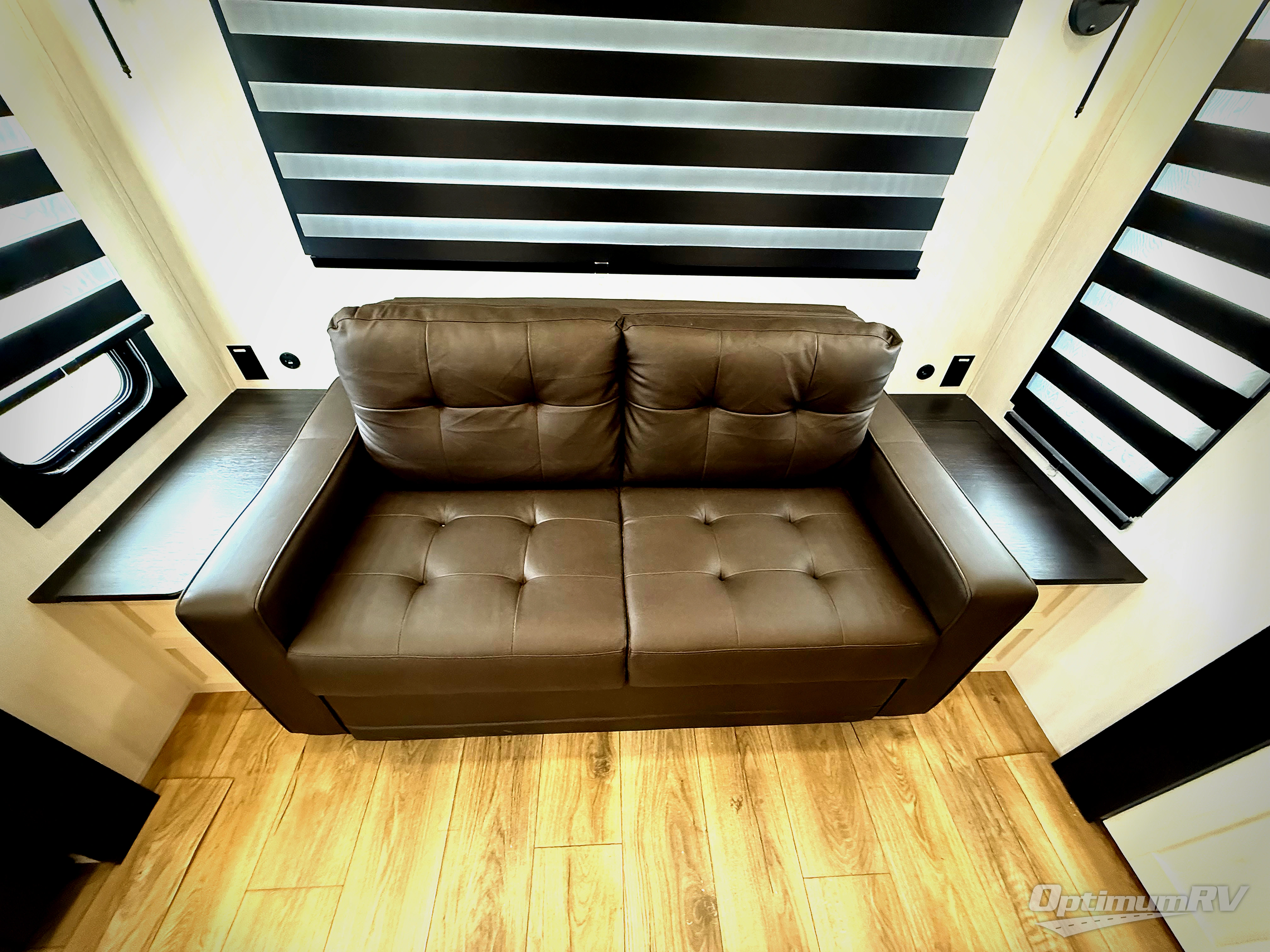 There is much to love in this fifth wheel! Starting with the second bedroom which has a slide that houses a flip-up bunk above a tri-fold sofa across from a desk with drawers, a drop zone, and a wardrobe, plus above all of that is a storage/bunk loft. The rear living area includes a tri-fold sofa, a TV with a hidden pantry behind, and theater seating for two making this space another area at night for guests. In the morning, you can prepare breakfast on the kitchen island, then dine together at the versatile dinette/desk. The full bath will allow you to stay clean throughout your trip, and you'll feel right at home in the front private bedroom with a camper king bed, a dresser, and front wardrobe. Outside, a kitchen and two power awnings create an inviting space!