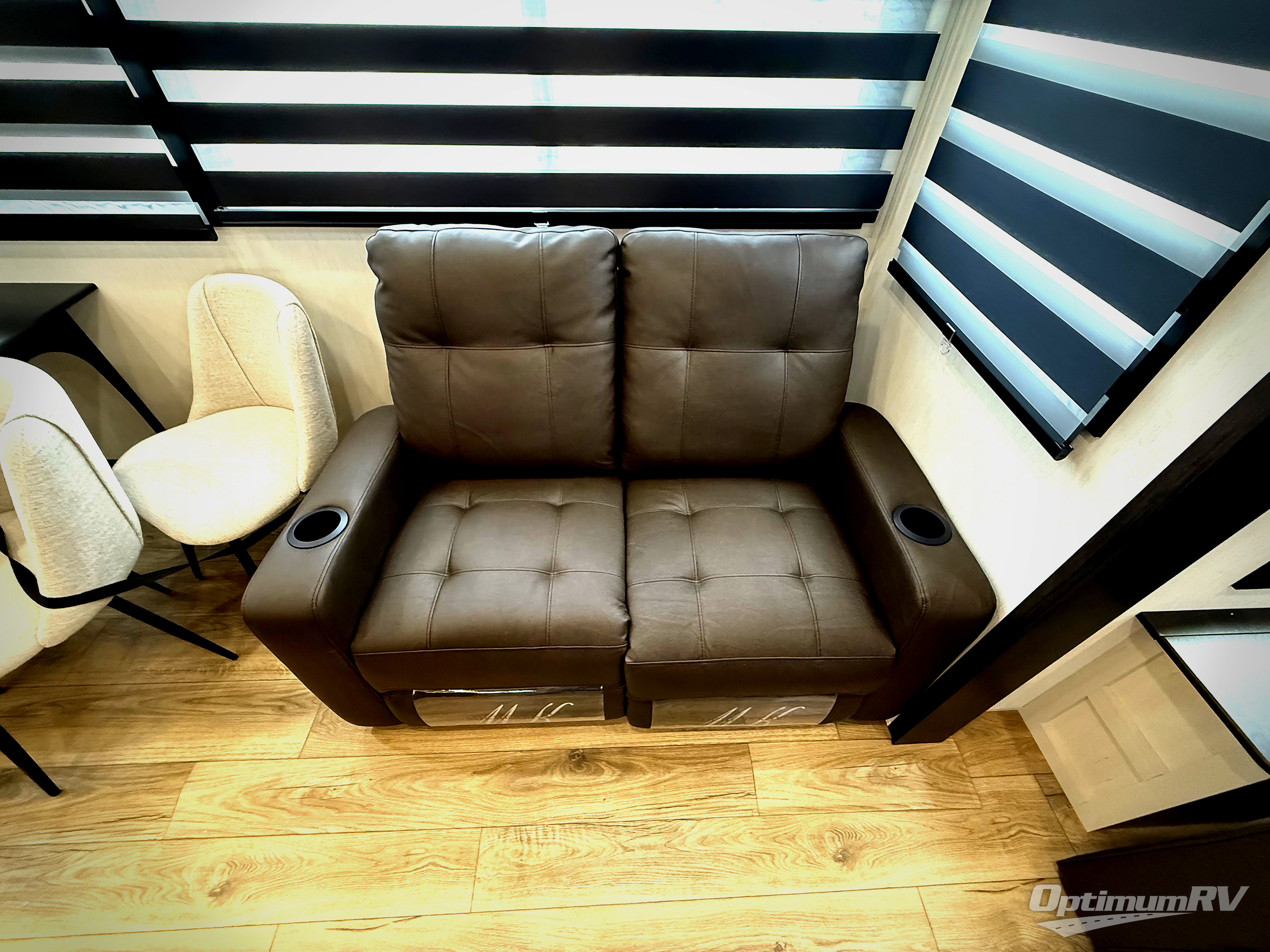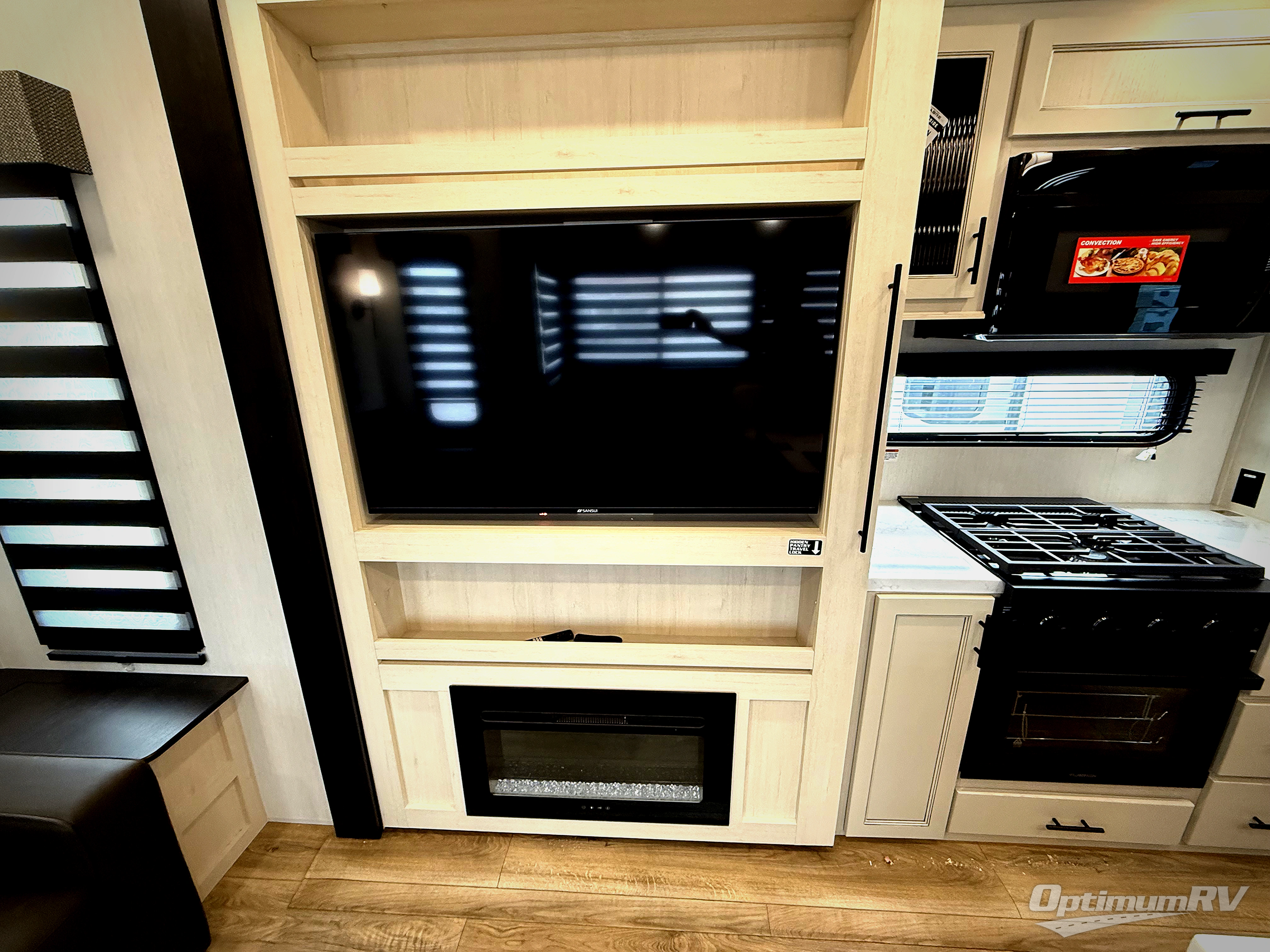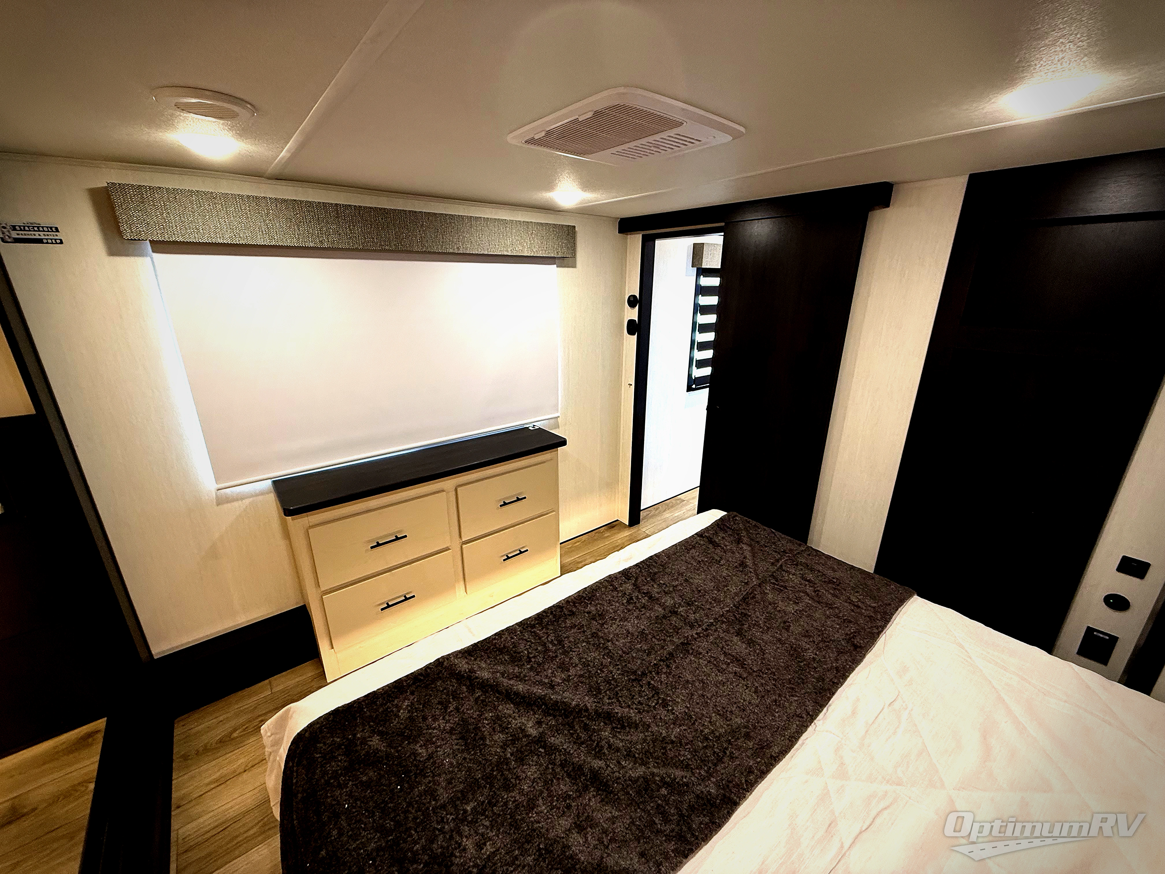 There is much to love in this fifth wheel! Starting with the second bedroom which has a slide that houses a flip-up bunk above a tri-fold sofa across from a desk with drawers, a drop zone, and a wardrobe, plus above all of that is a storage/bunk loft. The rear living area includes a tri-fold sofa, a TV with a hidden pantry behind, and theater seating for two making this space another area at night for guests. In the morning, you can prepare breakfast on the kitchen island, then dine together at the versatile dinette/desk. The full bath will allow you to stay clean throughout your trip, and you'll feel right at home in the front private bedroom with a camper king bed, a dresser, and front wardrobe. Outside, a kitchen and two power awnings create an inviting space!