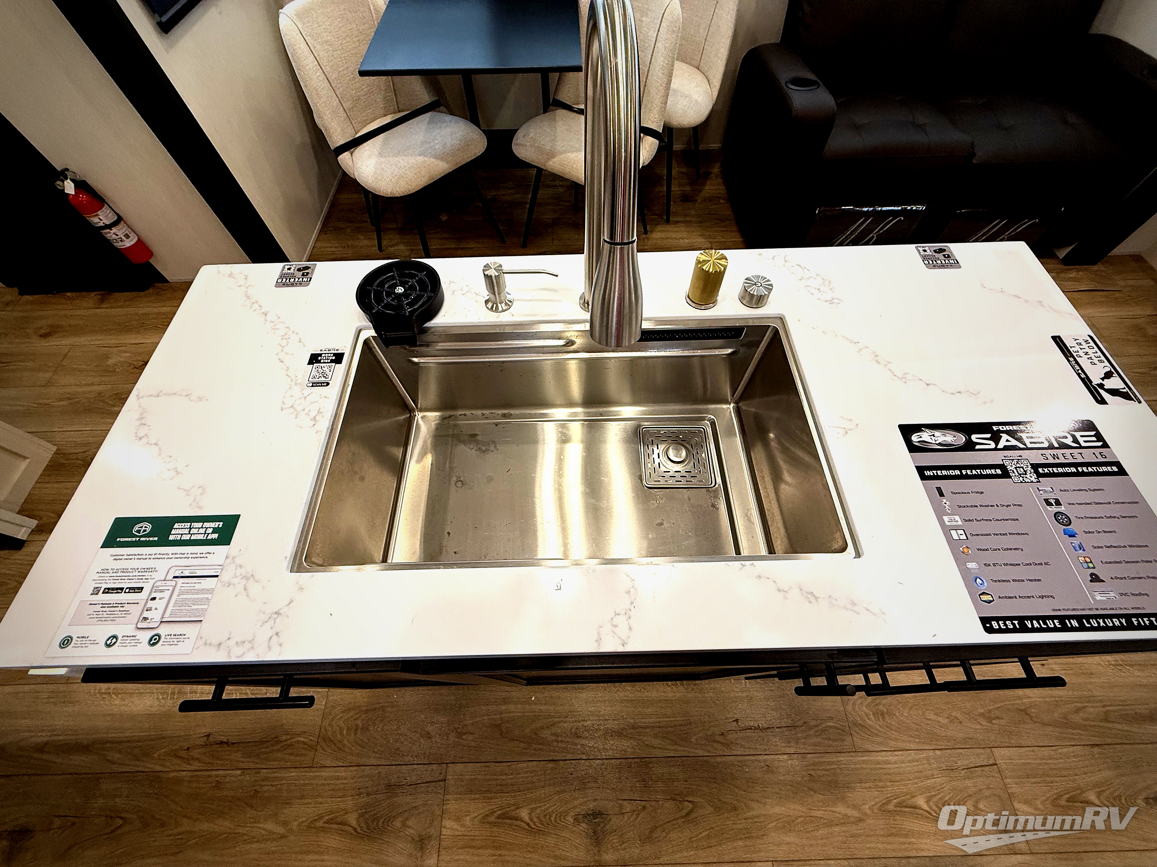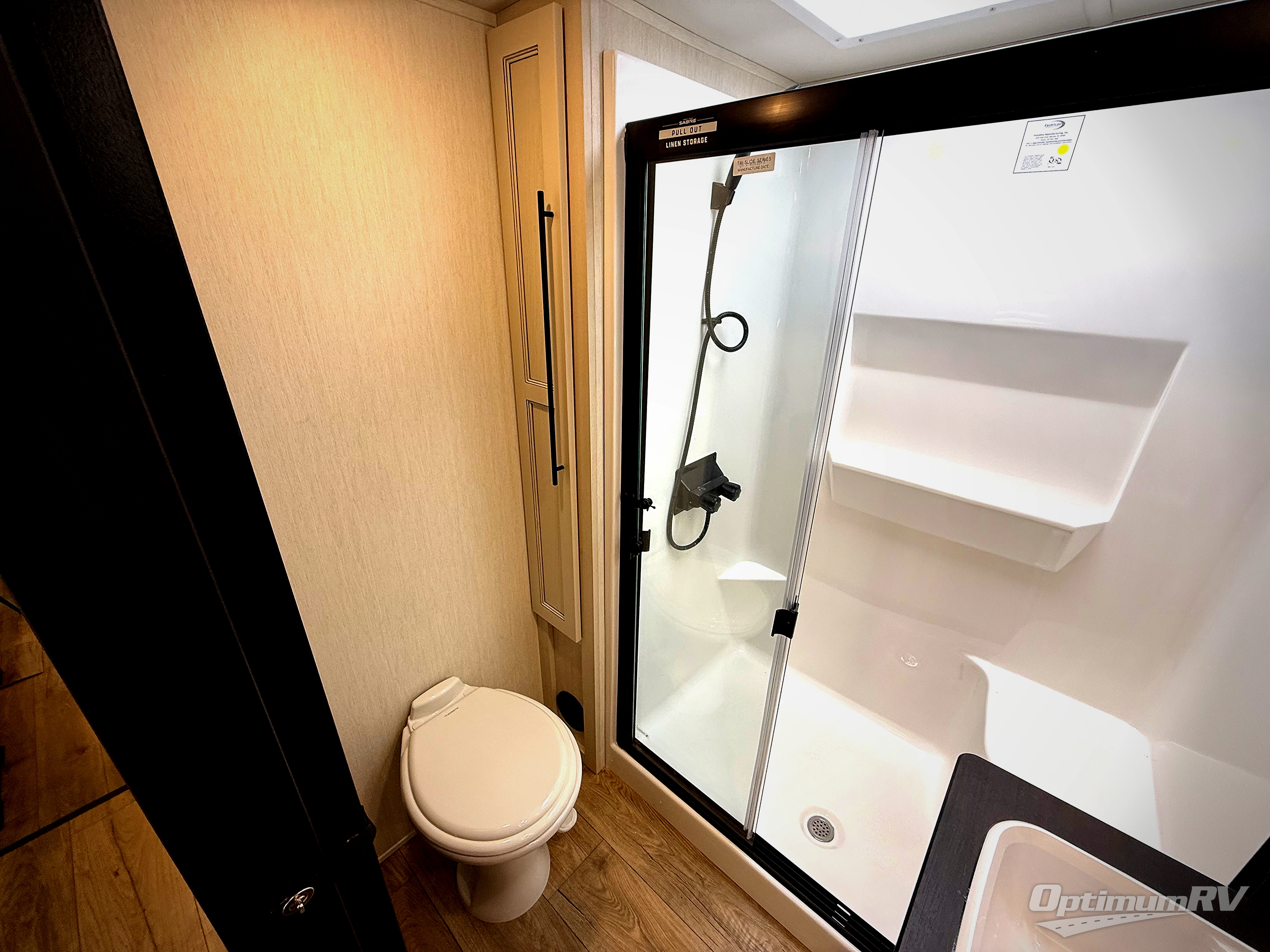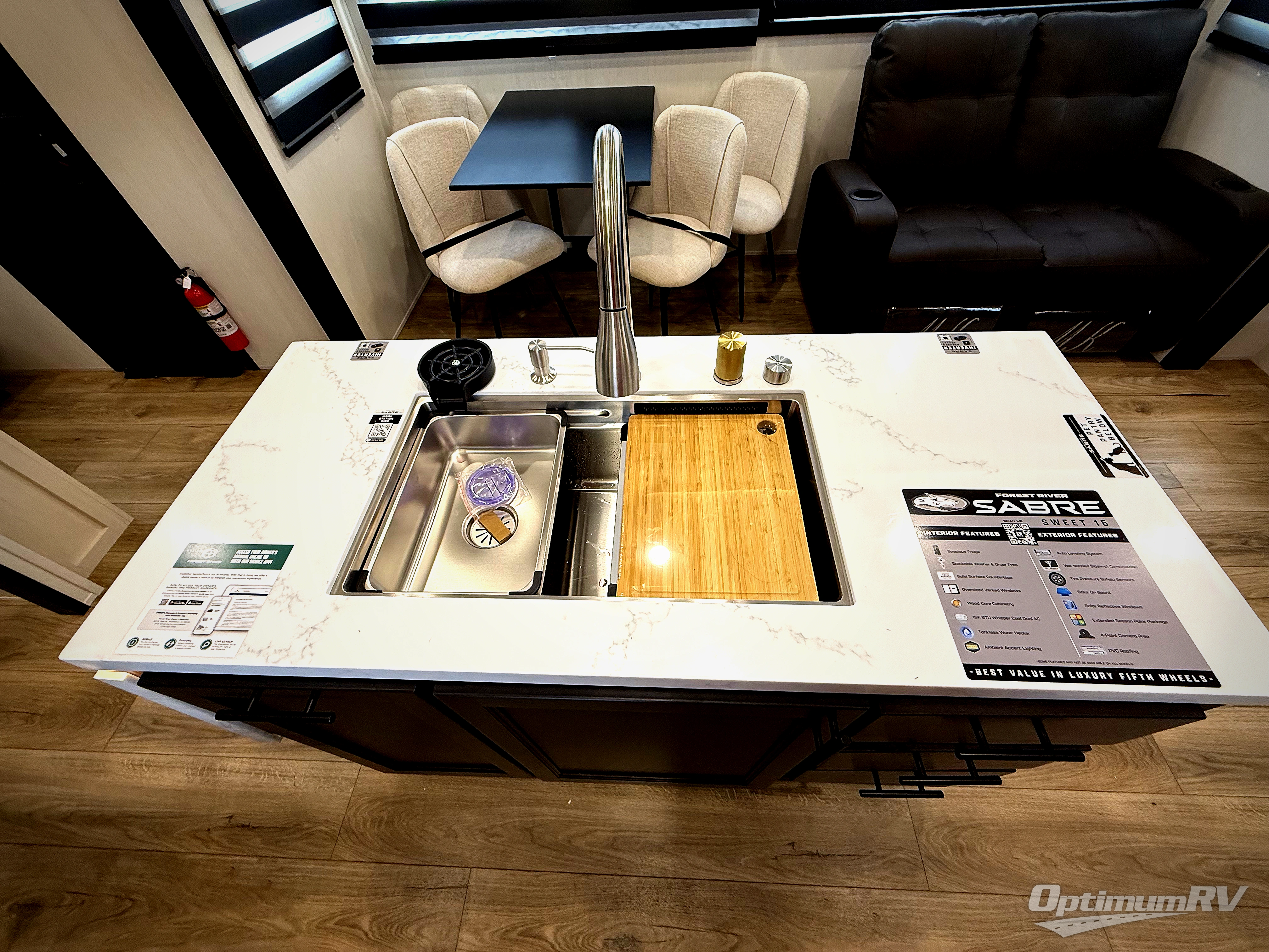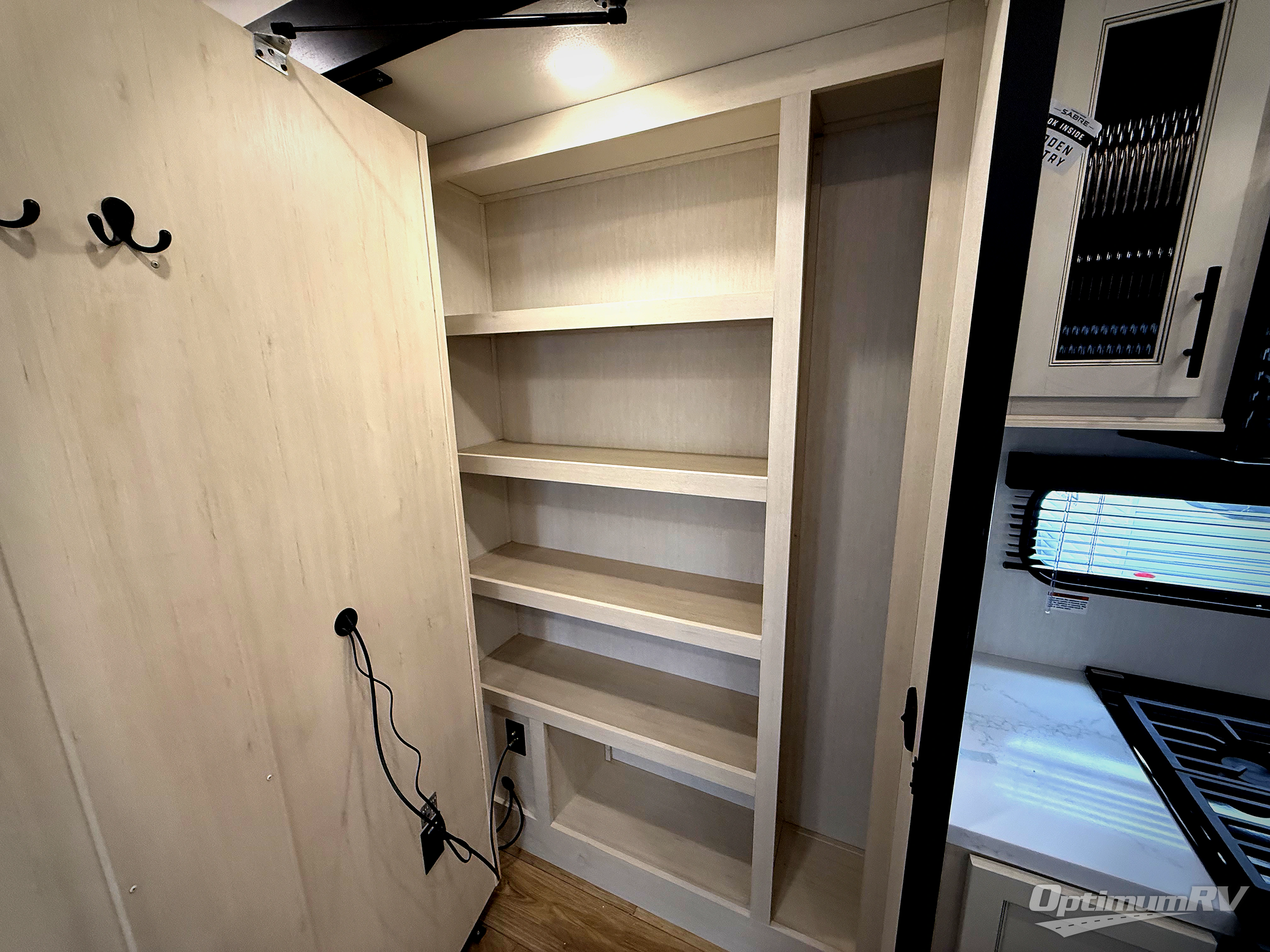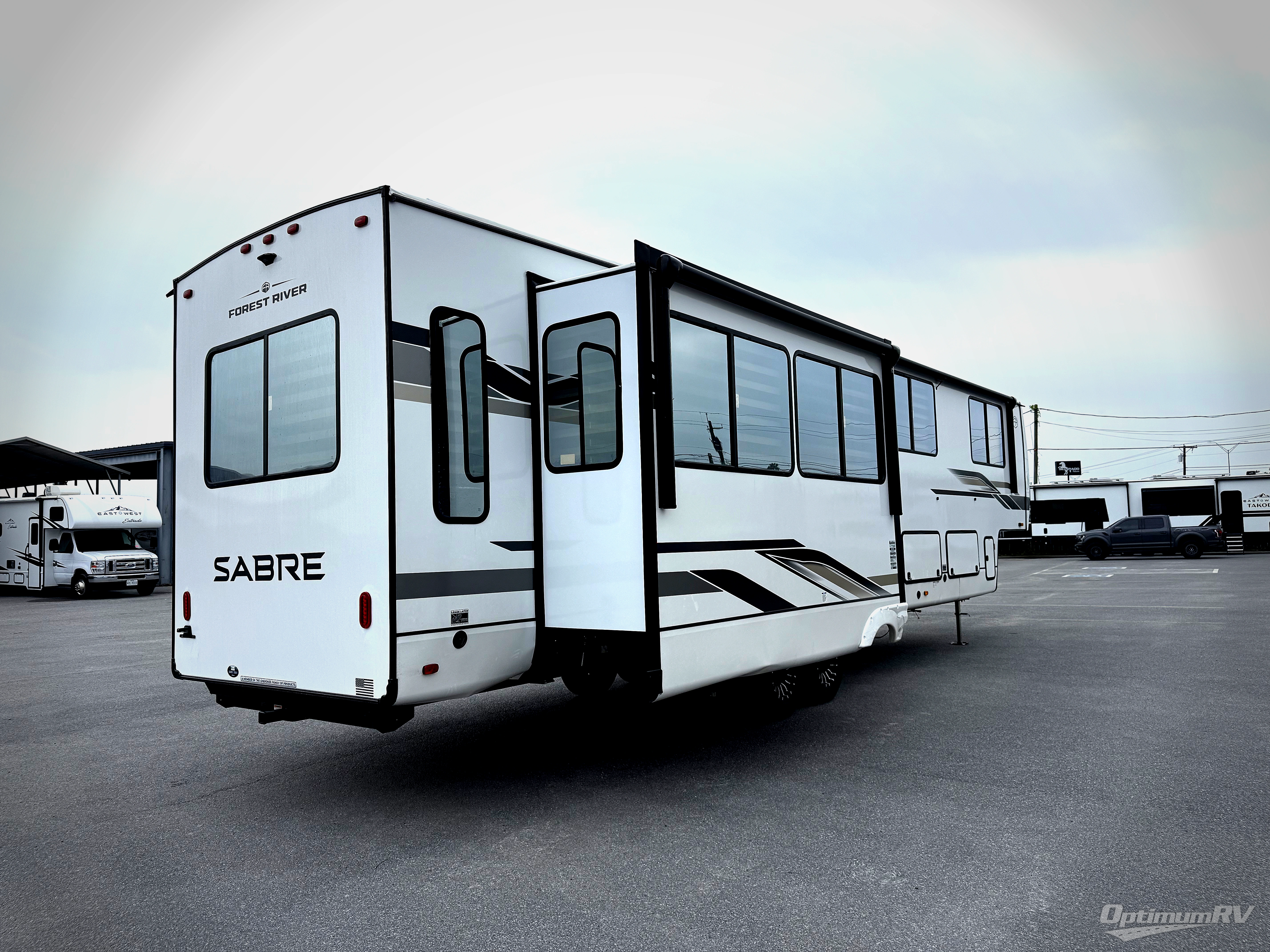 You will experience luxurious camping trips at an affordable price with any one of these Forest River Sabre fifth wheels! These models are durable and ready to travel anytime of the year thanks to features like the high-gloss gel-coat front cap with LED lighting, the PVC roof membrane, and the forced air underbelly with enclosed gate valves. The electric auto-leveling system makes setting up easy and safe, and the adjustable power awning with LED lighting will create an inviting outdoor living space. Each model includes a universal docking station which includes a black tank flush and an outside shower, and adjustable stable steps for you to enter and exit the unit safely. Inside, you will love the design of the ambient accent lighting in the living area, the real wood lumbercore cabinetry, and the linoleum flooring!