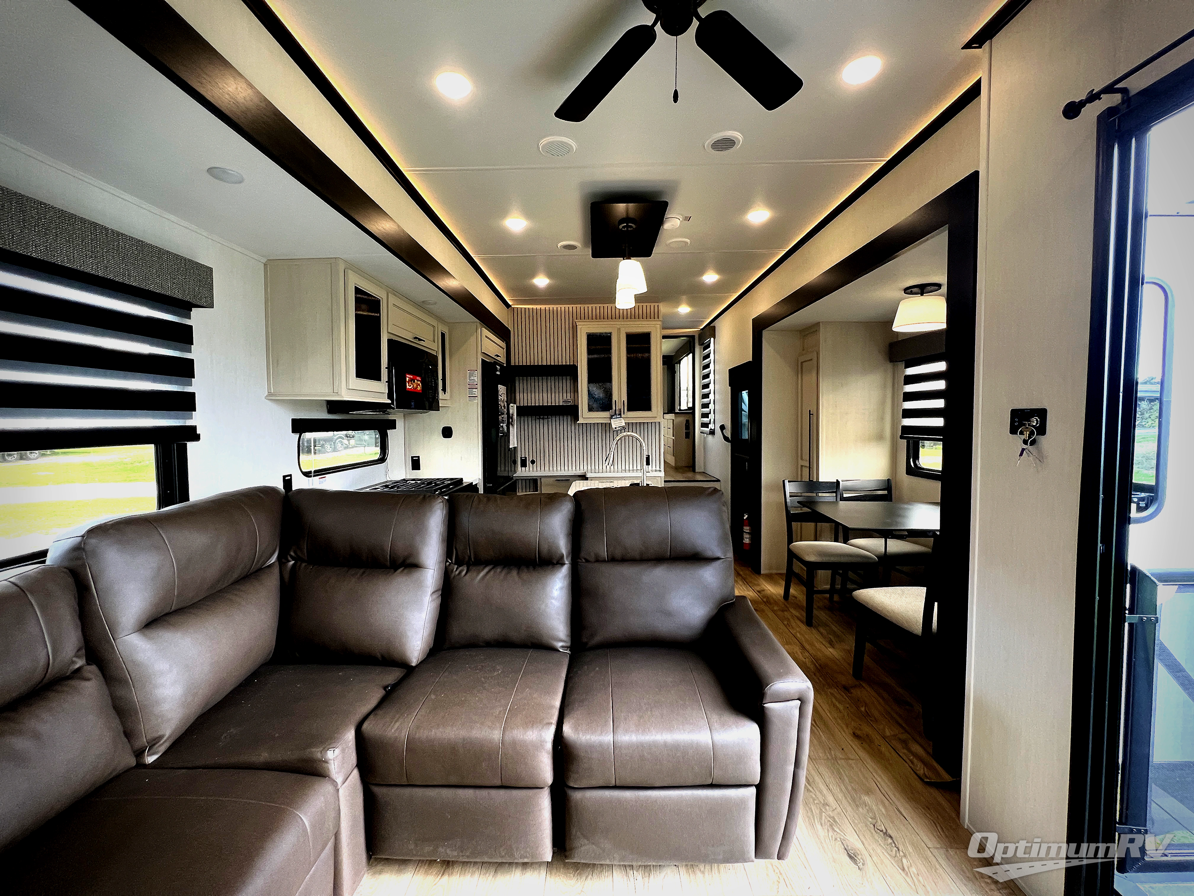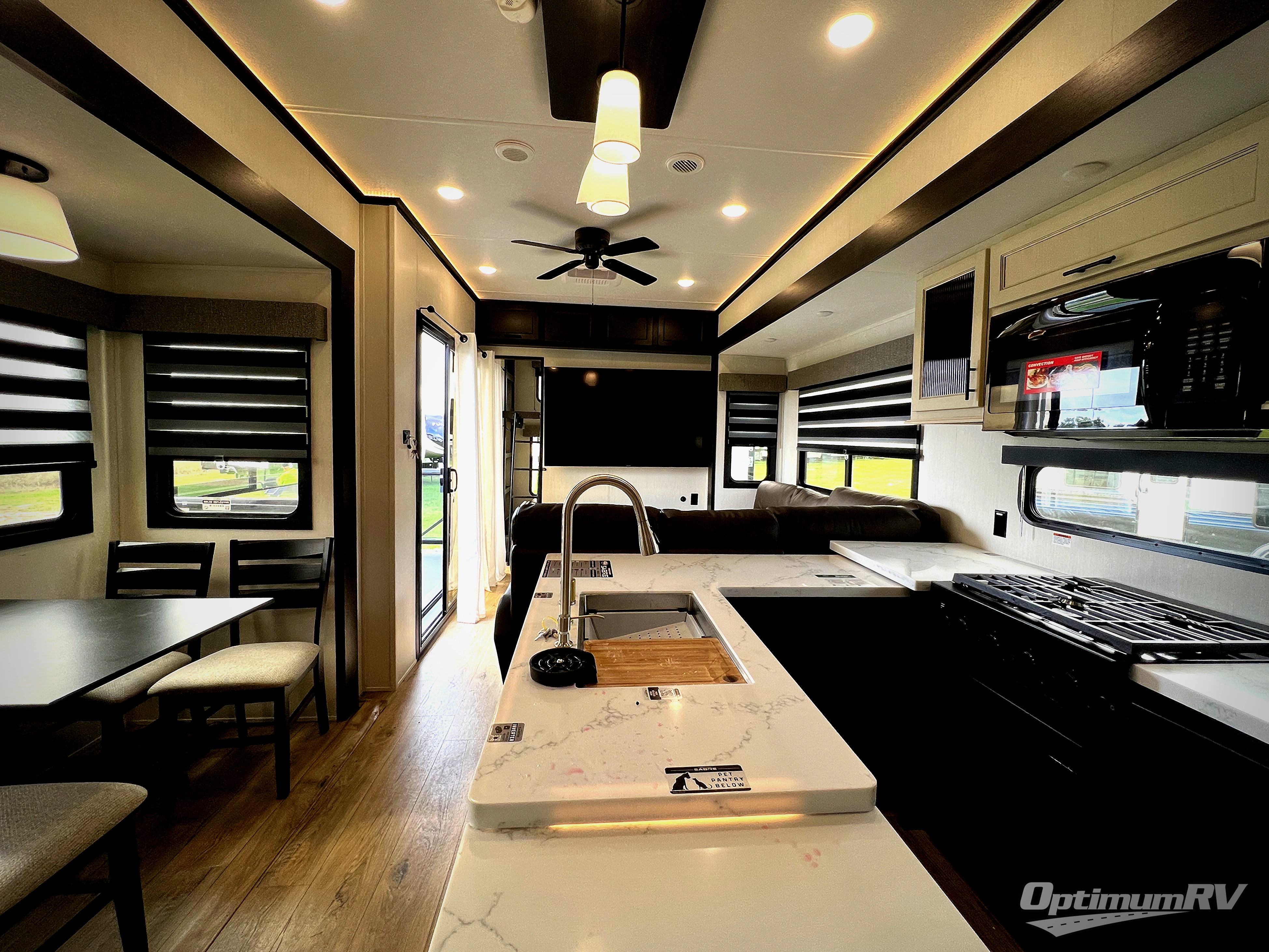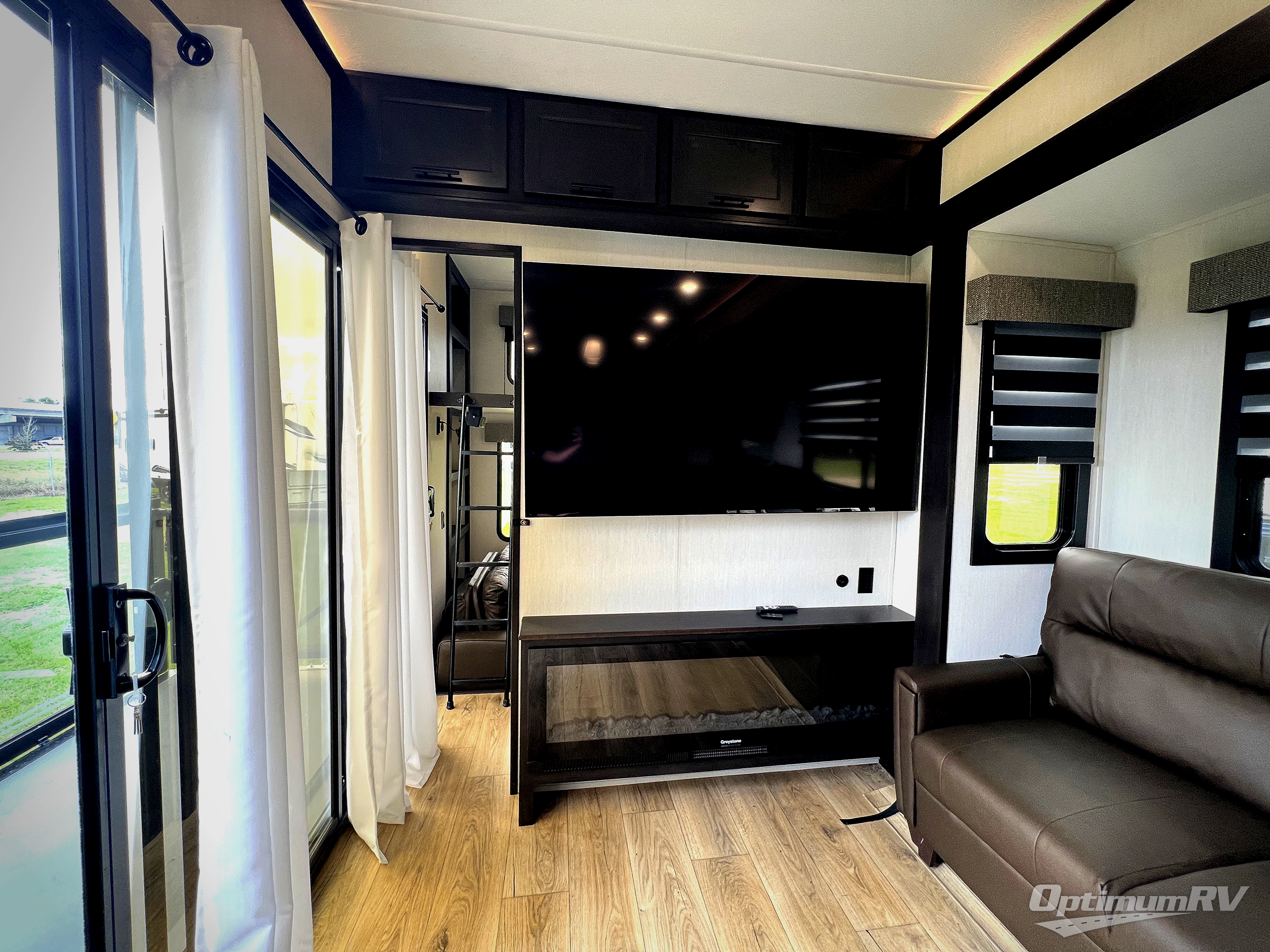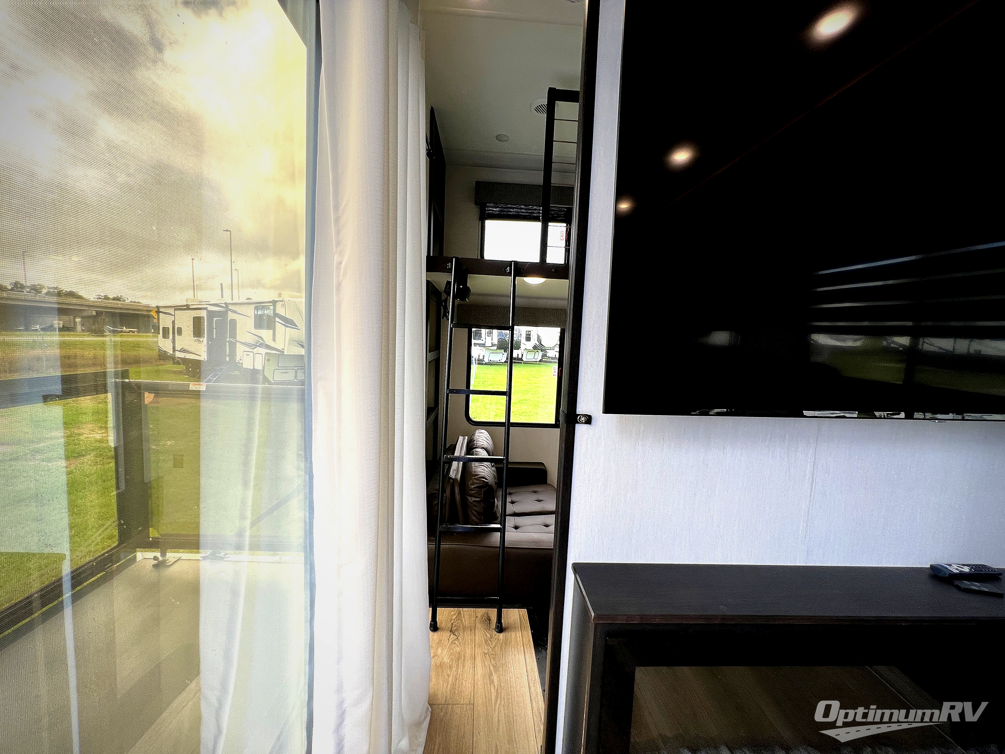 This is the perfect fifth wheel if you enjoy camping with friends and family! You'll have the front private bedroom with a camper king bed slide all to yourselves, while your guests take the rear den. There is a tri-fold sofa here, along with a wardrobe with a desk, additional shelves plus a loft above this room for even more sleeping or storage space! The main living room features an L-shaped sectional sofa, a fireplace and an entertainment center. And the patio deck with a 12' awning is right off of this room so you can visit with friends indoors or outdoors! There is generous counter space in the full kitchen, along with a pull-out storage drawer and a versatile dinette/desk. There are many more stand-out features found in this fifth wheel, including washer and dryer prep in the front bedroom, a 70" projector screen in the rear den, a second power awning, and the list goes on!