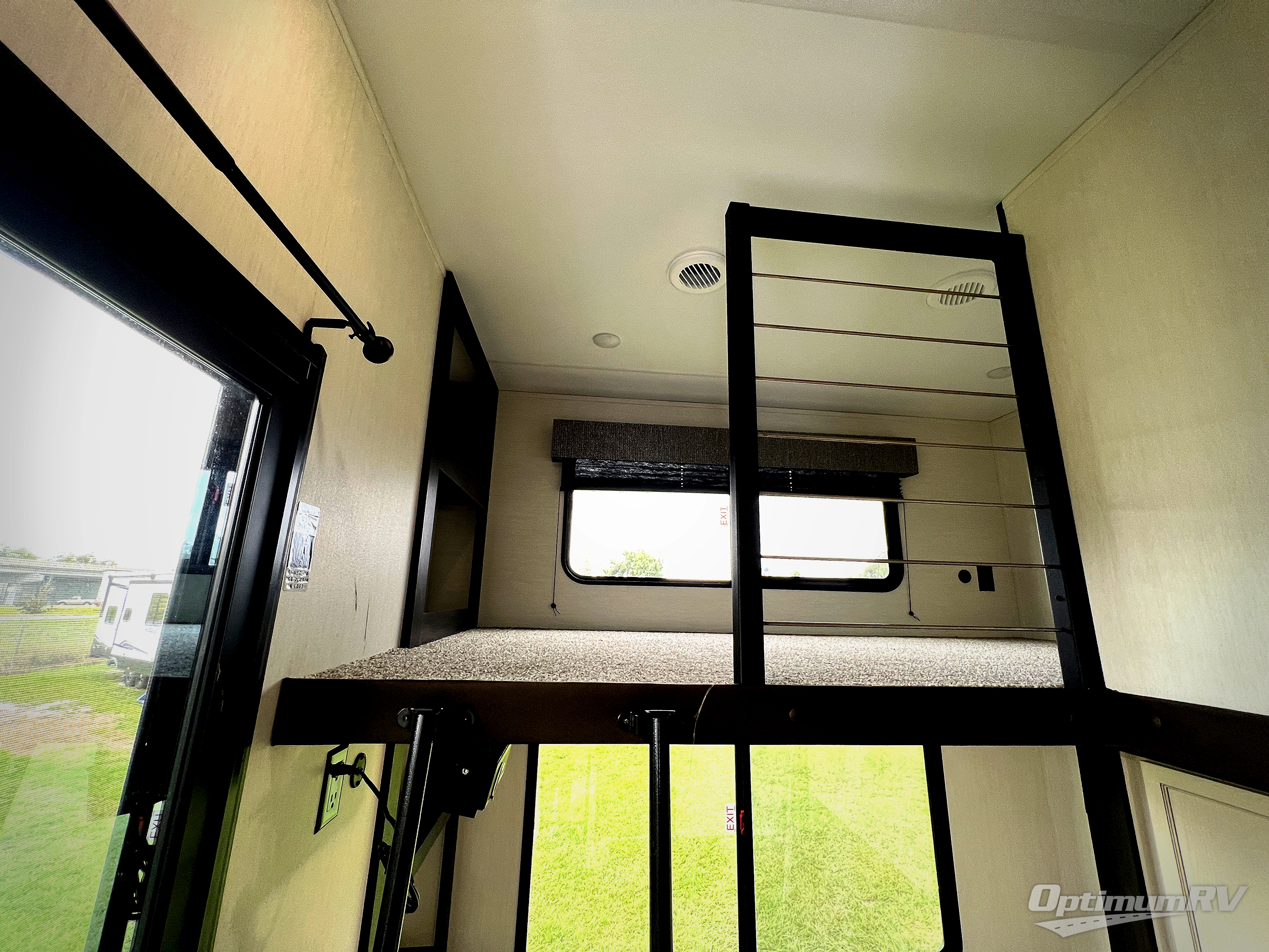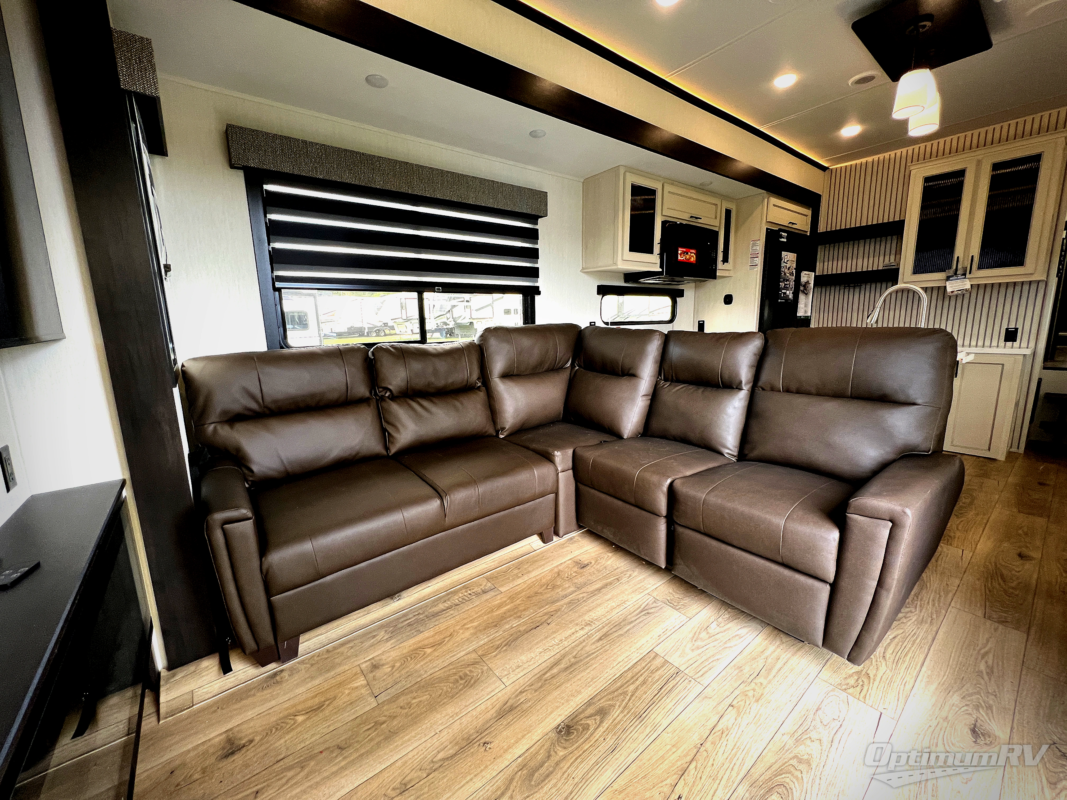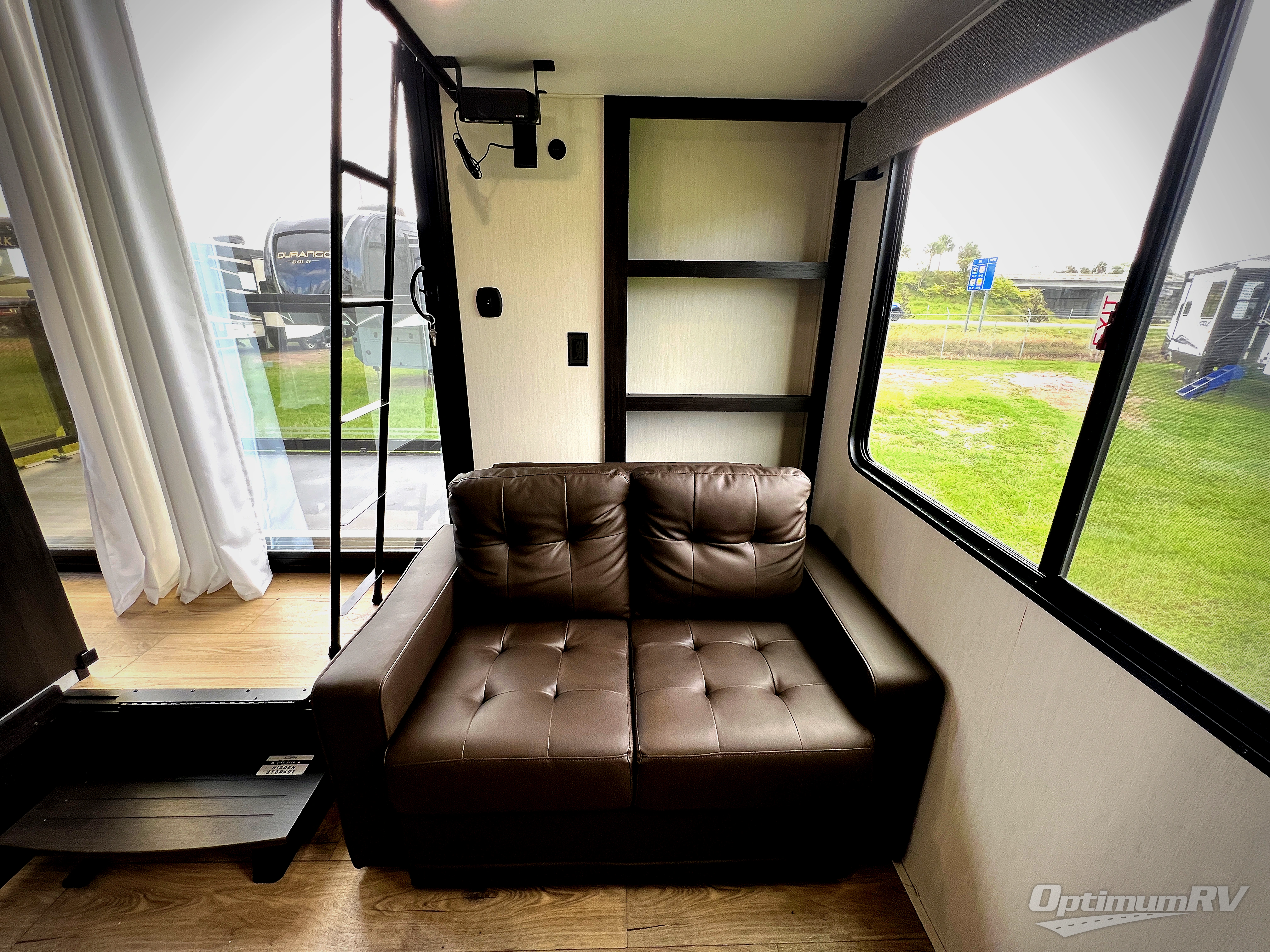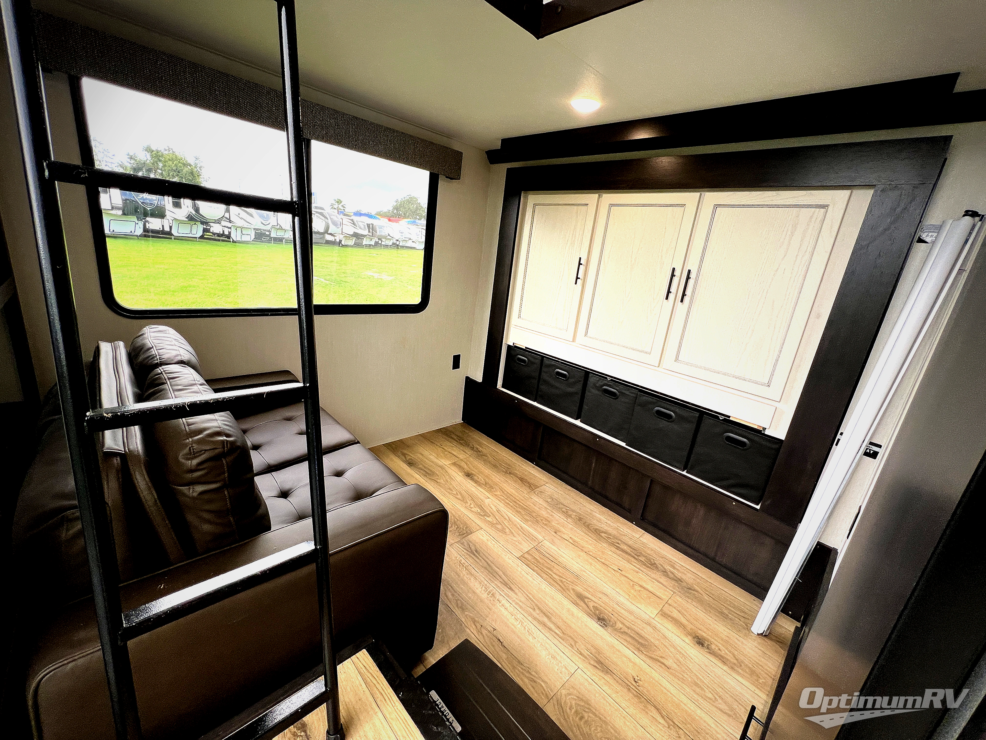 This is the perfect fifth wheel if you enjoy camping with friends and family! You'll have the front private bedroom with a camper king bed slide all to yourselves, while your guests take the rear den. There is a tri-fold sofa here, along with a wardrobe with a desk, additional shelves plus a loft above this room for even more sleeping or storage space! The main living room features an L-shaped sectional sofa, a fireplace and an entertainment center. And the patio deck with a 12' awning is right off of this room so you can visit with friends indoors or outdoors! There is generous counter space in the full kitchen, along with a pull-out storage drawer and a versatile dinette/desk. There are many more stand-out features found in this fifth wheel, including washer and dryer prep in the front bedroom, a 70" projector screen in the rear den, a second power awning, and the list goes on!