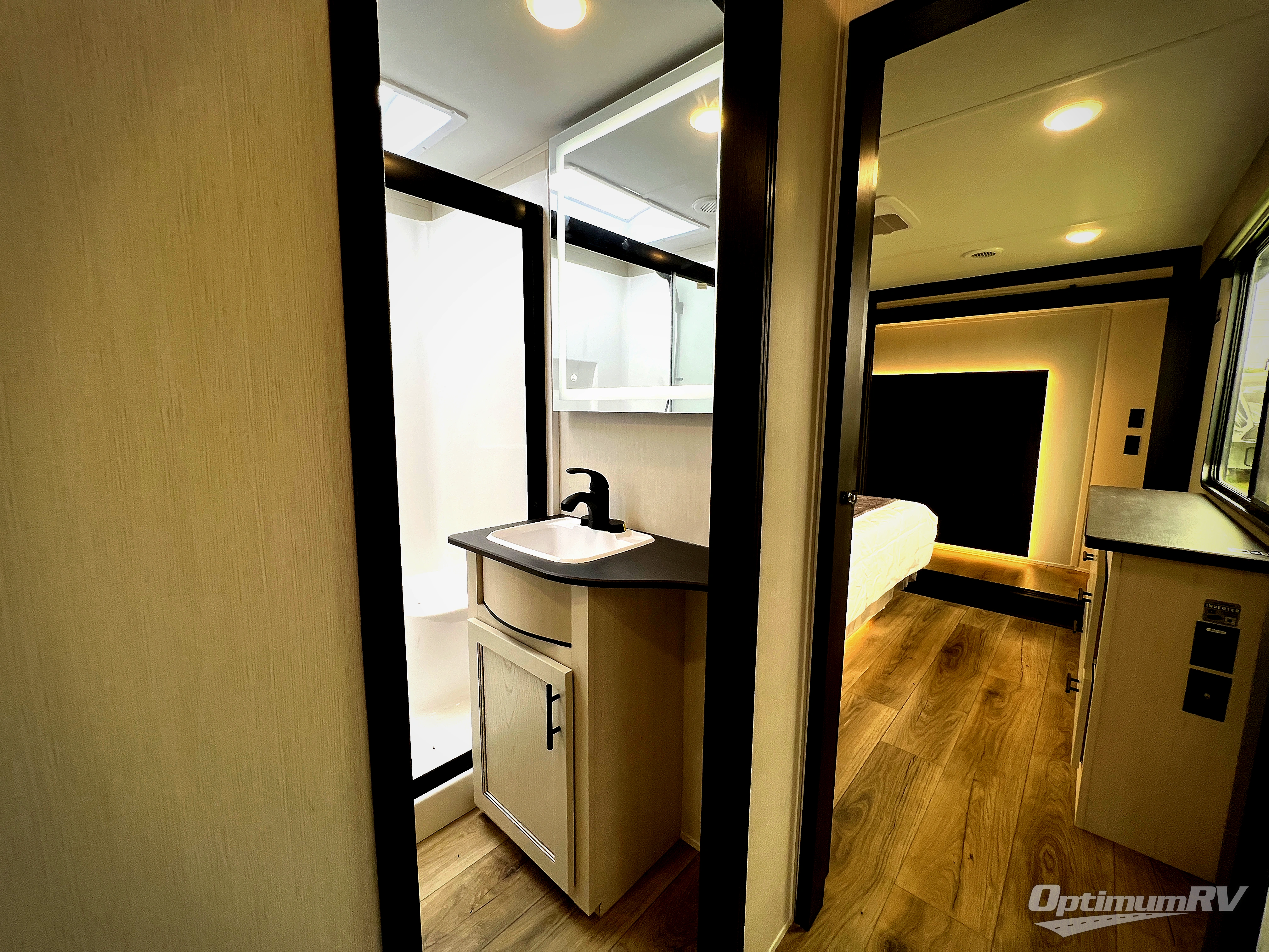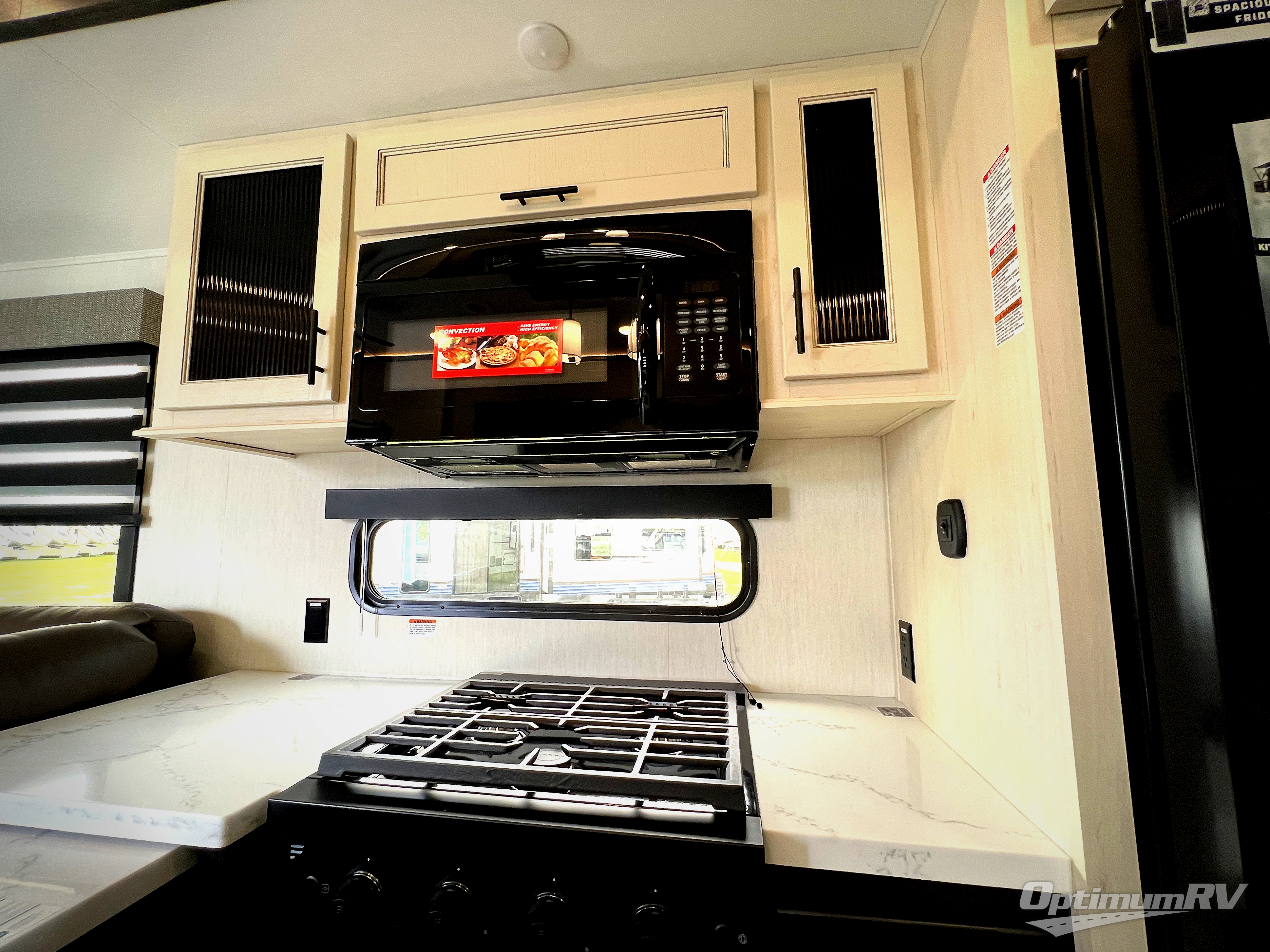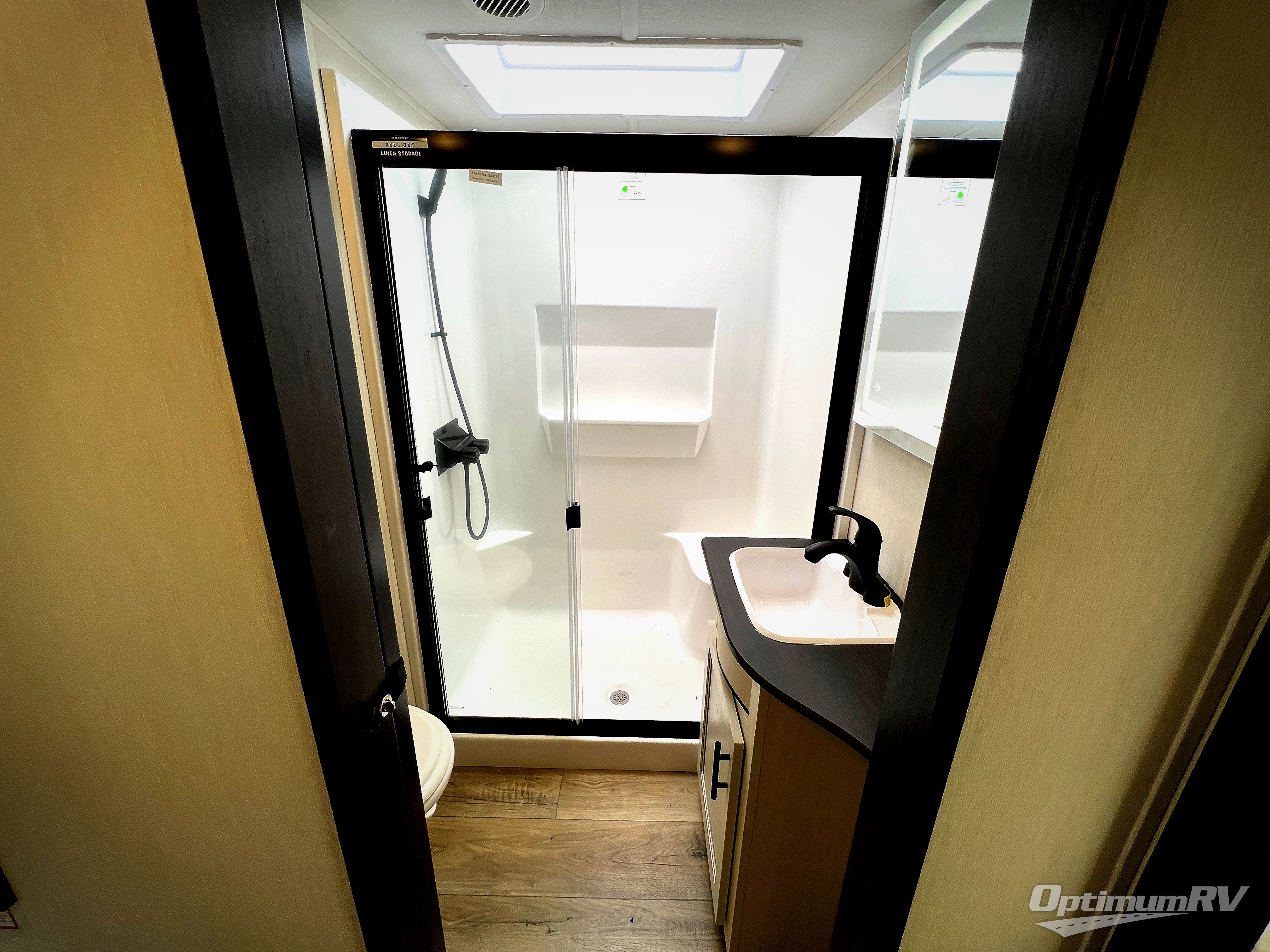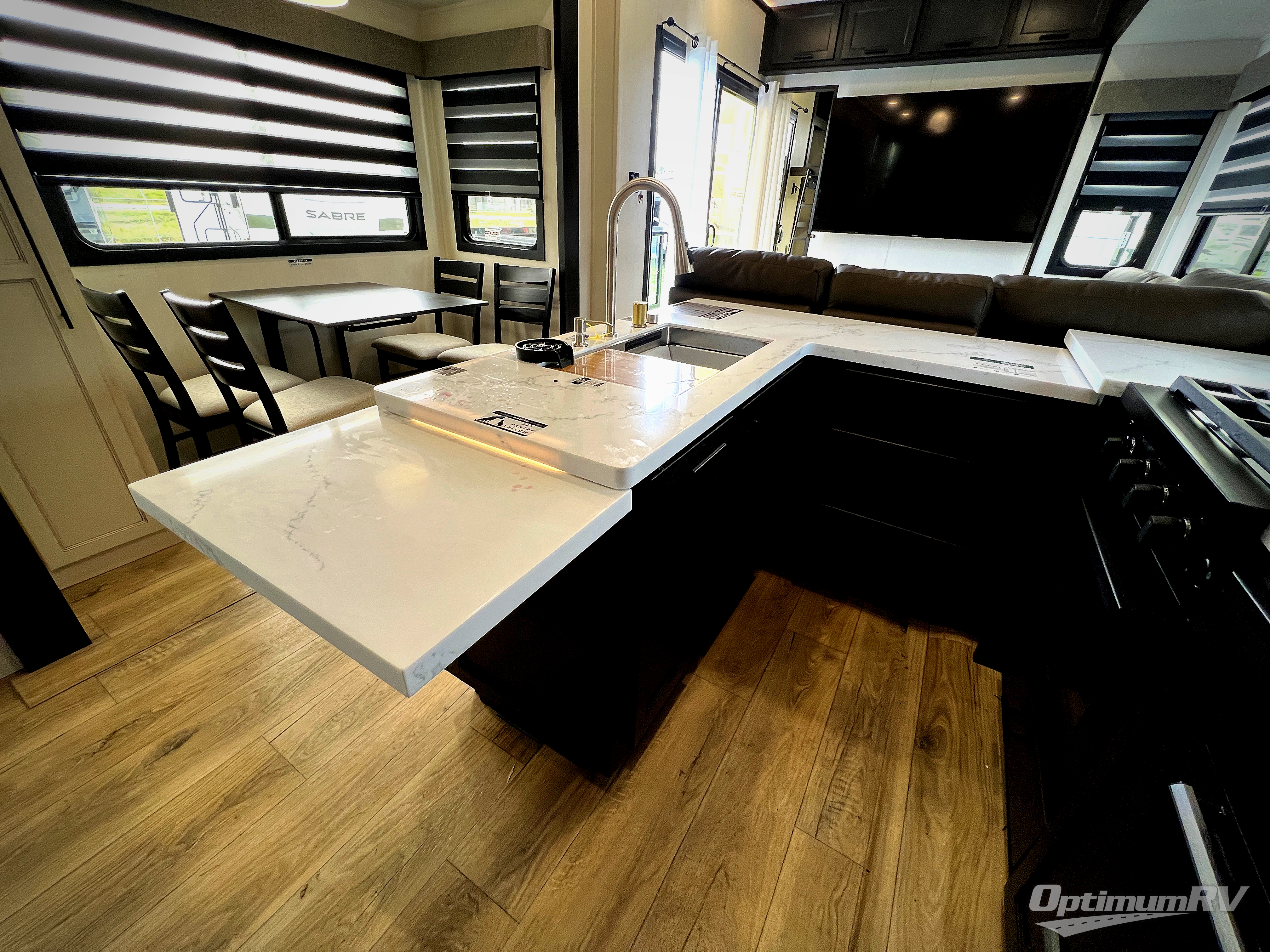 You will experience luxurious camping trips at an affordable price with any one of these Forest River Sabre fifth wheels! These models are durable and ready to travel anytime of the year thanks to features like the high-gloss gel-coat front cap with LED lighting, the PVC roof membrane, and the forced air underbelly with enclosed gate valves. The electric auto-leveling system makes setting up easy and safe, and the adjustable power awning with LED lighting will create an inviting outdoor living space. Each model includes a universal docking station which includes a black tank flush and an outside shower, and adjustable stable steps for you to enter and exit the unit safely. Inside, you will love the design of the ambient accent lighting in the living area, the real wood lumbercore cabinetry, and the linoleum flooring!