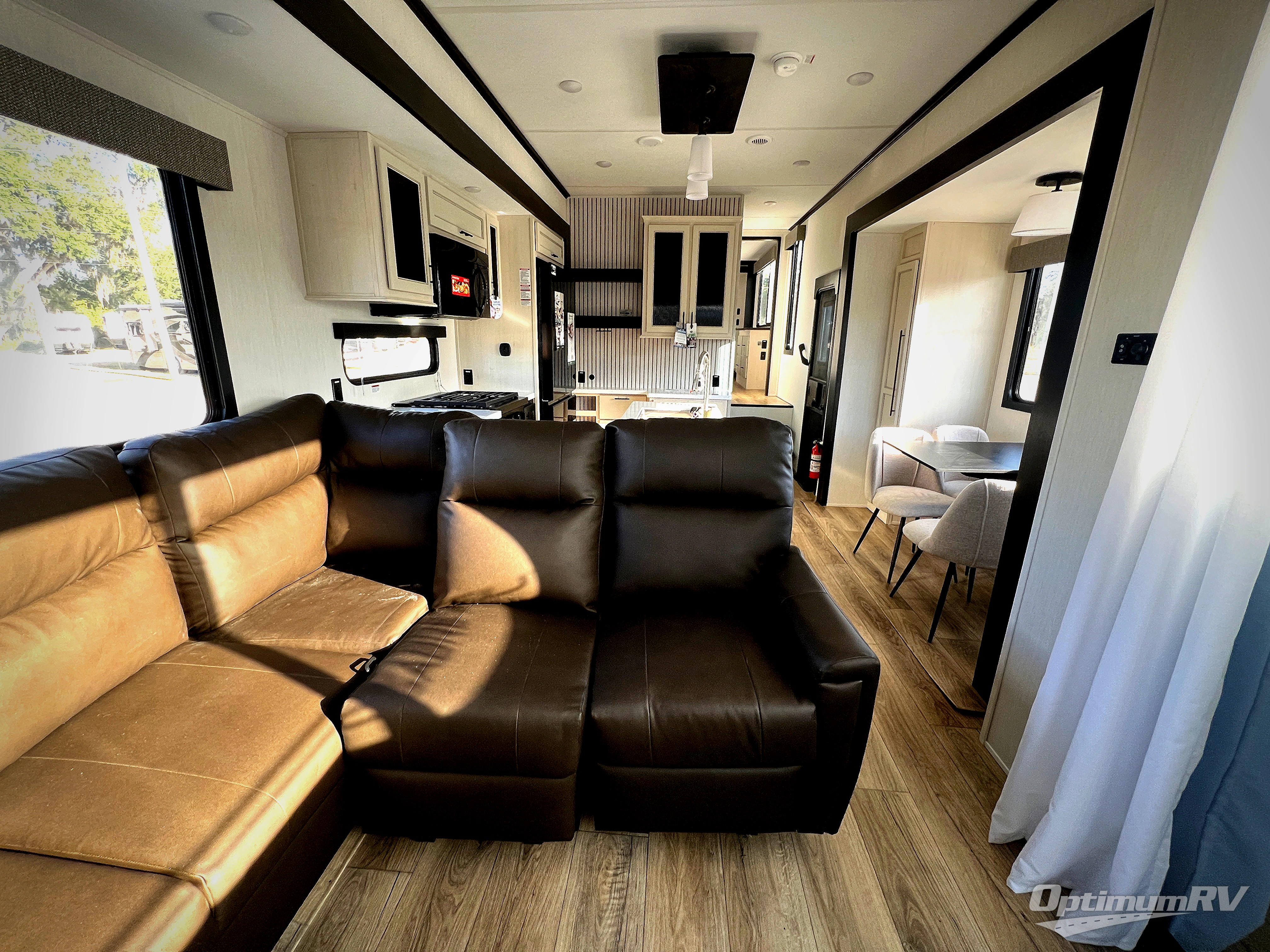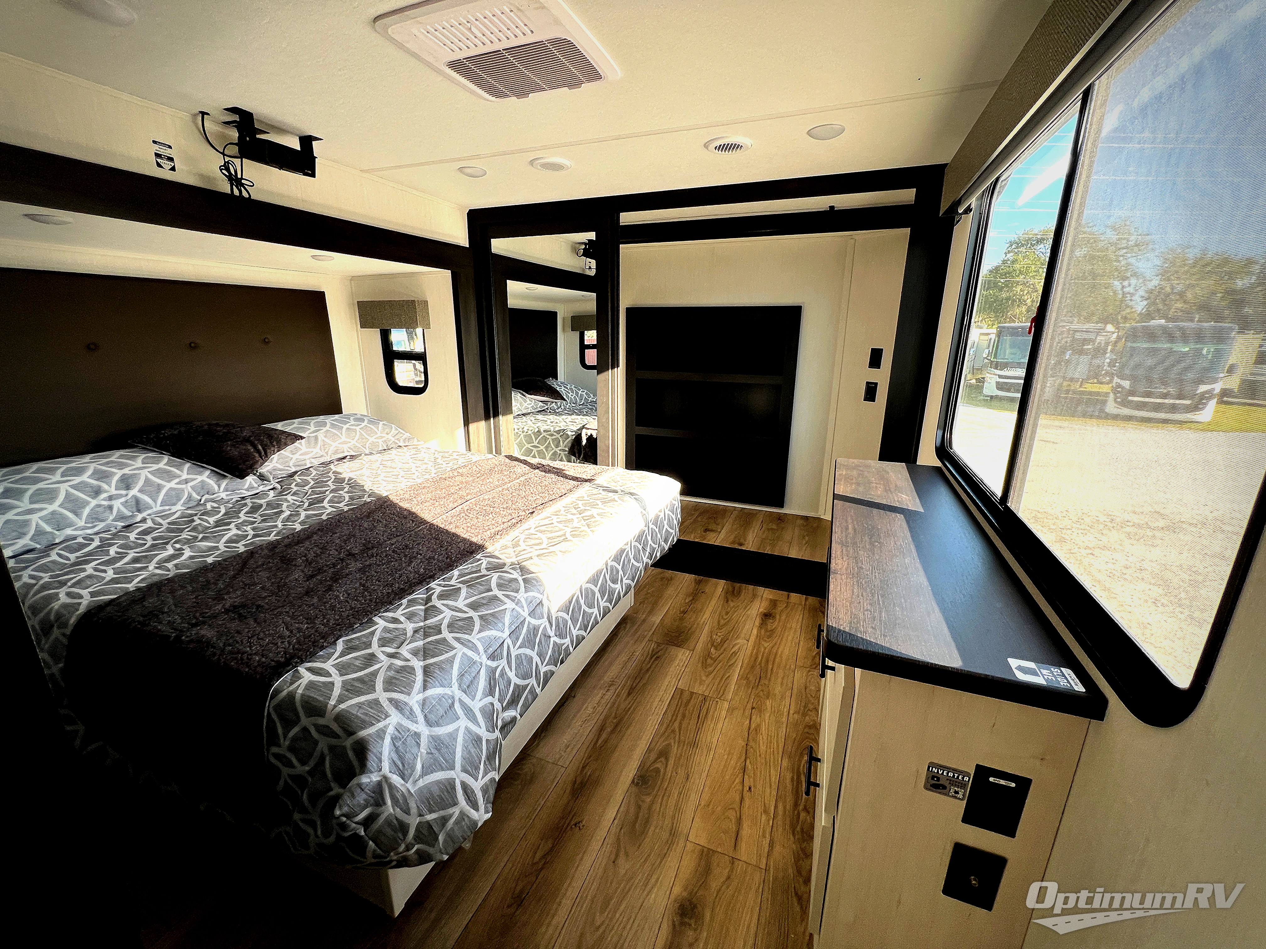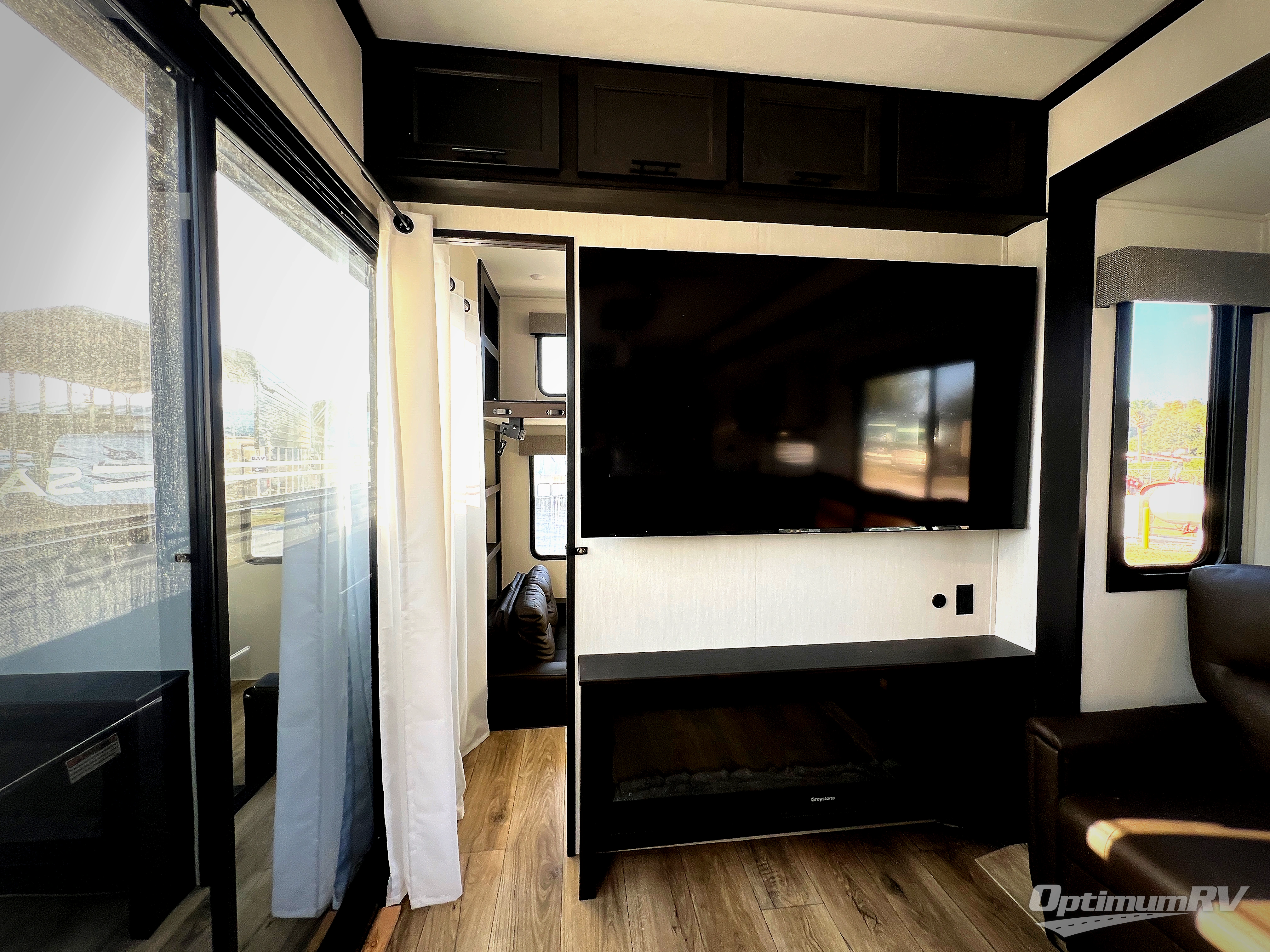 This is the perfect fifth wheel if you enjoy camping with friends and family! You'll have the front private bedroom with a camper king bed slide all to yourselves, while your guests take the rear den. There is a tri-fold sofa here, along with a wardrobe with a desk, additional shelves plus a loft above this room for even more sleeping or storage space! The main living room features an L-shaped sectional sofa, a fireplace and an entertainment center. And the patio deck with a 12' awning is right off of this room so you can visit with friends indoors or outdoors! There is generous counter space in the full kitchen, along with a pull-out storage drawer and a versatile dinette/desk. There are many more stand-out features found in this fifth wheel, including washer and dryer prep in the front bedroom, a 70" projector screen in the rear den, a second power awning, and the list goes on!