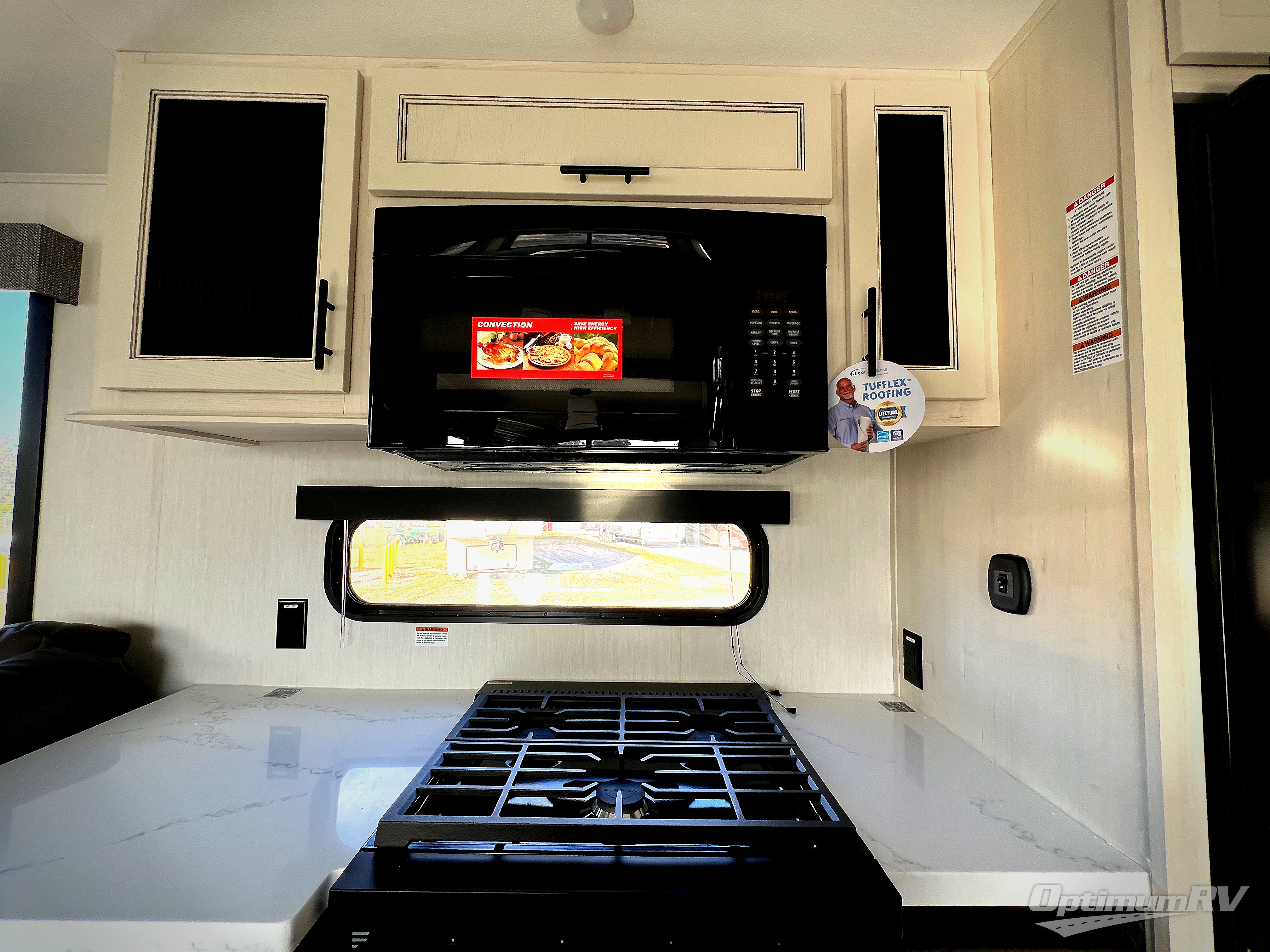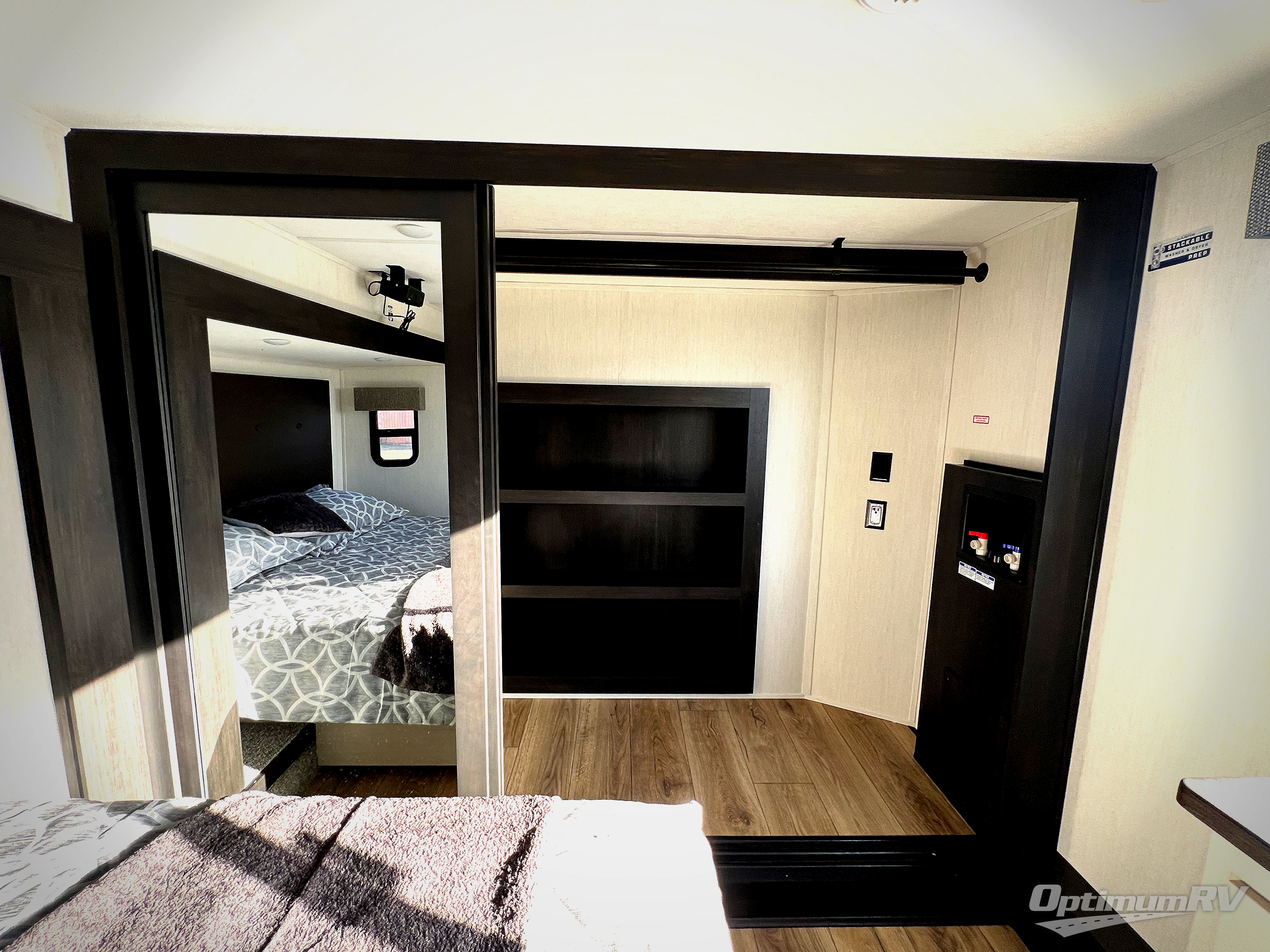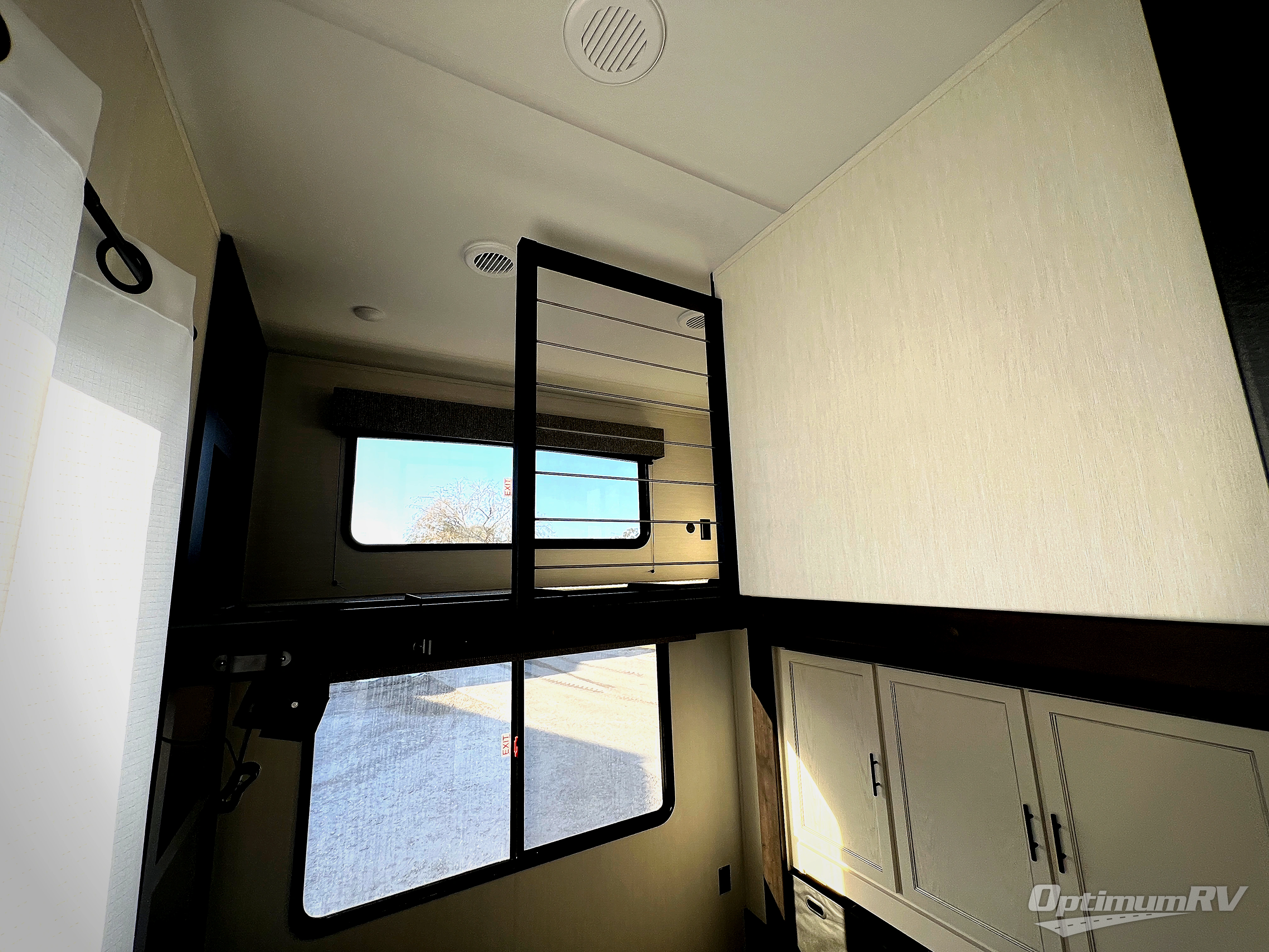 This is the perfect fifth wheel if you enjoy camping with friends and family! You'll have the front private bedroom with a camper king bed slide all to yourselves, while your guests take the rear den. There is a tri-fold sofa here, along with a wardrobe with a desk, additional shelves plus a loft above this room for even more sleeping or storage space! The main living room features an L-shaped sectional sofa, a fireplace and an entertainment center. And the patio deck with a 12' awning is right off of this room so you can visit with friends indoors or outdoors! There is generous counter space in the full kitchen, along with a pull-out storage drawer and a versatile dinette/desk. There are many more stand-out features found in this fifth wheel, including washer and dryer prep in the front bedroom, a 70" projector screen in the rear den, a second power awning, and the list goes on!