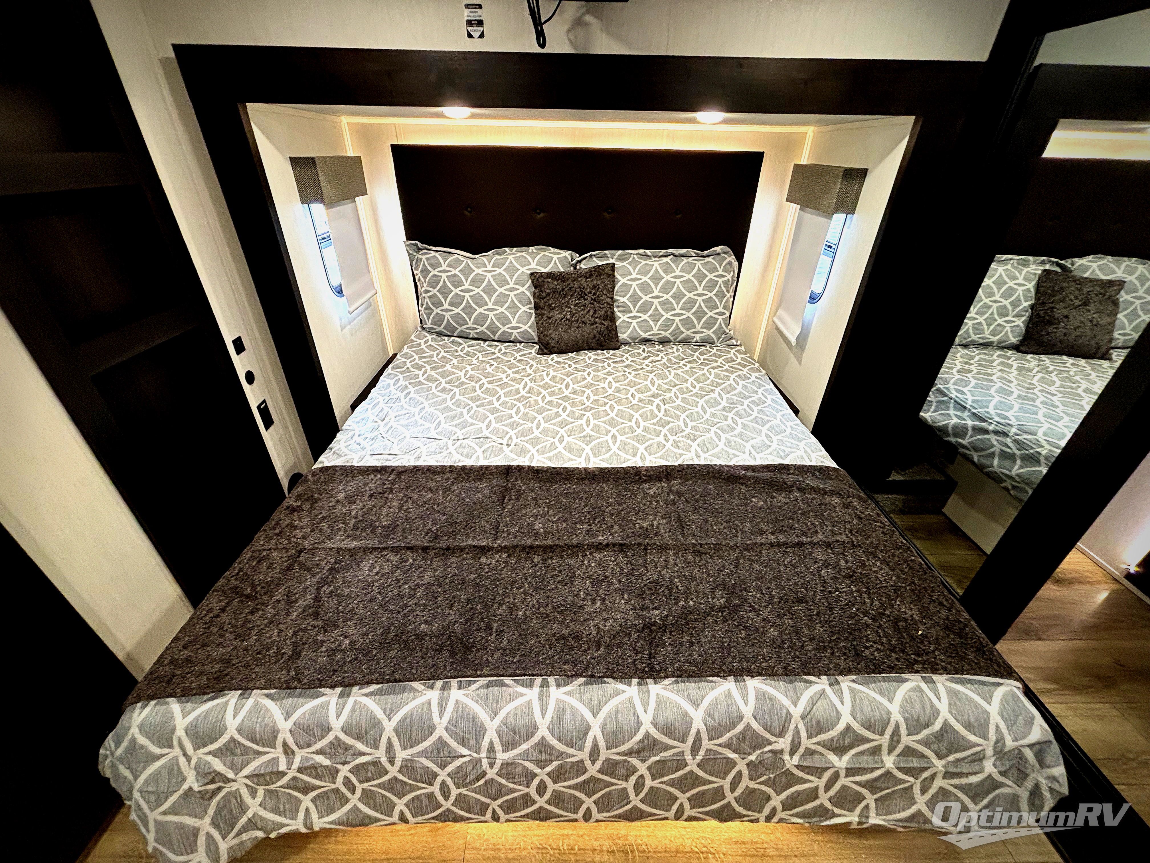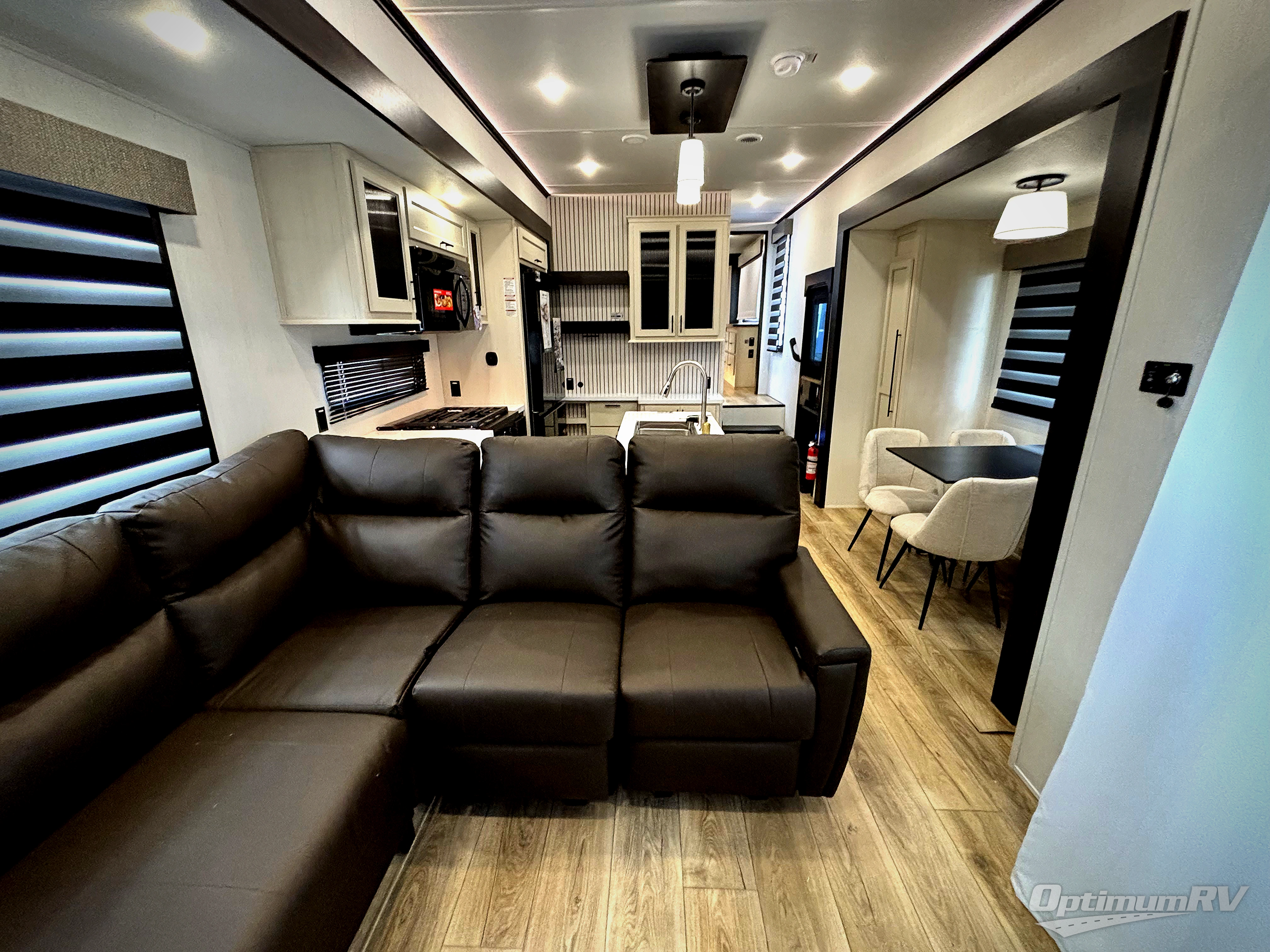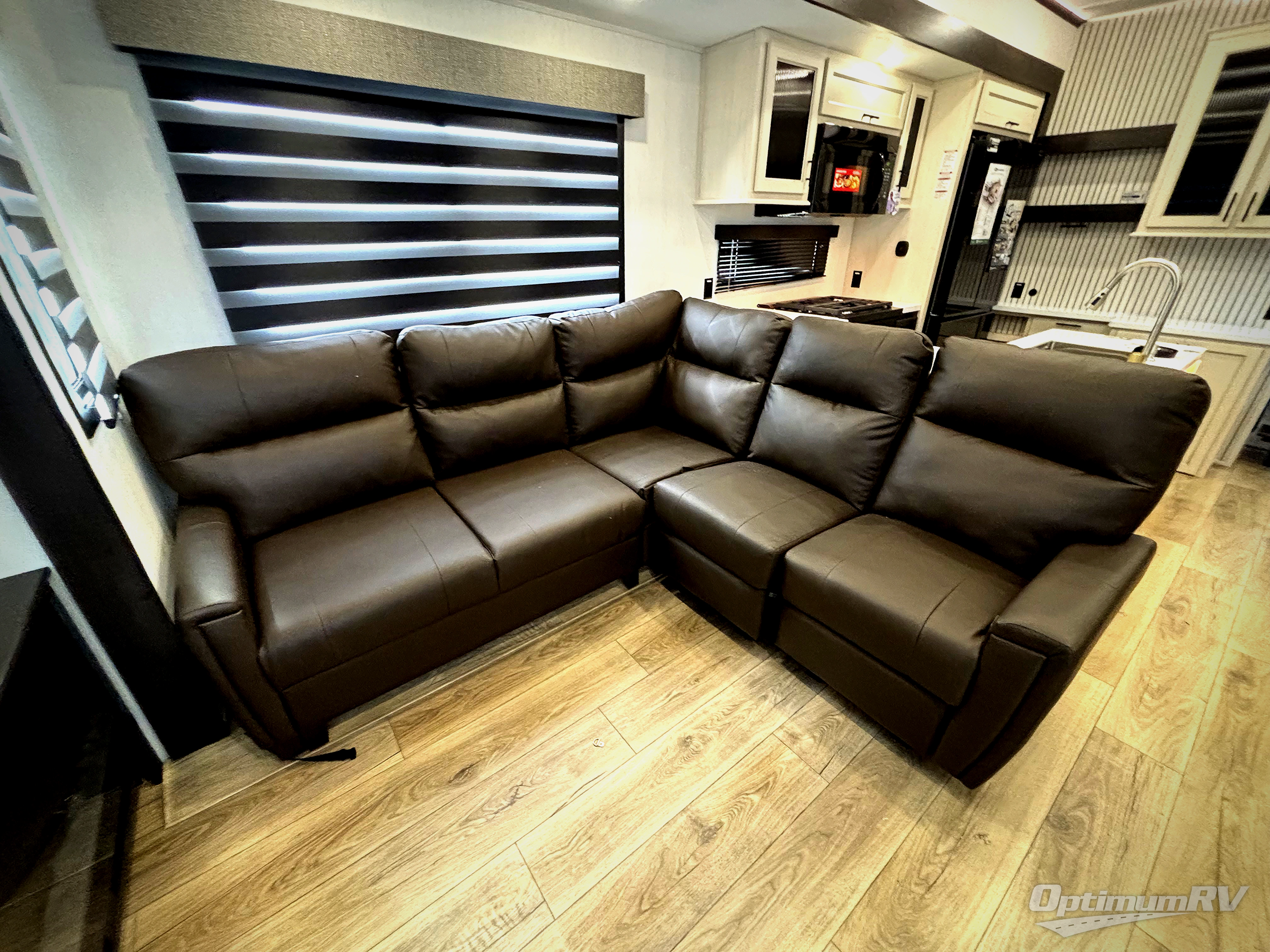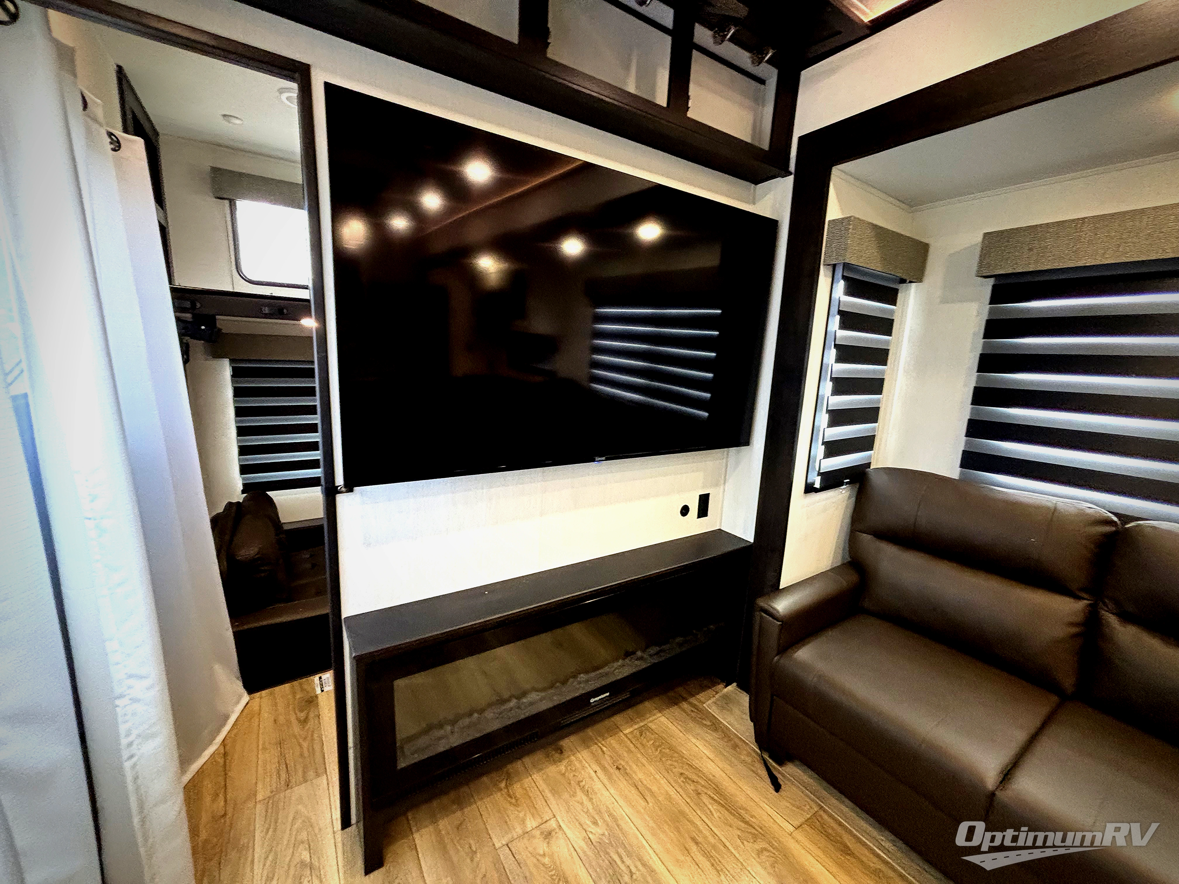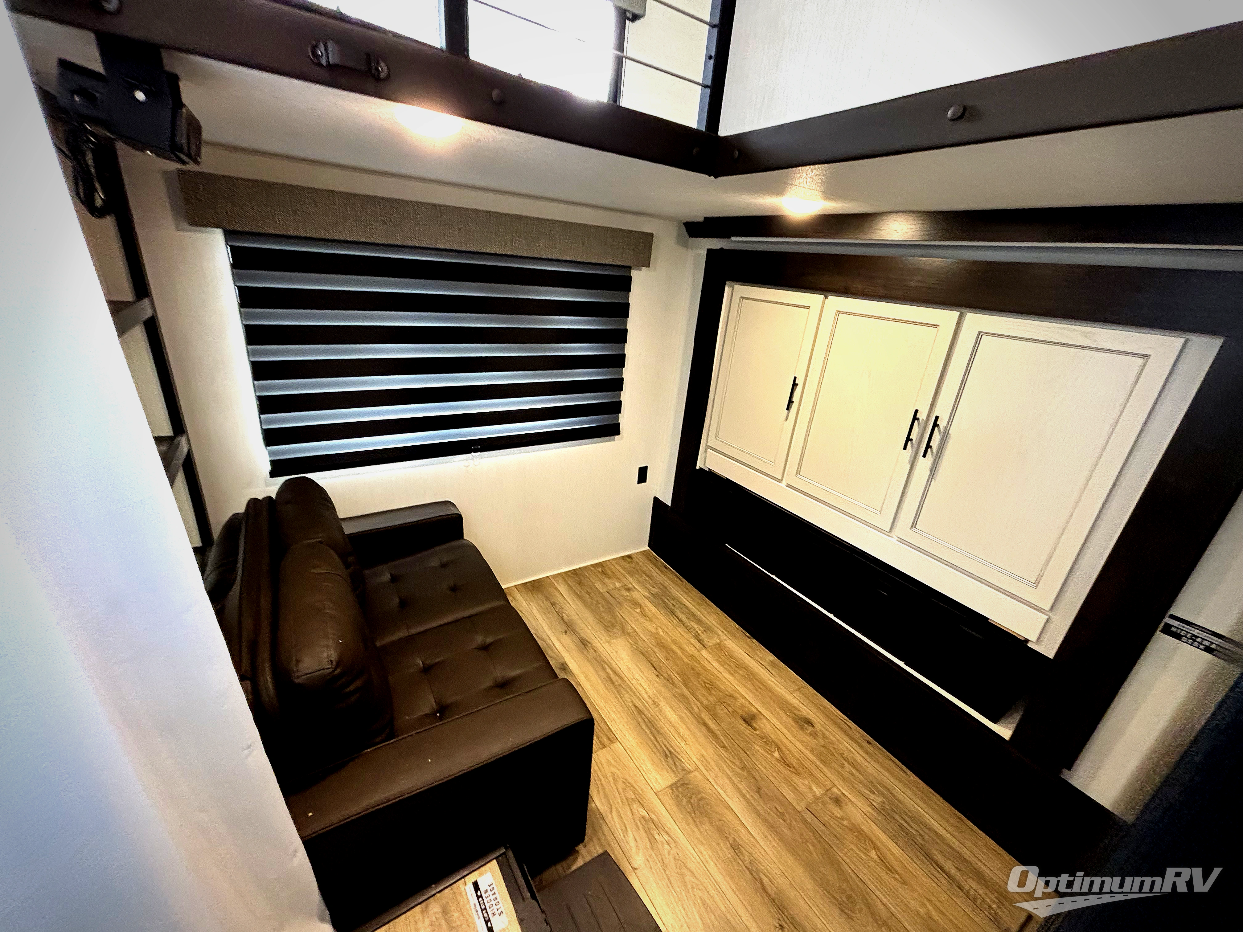 This is the perfect fifth wheel if you enjoy camping with friends and family! You'll have the front private bedroom with a camper king bed slide all to yourselves, while your guests take the rear den. There is a tri-fold sofa here, along with a wardrobe with a desk, additional shelves plus a loft above this room for even more sleeping or storage space! The main living room features an L-shaped sectional sofa, a fireplace and an entertainment center. And the patio deck with a 12' awning is right off of this room so you can visit with friends indoors or outdoors! There is generous counter space in the full kitchen, along with a pull-out storage drawer and a versatile dinette/desk. There are many more stand-out features found in this fifth wheel, including washer and dryer prep in the front bedroom, a 70" projector screen in the rear den, a second power awning, and the list goes on!