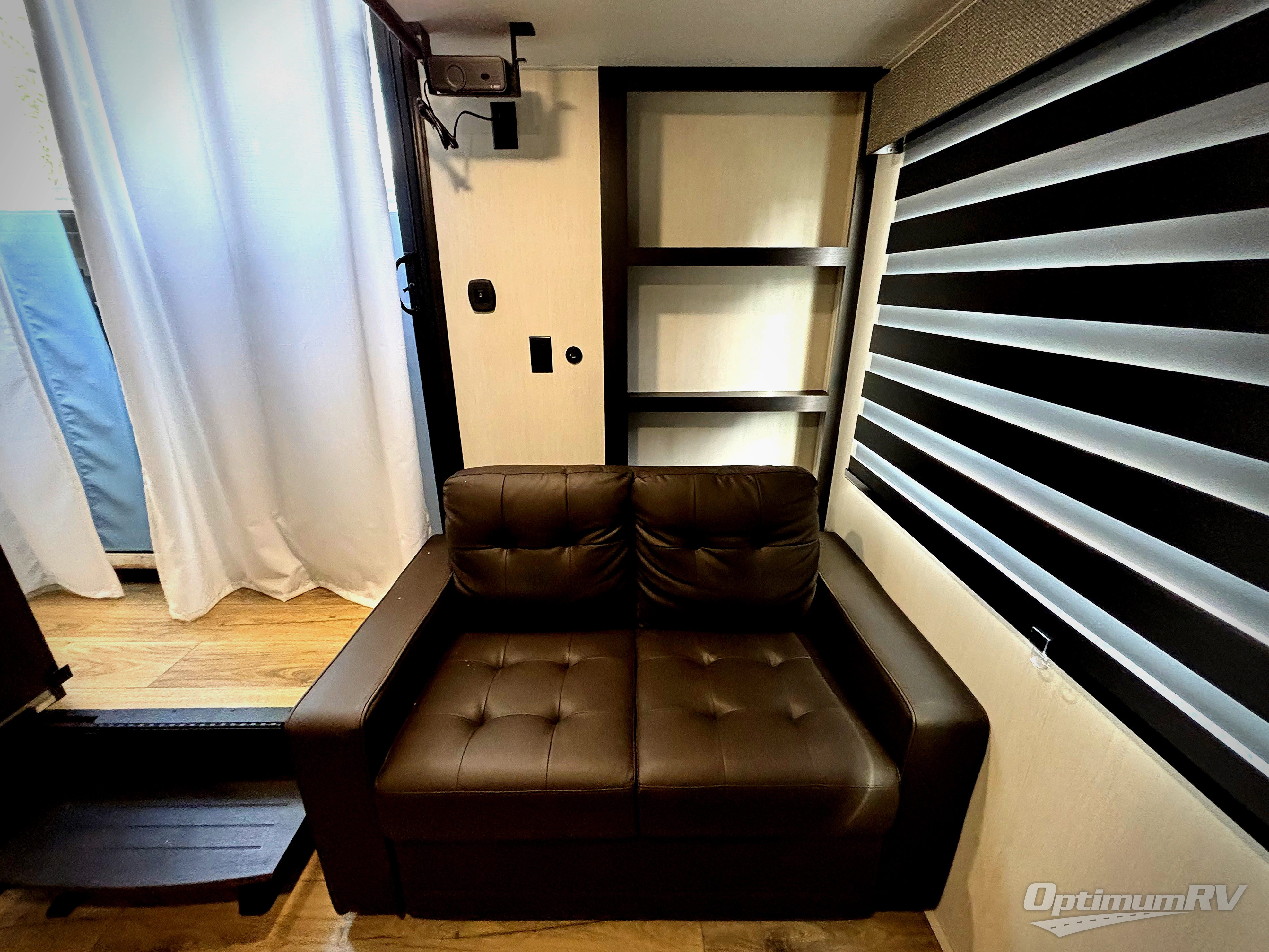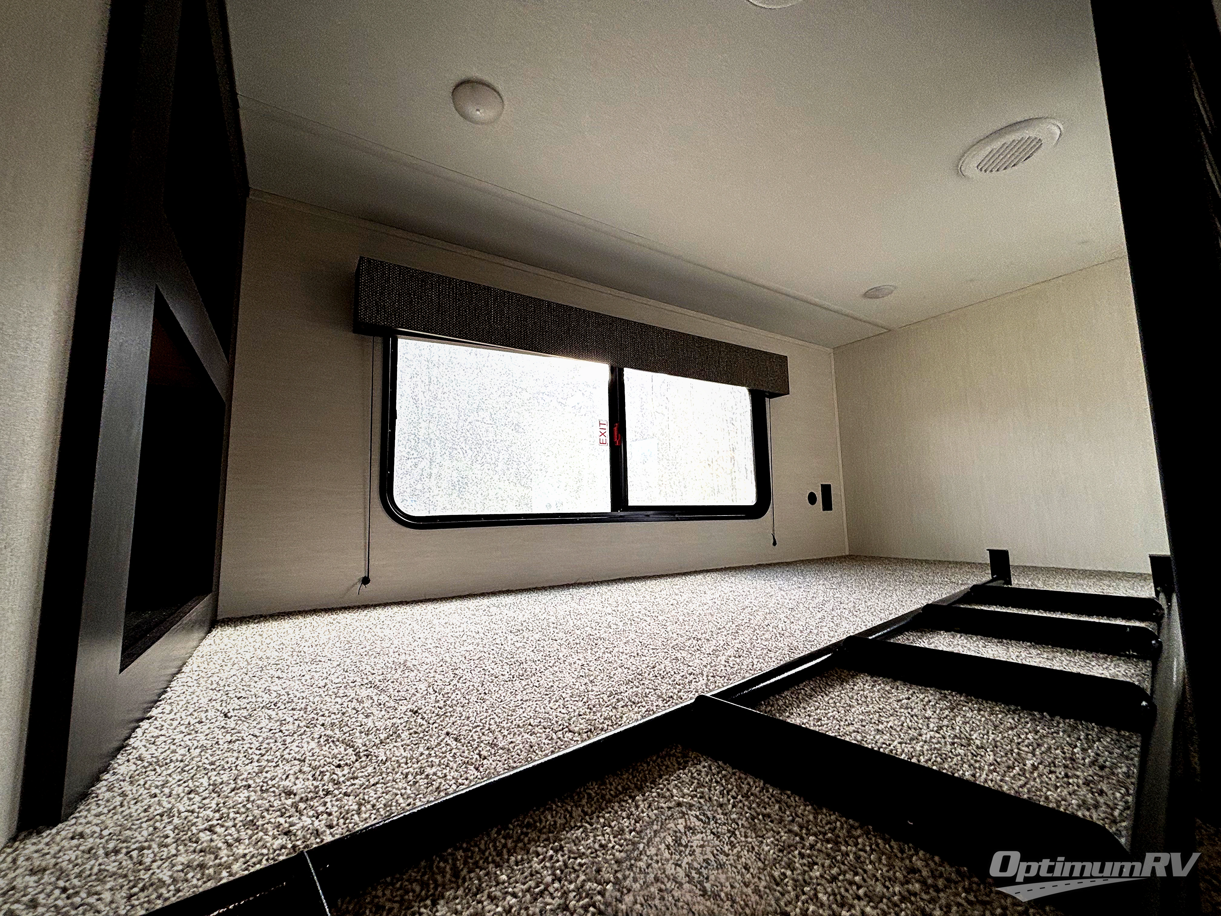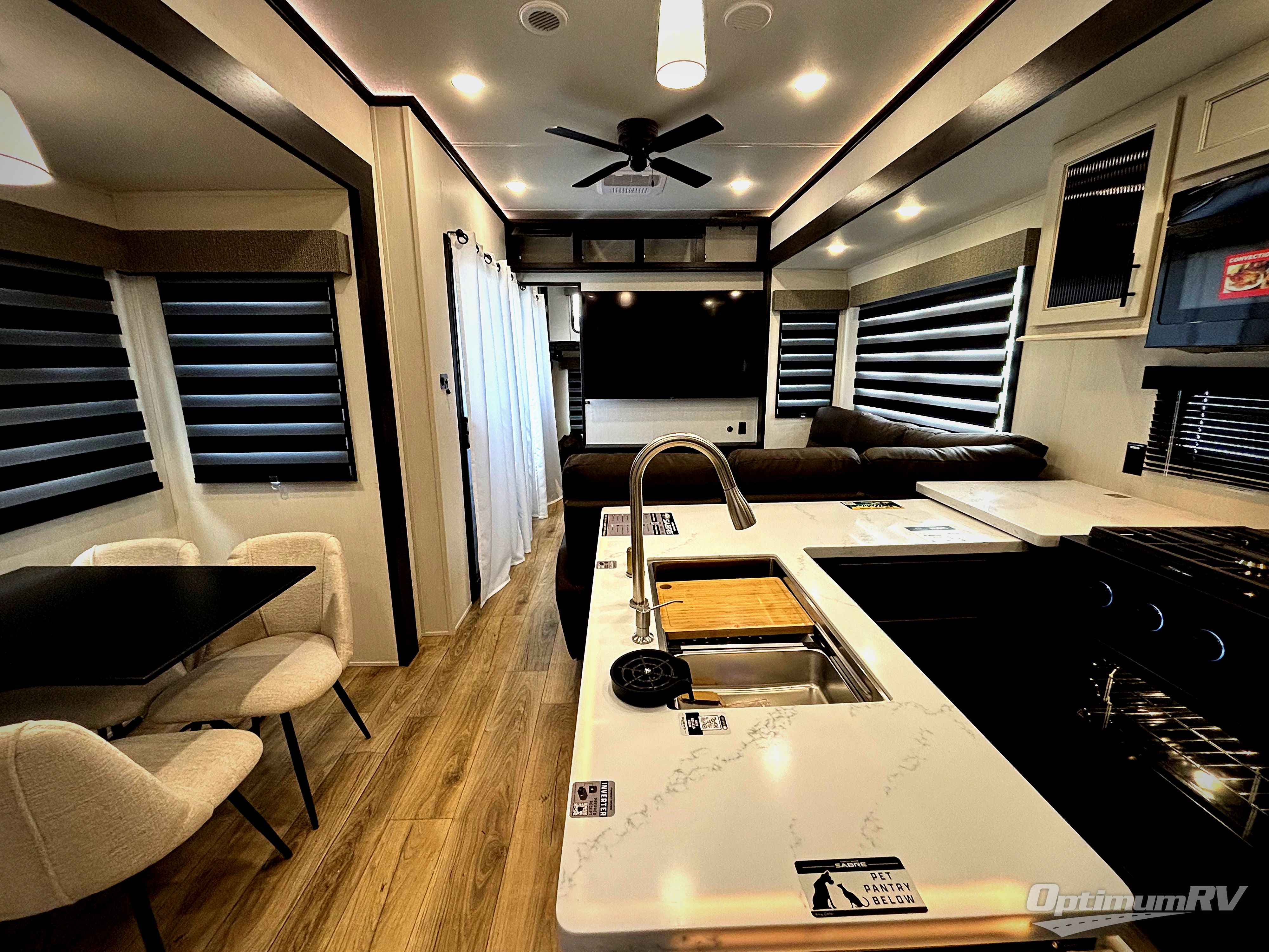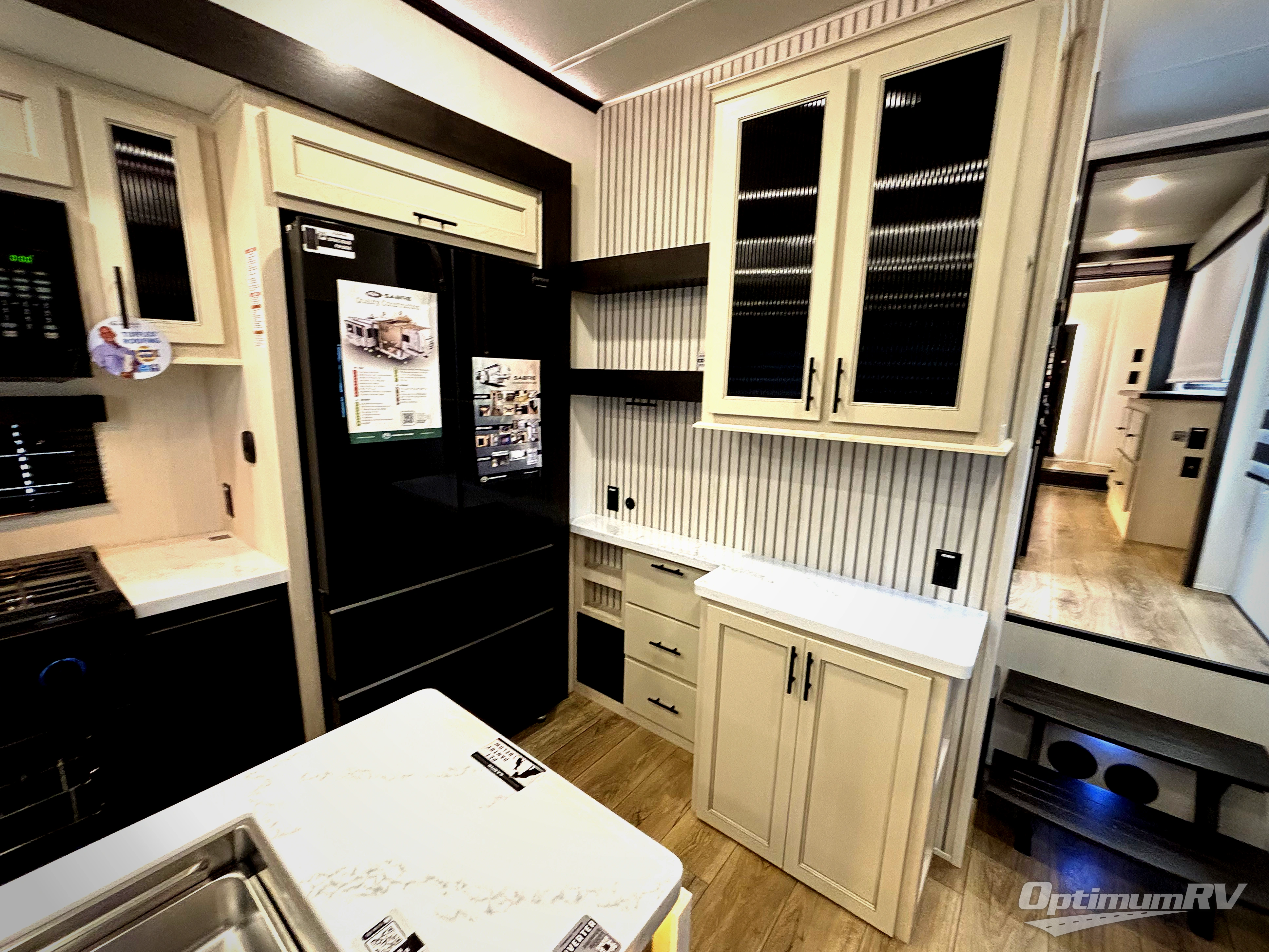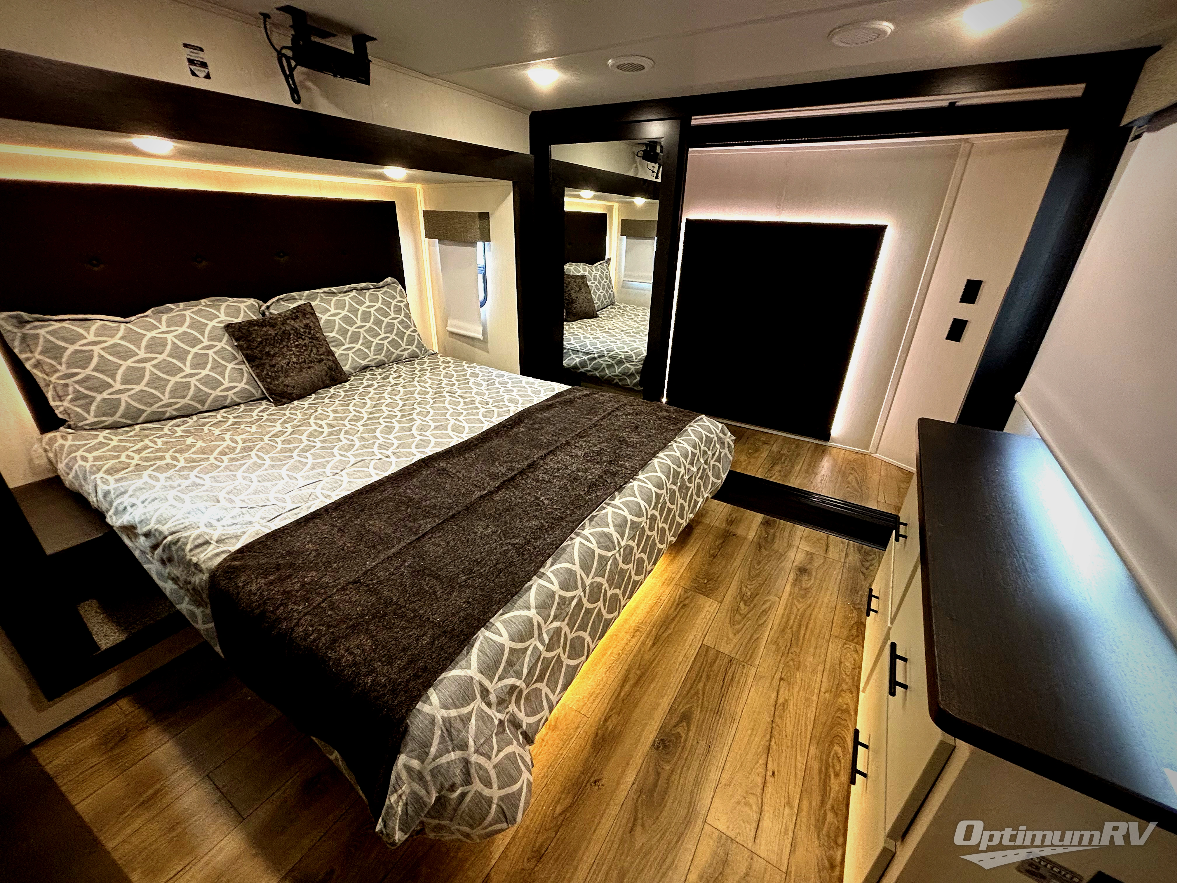 This is the perfect fifth wheel if you enjoy camping with friends and family! You'll have the front private bedroom with a camper king bed slide all to yourselves, while your guests take the rear den. There is a tri-fold sofa here, along with a wardrobe with a desk, additional shelves plus a loft above this room for even more sleeping or storage space! The main living room features an L-shaped sectional sofa, a fireplace and an entertainment center. And the patio deck with a 12' awning is right off of this room so you can visit with friends indoors or outdoors! There is generous counter space in the full kitchen, along with a pull-out storage drawer and a versatile dinette/desk. There are many more stand-out features found in this fifth wheel, including washer and dryer prep in the front bedroom, a 70" projector screen in the rear den, a second power awning, and the list goes on!