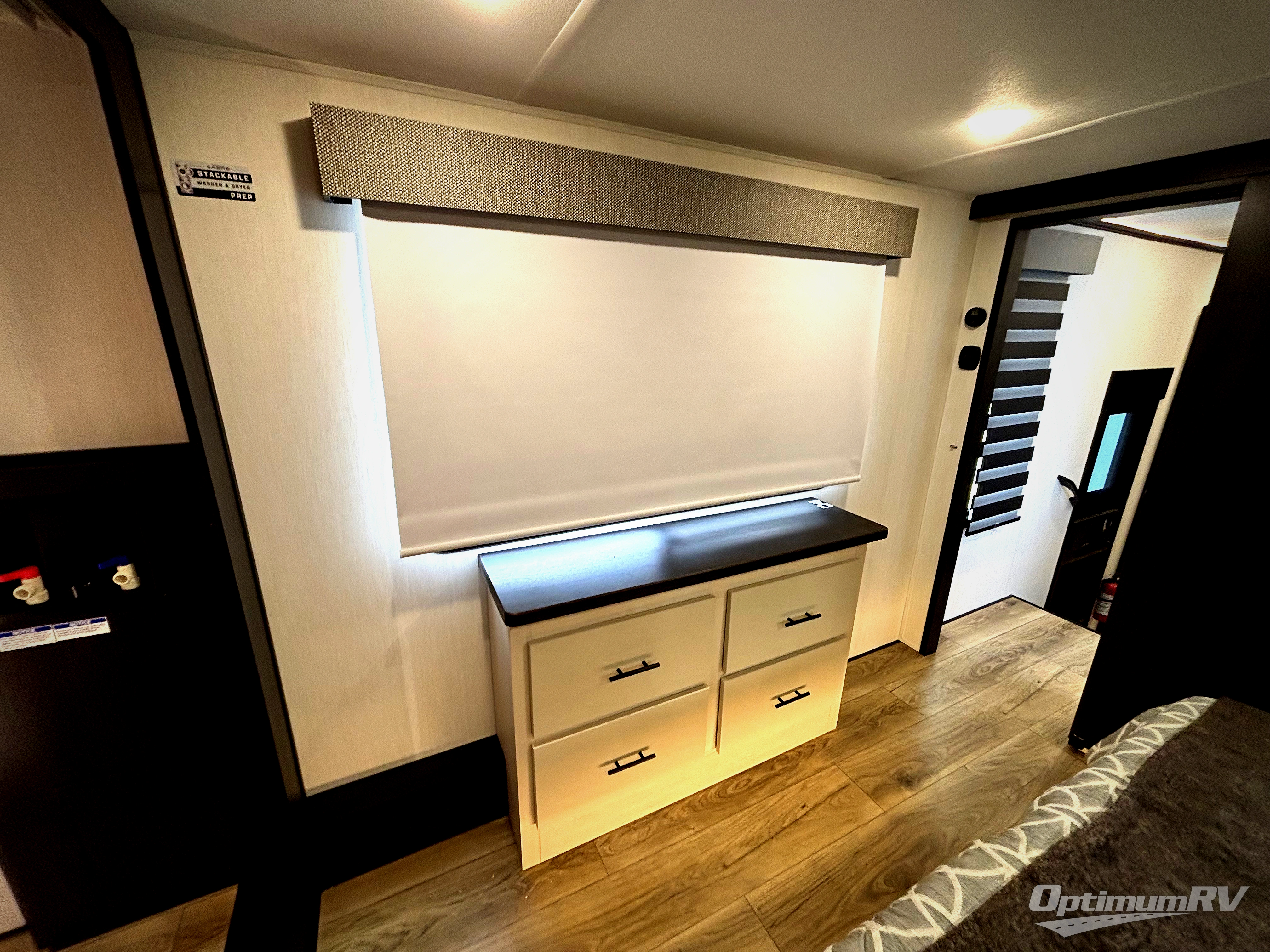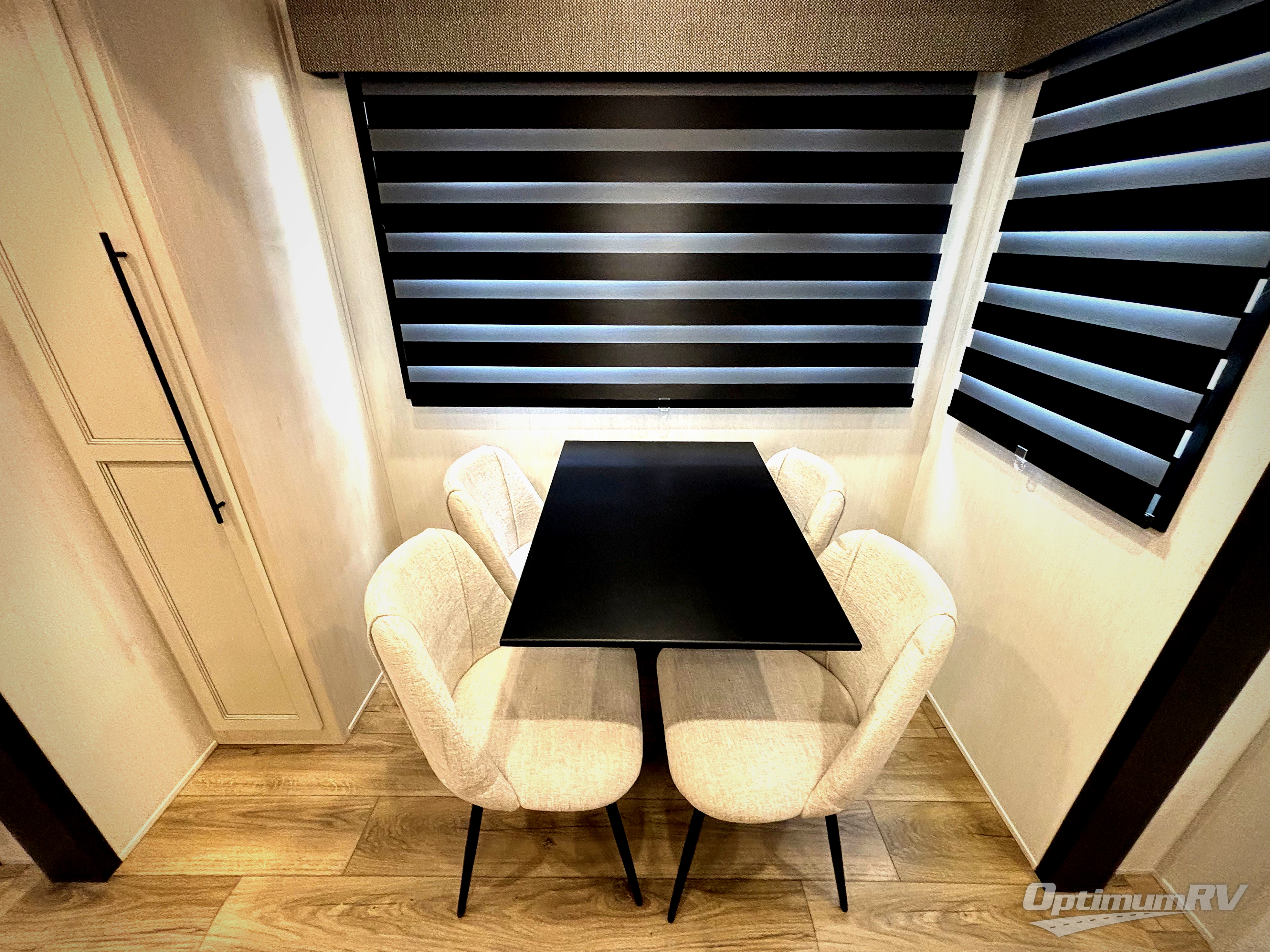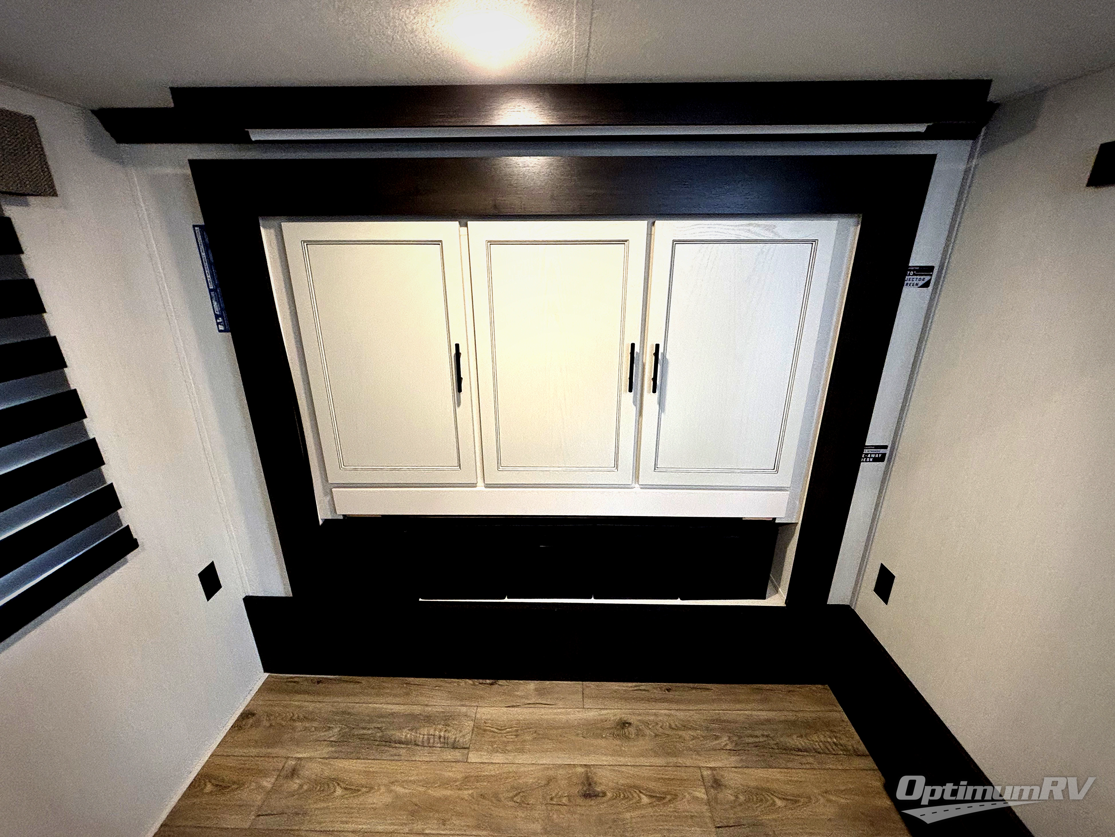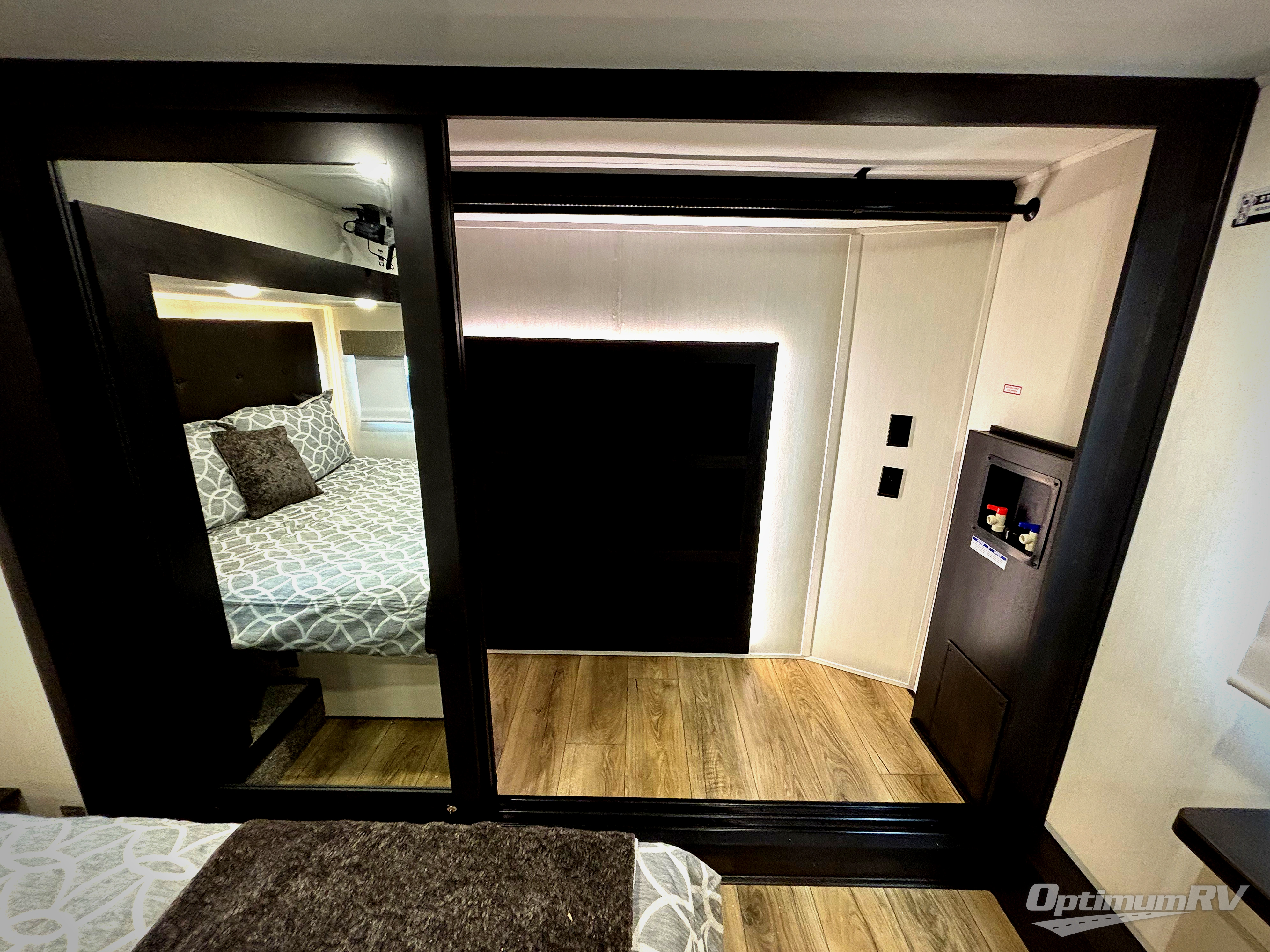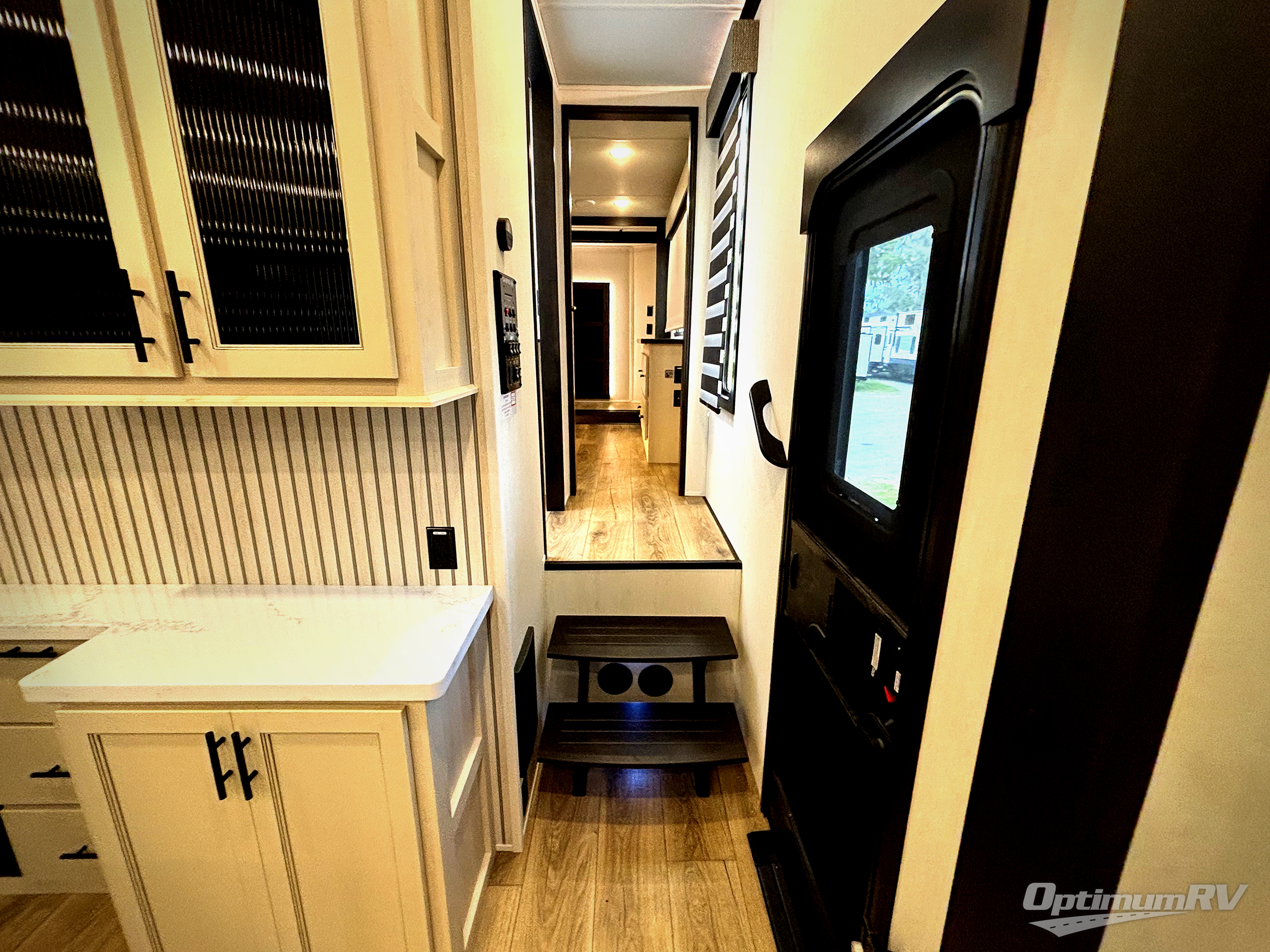 This is the perfect fifth wheel if you enjoy camping with friends and family! You'll have the front private bedroom with a camper king bed slide all to yourselves, while your guests take the rear den. There is a tri-fold sofa here, along with a wardrobe with a desk, additional shelves plus a loft above this room for even more sleeping or storage space! The main living room features an L-shaped sectional sofa, a fireplace and an entertainment center. And the patio deck with a 12' awning is right off of this room so you can visit with friends indoors or outdoors! There is generous counter space in the full kitchen, along with a pull-out storage drawer and a versatile dinette/desk. There are many more stand-out features found in this fifth wheel, including washer and dryer prep in the front bedroom, a 70" projector screen in the rear den, a second power awning, and the list goes on!
