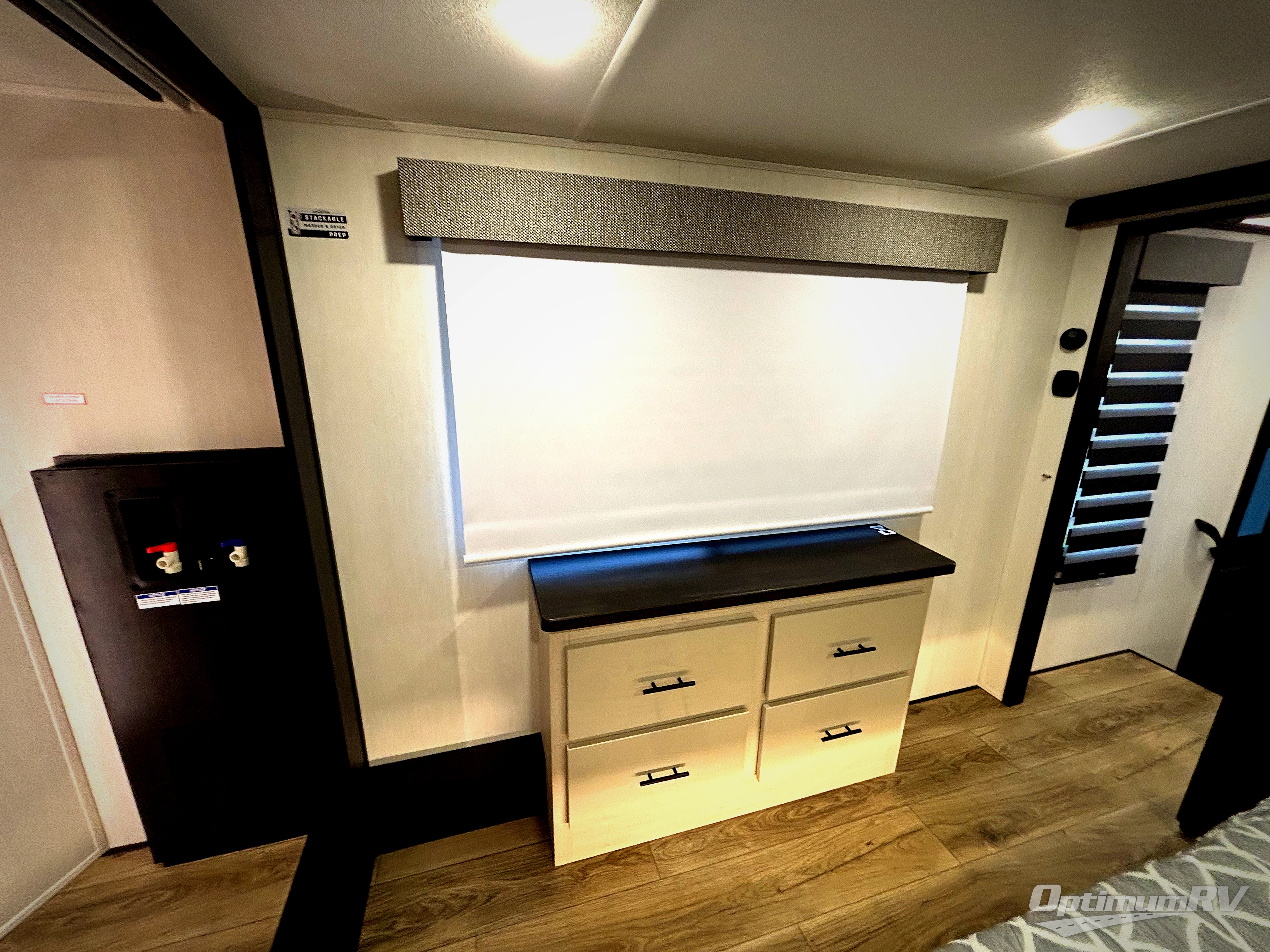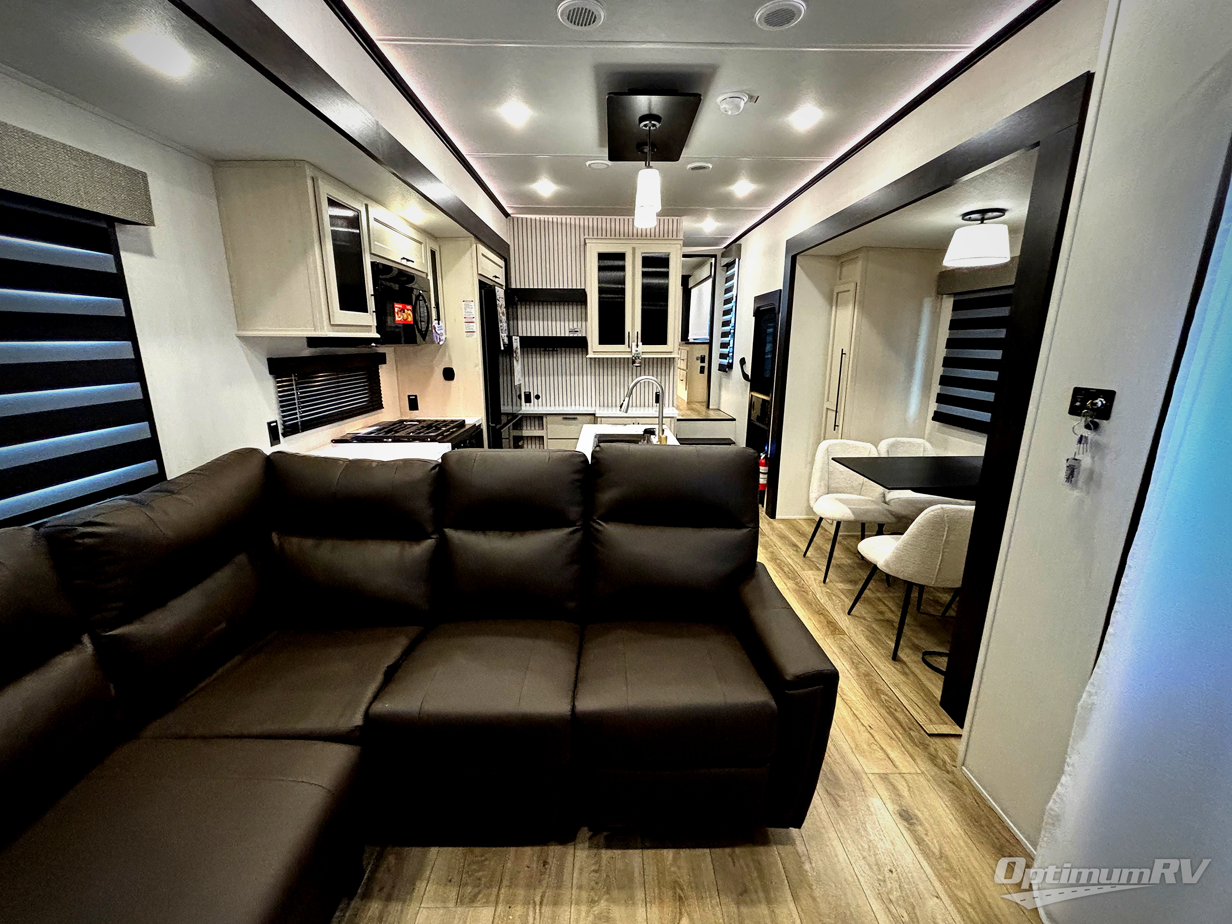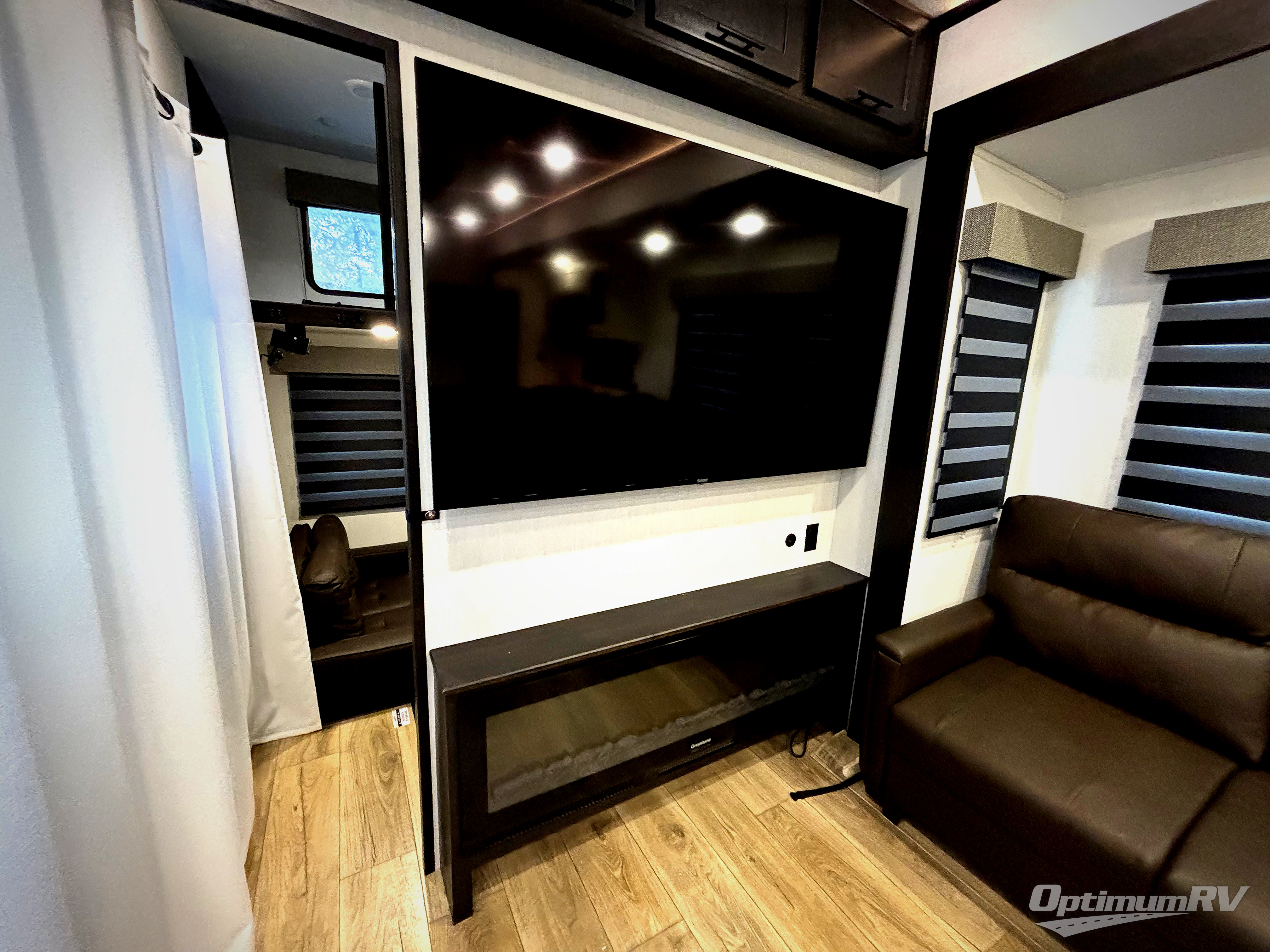 This is the perfect fifth wheel if you enjoy camping with friends and family! You'll have the front private bedroom with a camper king bed slide all to yourselves, while your guests take the rear den. There is a tri-fold sofa here, along with a wardrobe with a desk, additional shelves plus a loft above this room for even more sleeping or storage space! The main living room features an L-shaped sectional sofa, a fireplace and an entertainment center. And the patio deck with a 12' awning is right off of this room so you can visit with friends indoors or outdoors! There is generous counter space in the full kitchen, along with a pull-out storage drawer and a versatile dinette/desk. There are many more stand-out features found in this fifth wheel, including washer and dryer prep in the front bedroom, a 70" projector screen in the rear den, a second power awning, and the list goes on!