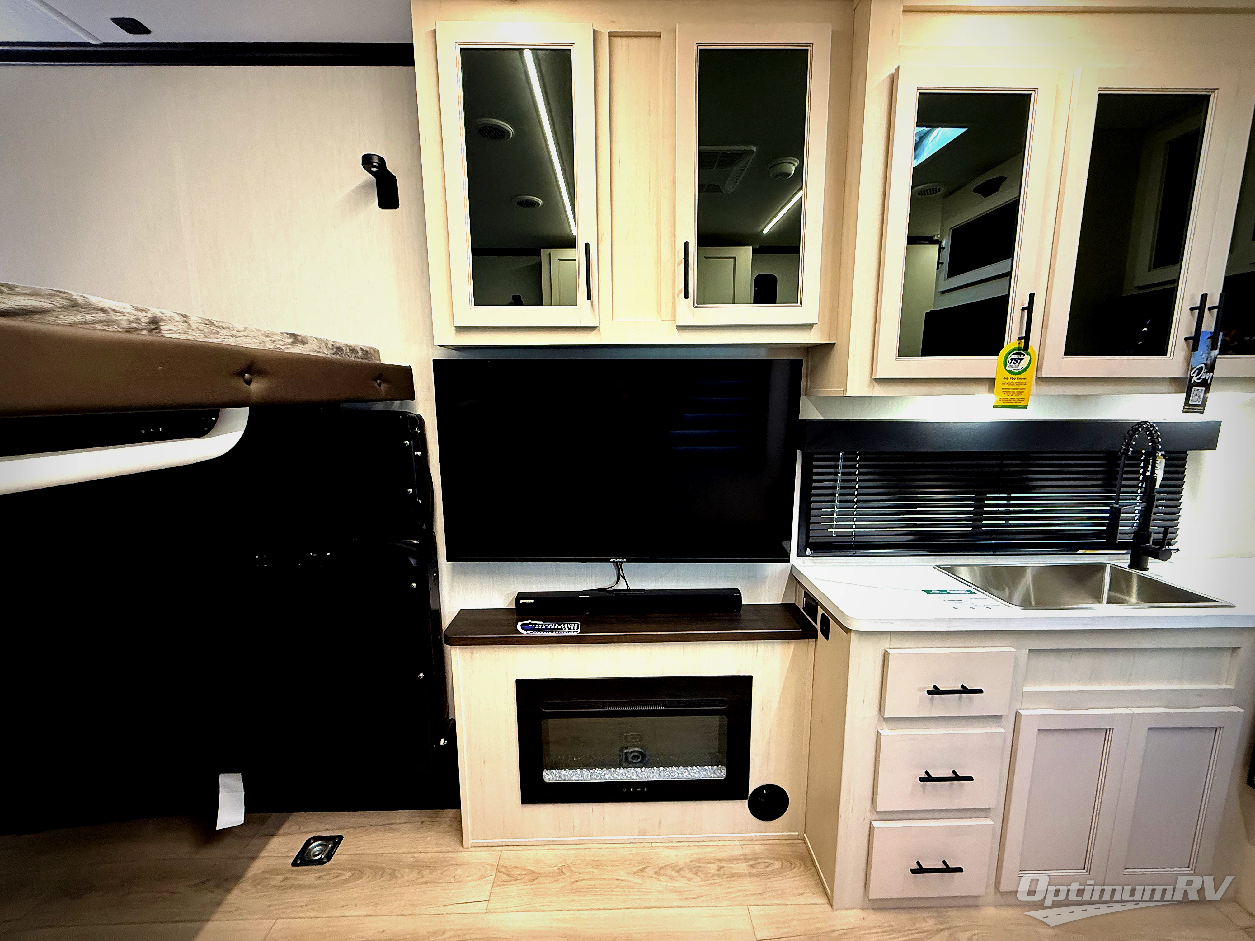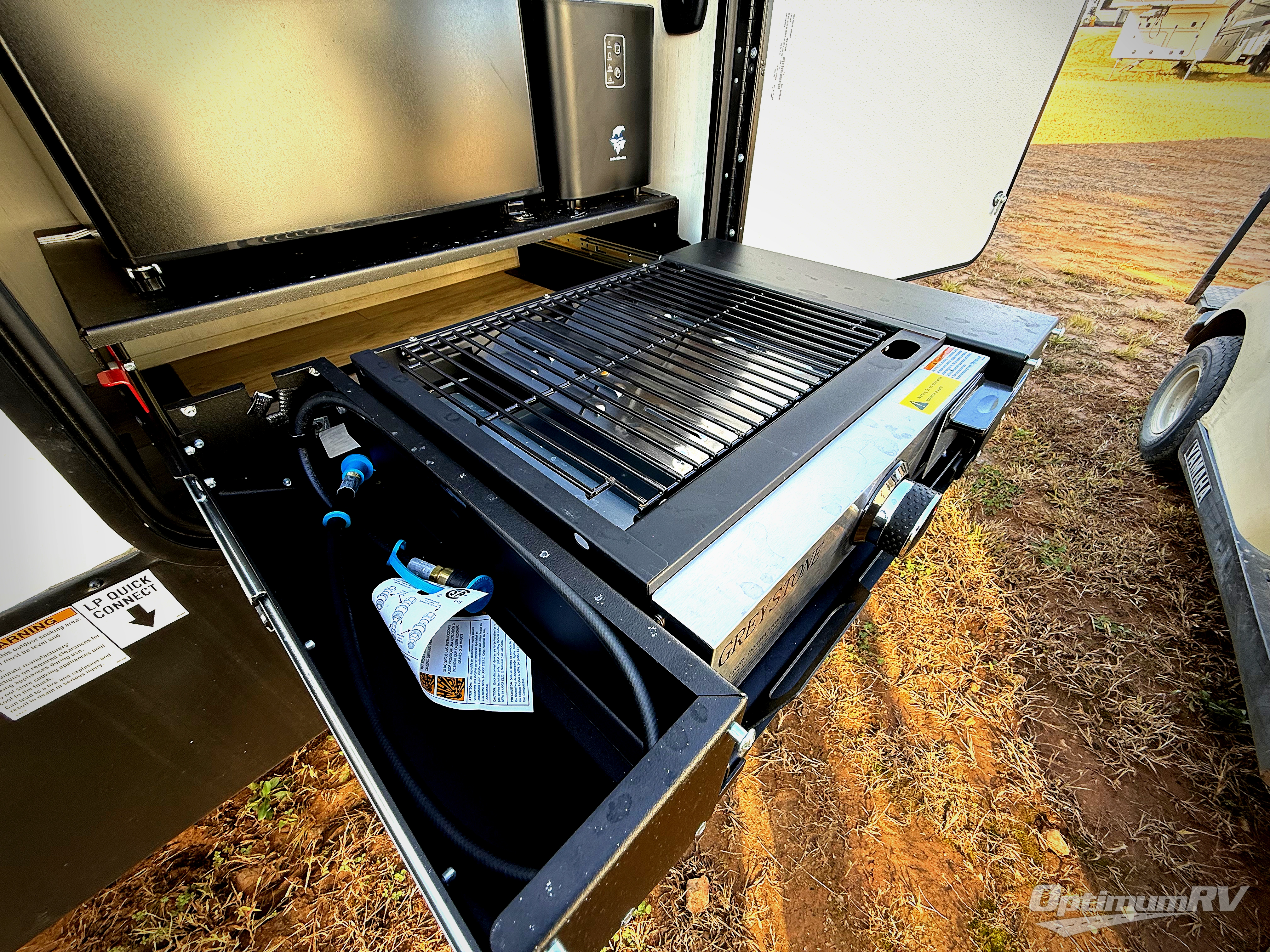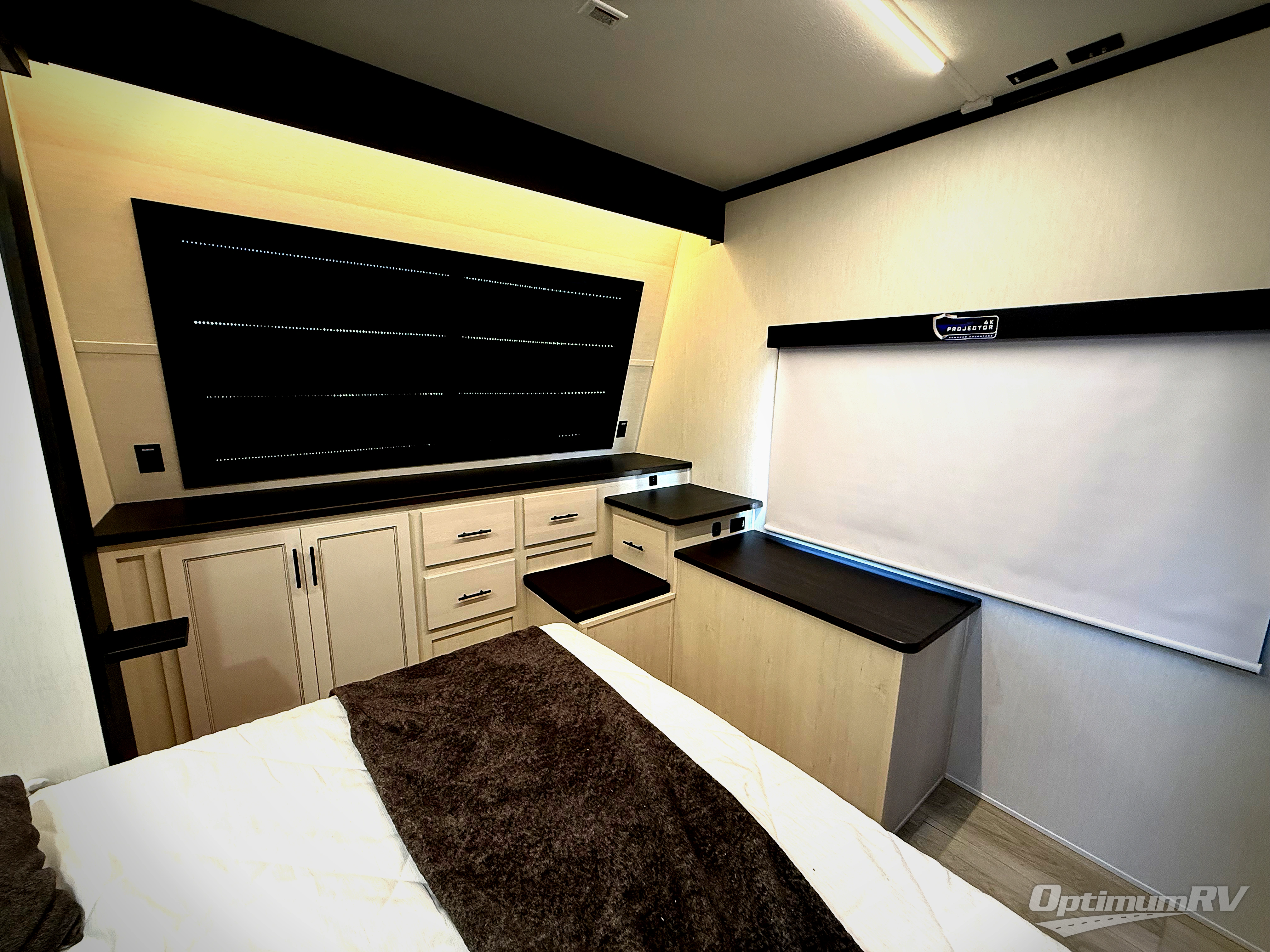 Head for the trails with this toy hauler in tow! Once your toys are unloaded from the 14' 1" garage, you can relax on the dual flip-up sofas with a queen bed above. There are also optional dual lounge chairs across from the entertainment center with a cozy fireplace! The chef of your crew can make meals inside on the three-burner cooktop, or head outdoors to utilize the outside kitchen. When you're ready to call it a night, retreat to the front private bedroom for a great night's rest on the trailer king bed slide out. There is also a large dresser here to keep your things organized.