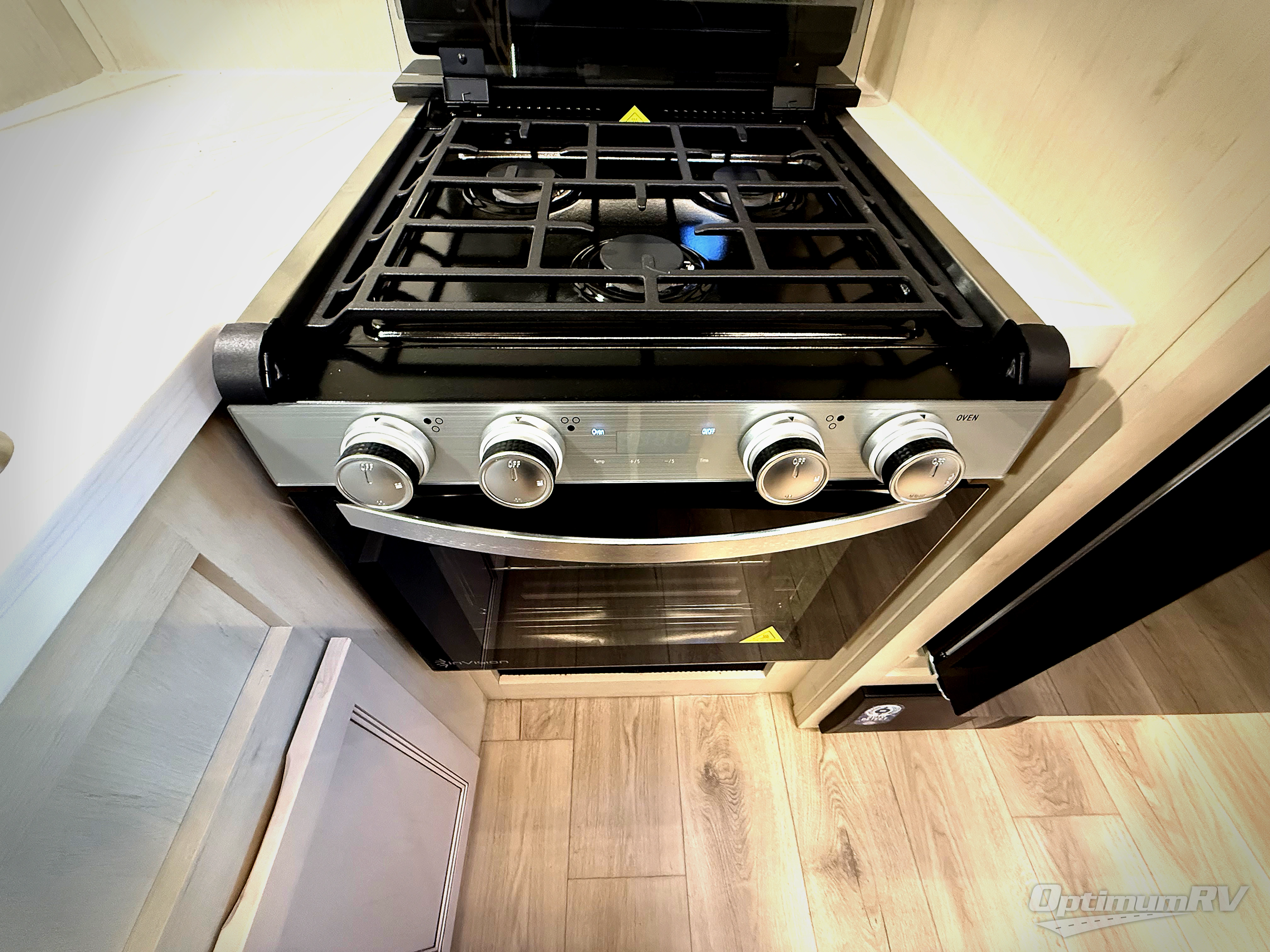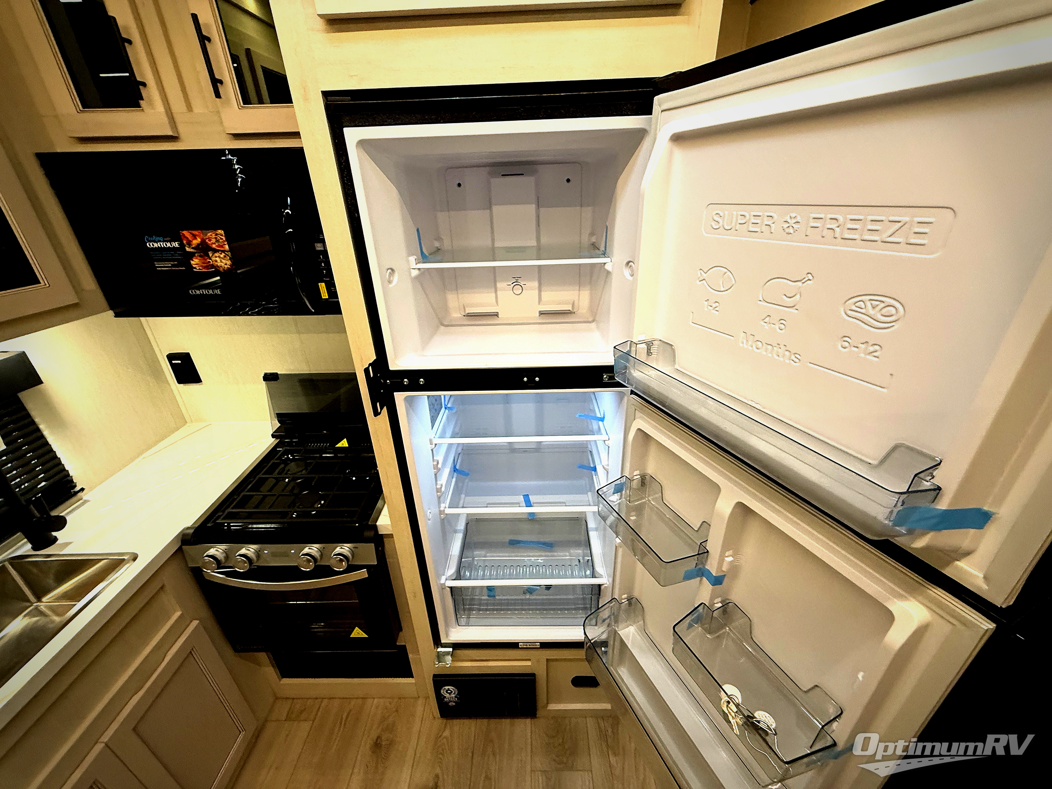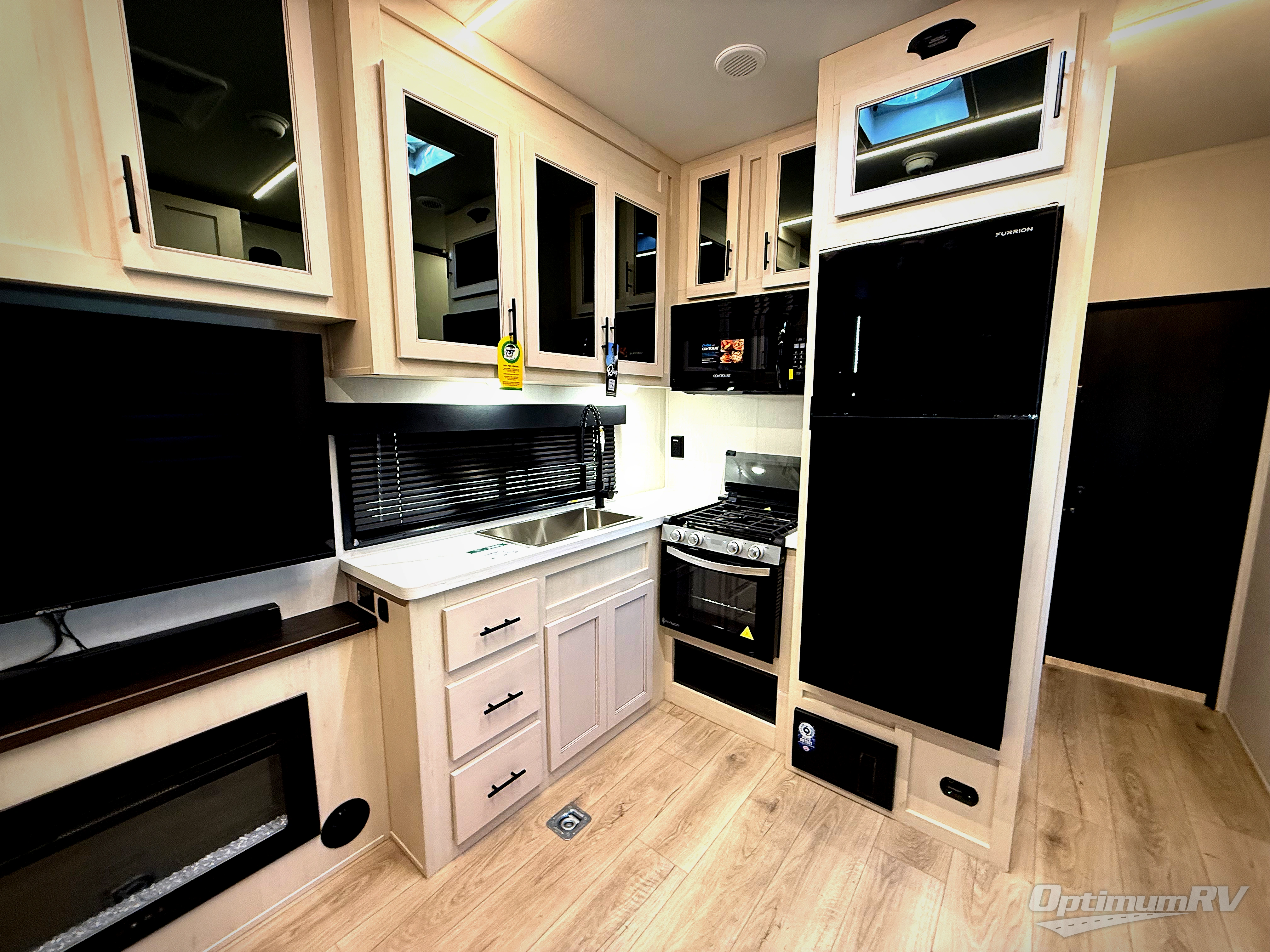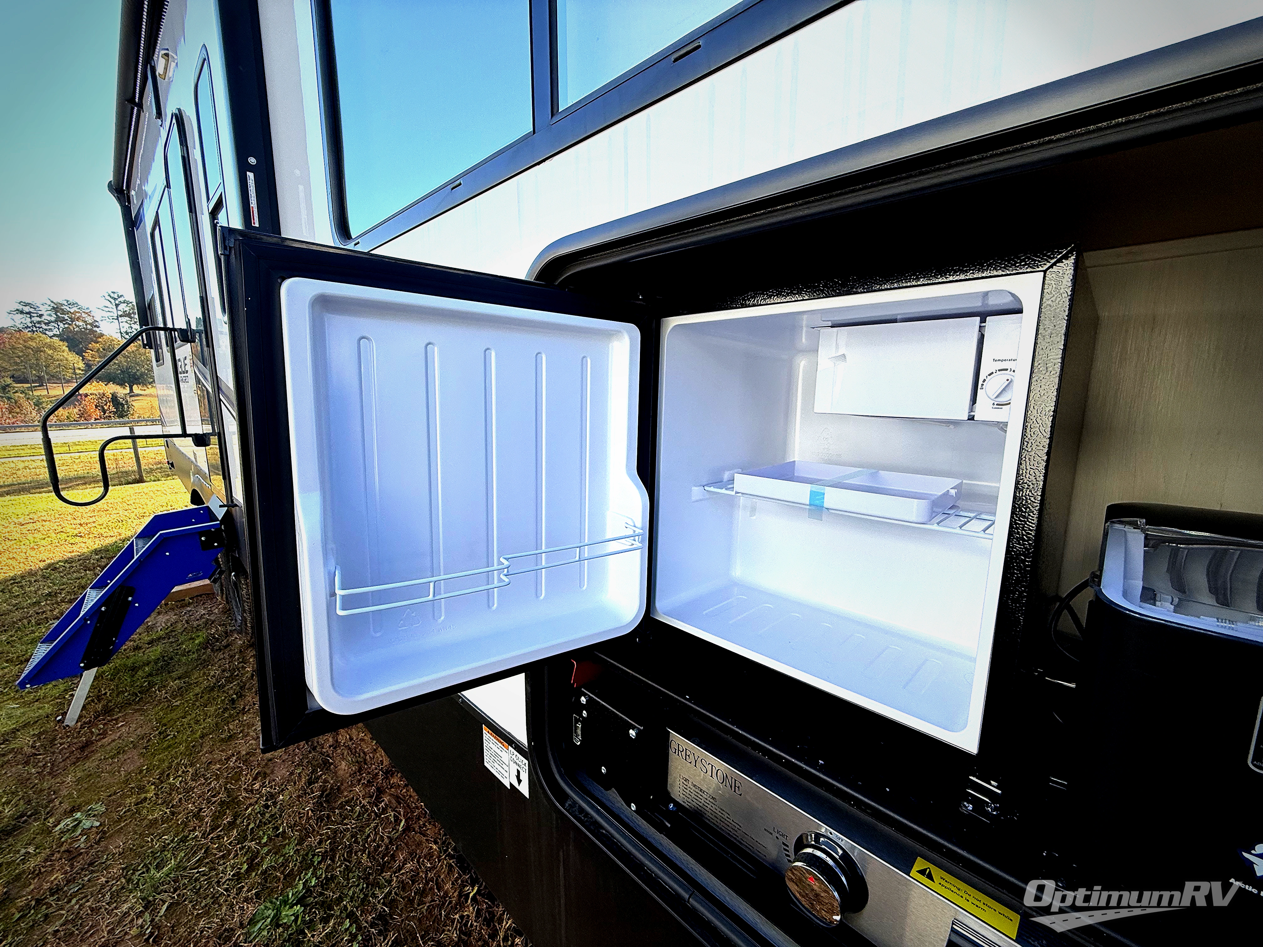Head for the trails with this toy hauler in tow! Once your toys are unloaded from the 14' 1" garage, you can relax on the dual flip-up sofas with a queen bed above. There are also optional dual lounge chairs across from the entertainment center with a cozy fireplace! The chef of your crew can make meals inside on the three-burner cooktop, or head outdoors to utilize the outside kitchen. When you're ready to call it a night, retreat to the front private bedroom for a great night's rest on the trailer king bed slide out. There is also a large dresser here to keep your things organized.