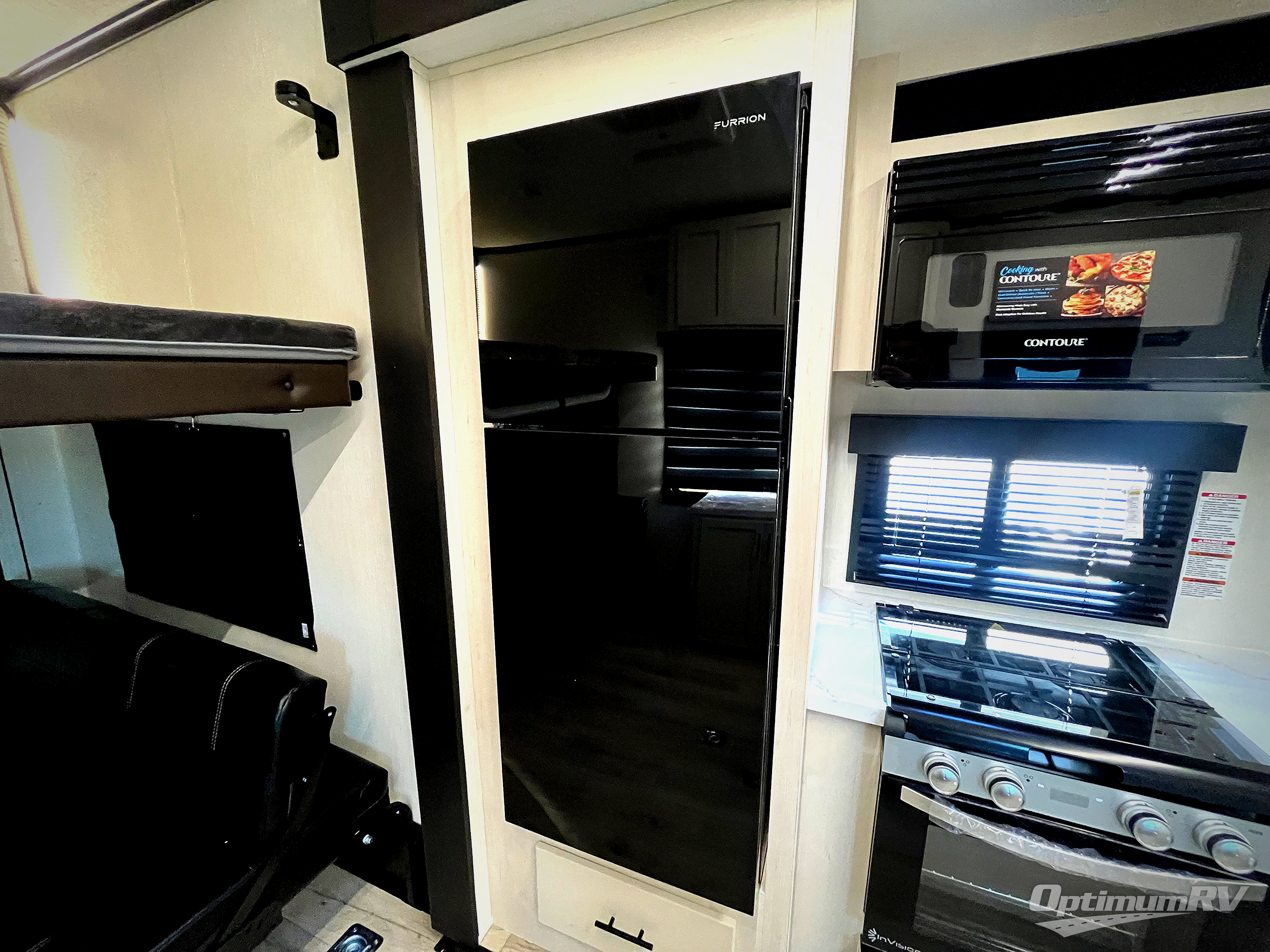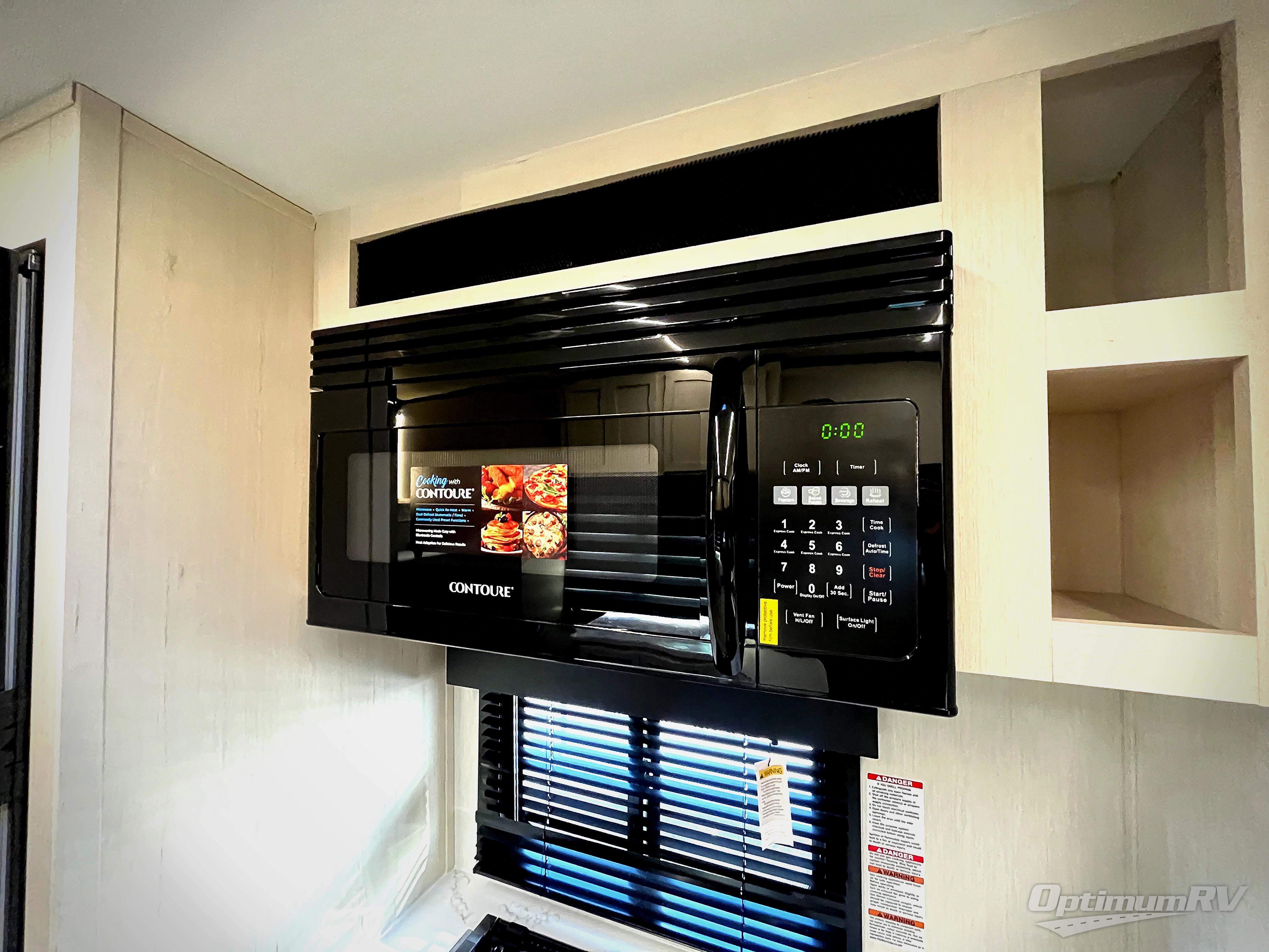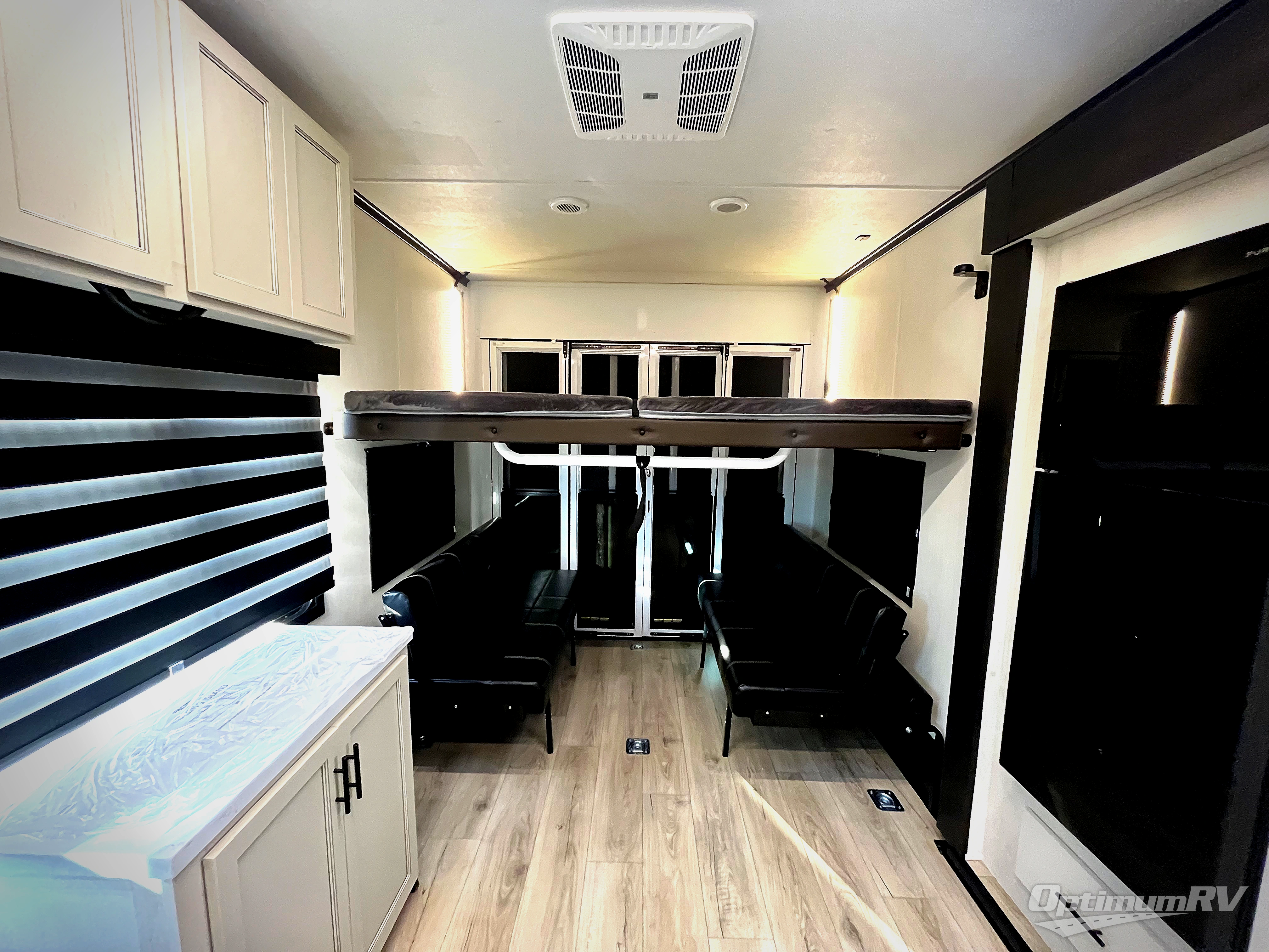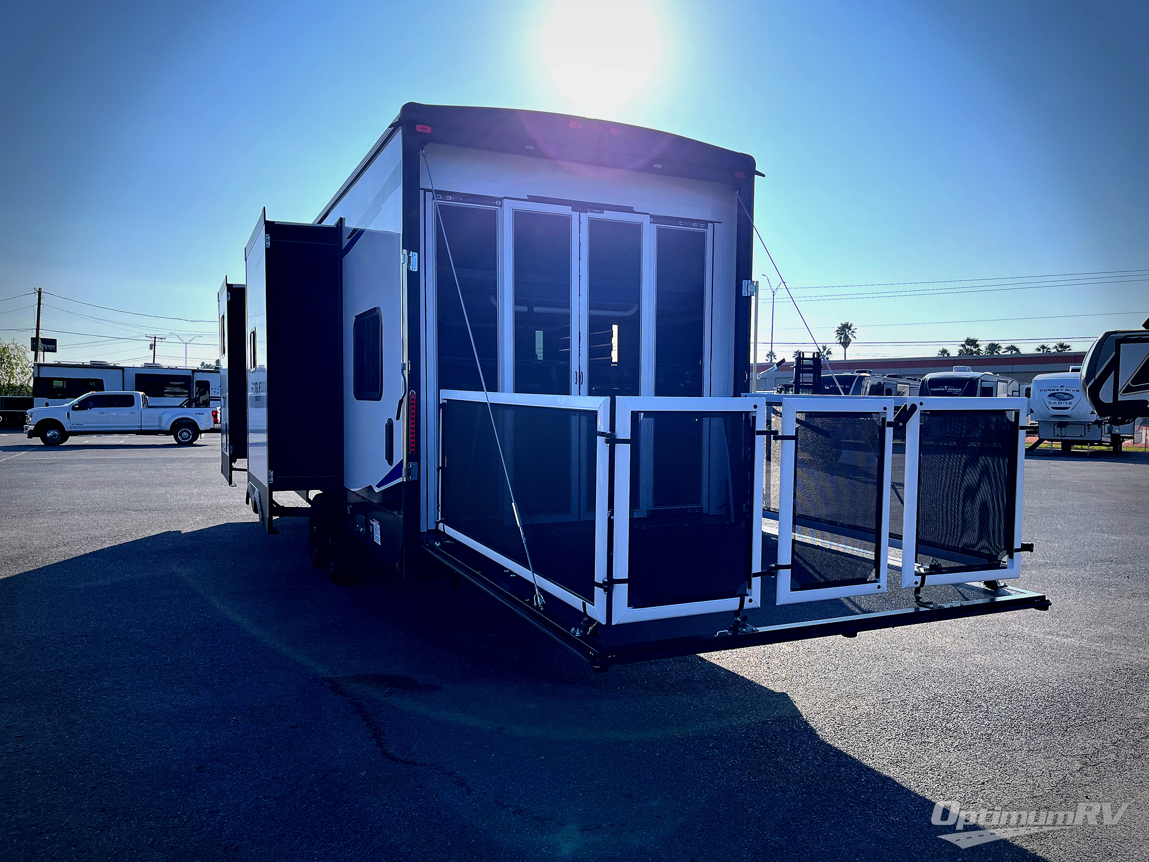 This double slide out toy hauler is ready for adventure when you are! Once your toys are unloaded using the ramp door, you can set up the flip-up sofas or set up the drop-down queen bed for guests to sleep on. You'll enjoy the front private bedroom all to yourselves that includes a king bed slide and a large dresser to keep your things organized. A three-burner range and 30" microwave will let you make meals each day, and the 10.7 cu. ft. 12V refrigerator will keep your food stored away.