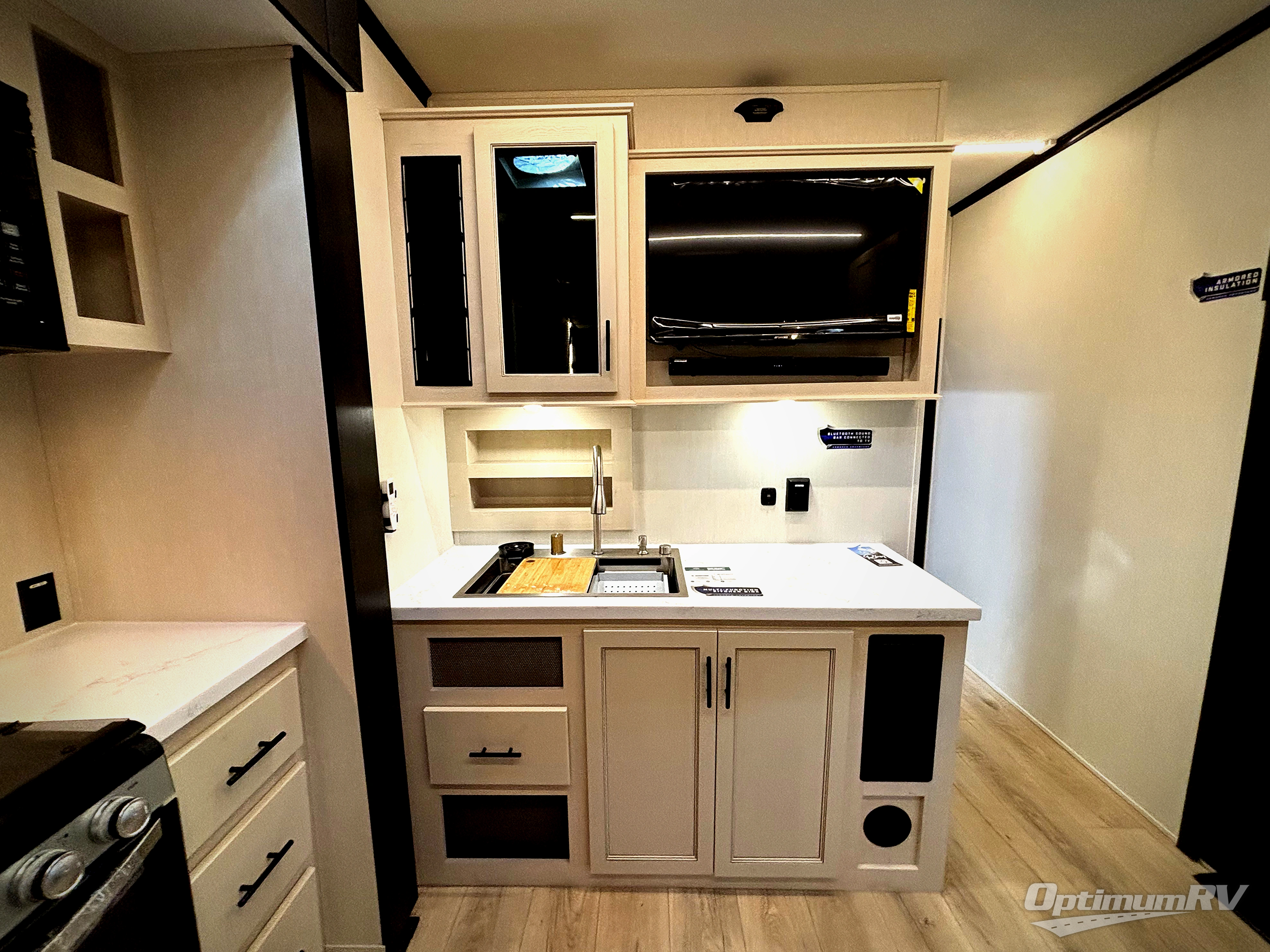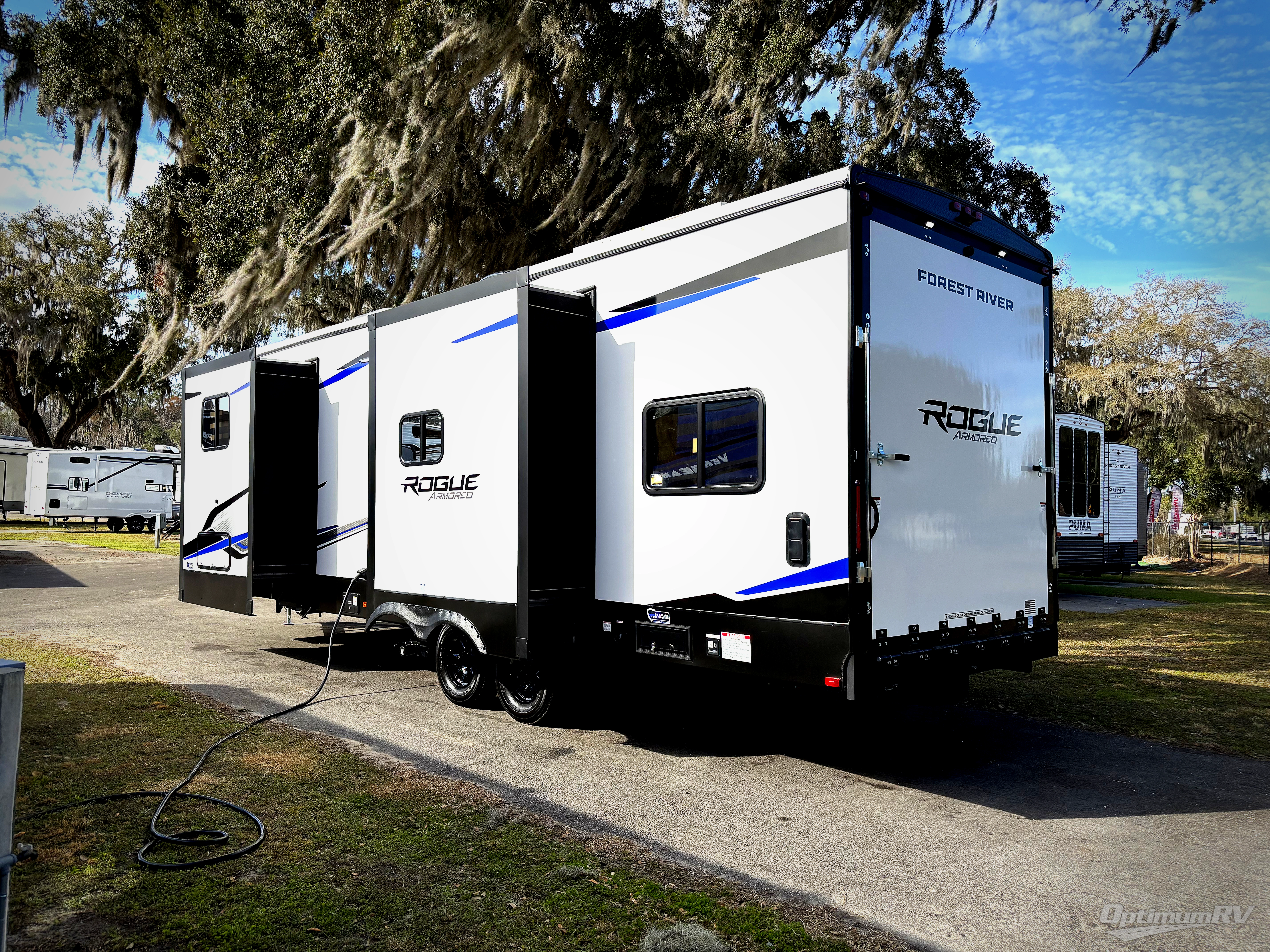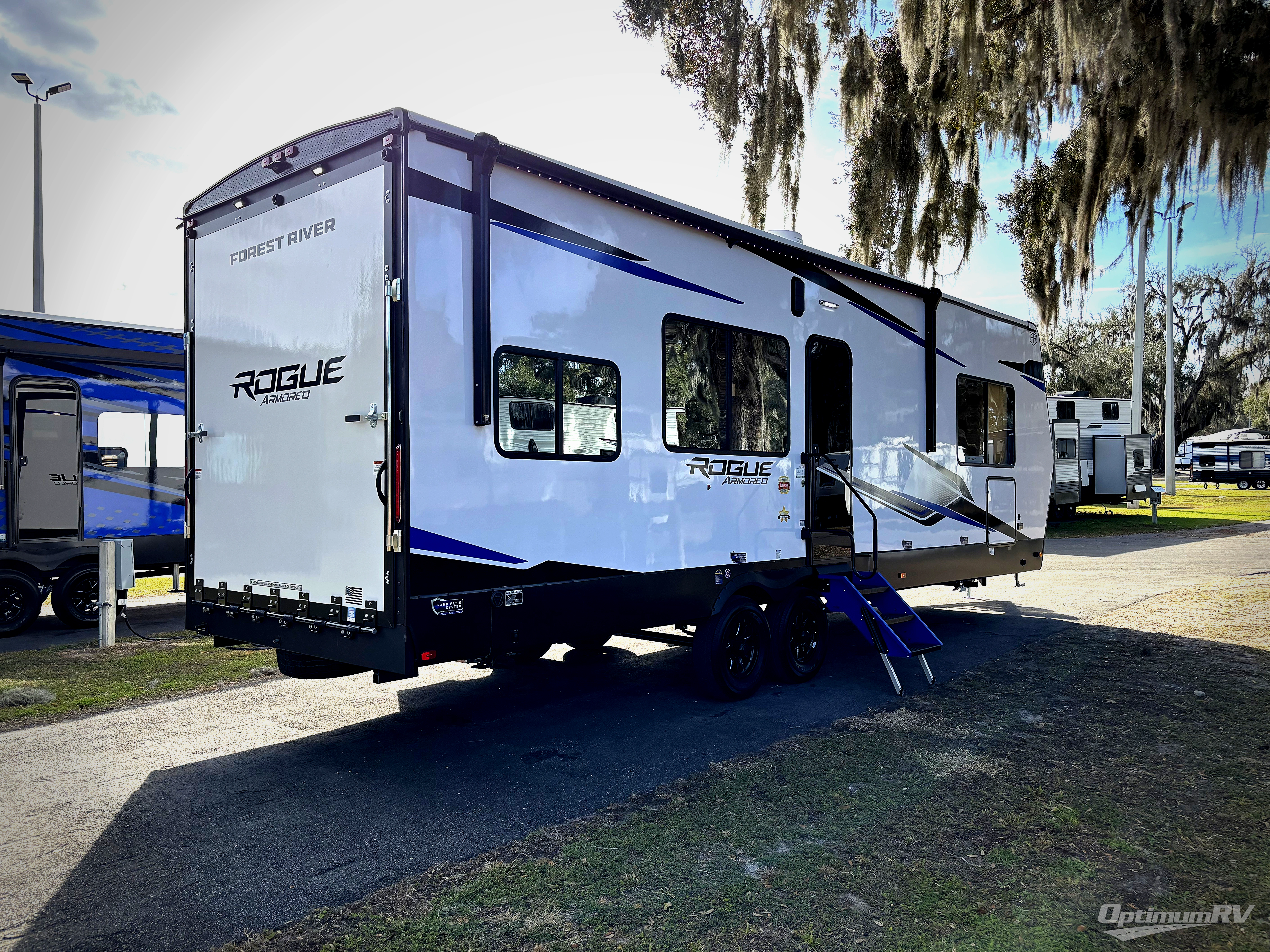Every one of these Forest River Vengeance Rogue Armored travel trailer toy haulers come with the features you want most at an affordable price tag! The DuraPoxy gas/oil resistant floor has 5,000 lb. tie downs to ensure your toys will arrive safely without damaging the flooring, plus the 3,000 lb. rated ramp door makes it easy to load them. A 15,000 BTU A/C will keep you cool even on the hottest summer days, and there are heated enclosed holding tanks with 12V heat pads on every tank for added protection. Each model includes a fuel station with a digital readout, a ramp door patio system, a tire pressure monitoring system, and many more stand-out features. Inside, you'll find zebra shades in the living room, multiple USB charging stations, a multi-functional kitchen sink, glass shower doors, and many more comforts!