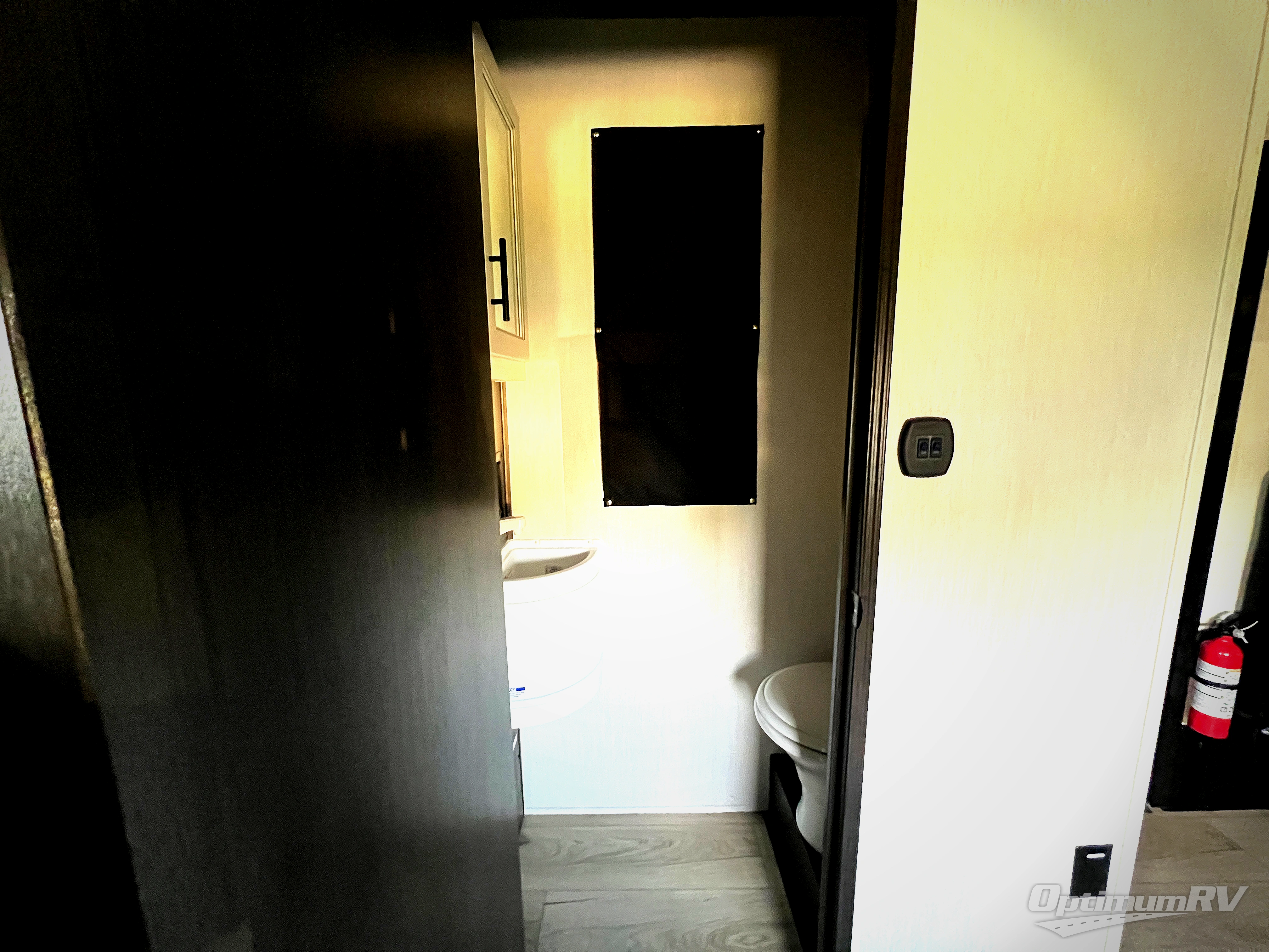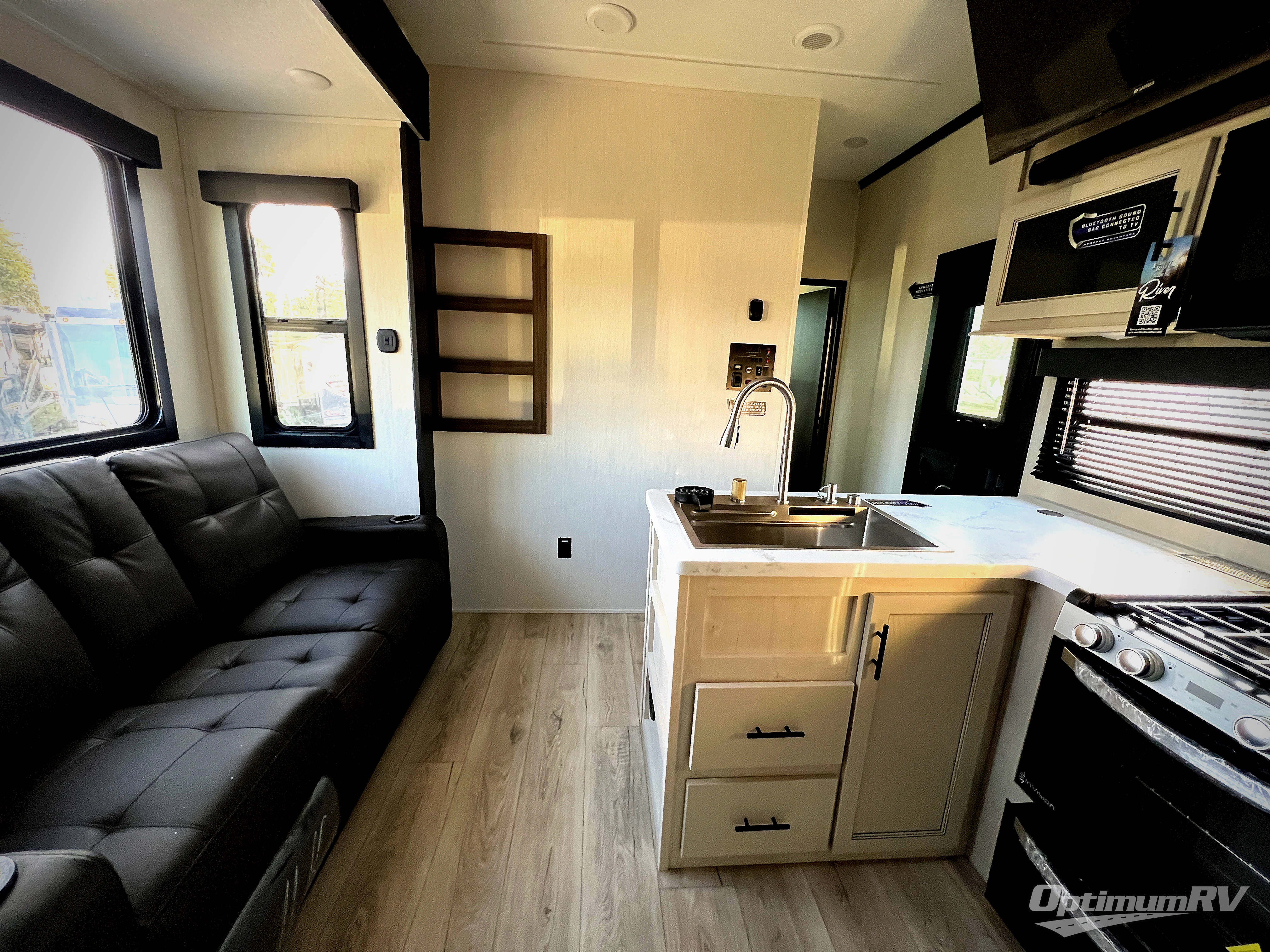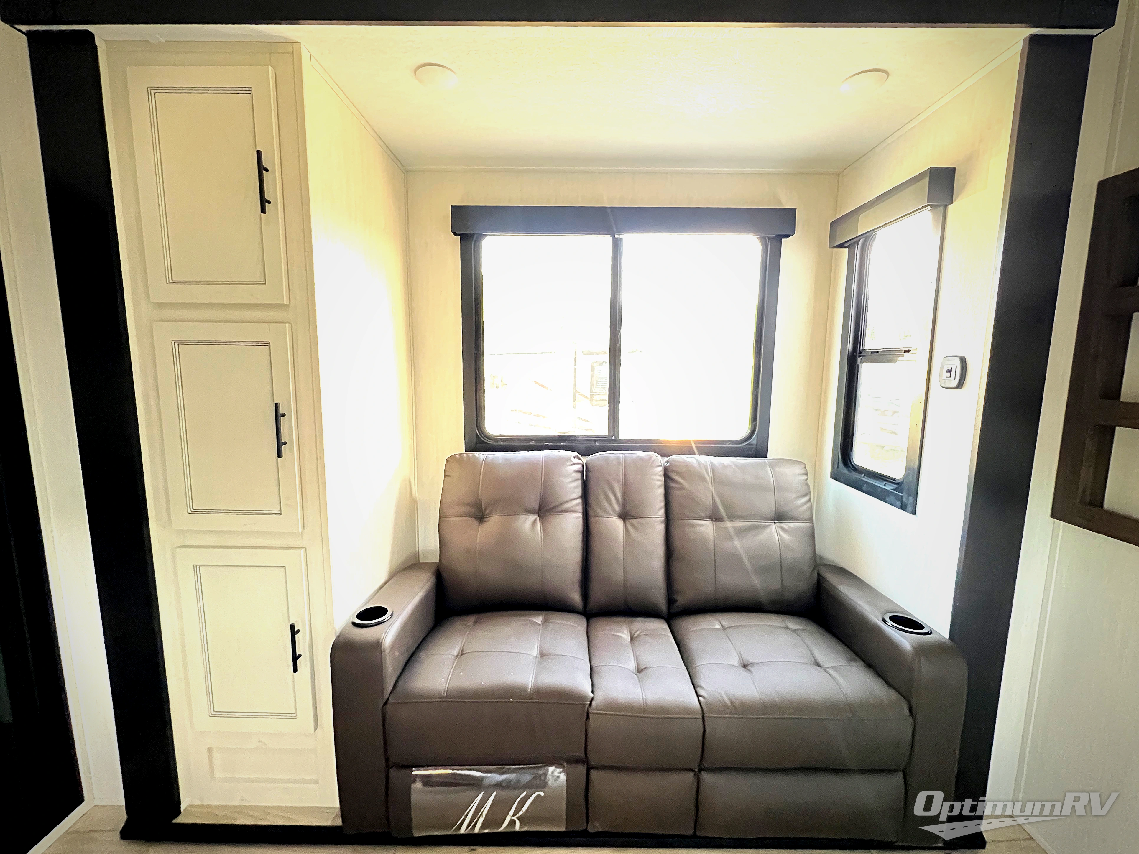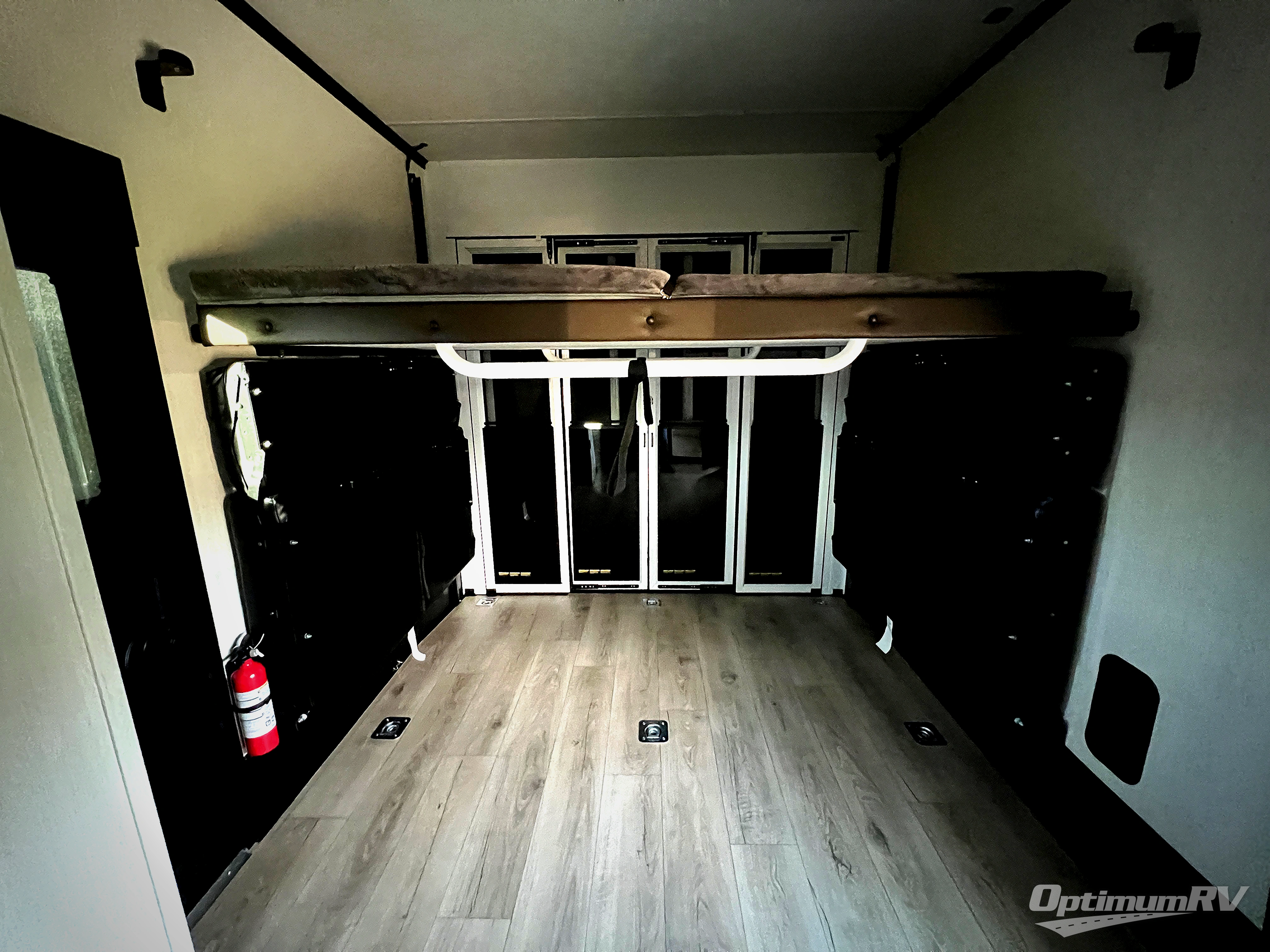 This double slide out toy hauler is ready for adventure when you are! Once your toys are unloaded from the separate garage, you can set up the flip-up sofas or set up the drop-down queen bed for guests to sleep on, and there is even a half bath here for added convenience. You'll enjoy the front private bedroom all to yourselves that includes a king bed slide and a large dresser to keep your things organized. The combined kitchen and living area includes a three-burner range and 30" microwave to make meals, a sofa with recliners to relax on, plus a 12V refrigerator and pantry for food storage.