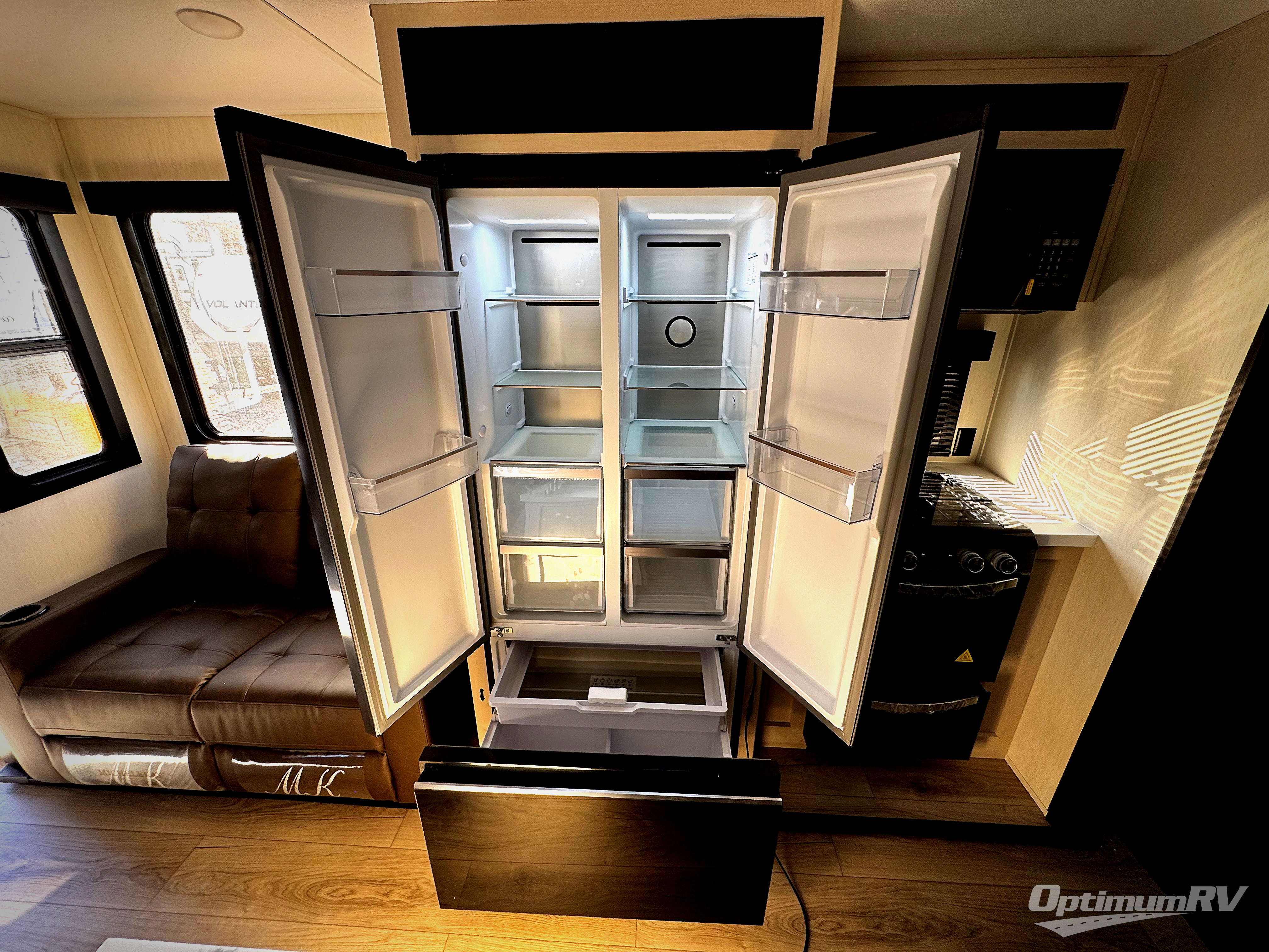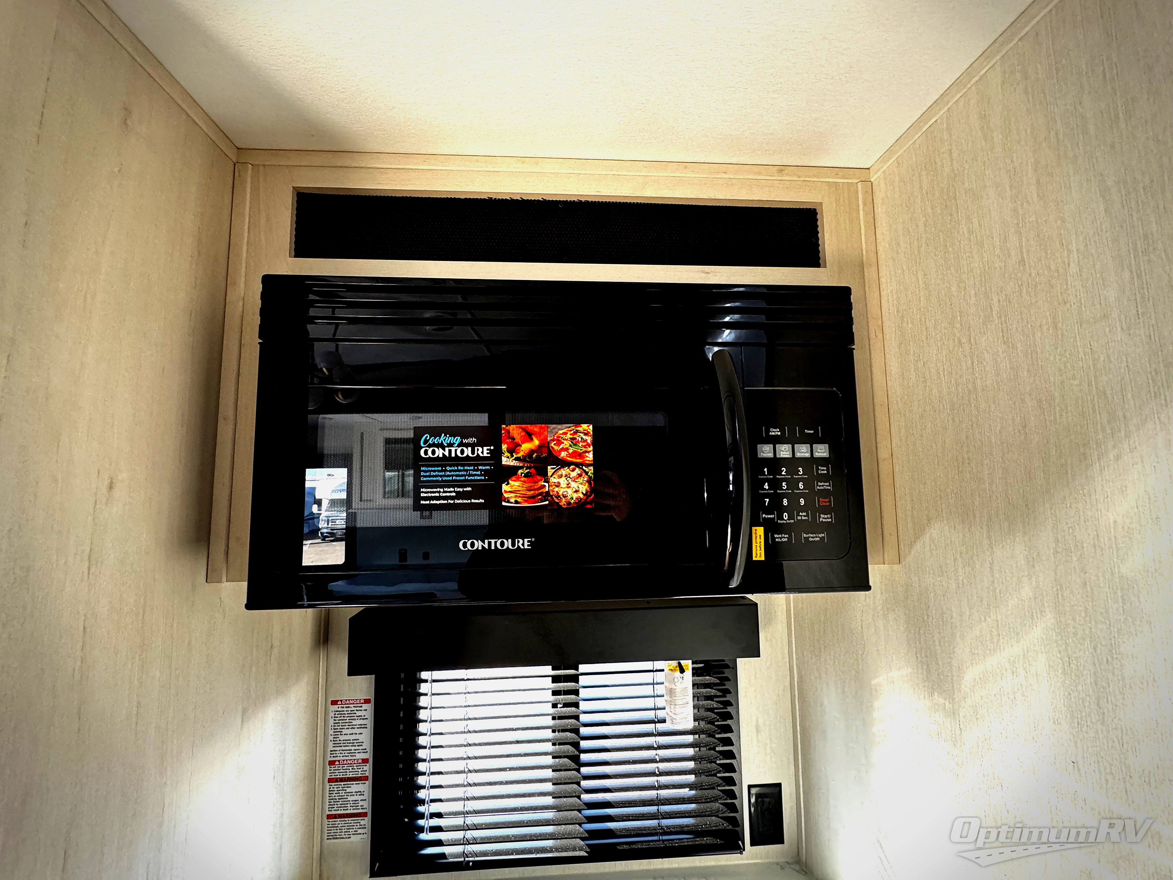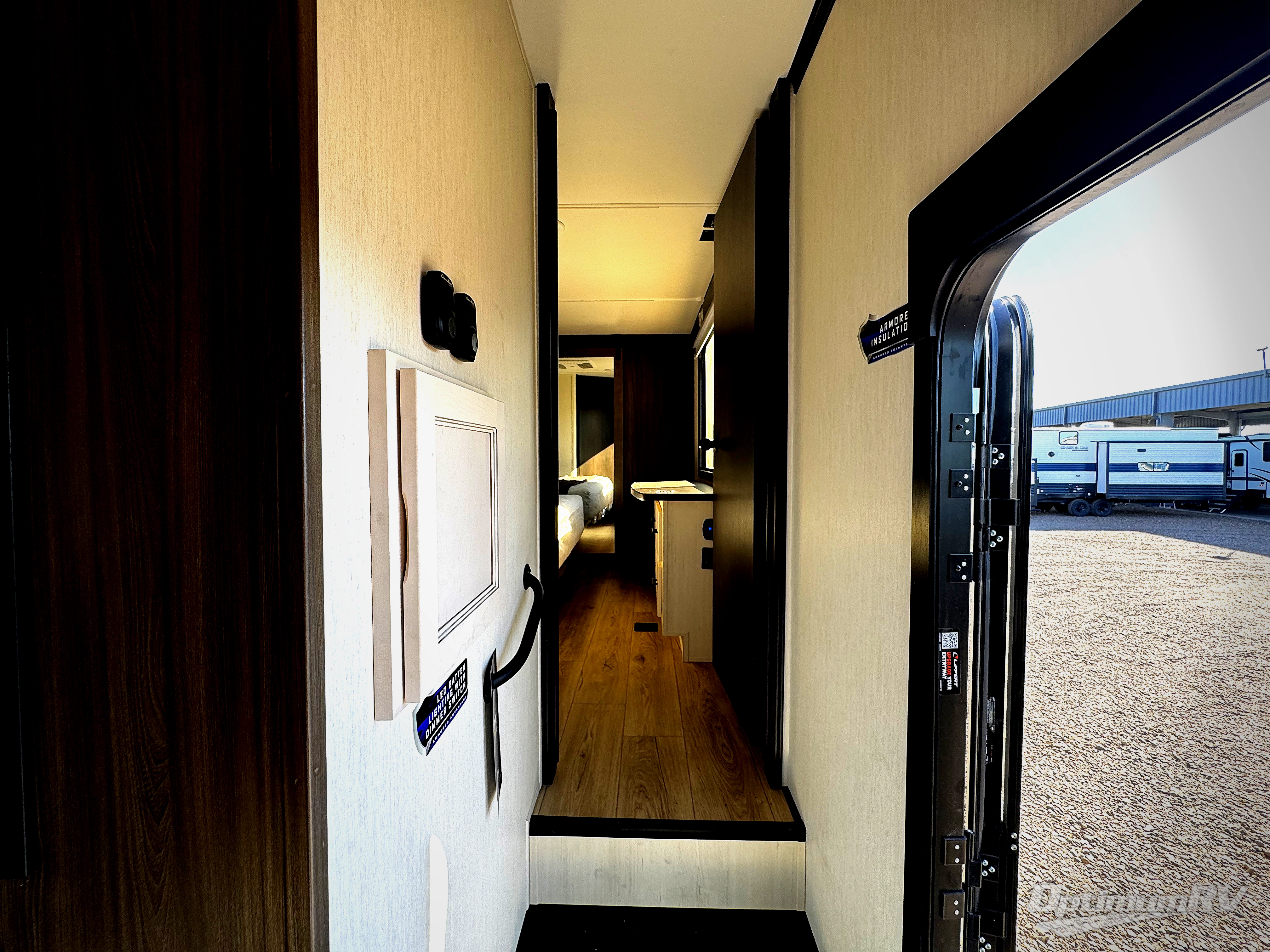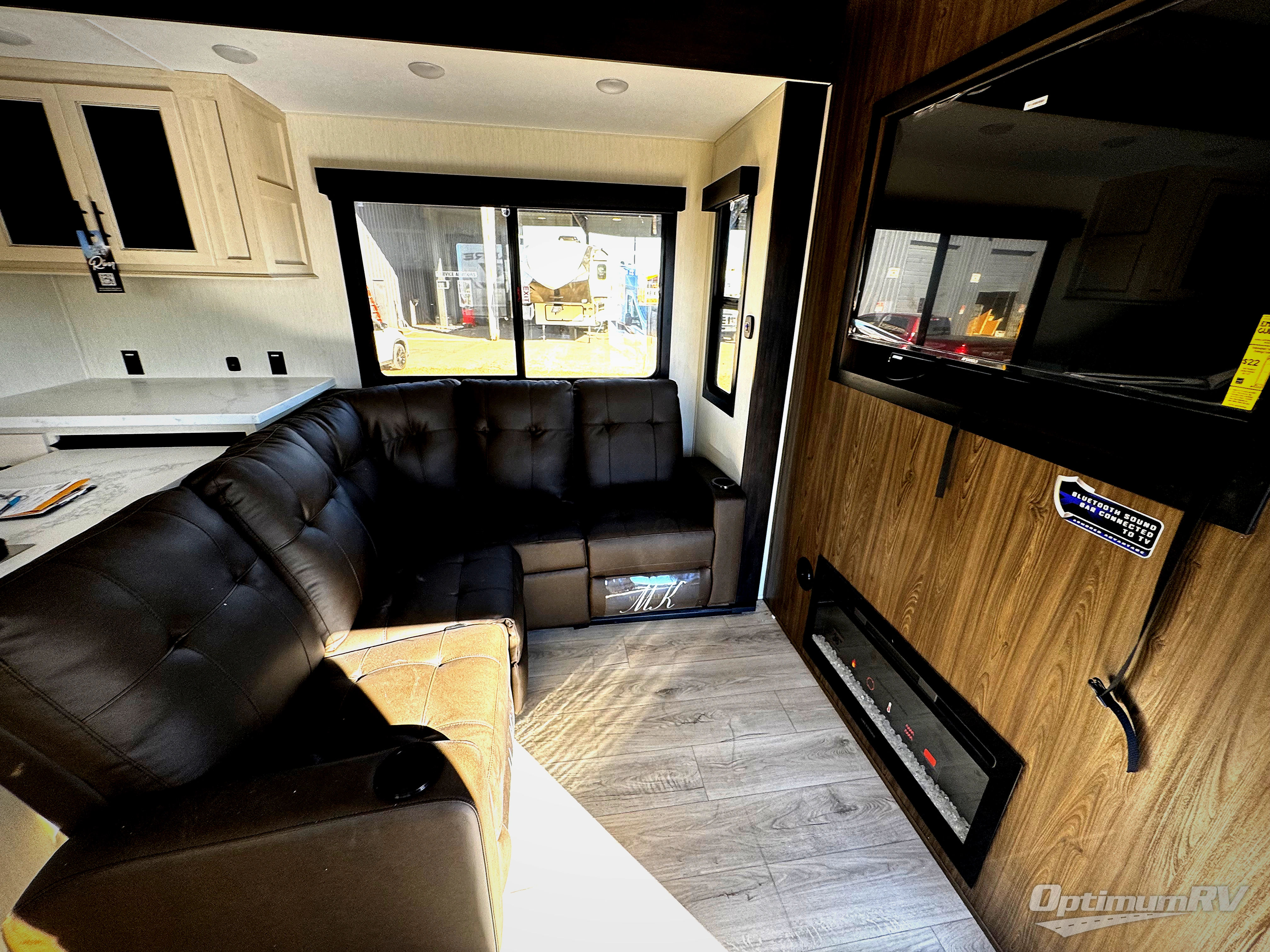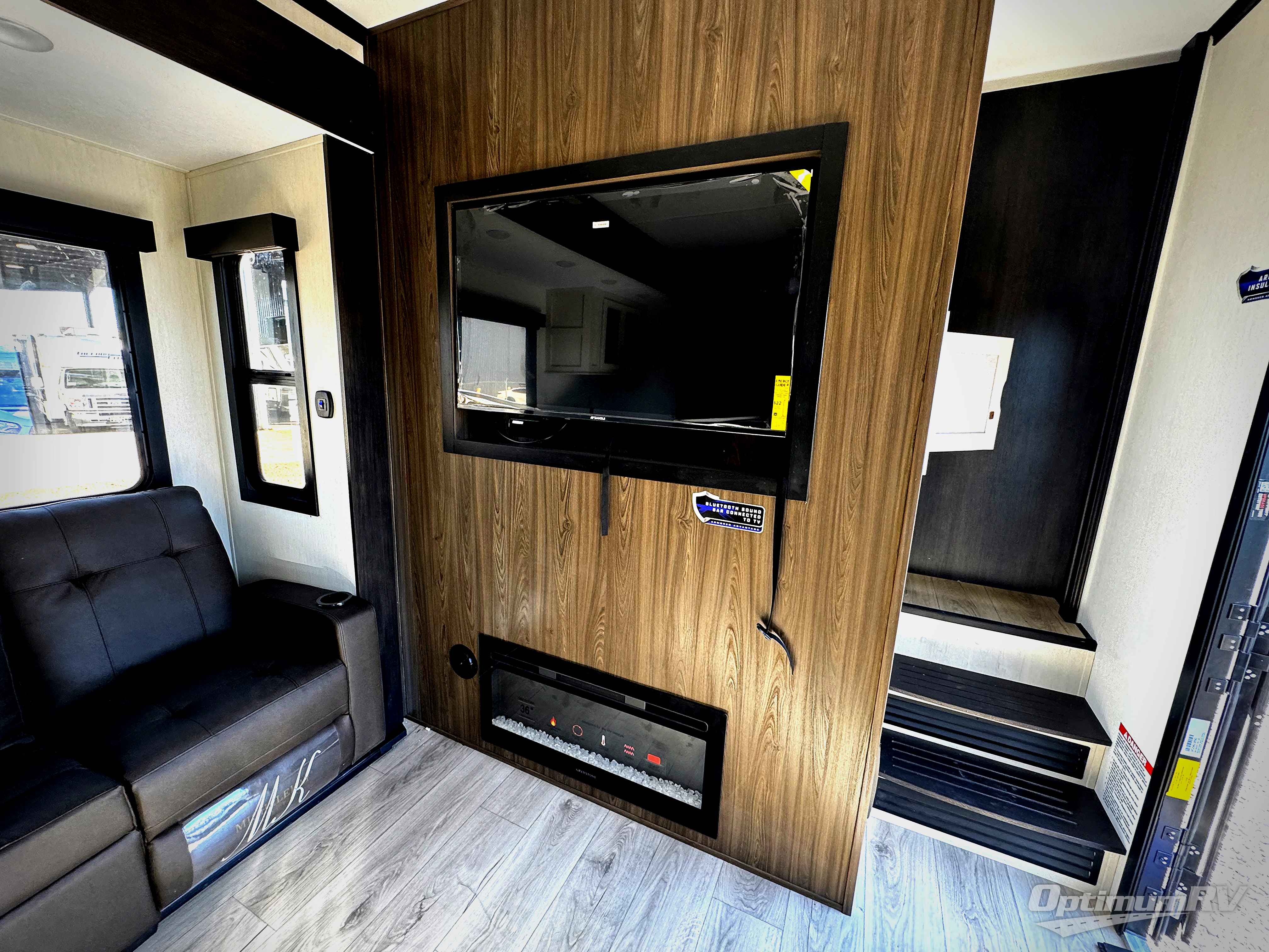 Hit the trails with this triple slide out toy hauler! Once your dirt bikes are unloaded from the 14' 6" garage, you can relax on the dual flip-up sofas with a free-standing table. There is also a raised queen bed above the sofas, a utility bath/shower plus a loft, making this space perfect for guests! The chef of your group will find a counter peninsula to prep meals, a 12V residential style refrigerator, plus a 30" microwave when you need to heat up leftovers. Your crew can get comfortable on the L-shaped sofa or the second sofa, and there is a fireplace to make it cozier! Head up front to the master bedroom that includes a king bed slide out, a large front wardrobe and a dresser, plus your own private full bathroom!