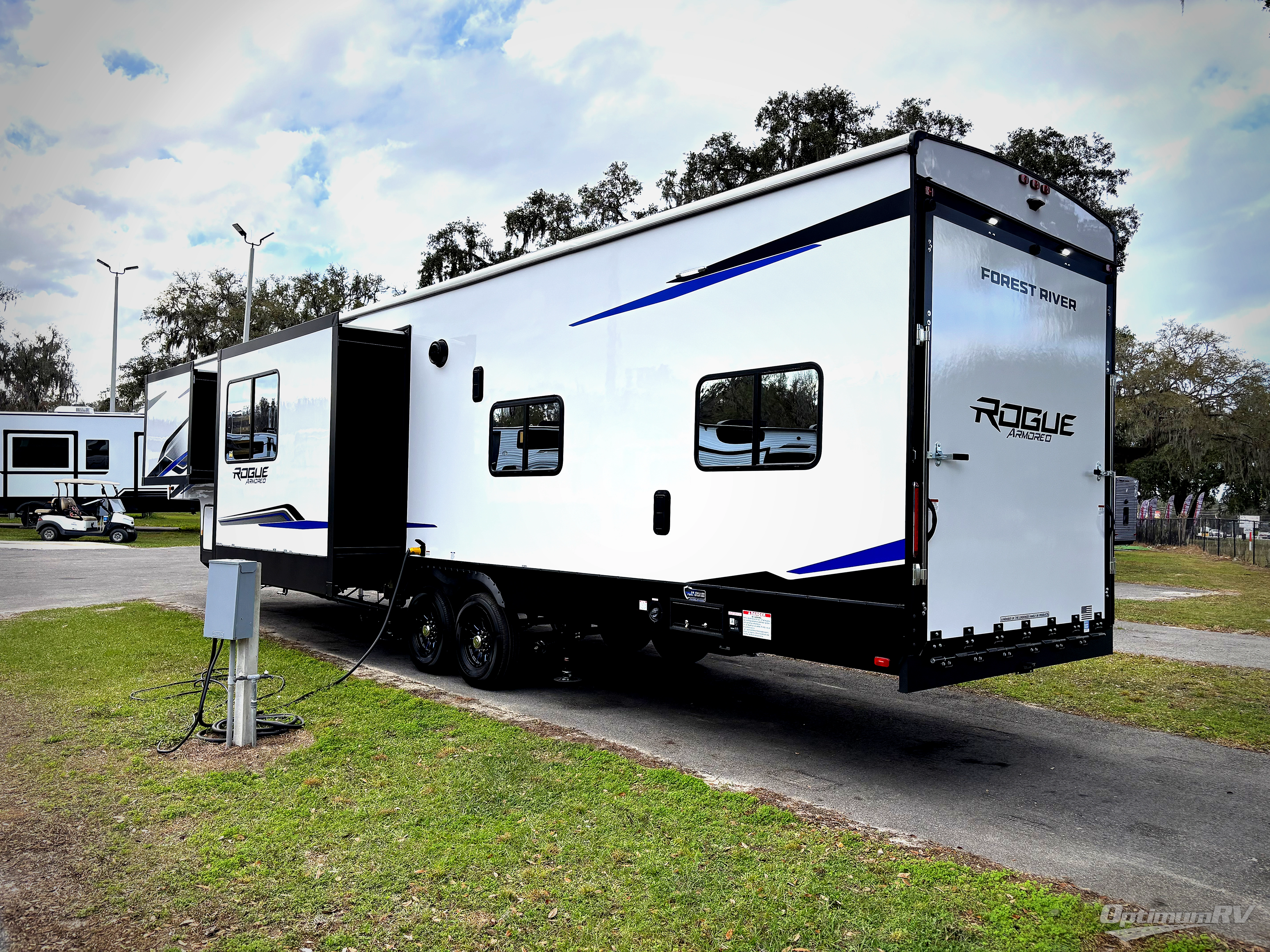 Every one of these Forest River Vengeance Rogue Armored fifth wheel toy haulers come with the features you want most at an affordable price tag! The DuraPoxy gas/oil resistant floor has 5,000 lb. tie downs to ensure your toys will arrive safely without damaging the flooring, plus the 3,000 lb. rated ramp door makes it easy to load them. Two 15,000 BTU A/Cs are "Super H Ducted" to keep you cool even on the hottest summer days, and the heated enclosed holding tanks help protect against the elements. Each model also includes a 6-point leveling system, dual LED cargo lights, solar reflective windows, and a tire pressure monitoring system. Inside, you'll enjoy the solid surface countertops, glass shower door, zebra shades in the living room, and stainless-steel multi-purpose sink to name a few comforts!