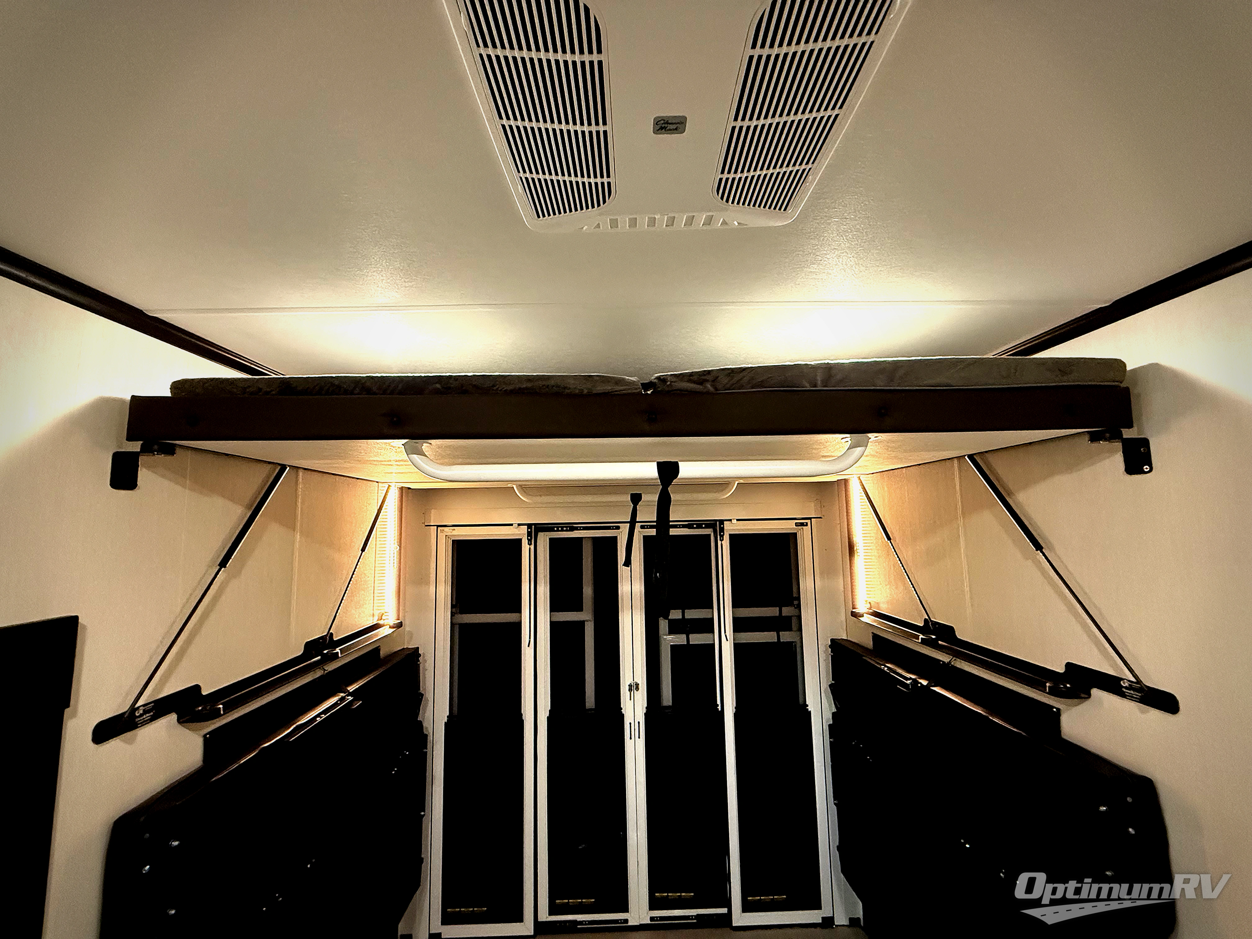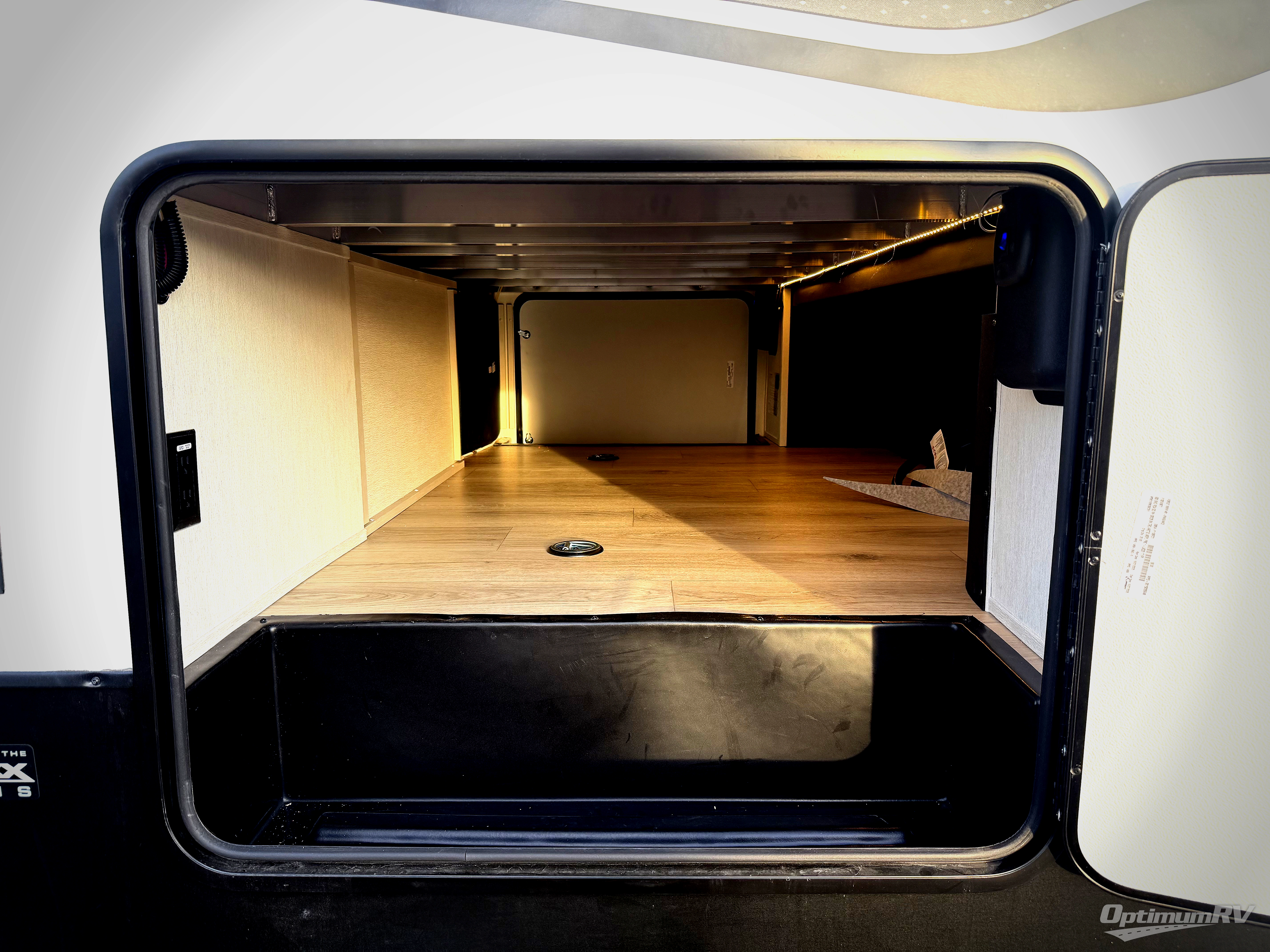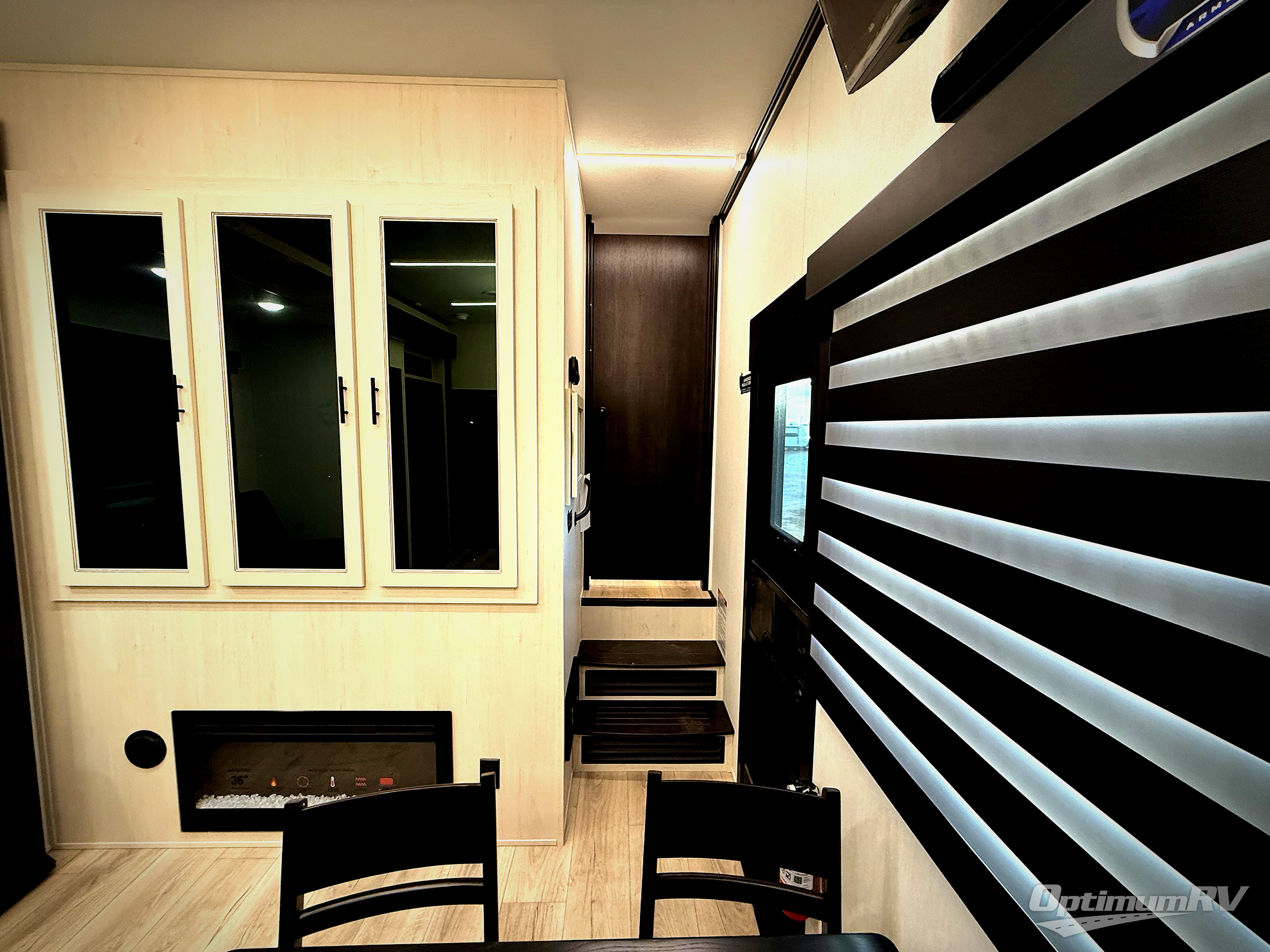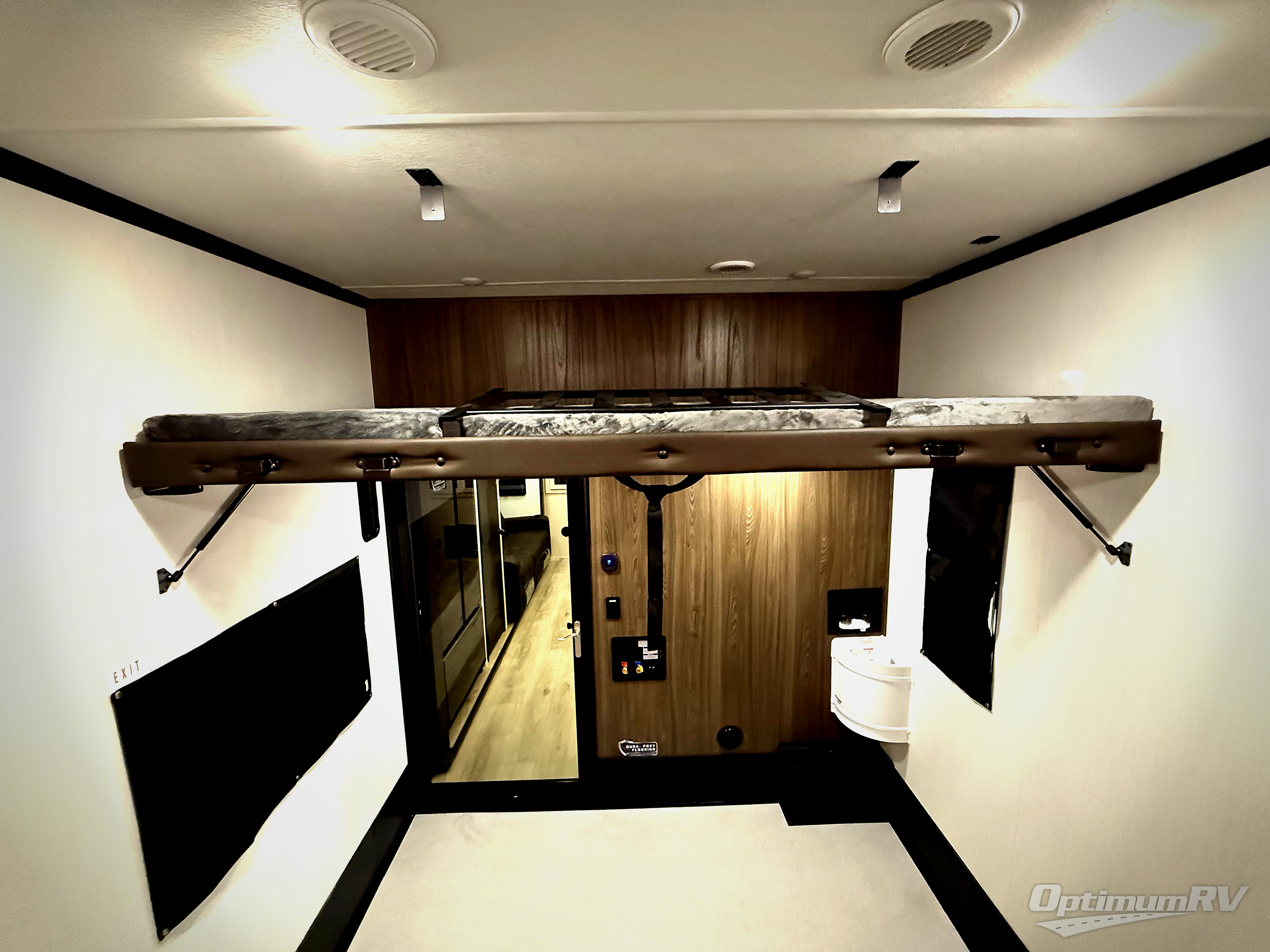 This toy hauler is perfect for a larger group since it can sleep up to eight with the added loft in the garage. There are also dual flip-up sofas here, along with a queen bed above and a half bath for added convenience! The dual entry full bath is up front, creating a master bedroom you are sure to love. There is a king bed slide out, a front wardrobe, and a dresser to keep your things organized. Head to the middle kitchen and living room to relax on the sofa within the large slide out, dine at the table with four chairs, and cook in the full kitchen. This unit also includes a fireplace to make it cozier, a large pantry to keep snacks stocked, and dual power awnings to expand your living space outdoors!