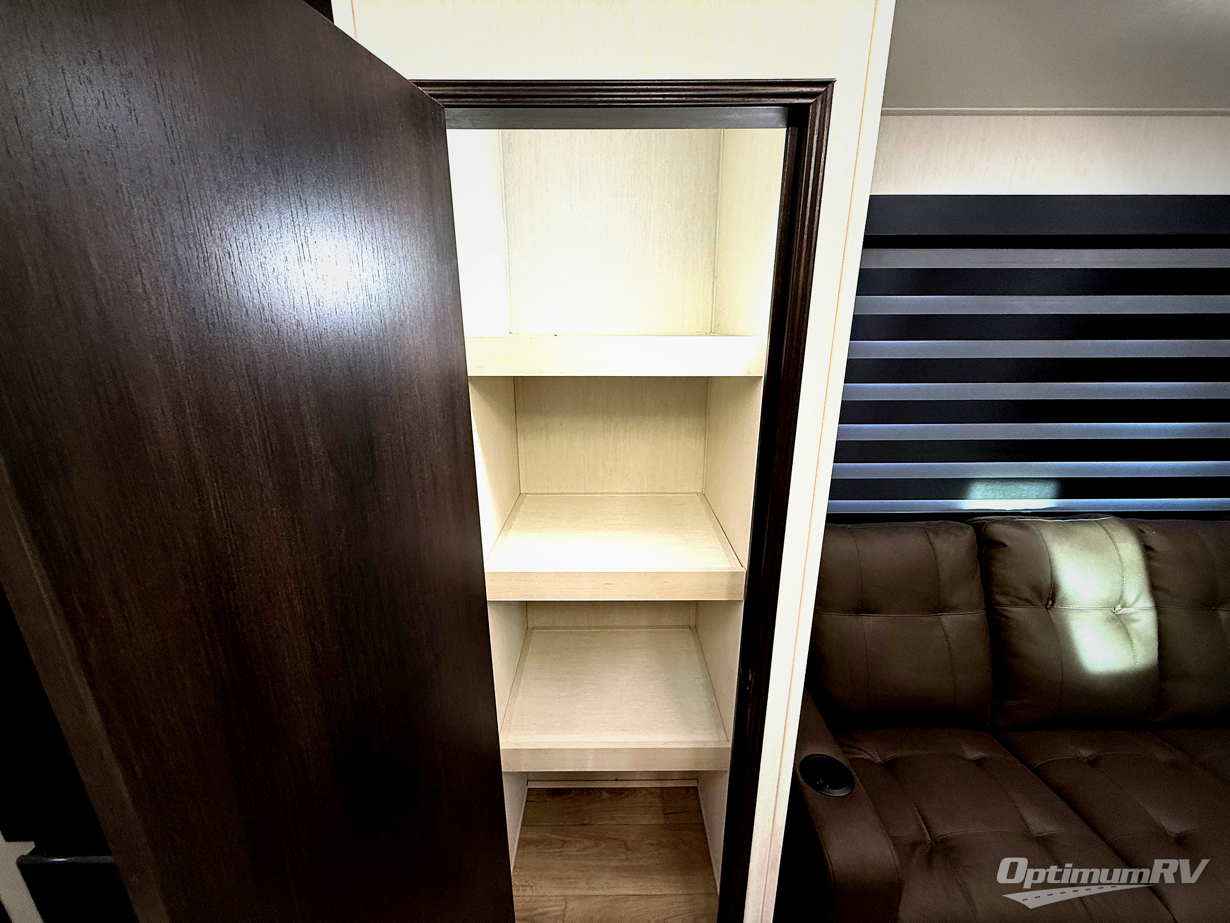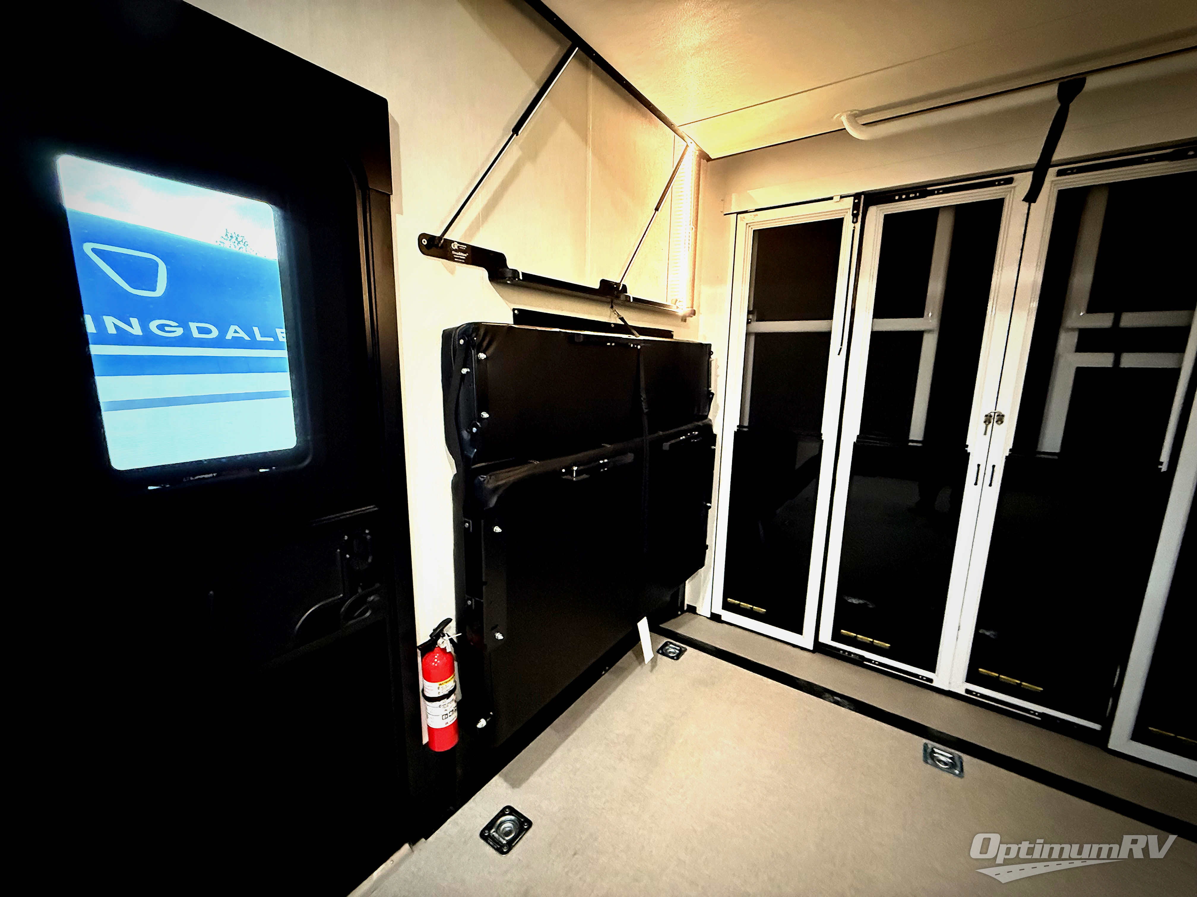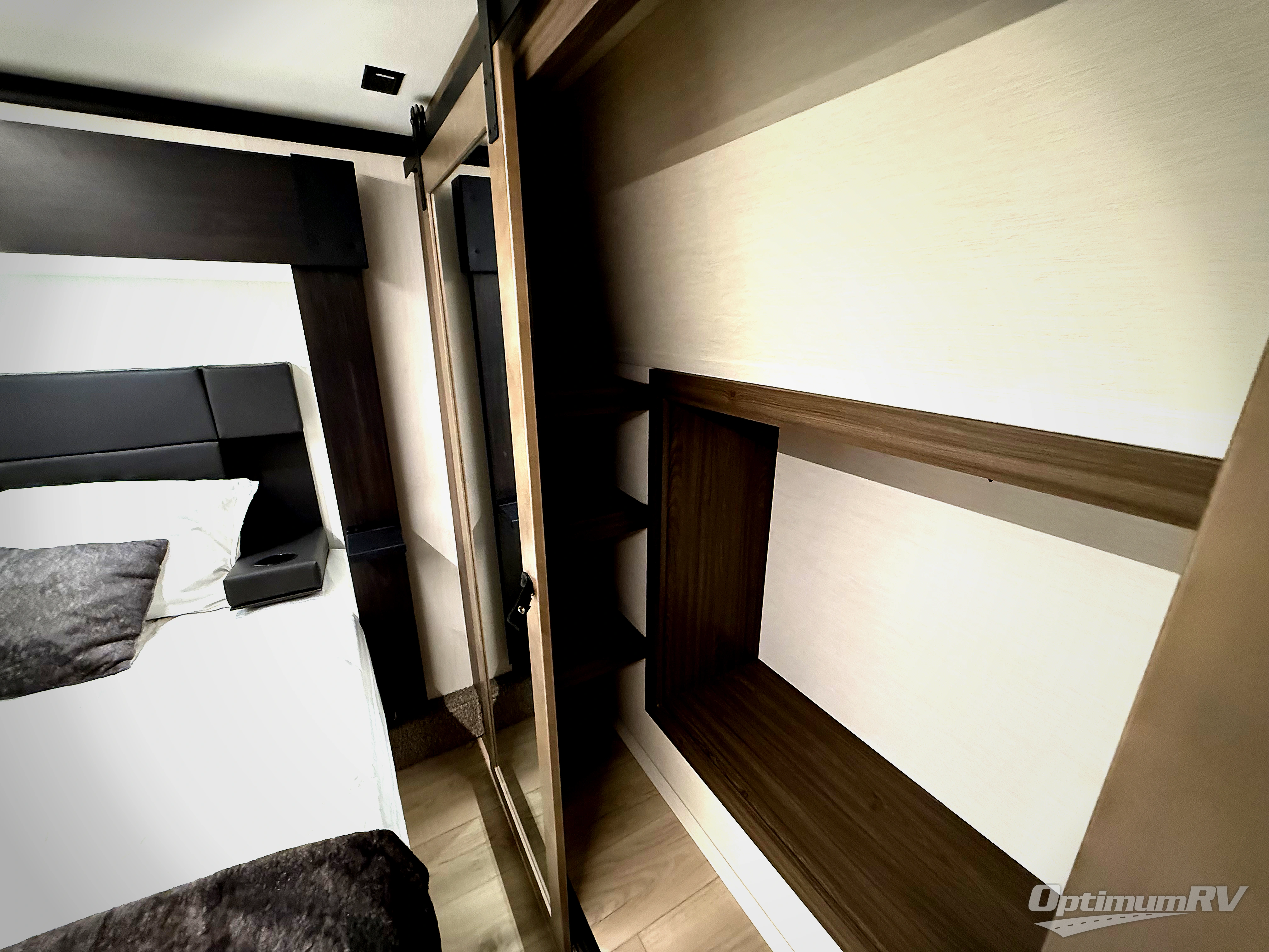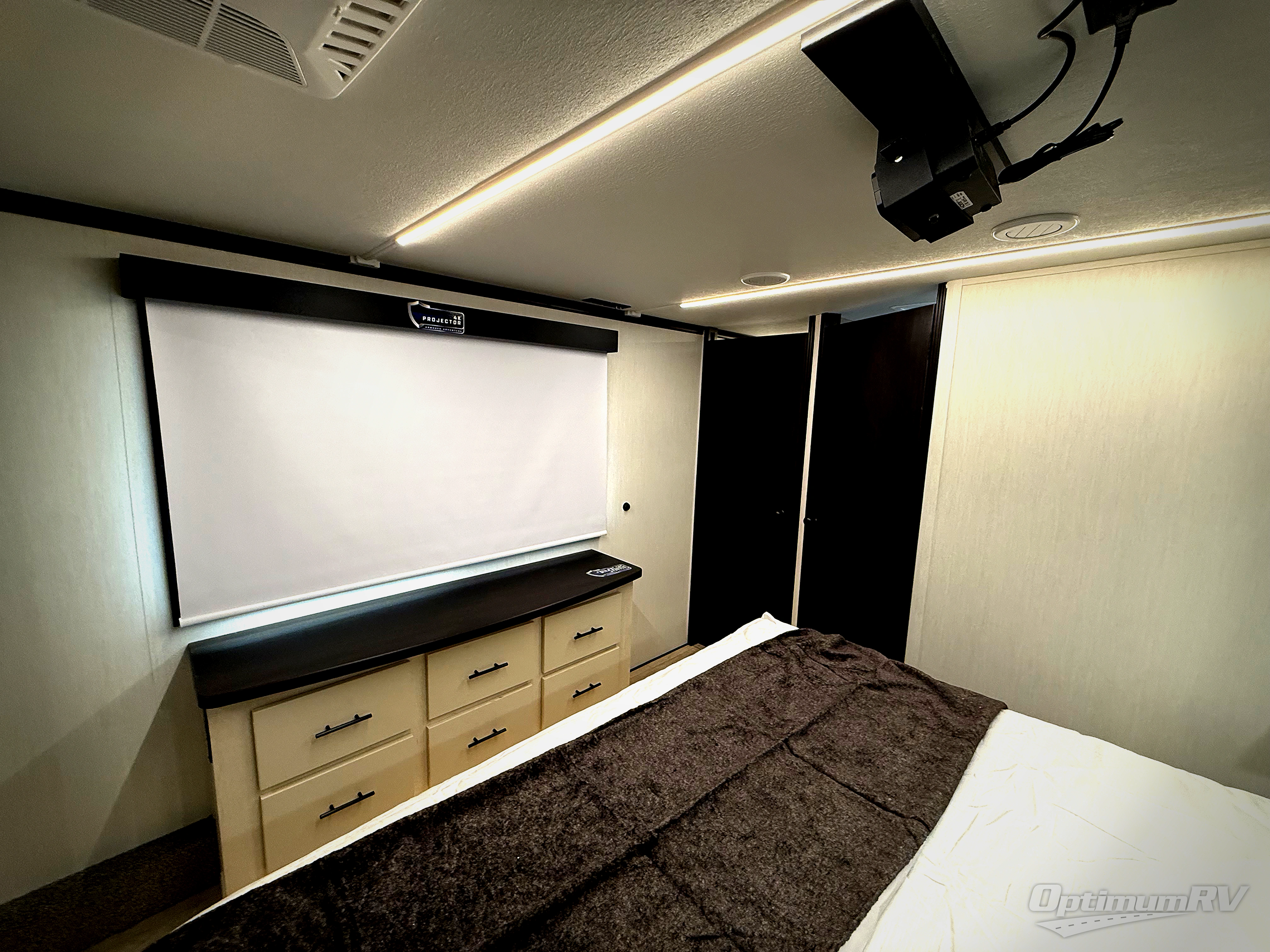 This toy hauler is perfect for a larger group since it can sleep up to eight with the added loft in the garage. There are also dual flip-up sofas here, along with a queen bed above and a half bath for added convenience! The dual entry full bath is up front, creating a master bedroom you are sure to love. There is a king bed slide out, a front wardrobe, and a dresser to keep your things organized. Head to the middle kitchen and living room to relax on the sofa within the large slide out, dine at the table with four chairs, and cook in the full kitchen. This unit also includes a fireplace to make it cozier, a large pantry to keep snacks stocked, and dual power awnings to expand your living space outdoors!