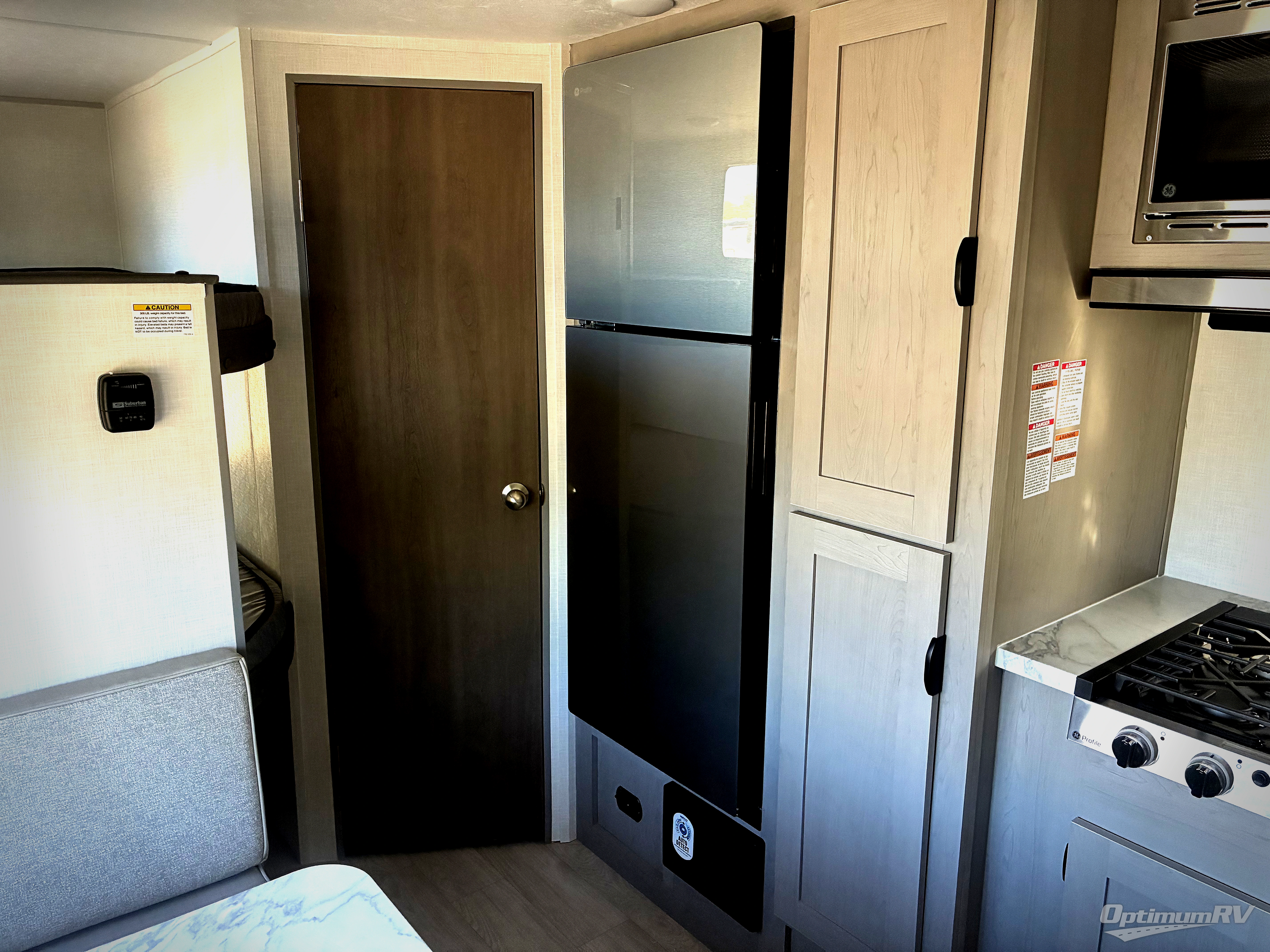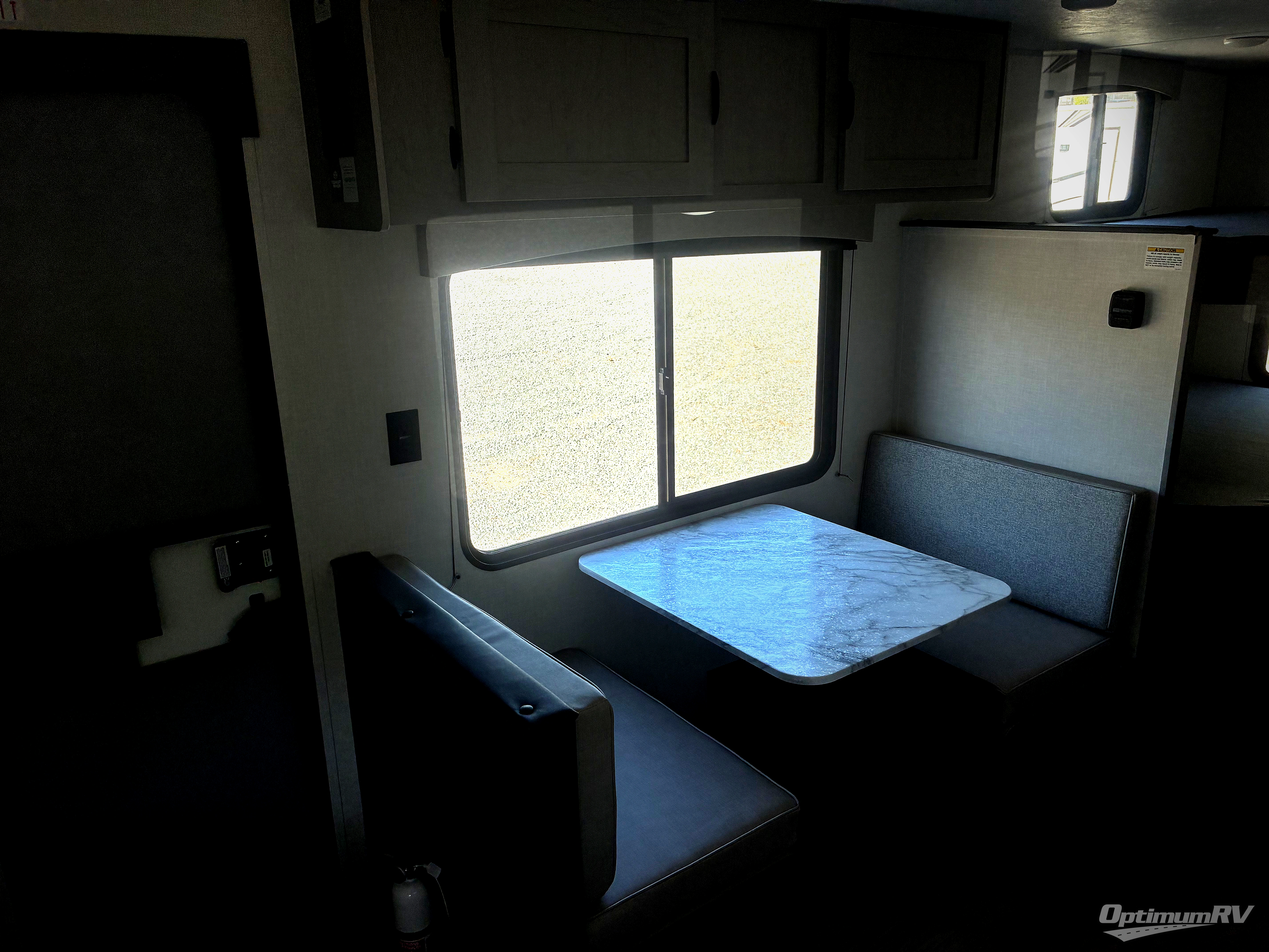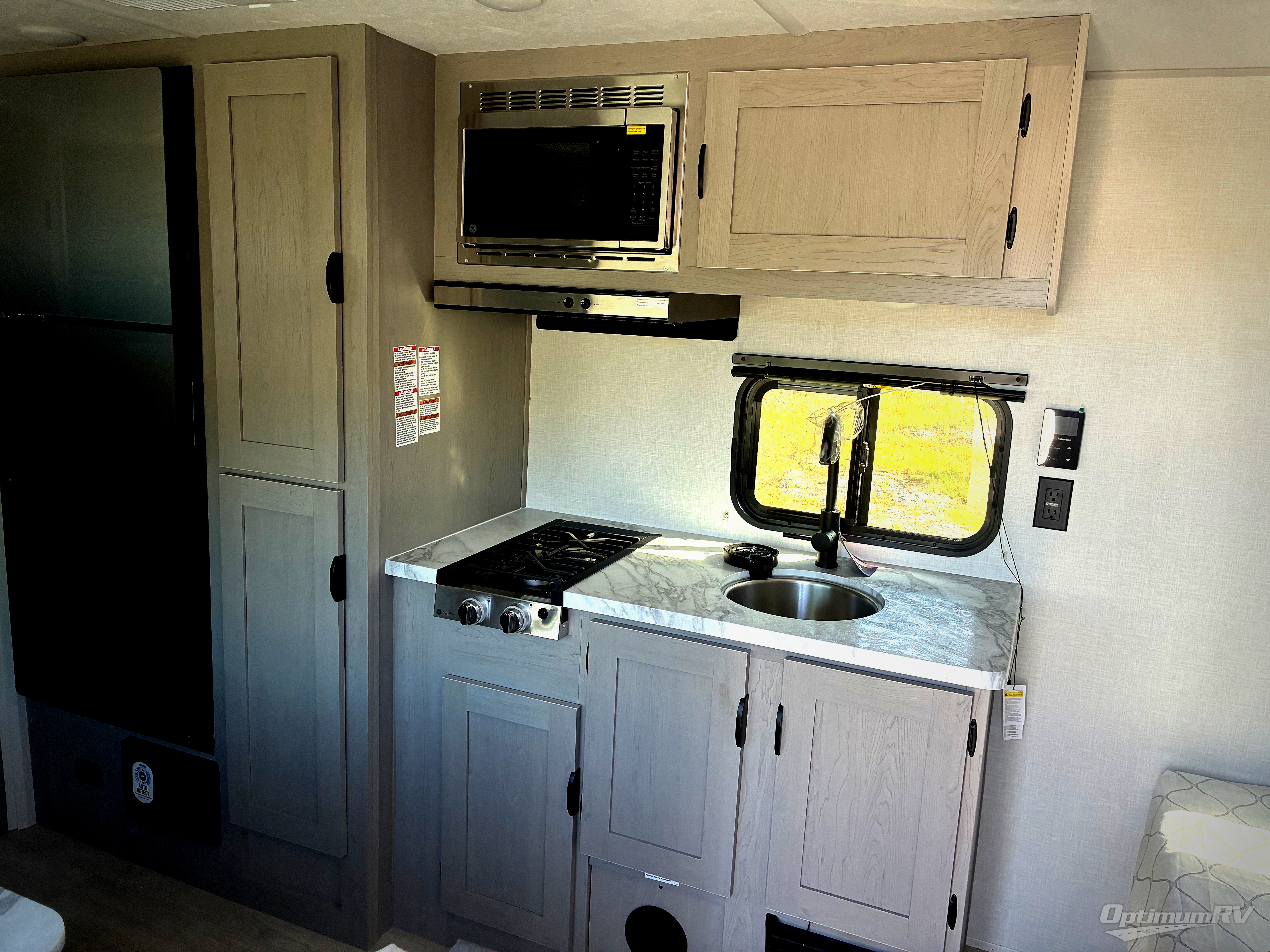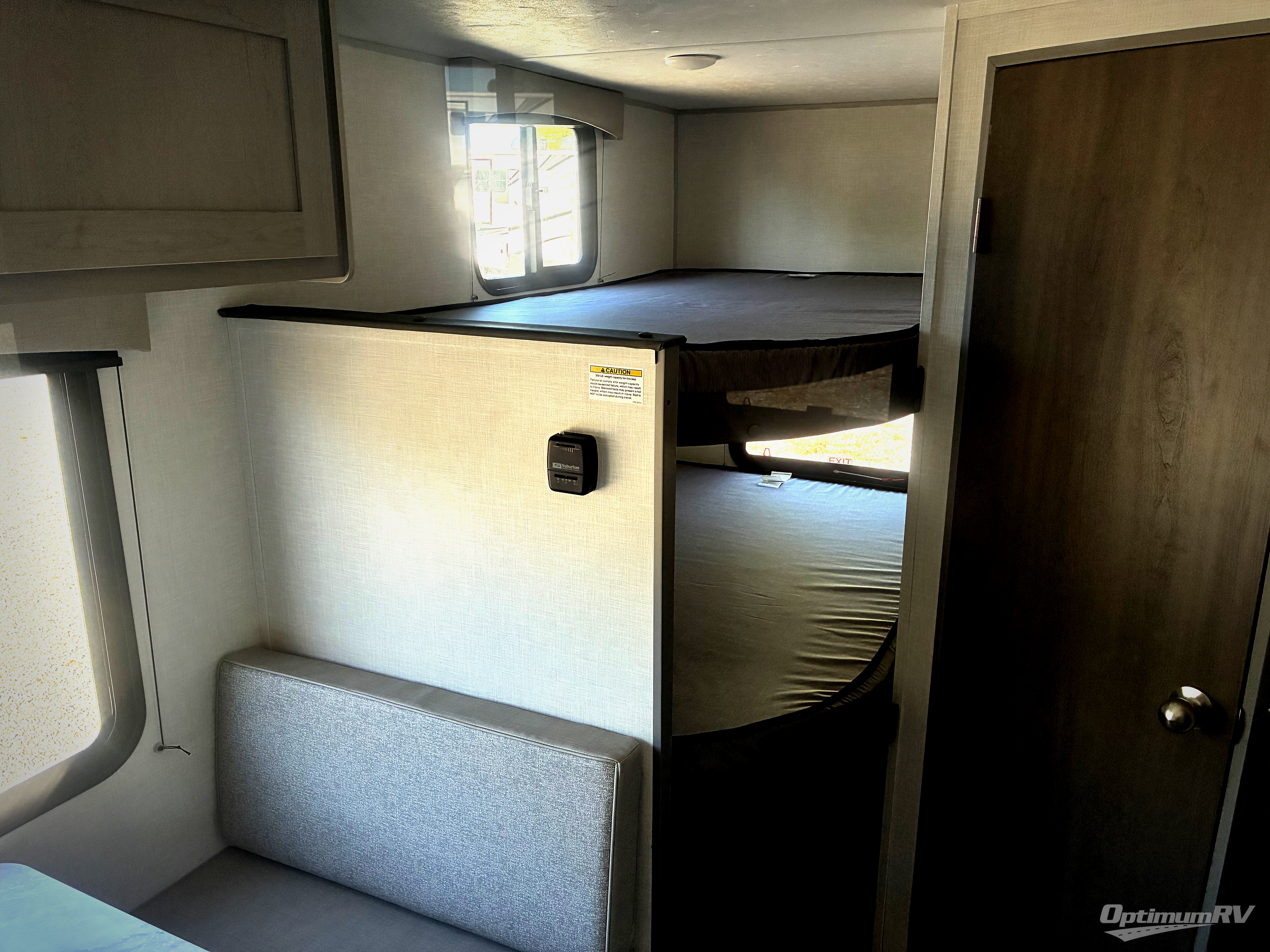 This travel trailer is perfect for a small family who wants to escape the hustle and bustle of everyday life! The front 60" x 74" bed offers a comfortable place to lay your head at night, and there is a wardrobe and overhead shelf to store your items. Prepare a delicious home cooked meal with the two burner cooktop, 10 cu. ft. refrigerator and a sink with cup rinser. You can dine at the booth dinette with overhead cabinets for more storage space. The kiddos can sleep on the set of 42" x 72" bunk beds and will enjoy how easy it is to access the rear corner bathroom right next to them!