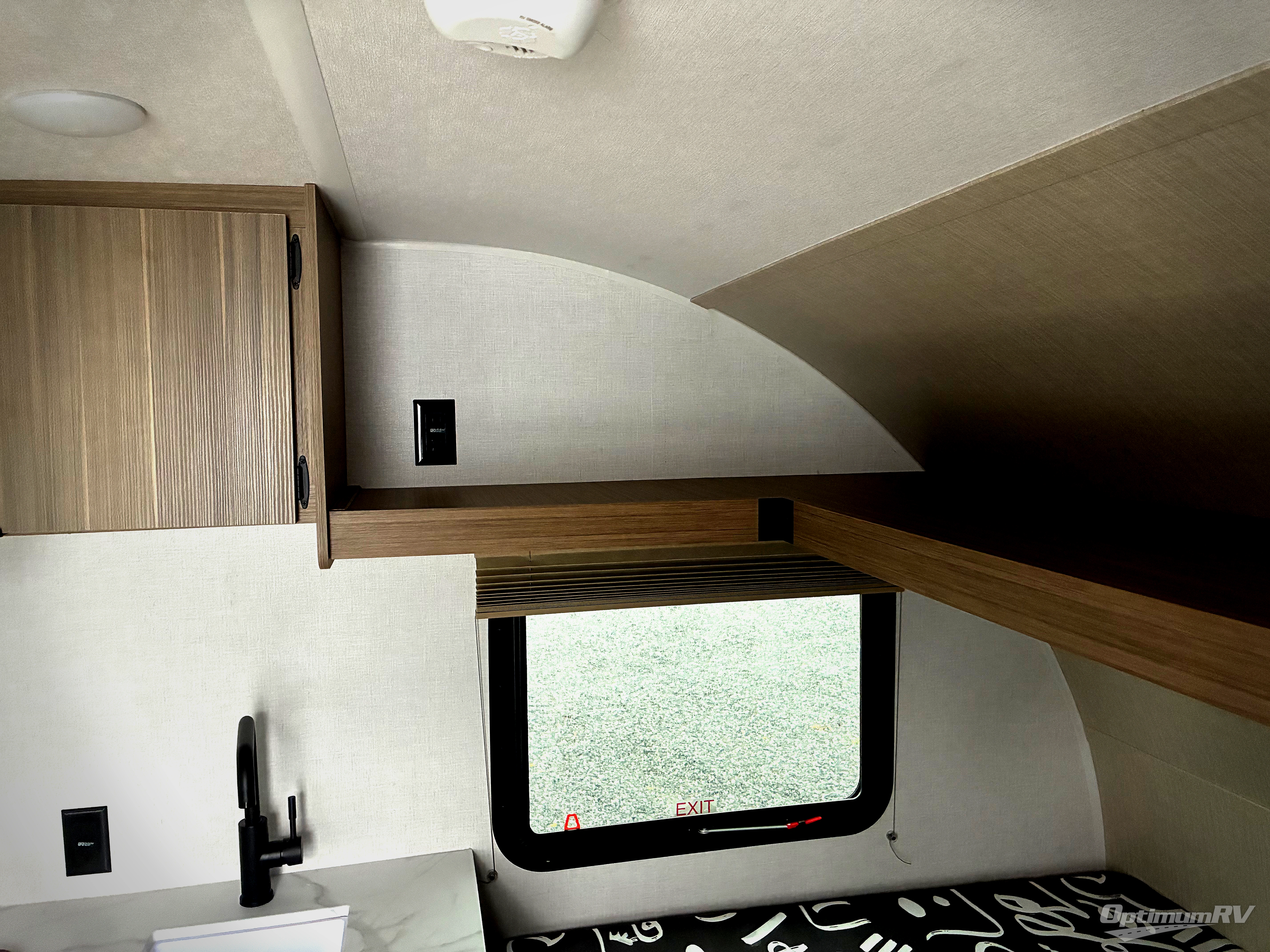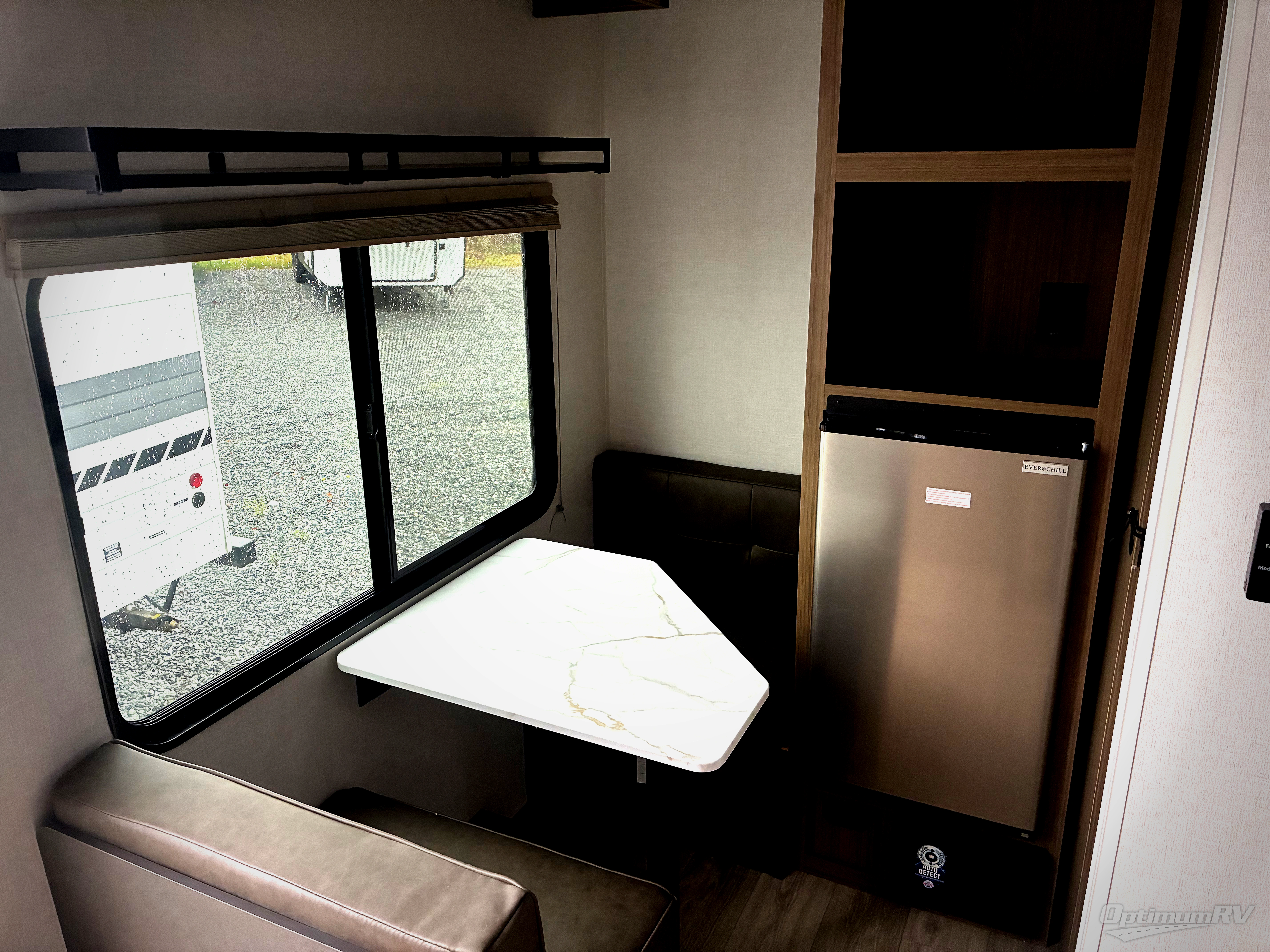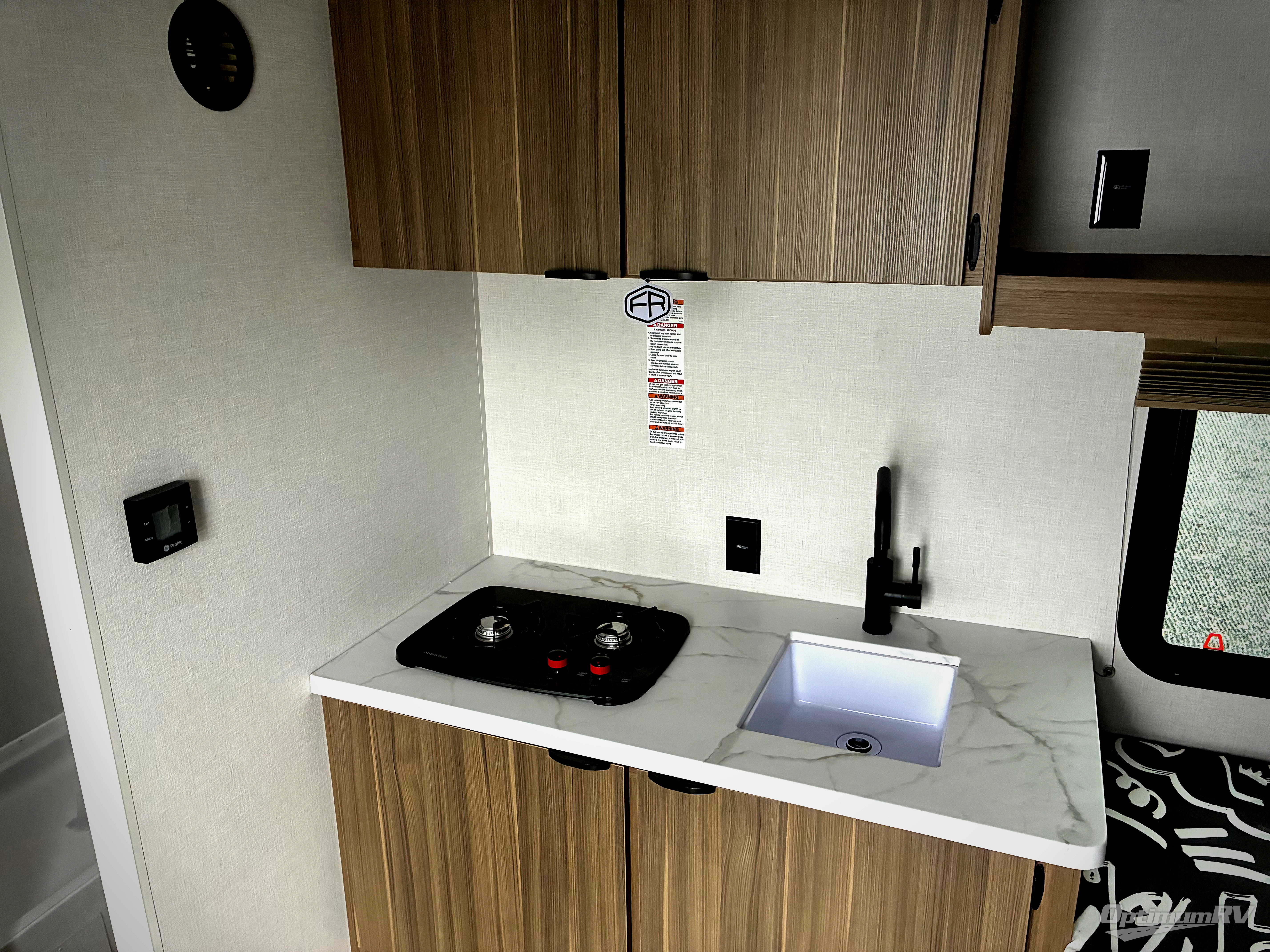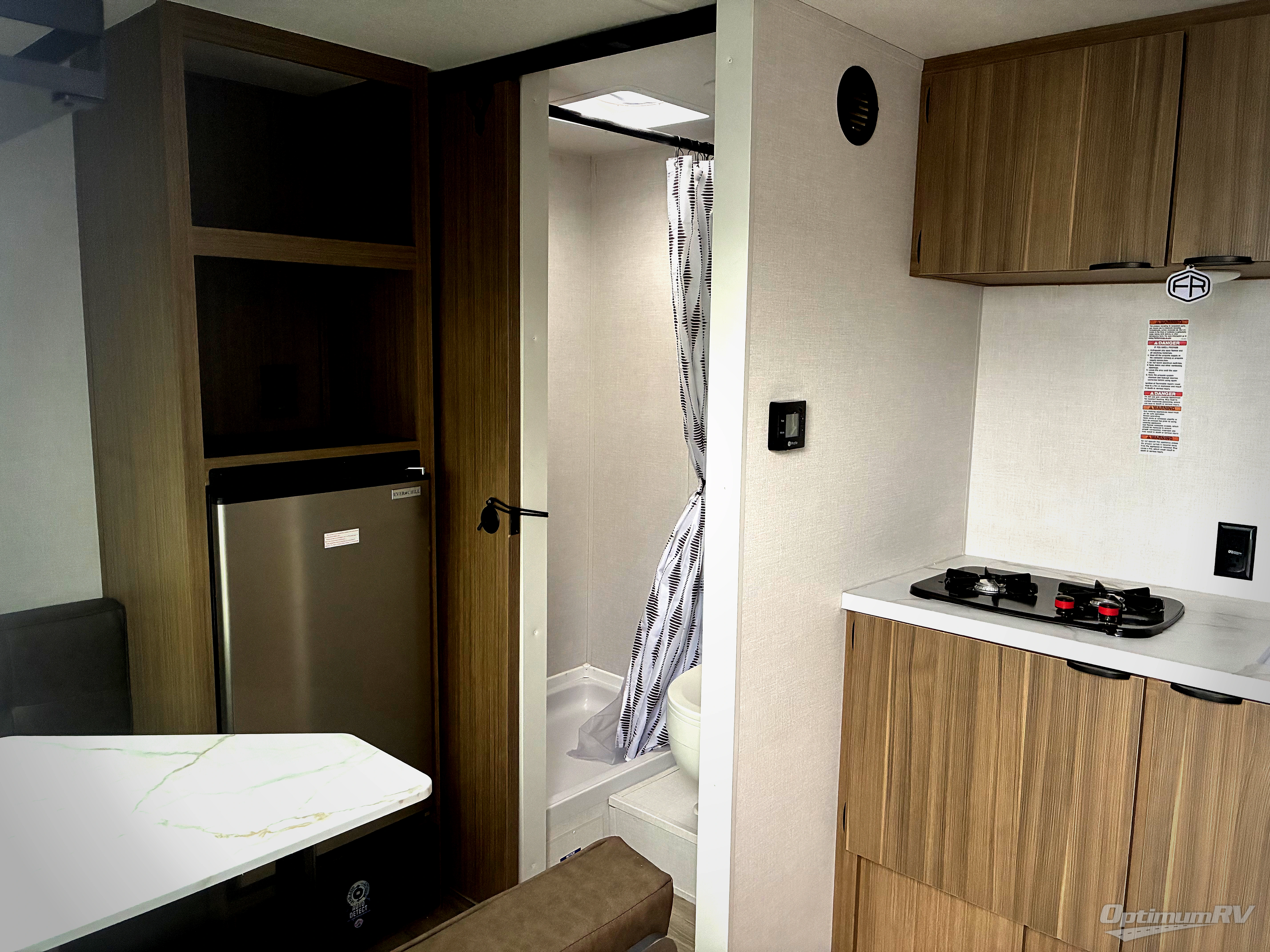 This lightweight travel trailer has everything you need to enjoy camping trips! There is a front east to west custom king bed with storage at the foot of the bed and overhead for your valuables. A private bath includes a toilet and walk-in shower so you can easily get ready each day, and you can prepare your meals on the two-burner cooktop when you get hungry. The booth dinette will provide dining space, along with sleeping space for one to two little ones. Don't let this trailer get away!