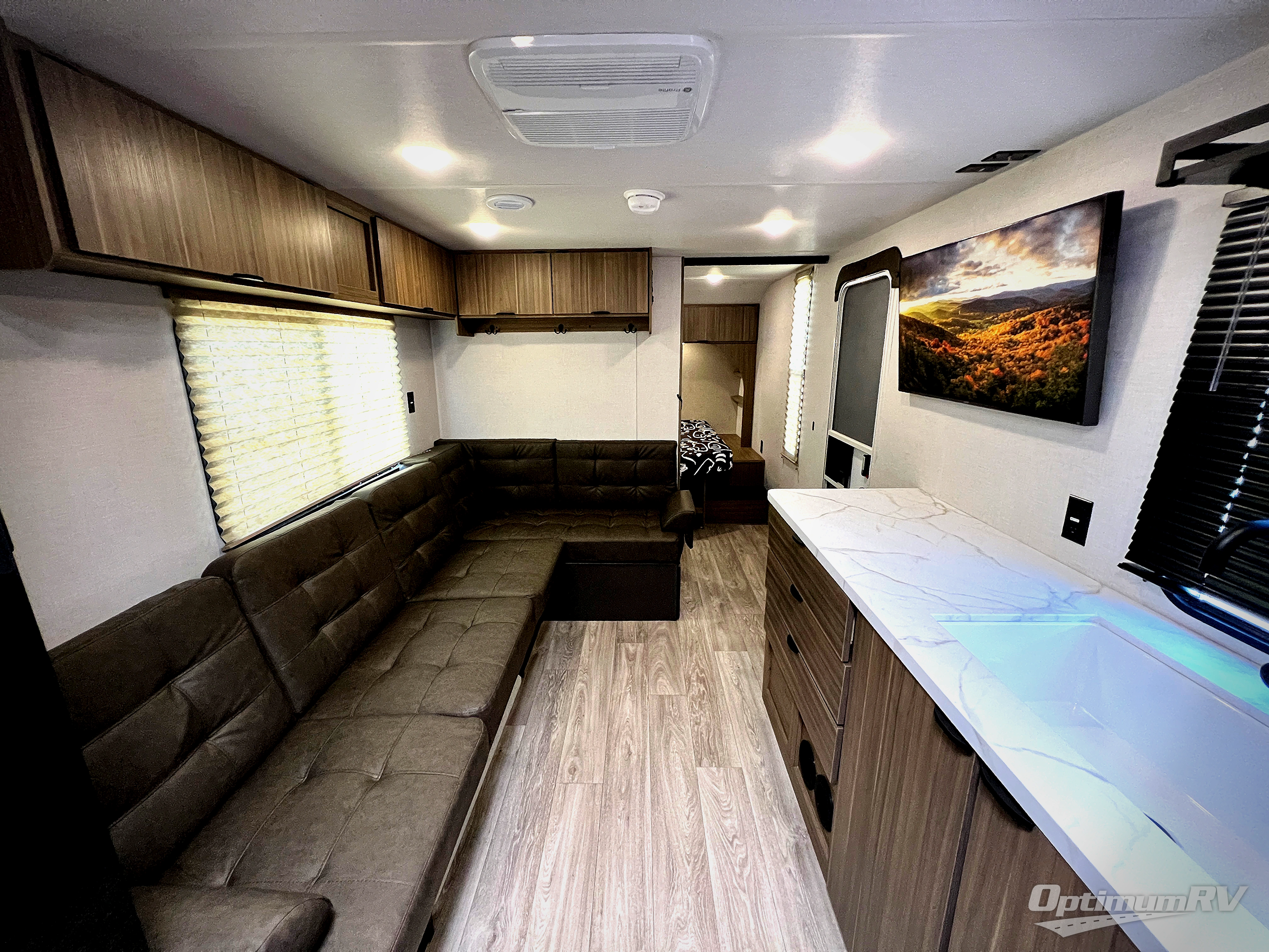 Camping is made easy in this travel trailer with a front private bedroom and a full rear bath with dual bath sink! There are dual bedroom wardrobes to keep your space neat and clean along with a king bed for more space to stretch out. Everyone can meet in the combined kitchen and living room to relax on the super U-lounge with a removable table while the chef of your group makes breakfast on the two-burner cooktop. There is also a microwave oven for quick meals, plus a pantry and large under counter refrigerator for food storage!