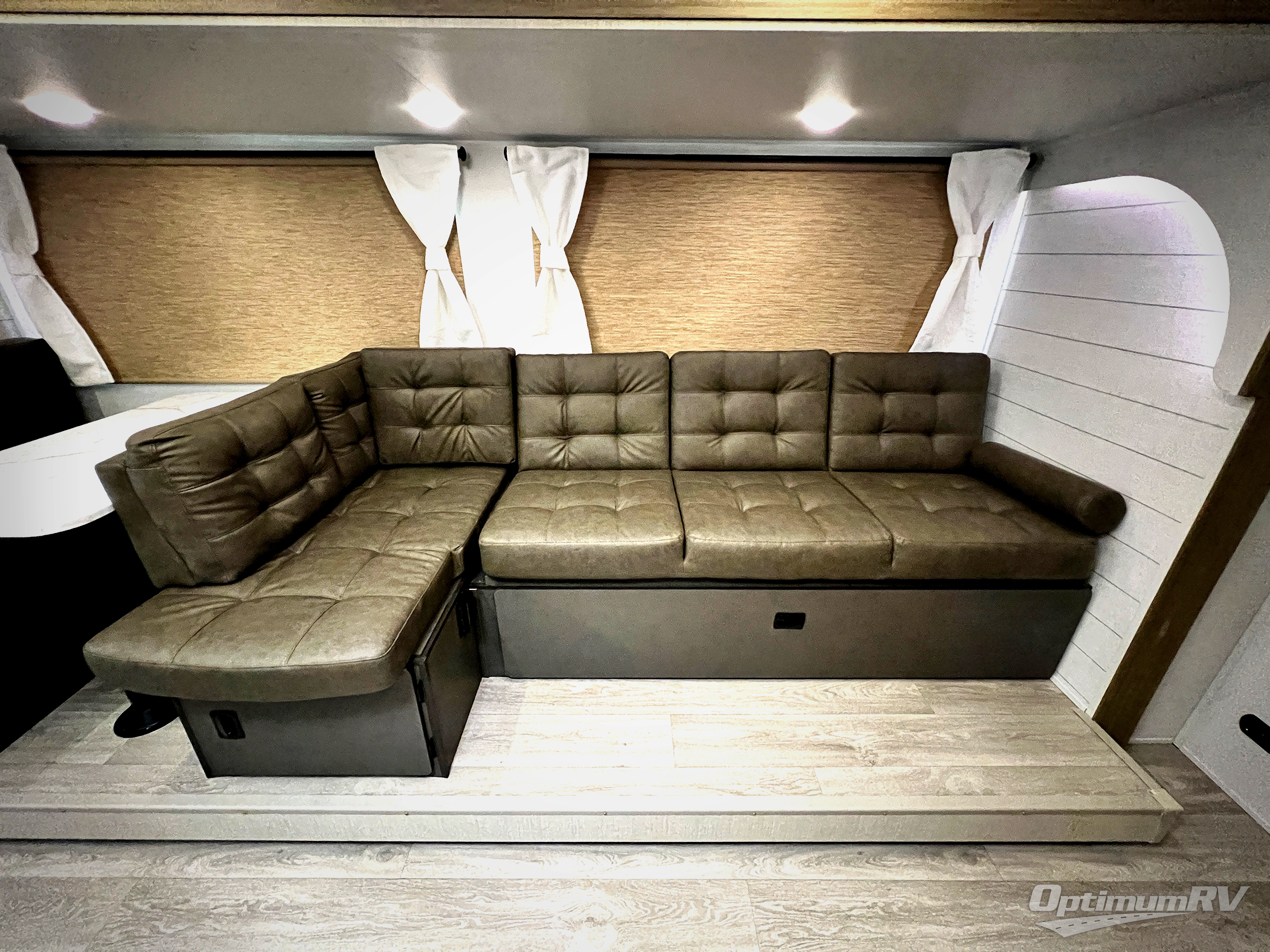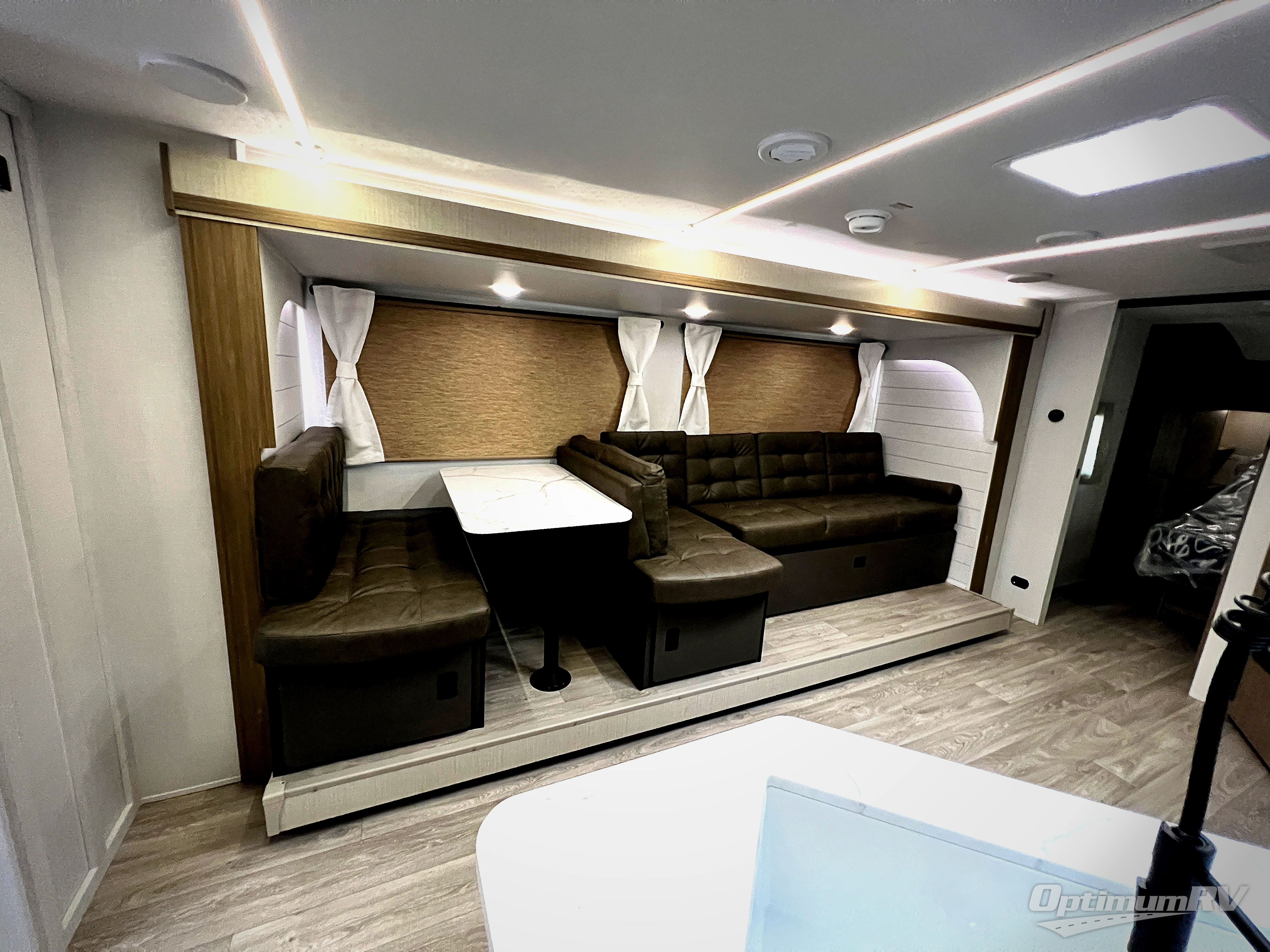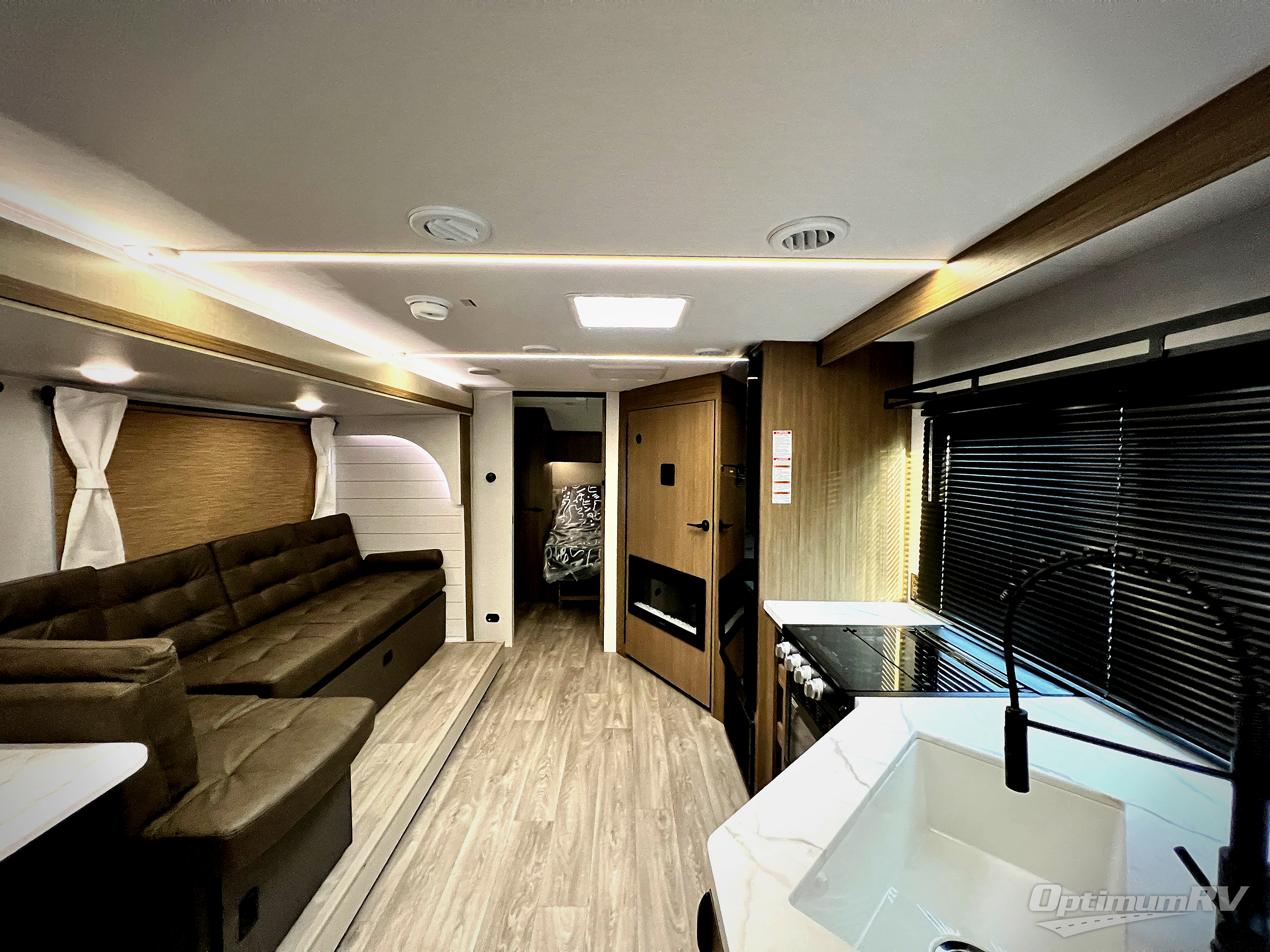 You're sure to make camping memories in this spacious travel trailer! You can easily sleep eight people each night thanks to the double-size bunks, the custom king bed with Versa Tilt in the front bedroom plus the Versa-Lounge within the large slide out! The full kitchen will let you make meals each day, and you'll appreciate the hidden pantry with shelves behind the fireplace. There is also a booth dinette where you can dine together or play a game of cards after dinner is cleaned up, or you may just find yourselves outdoors under the 16' awning. And don't overlook the private bath with a shower and toilet, and the sink just outside the room, allowing to people to freshen up at once!