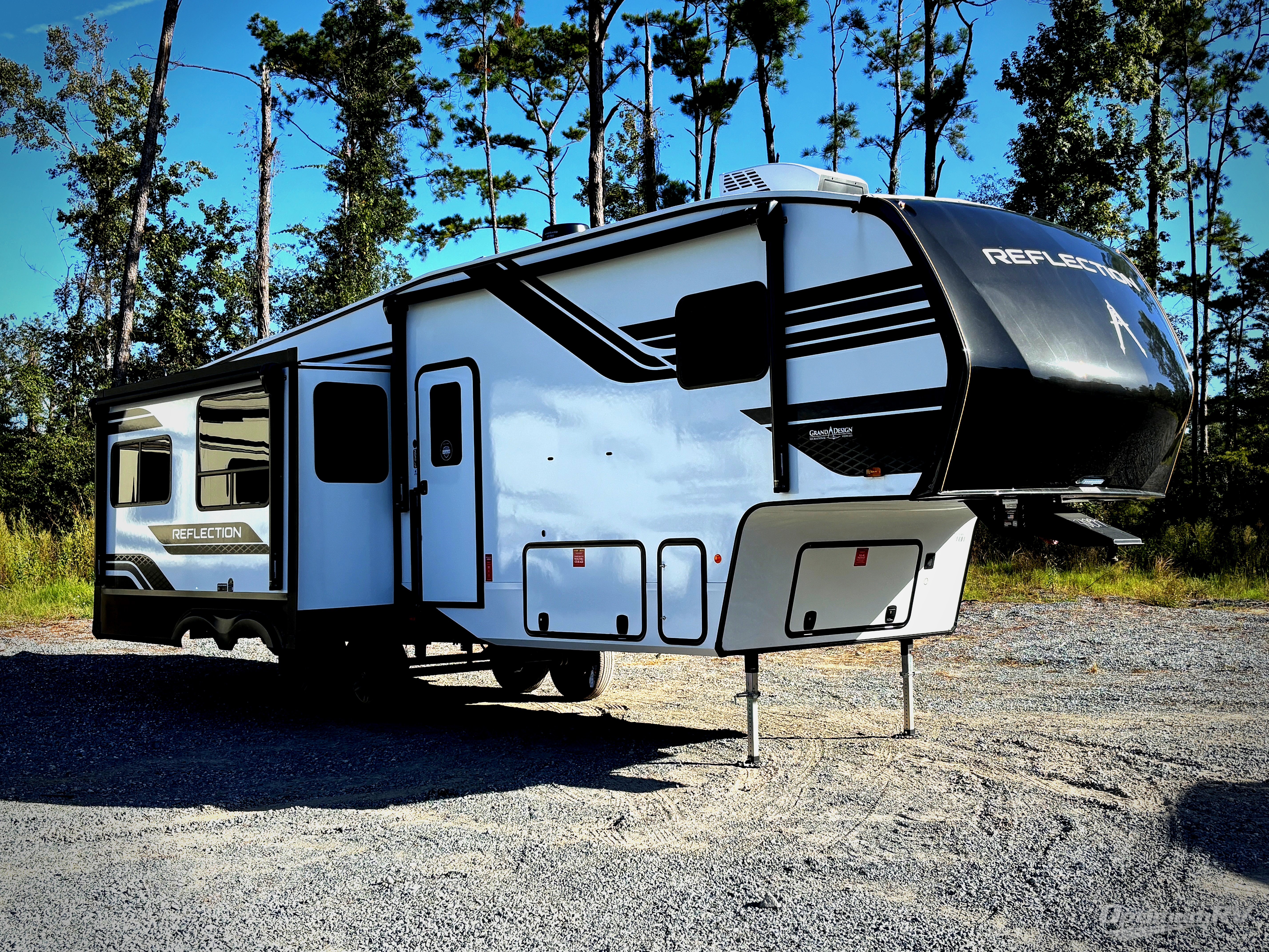 With any Reflection fifth wheel by Grand Design, you will have a solar panel for off-grid camping and a 60 amp charge controller and inverter prep, a Universal All-In-One docking station, unobstructed pass-through storage, and Goodyear Endurance tires. Each is constructed of gel coat exterior sidewalls, residential 5" truss rafters, walk-on roof decking, a fiberglass and radiant foil roof and front cap insulation plus laminated aluminum framed side walls, roof and end walls in slide rooms. Head inside to enjoy residential hardwood cabinet doors, premium Congoleum flooring, a spacious shower with a glass door, and many more comforts!