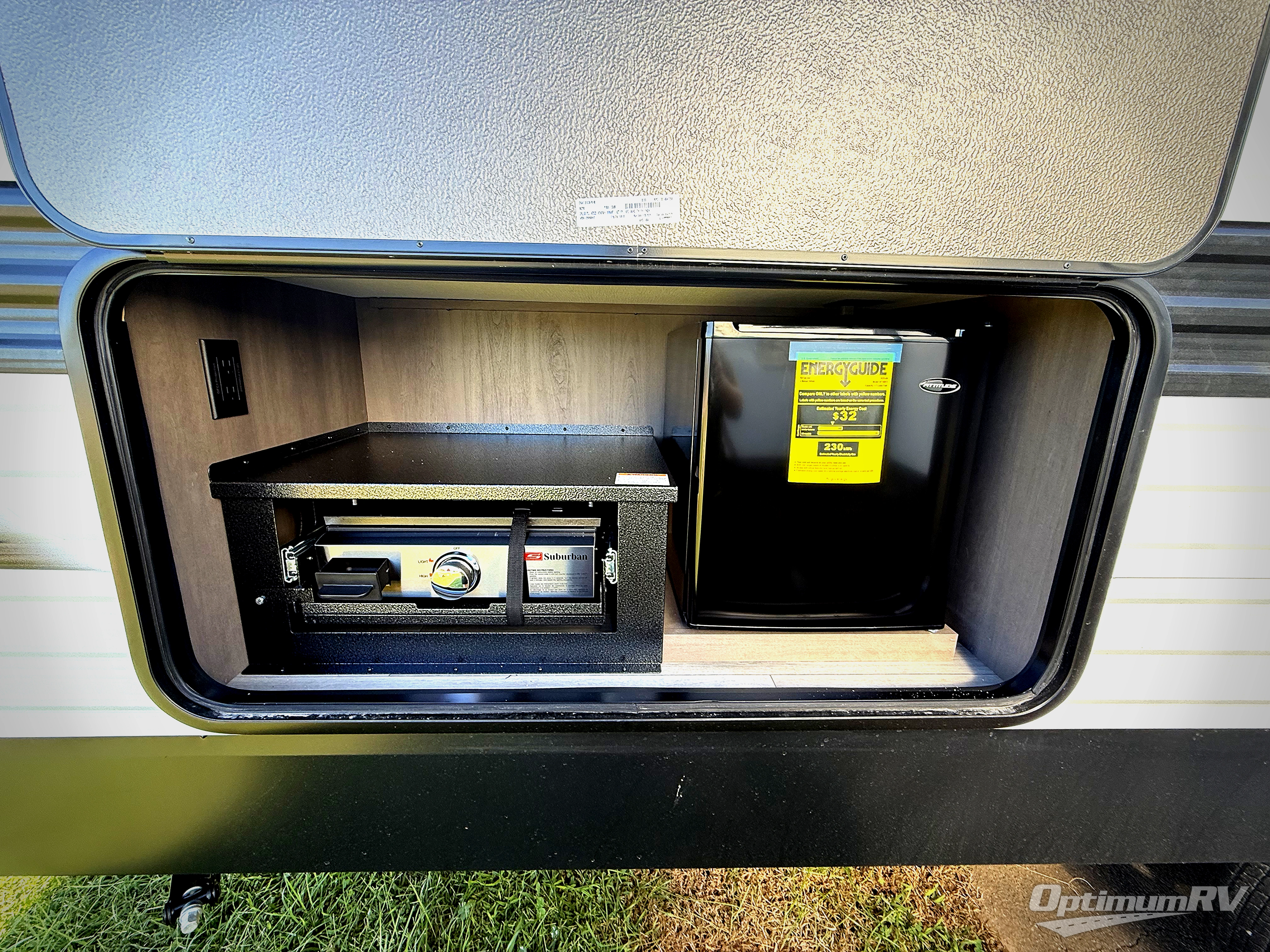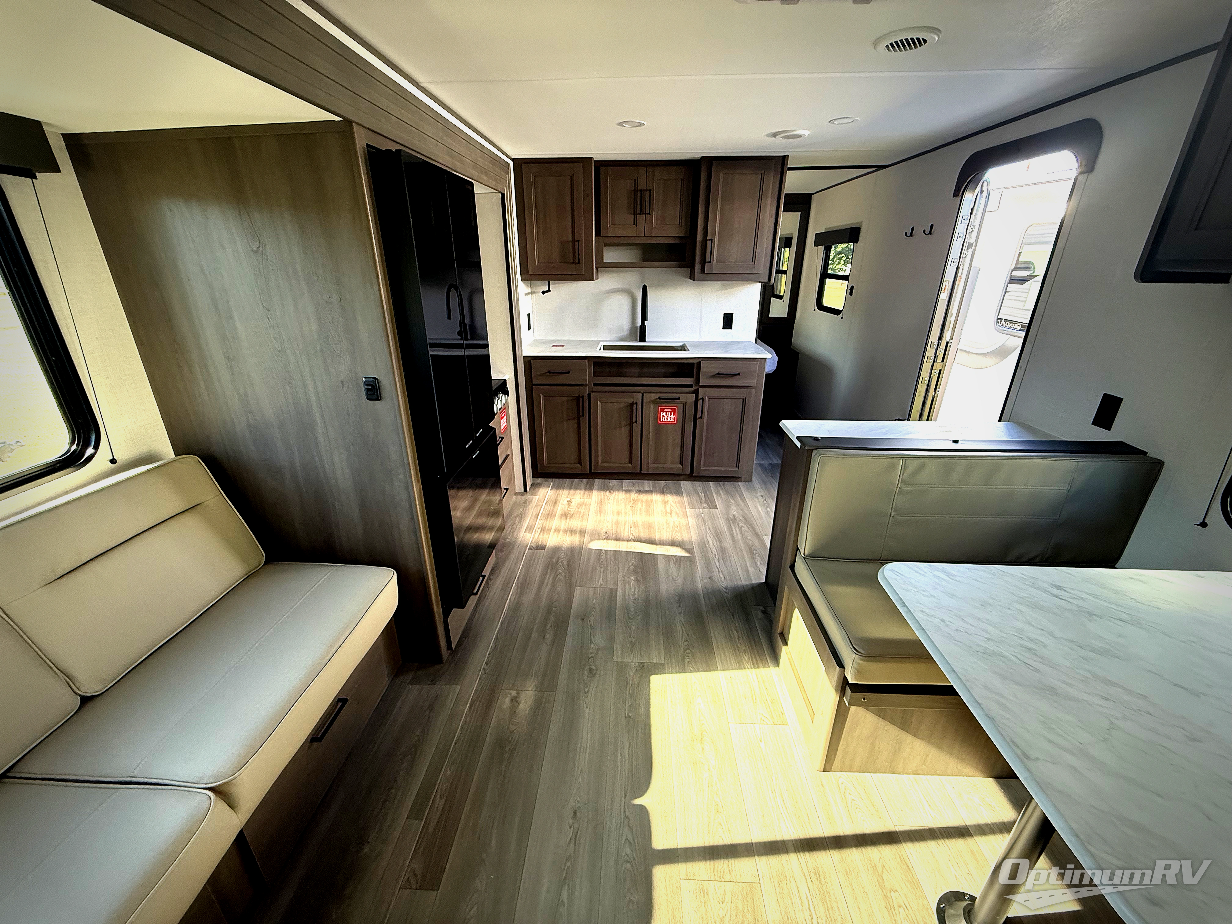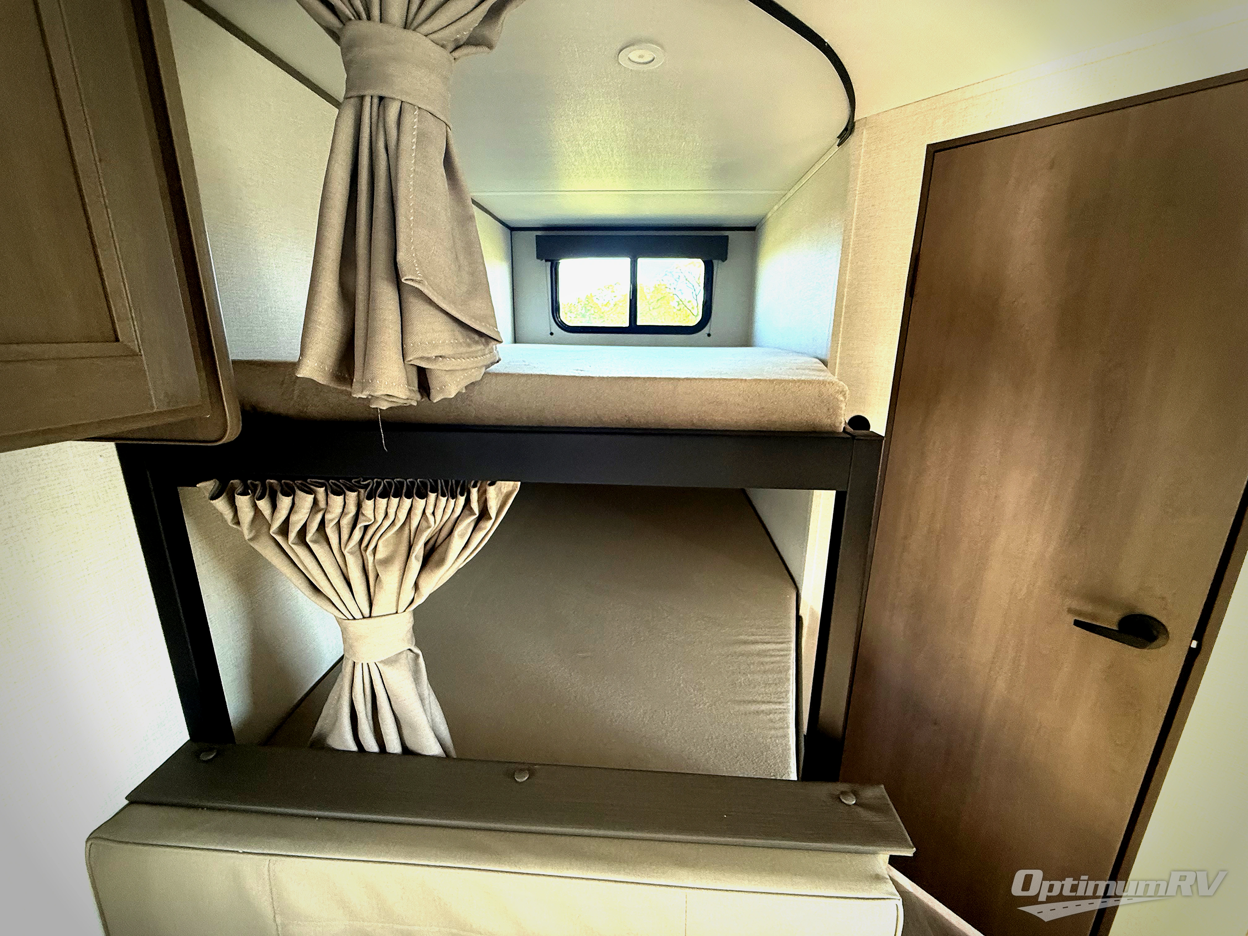 Camping with your larger family or when you want to take along a few extra friends is easy with this trailer. This unit sleeps nine with the double-size bunks in the rear corner, the 60" roll over sofa, and the queen bed in the front semi-private bedroom. The booth dinette can also be used to sleep a guest or two little ones at night once converted. Prepare your meals on the three-burner cooktop indoors, or out on the two-burner cooktop at the outside kitchen! You'll also find a handy exterior spray port and an outdoor refrigerator for cold drinks! It will be so easy to fill the dog's food bowl with the added pet dish under the refrigerator, and the full bath in this model means you don't have to use the camp's facilities. Having a 17' awning outside along with a large unobstructed pass-through compartment allows you extended living outdoors and plenty of space for all of your gear!