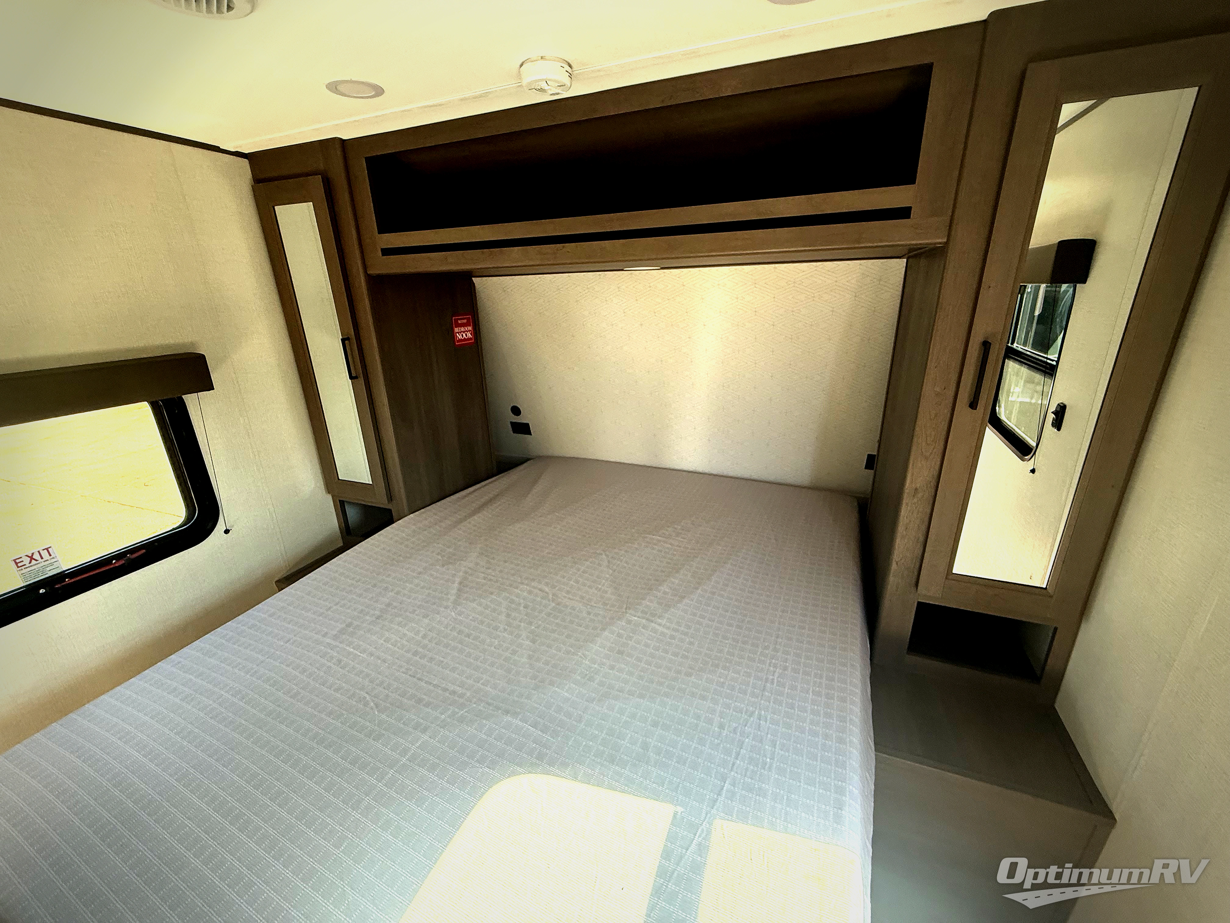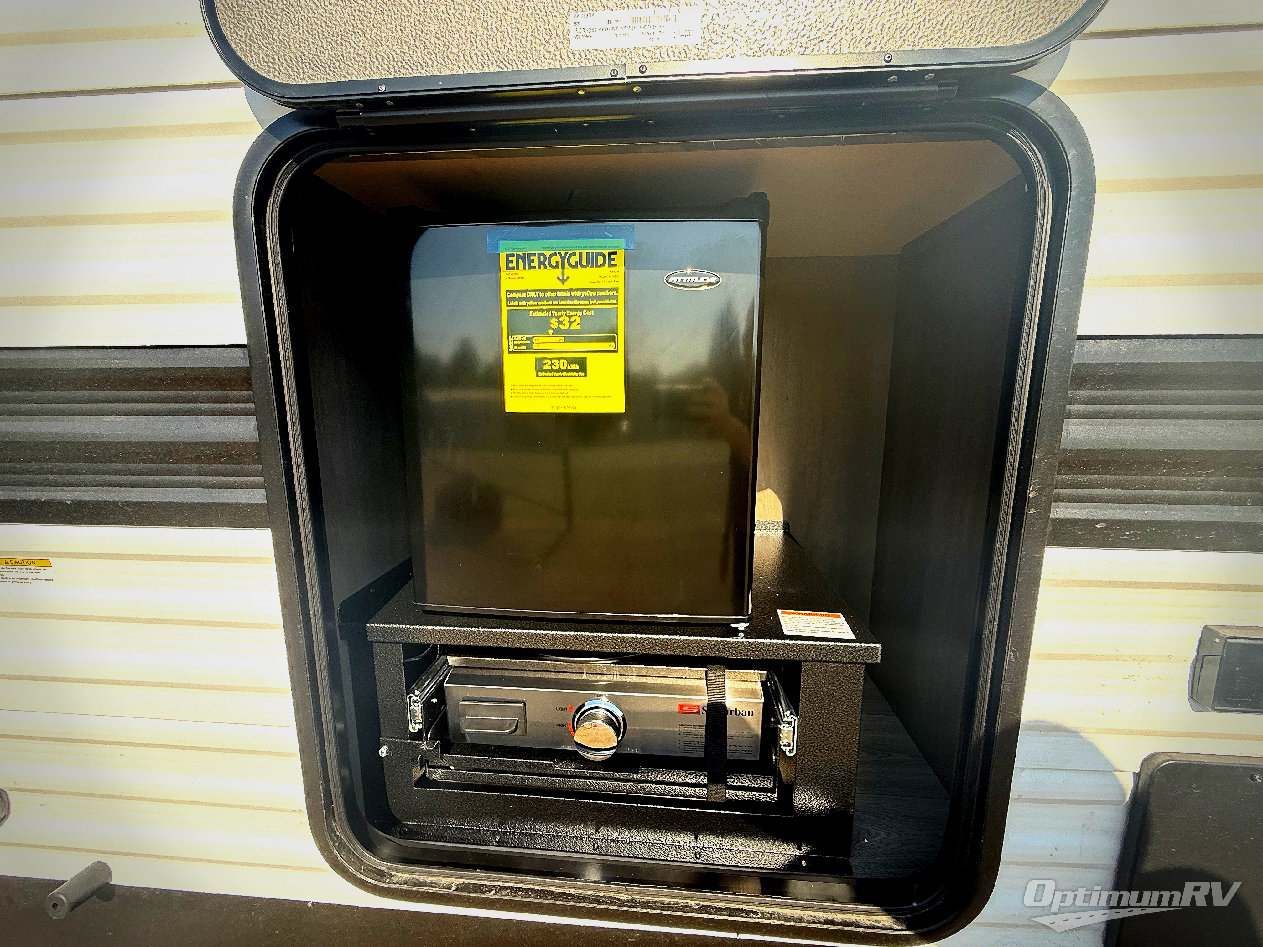 Get ready to take your travels to new heights with our incredible luxury travel trailer! The front bedroom has a queen bed, wardrobe, and overhead cabinets for all your favorite belongings, the perfect place to relax and recharge after a long day of adventure. The living room/kitchen combined area is equipped with a U-shaped dinette, three-burner cooktop, microwave, refrigerator, pantry, and 62” theater seating. Perfect for cooking up your favorite meals, entertaining friends and family, or simply relaxing and enjoying the comforts of home. The full bathroom is spacious and complete with a linen closet for added convenience. And with double-sized bunk beds featuring curtains and under-bunk storage, the kids will have their cozy retreat. But the adventure doesn't stop there! Outside, you'll find an exterior griddle with a 1.7 refrigerator, perfect for cooking up a storm in the great outdoors. And with a massive 19’ awning, you'll have plenty of shade and protection from the elements, plus, with two entry/exit doors and pass-through storage, you'll have easy access to the trailer and all your gear.