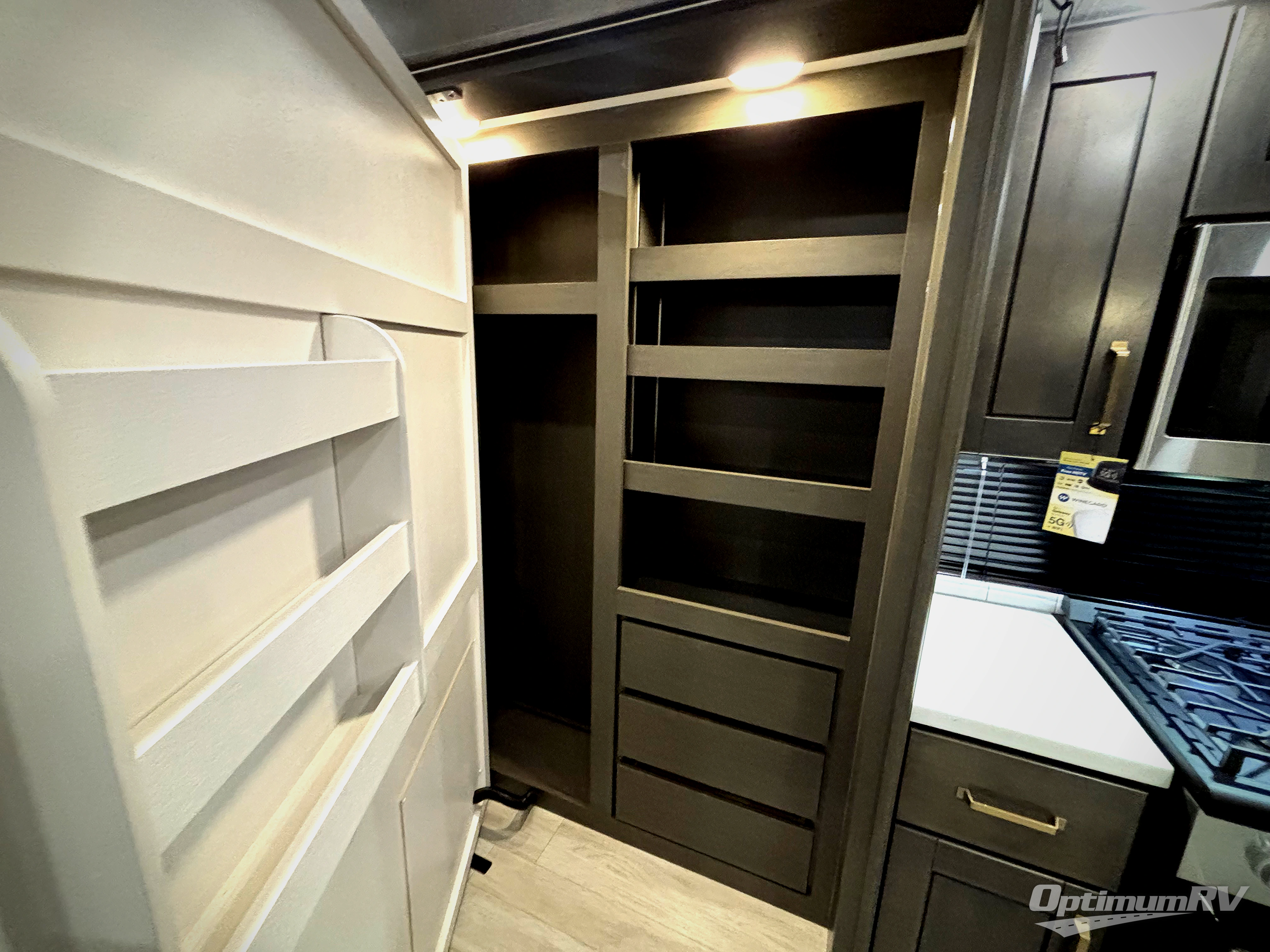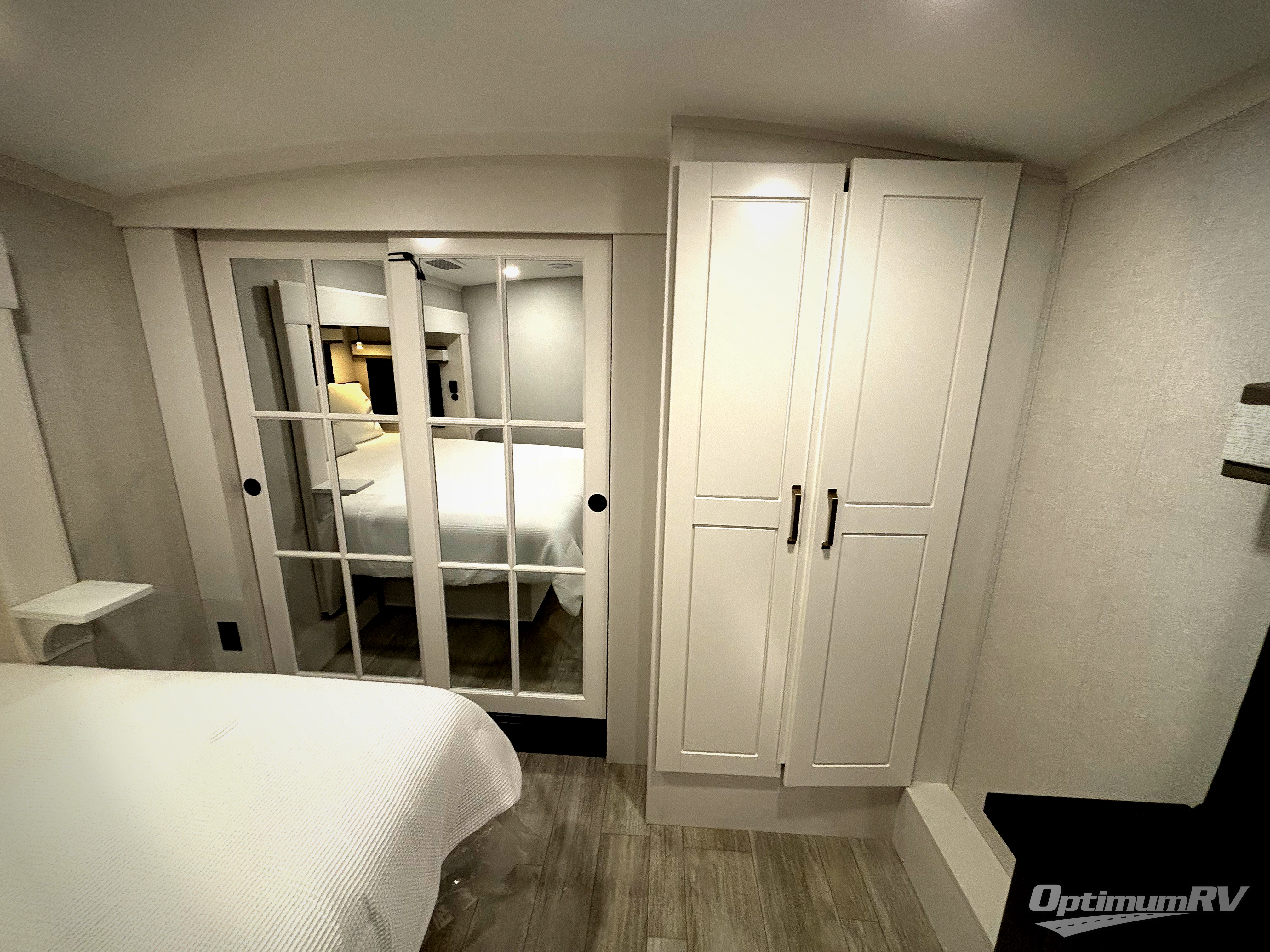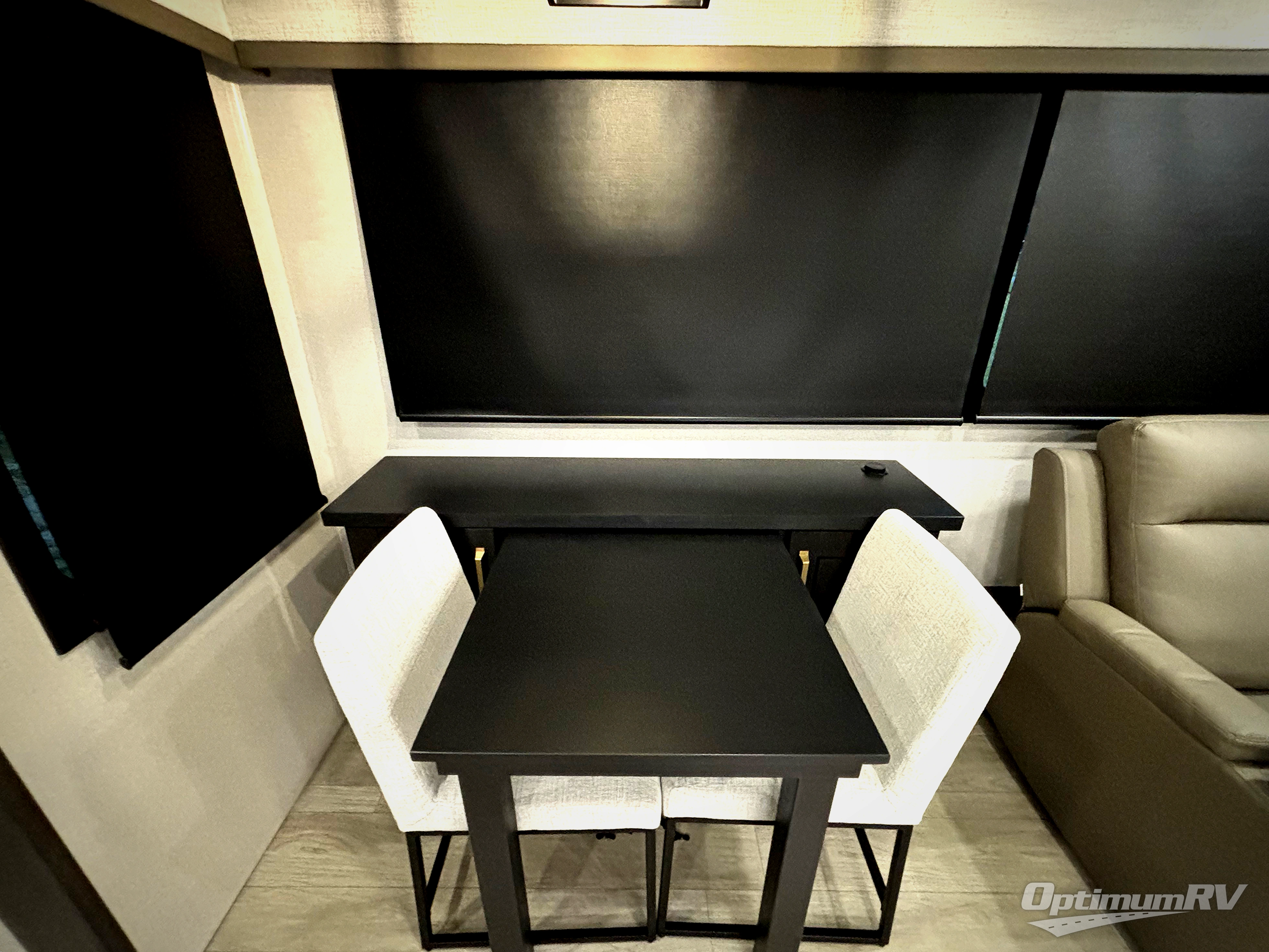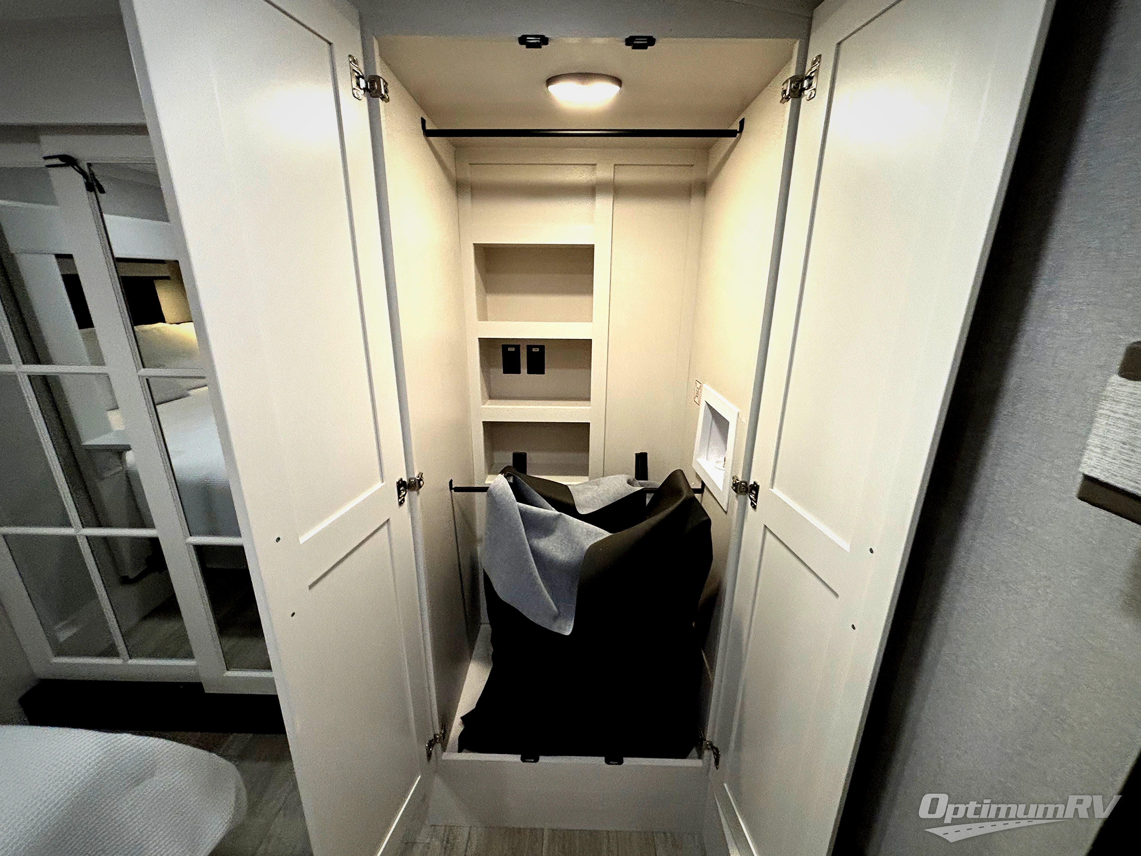 At the front of the unit, the private bedroom offers a retreat with a spacious 72" x 80" king bed, a wardrobe with drawers and a built-in hamper, and a dresser with a TV above, providing ample storage for clothing and essentials. Down the hall, the full bathroom features a 36" x 48" shower with a comfortable seat for added accessibility and relaxation. At the center of the unit, the versatile den serves perfectly as both an office and an additional sleeping area. It includes a 60" tri-fold sofa with a flip-up bunk above, a removable table for work or leisure, and across the room, a 60" x 74" Murphy bed complemented by a desk, shelves, and even a loft above, ideal for accommodating guests or creating a productive workspace on the road. Toward the rear, the open concept living area expands with dual opposing slides for a spacious and inviting atmosphere. One slide features the fully equipped kitchen with a hidden pantry, shelving for dry goods, a convection microwave with a built-in air fryer, a 21-cu. ft. refrigerator, and a 24" range. At the center, the kitchen island includes a sink and a pull-out cutting board, making meal prep both easy and enjoyable. Opposite the kitchen, you’ll find a theater seat and a roll-top dining table perfect for lounging or dining, while at the very back, a 78" sofa provides extra seating or converts into additional sleeping space when needed.