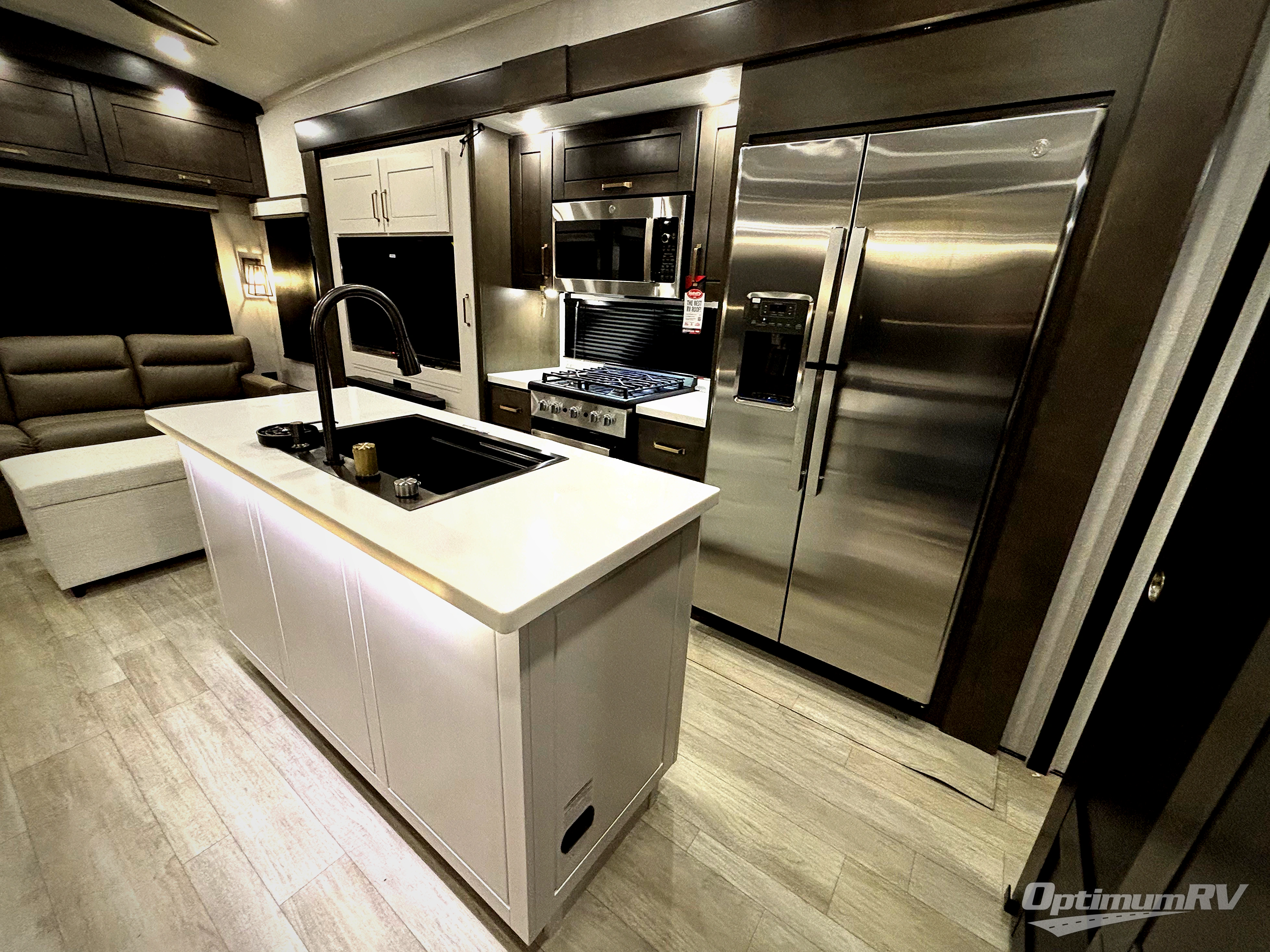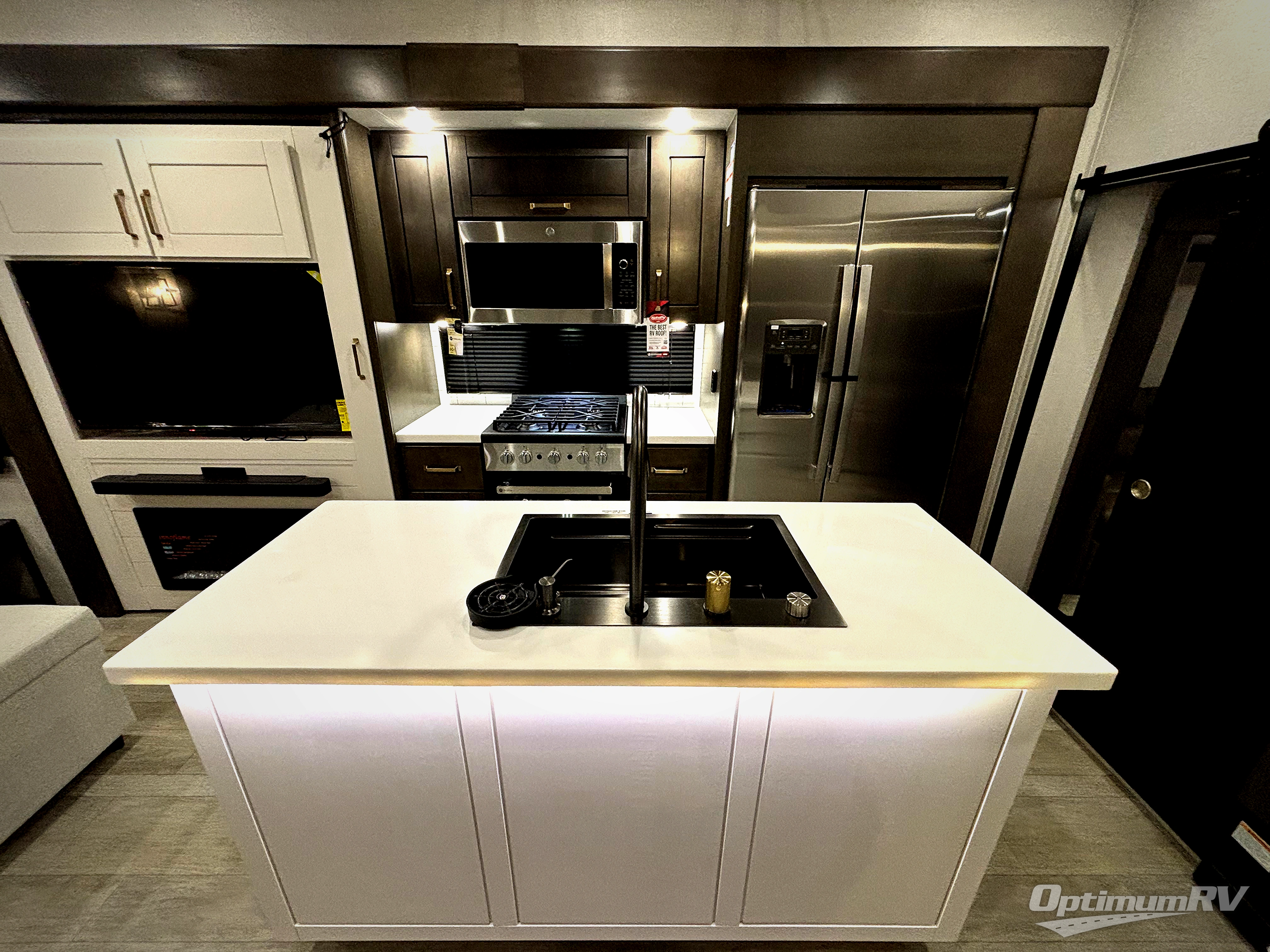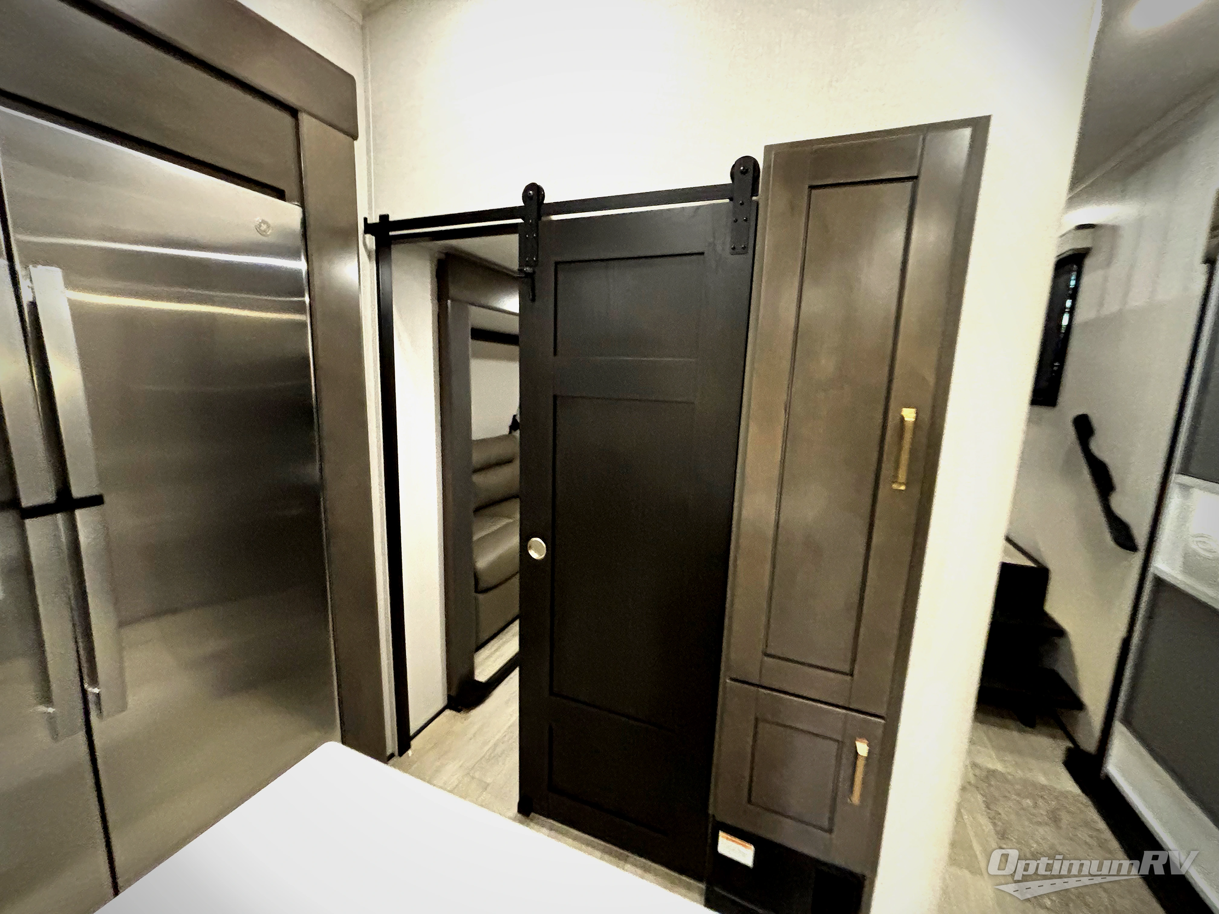 At the front of the unit, the private bedroom offers a retreat with a spacious 72" x 80" king bed, a wardrobe with drawers and a built-in hamper, and a dresser with a TV above, providing ample storage for clothing and essentials. Down the hall, the full bathroom features a 36" x 48" shower with a comfortable seat for added accessibility and relaxation. At the center of the unit, the versatile den serves perfectly as both an office and an additional sleeping area. It includes a 60" tri-fold sofa with a flip-up bunk above, a removable table for work or leisure, and across the room, a 60" x 74" Murphy bed complemented by a desk, shelves, and even a loft above, ideal for accommodating guests or creating a productive workspace on the road. Toward the rear, the open concept living area expands with dual opposing slides for a spacious and inviting atmosphere. One slide features the fully equipped kitchen with a hidden pantry, shelving for dry goods, a convection microwave with a built-in air fryer, a 21-cu. ft. refrigerator, and a 24" range. At the center, the kitchen island includes a sink and a pull-out cutting board, making meal prep both easy and enjoyable. Opposite the kitchen, you’ll find a theater seat and a roll-top dining table perfect for lounging or dining, while at the very back, a 78" sofa provides extra seating or converts into additional sleeping space when needed.