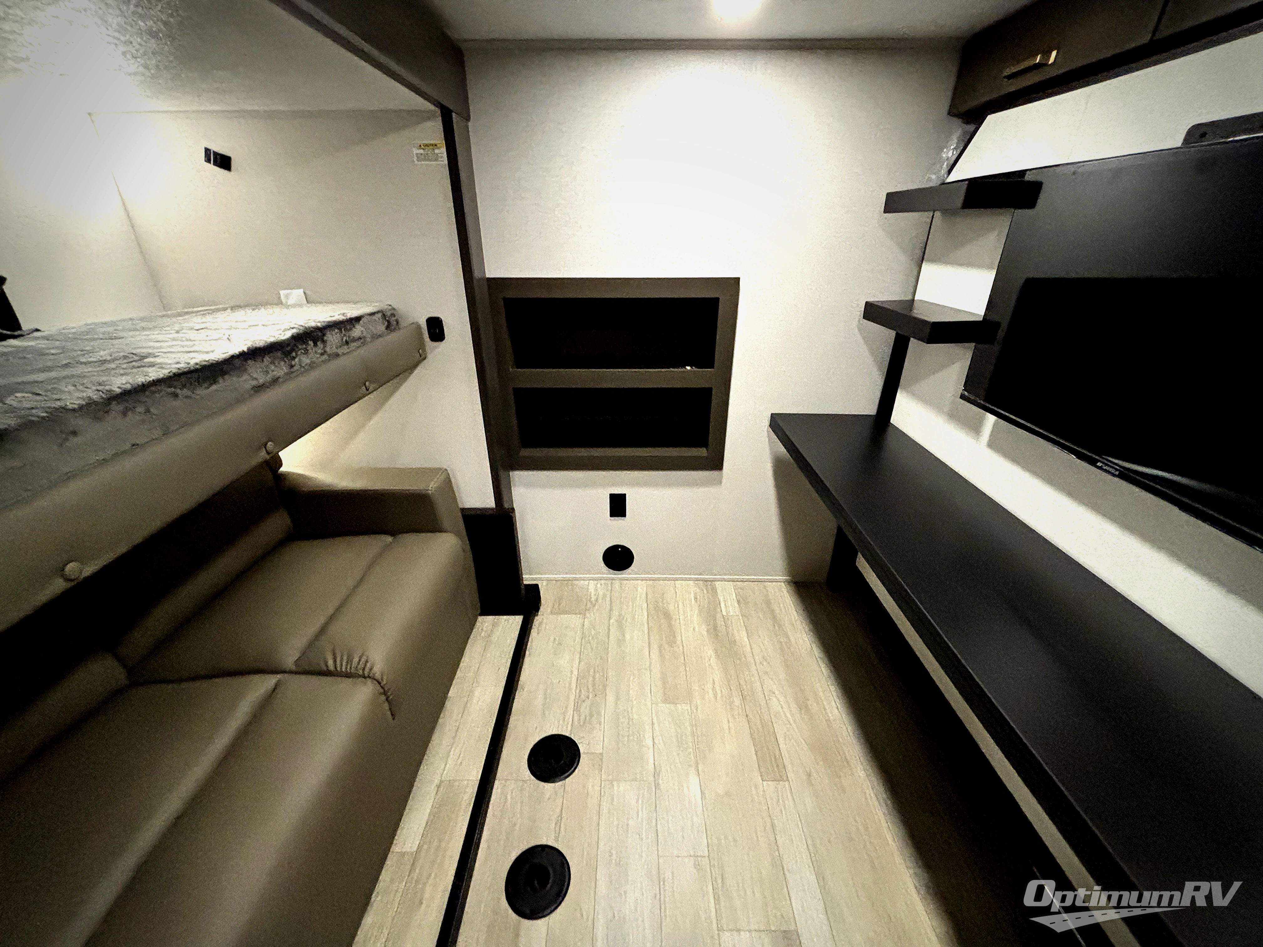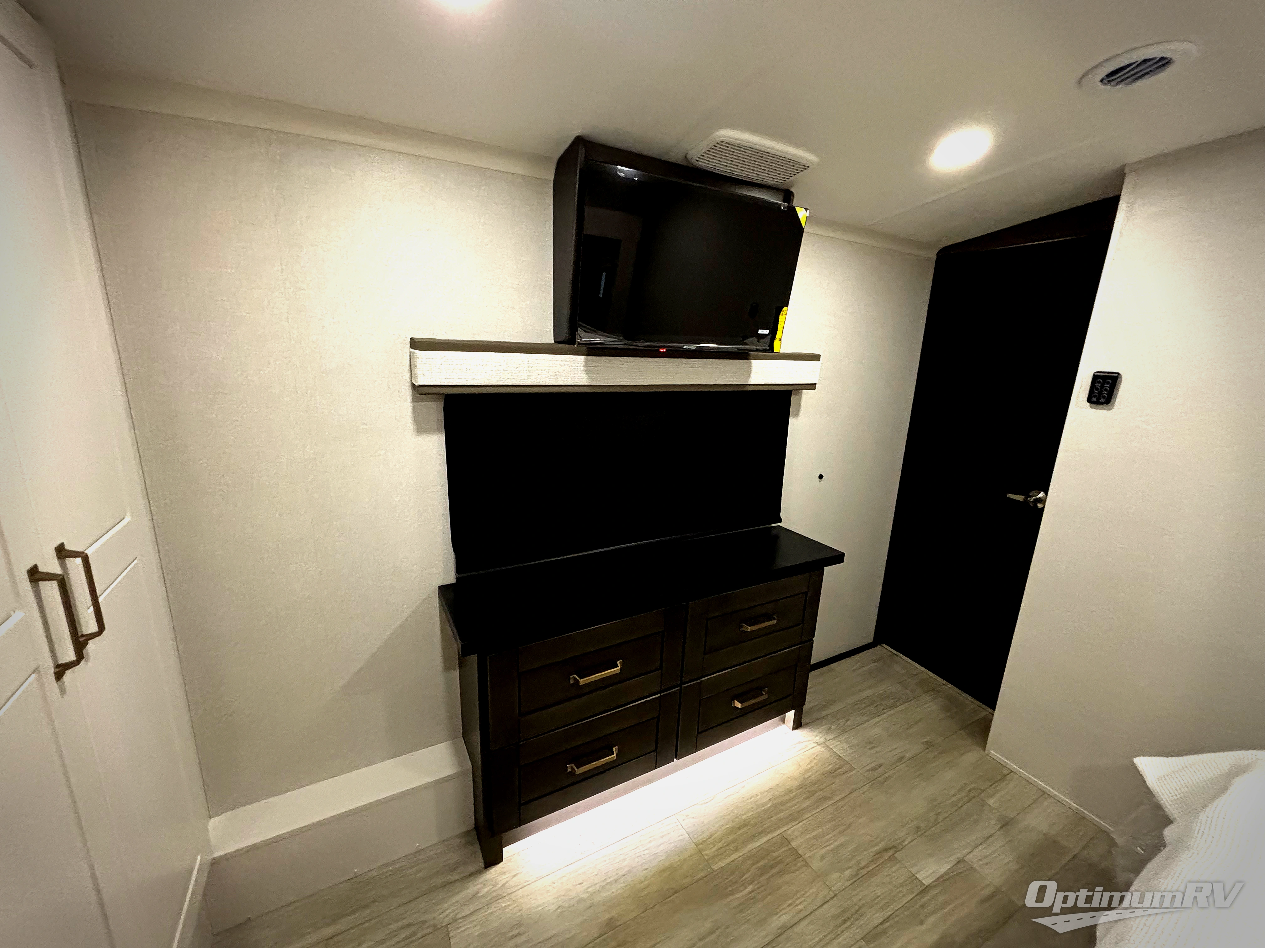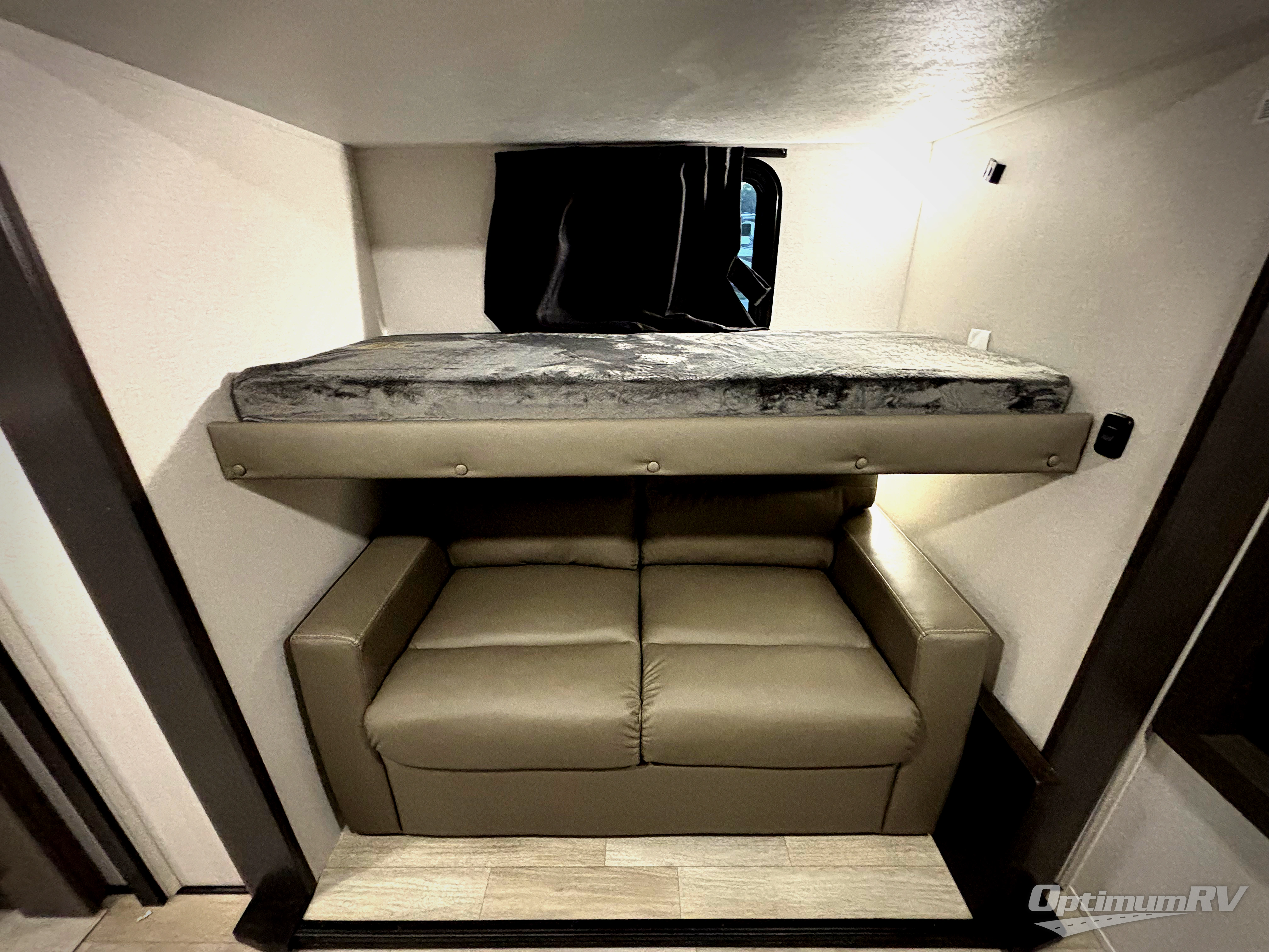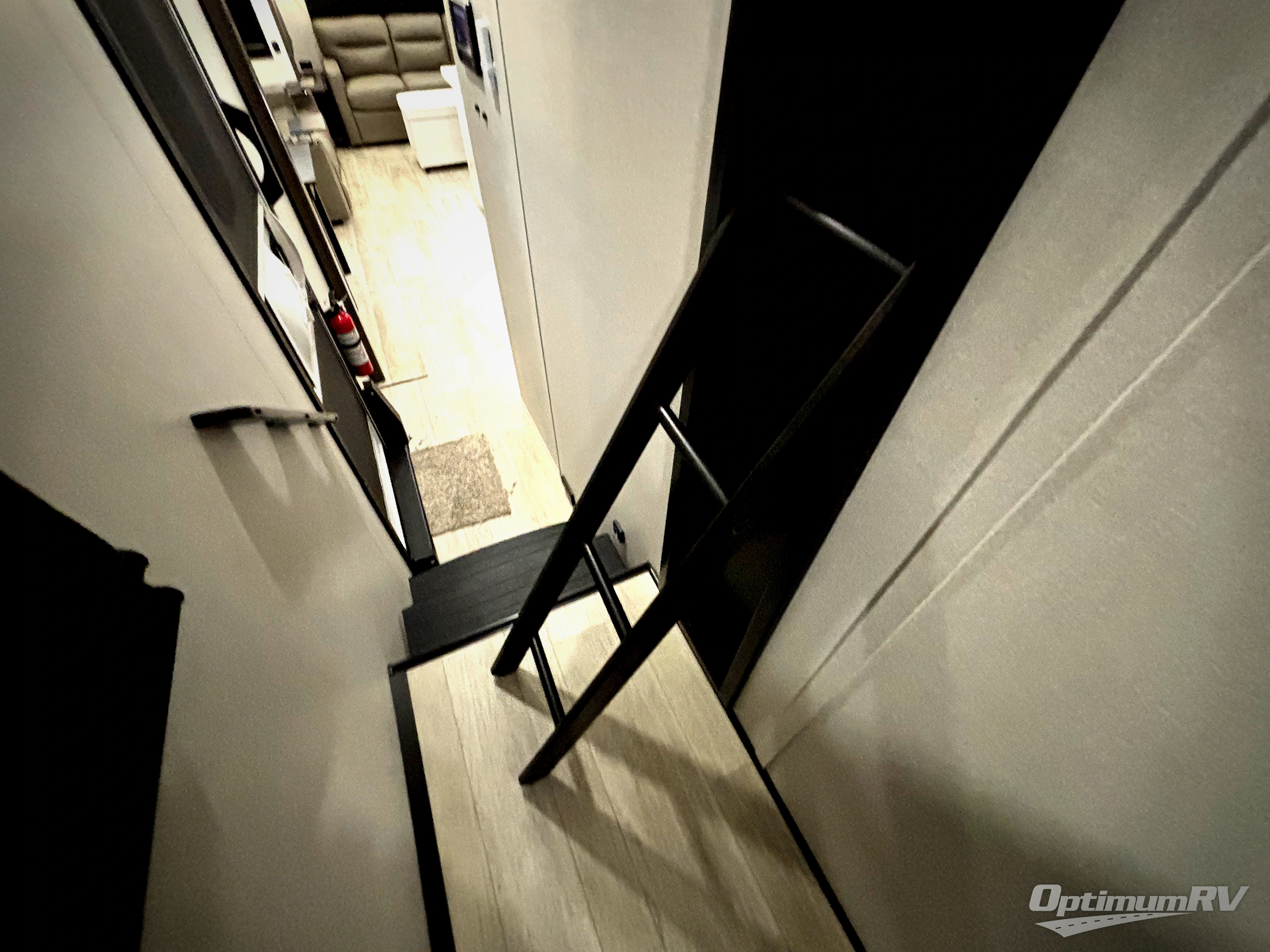 At the front of the unit, the private bedroom offers a retreat with a spacious 72" x 80" king bed, a wardrobe with drawers and a built-in hamper, and a dresser with a TV above, providing ample storage for clothing and essentials. Down the hall, the full bathroom features a 36" x 48" shower with a comfortable seat for added accessibility and relaxation. At the center of the unit, the versatile den serves perfectly as both an office and an additional sleeping area. It includes a 60" tri-fold sofa with a flip-up bunk above, a removable table for work or leisure, and across the room, a 60" x 74" Murphy bed complemented by a desk, shelves, and even a loft above, ideal for accommodating guests or creating a productive workspace on the road. Toward the rear, the open concept living area expands with dual opposing slides for a spacious and inviting atmosphere. One slide features the fully equipped kitchen with a hidden pantry, shelving for dry goods, a convection microwave with a built-in air fryer, a 21-cu. ft. refrigerator, and a 24" range. At the center, the kitchen island includes a sink and a pull-out cutting board, making meal prep both easy and enjoyable. Opposite the kitchen, you’ll find a theater seat and a roll-top dining table perfect for lounging or dining, while at the very back, a 78" sofa provides extra seating or converts into additional sleeping space when needed.