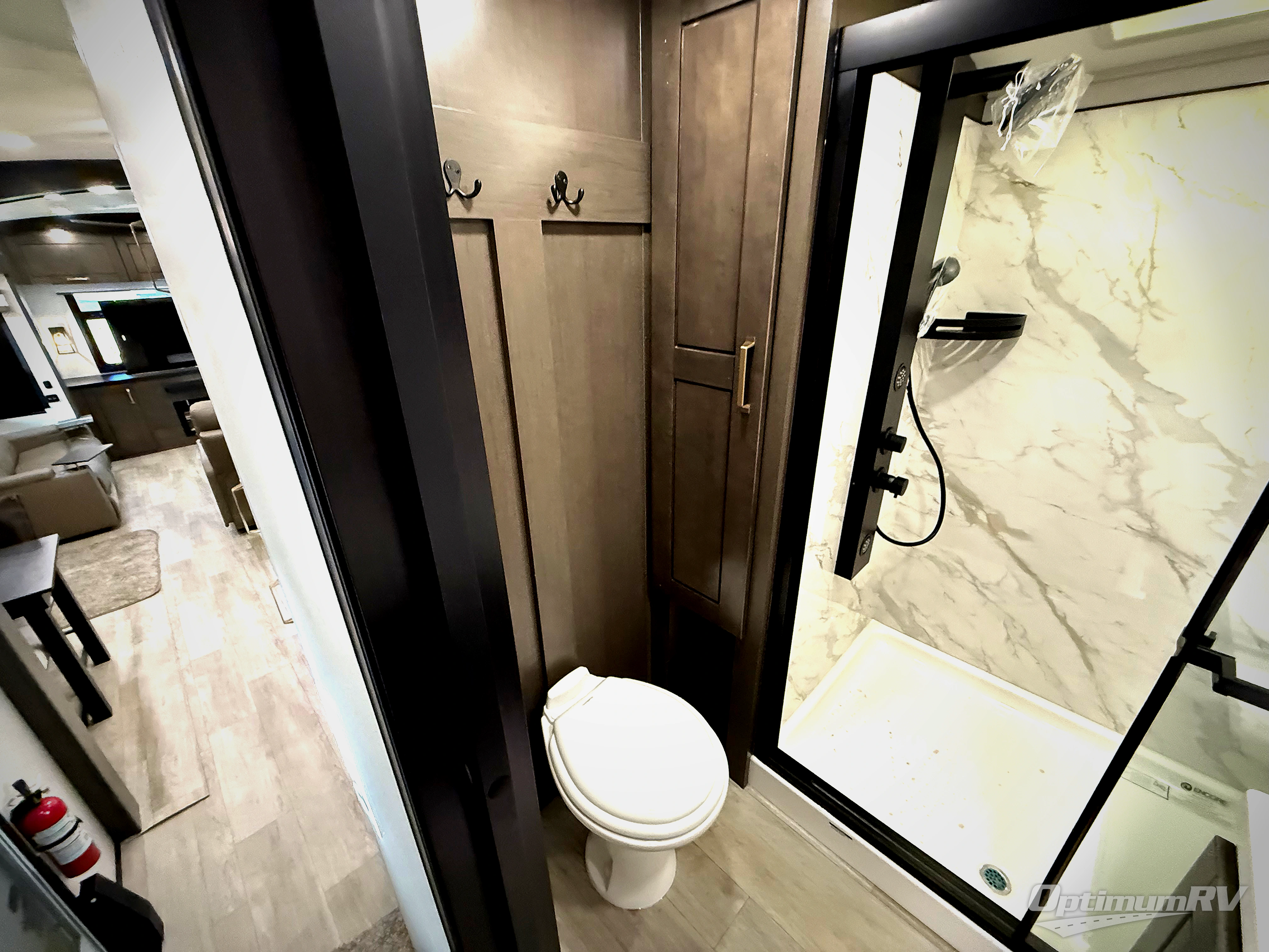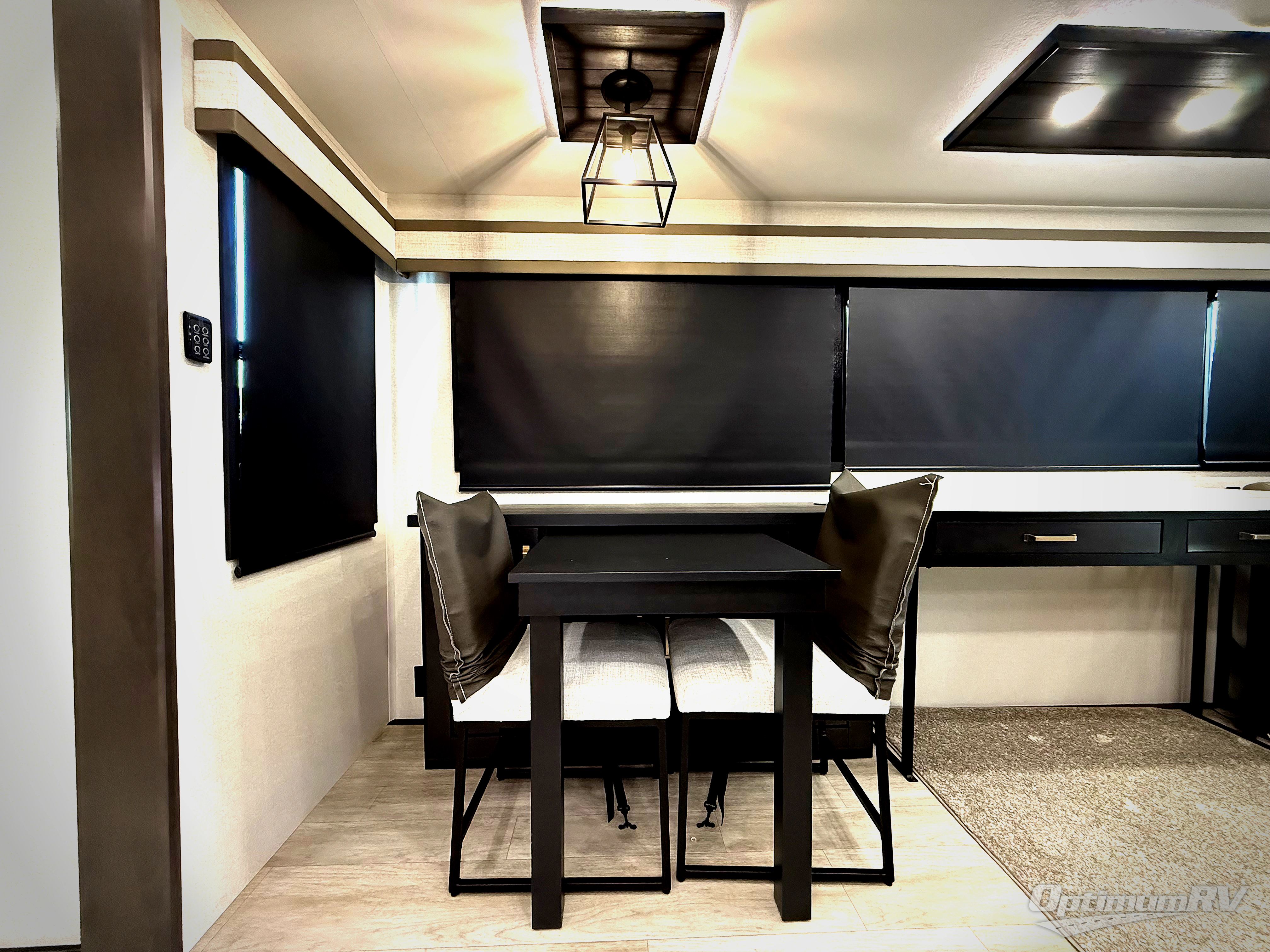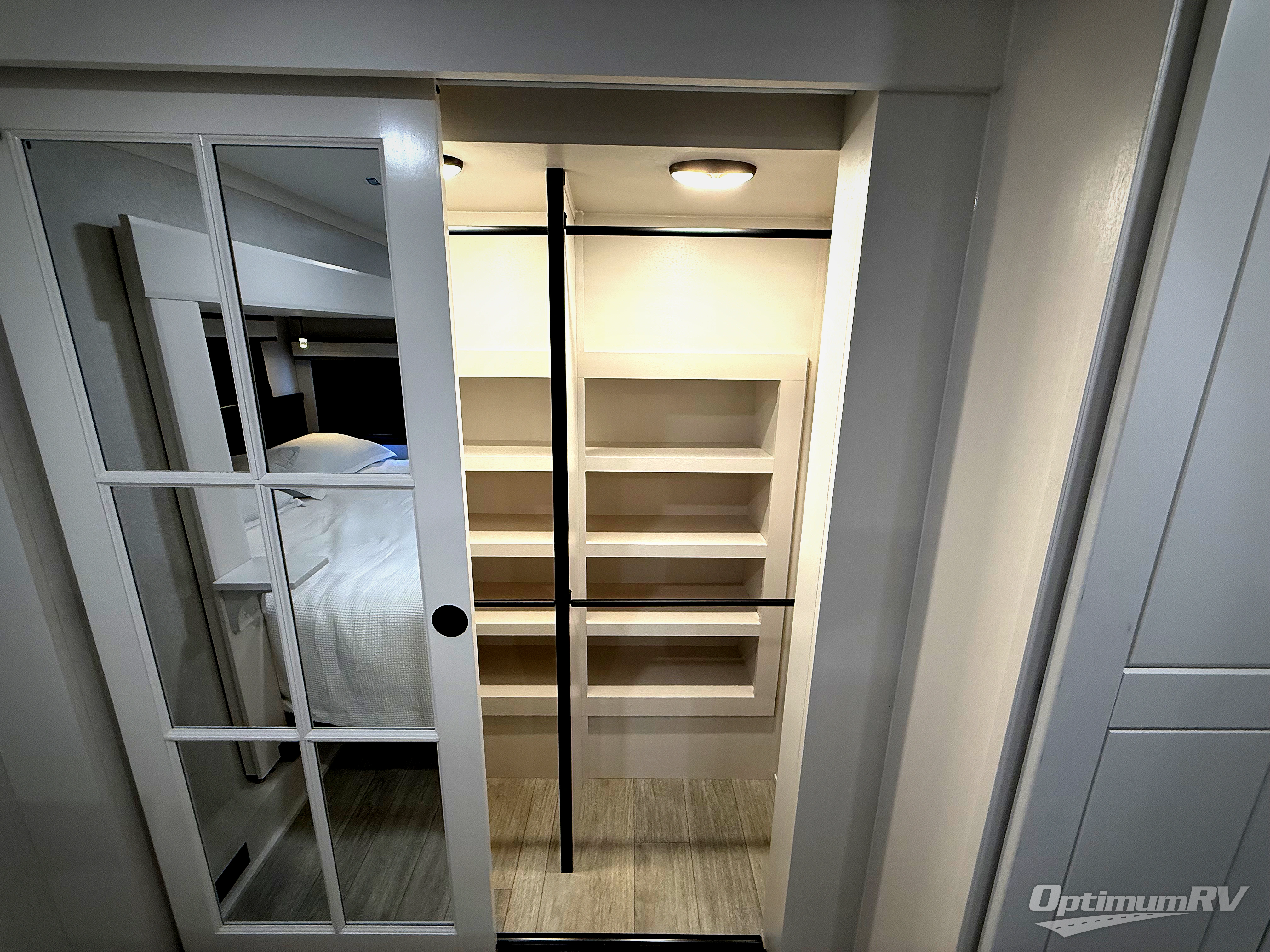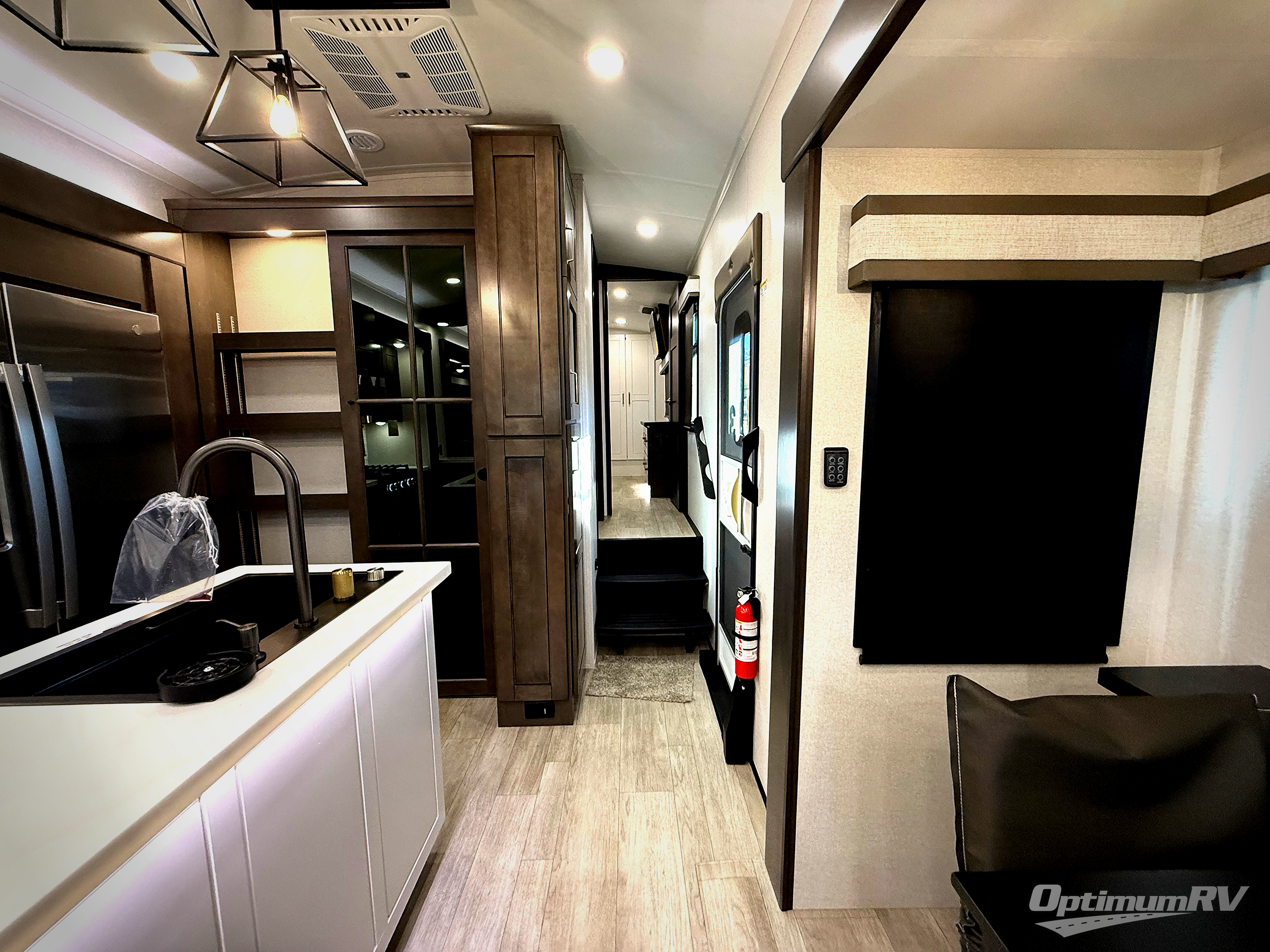 At the front of this 38RE layout, you’ll find a private bedroom featuring a spacious 72" x 80" king bed slide-out, creating a comfortable retreat to rest and recharge. The room also includes a wardrobe and dresser with a TV above, providing ample storage for clothing and essentials. Moving down the hall, the full bathroom offers both comfort and convenience with its 36" x 48" shower complete with a built-in seat for accessibility, plus linen shelves for added storage. At the heart of the unit, the kitchen is thoughtfully designed with everything needed to cook in comfort, including a pantry, a pull-out cutting board in the island, and a 21-cu. ft. refrigerator. Meal preparation is a breeze with the 24" range or the convection microwave featuring a built-in air fryer. Across from the kitchen, the large slide-out hosts a roll-out table perfect for dining or game nights, as well as a desk/coffee bar and cozy theater seating. At the rear, the entertainment center stands out with a TV lift and fireplace, while the L-shaped lounge and additional theater seat create the ultimate space to relax and enjoy movie nights in style.
