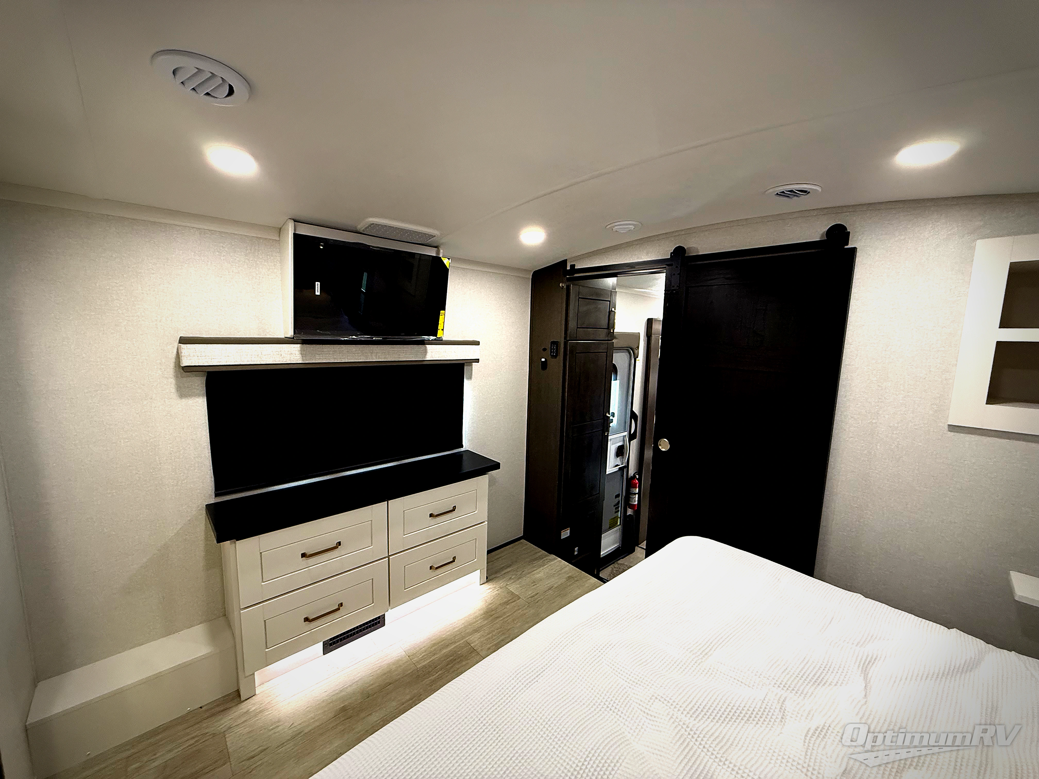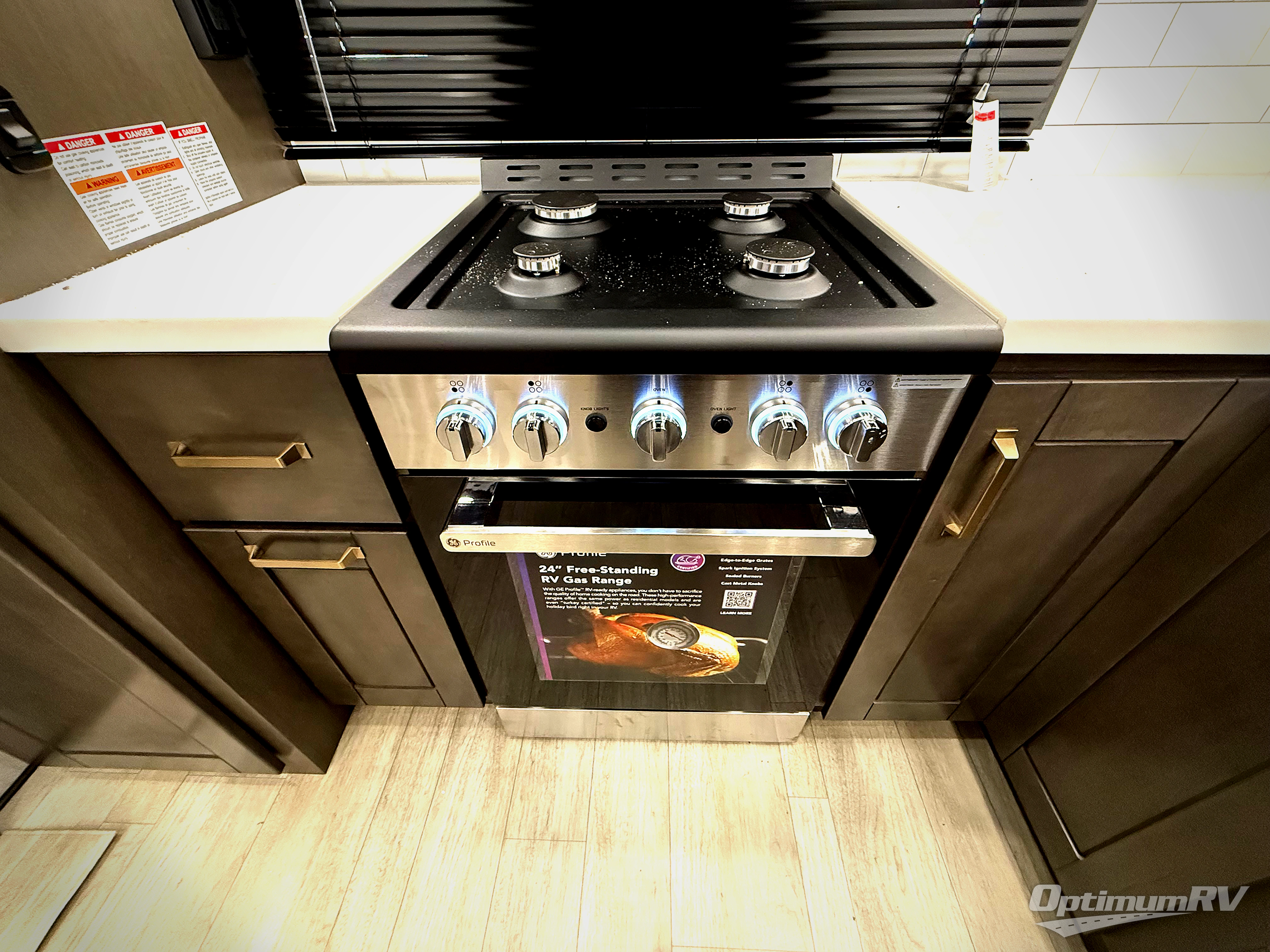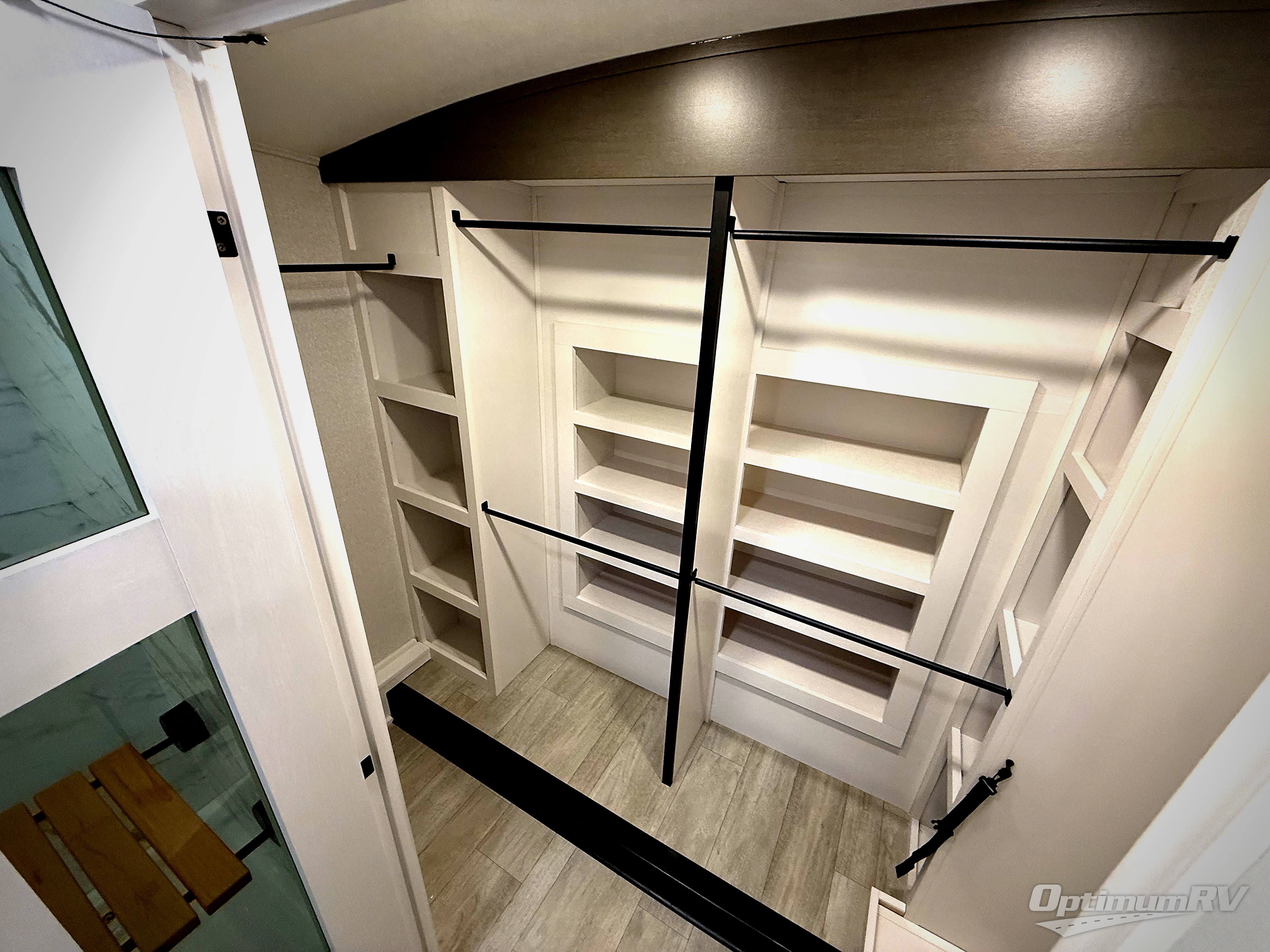 Starting from the back, this impressive 39RK features a rear kitchen designed in a convenient U-shape for easy accessibility and efficient meal prep. The kitchen is fully equipped with plenty of overhead cabinets, a convection microwave with an air fryer, a 24" range, and a pull-out pantry, perfect for the chef on the trip to cook in comfort. Across the kitchen, the large slide-out houses a 21-cu. ft. refrigerator and a second pantry with shelves, providing even more space to store groceries, snacks, and coffee essentials. The nearby desk/coffee bar and roll-out table create an inviting area to enjoy meals or unwind with a cup of coffee. The living area offers a spacious 100" L-shaped sofa and a theater seat facing the TV and fireplace, making it an ideal spot for relaxing or hosting movie nights. Moving forward, you’ll find a convenient half bathroom with linen shelves for added storage and accessibility. At the front, the private bedroom features a 72" x 80" king bed in a slide-out with a dresser across for ample storage. Finally, the full bathroom at the very front includes a 30" x 61" shower with a seat for comfort, a large sink, and a walk-in closet that provides generous space for all your clothing and gear.