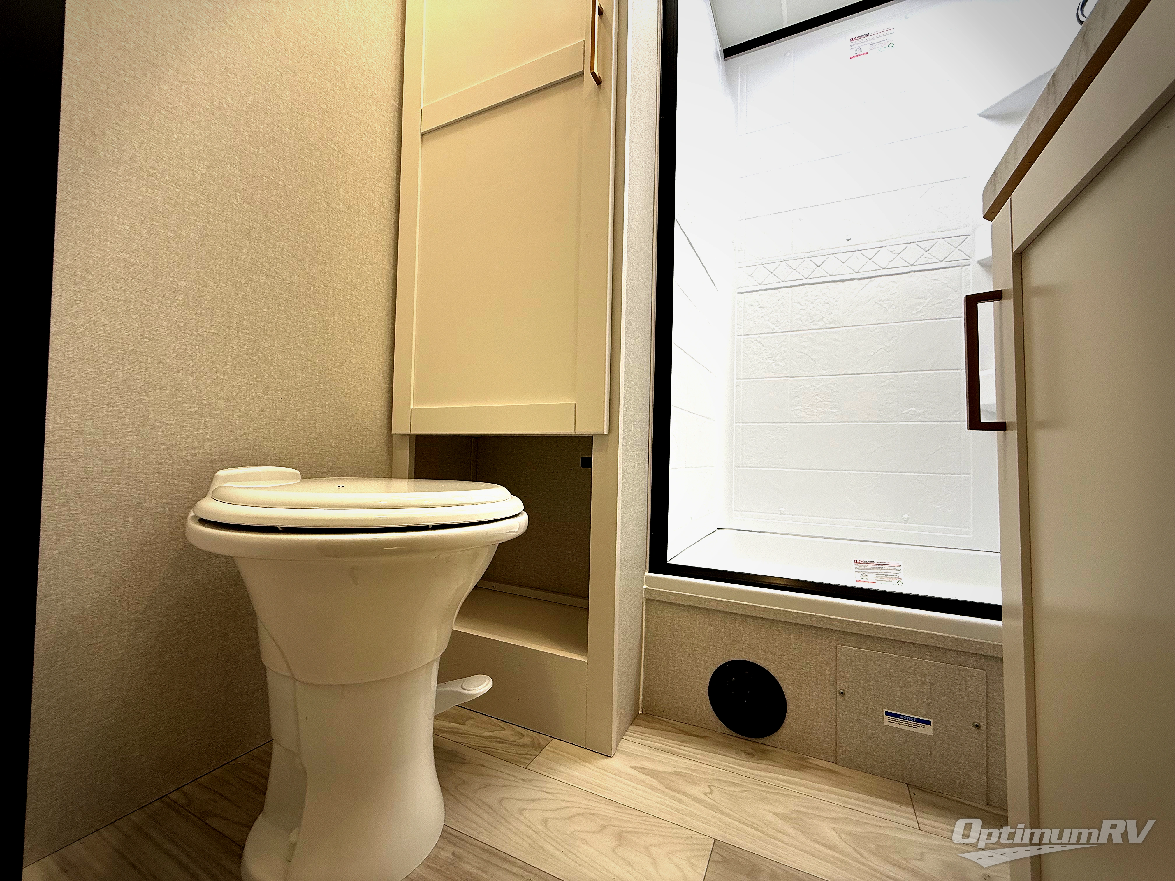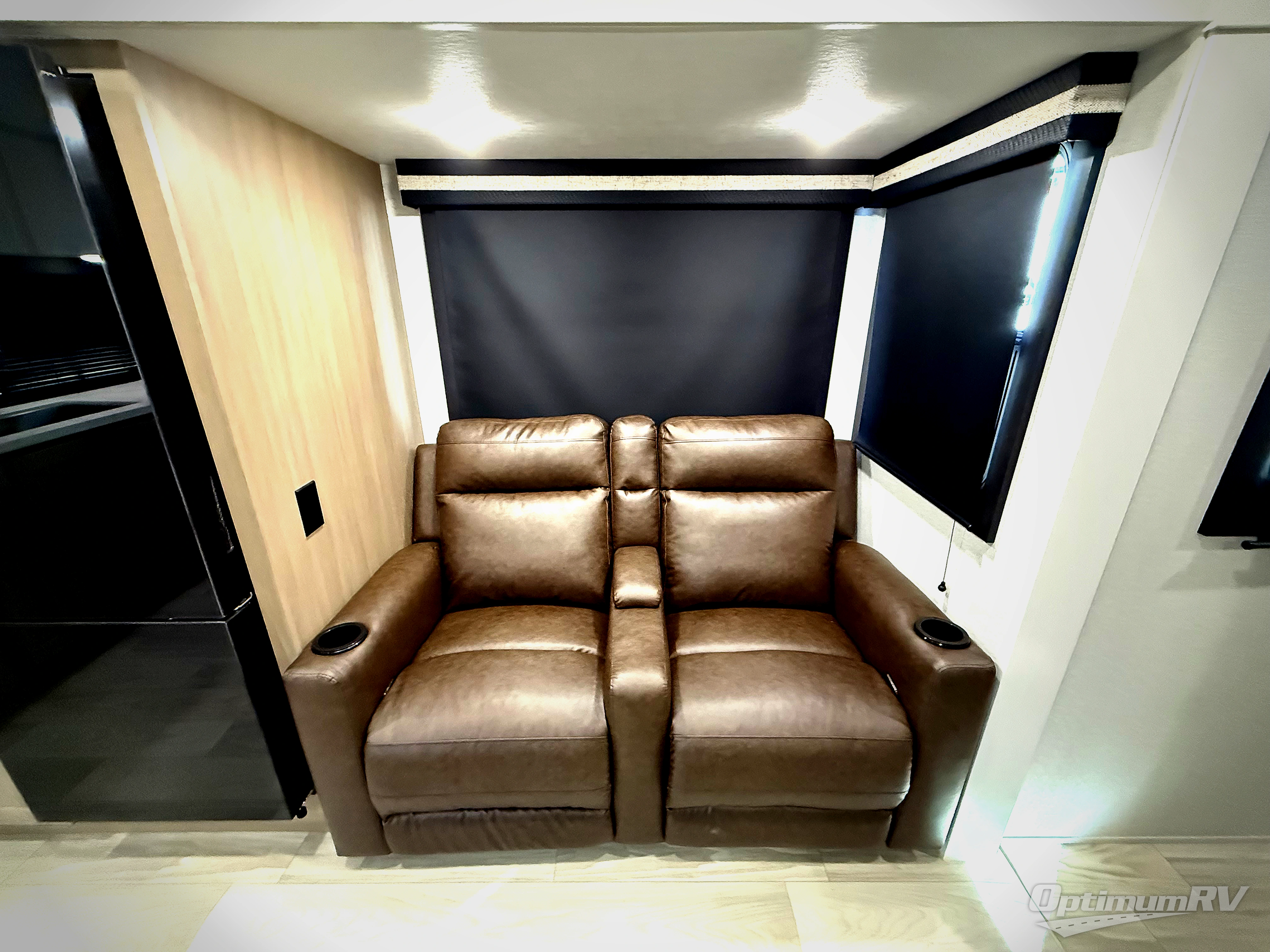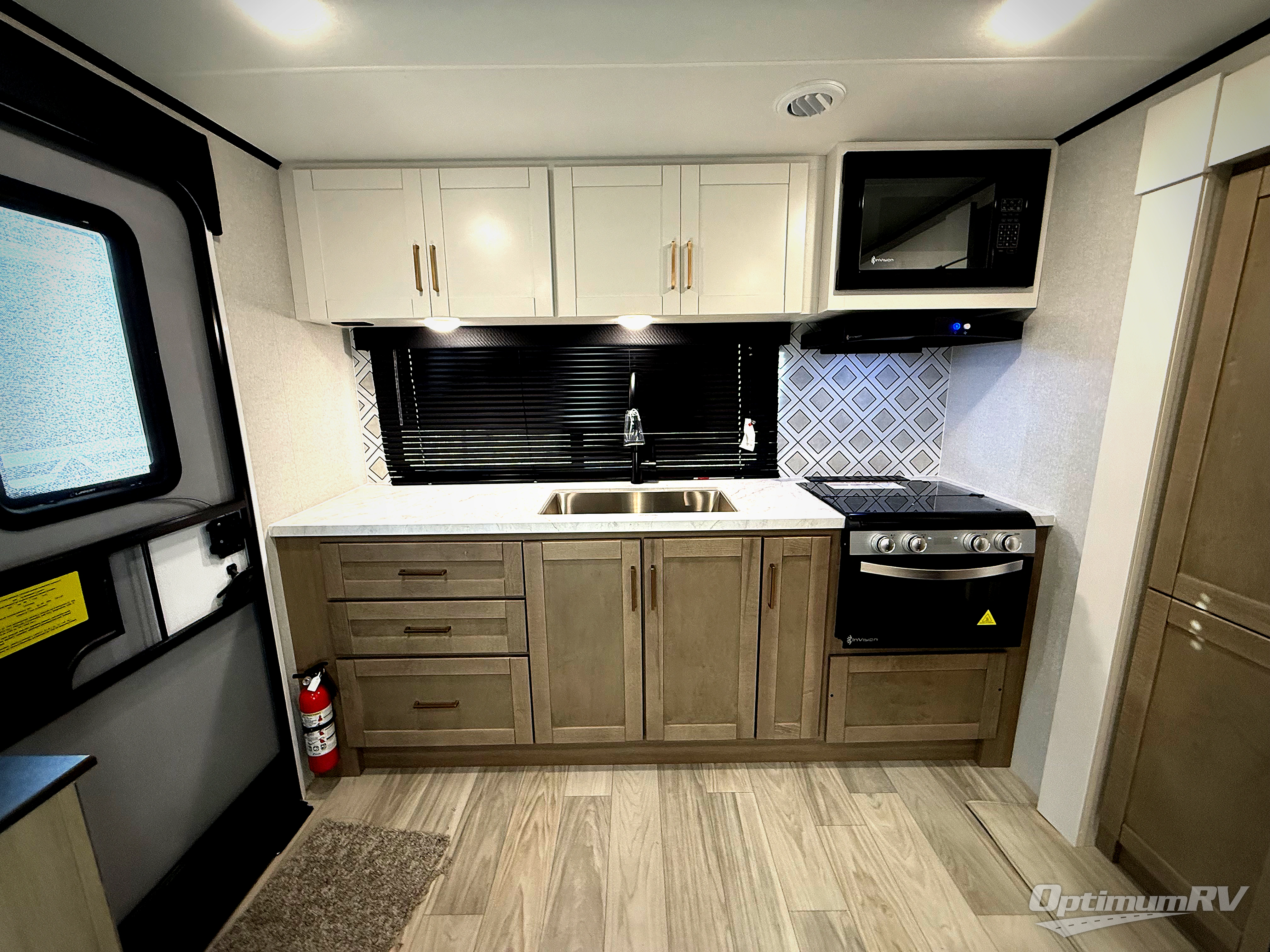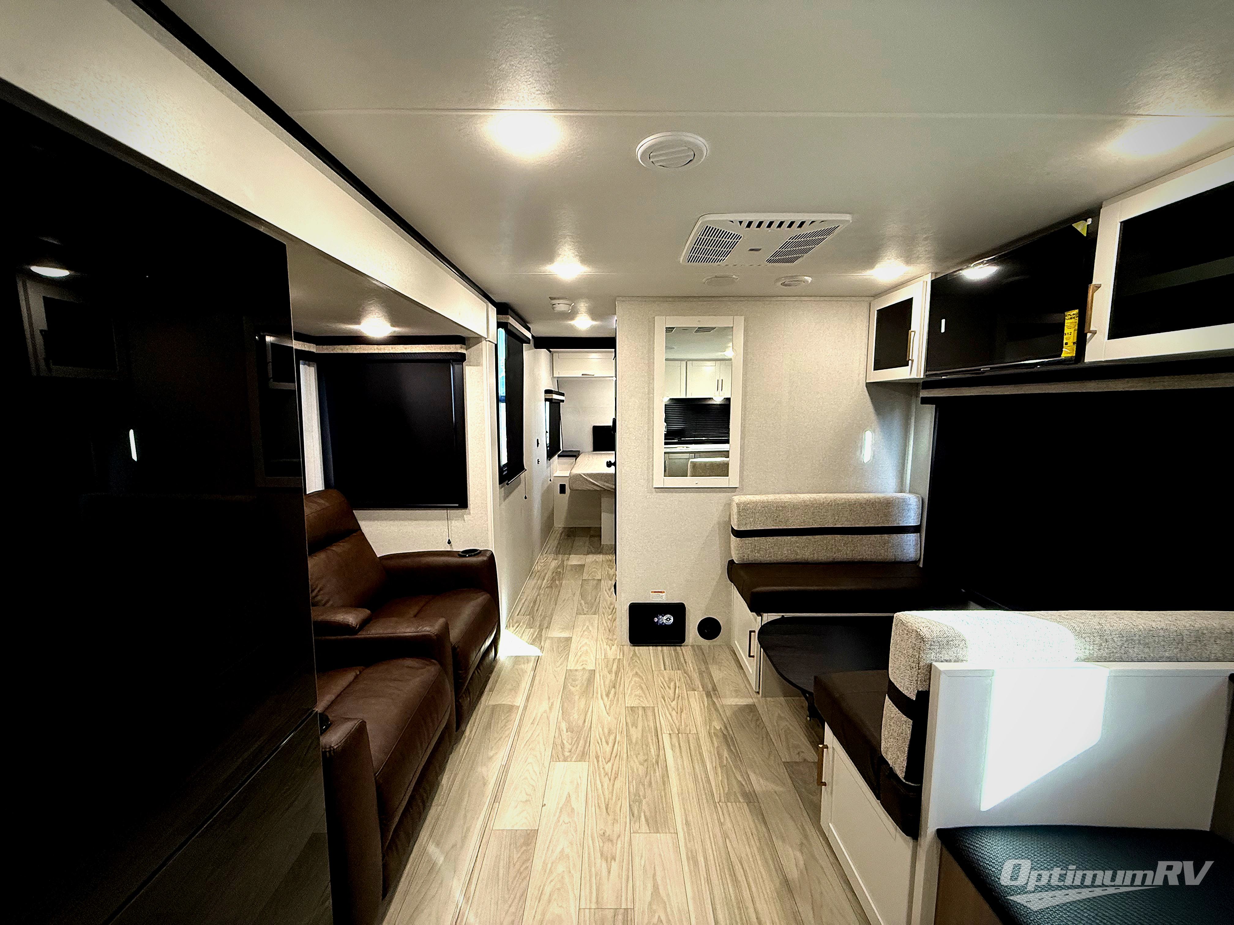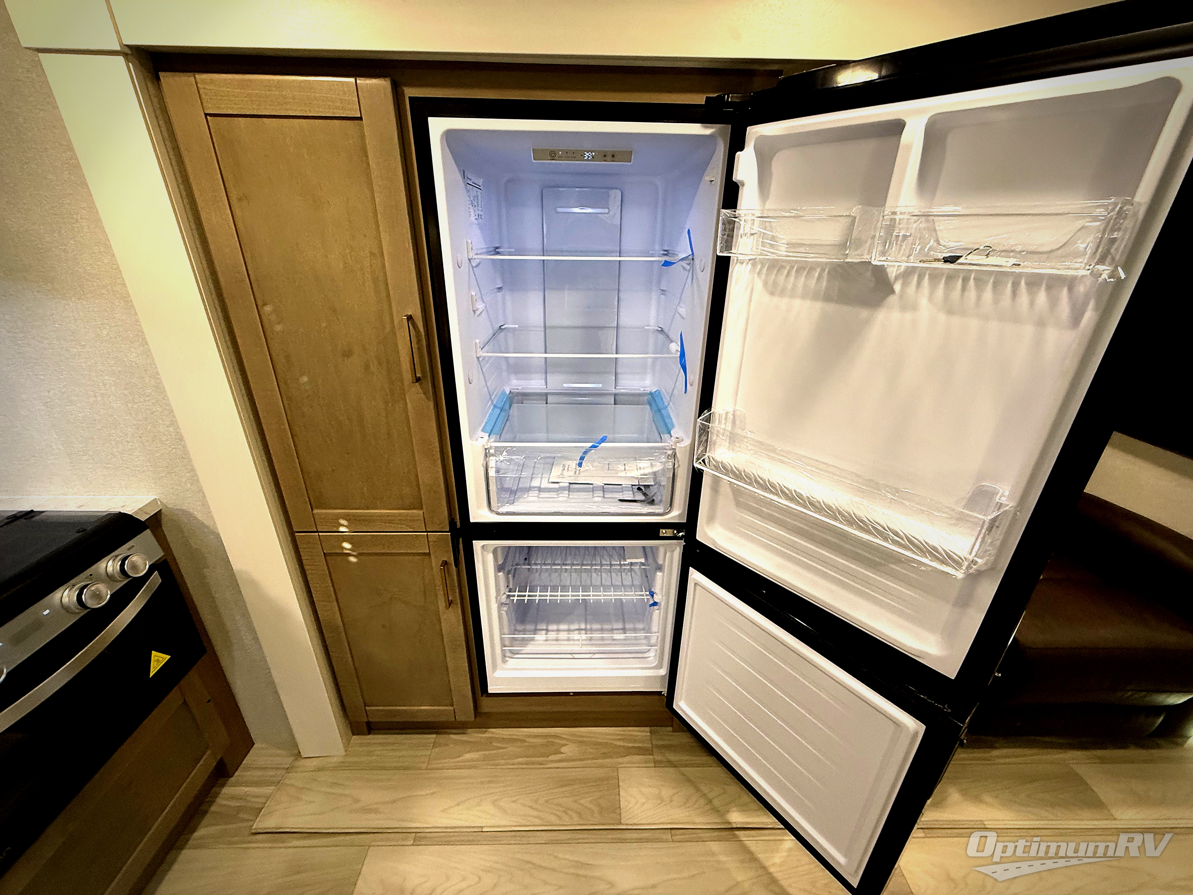 At the front of this travel trailer, you'll find a private bedroom featuring a spacious 60" x 80" queen bed, complete with pull-out nightstands and wardrobes on each side for convenient storage of clothes and essentials. One of the two entry doors is located here, providing added privacy and easy access. Moving down the hall, the full bathroom offers a 30" x 36" shower, a porcelain foot-flush toilet, and a linen cabinet to keep towels and hygiene items neatly organized. In the main living area, you can enjoy meals or game nights at the 38" x 68" booth dinette, while the 60" theater seat in the slide-out provides a cozy spot to relax. At the rear, the kitchen spans the full width of the trailer and includes a stainless-steel single-basin sink with a high-rise pullout faucet and butcher block cutting board, a three-burner range, and generous seamless countertops. Also, in the slide-out are a pantry and an 11-cu. ft. refrigerator, giving you plenty of room to store food, snacks, and leftovers for the whole trip. The second entry door is located in between the kitchen and dinette for your convenience.