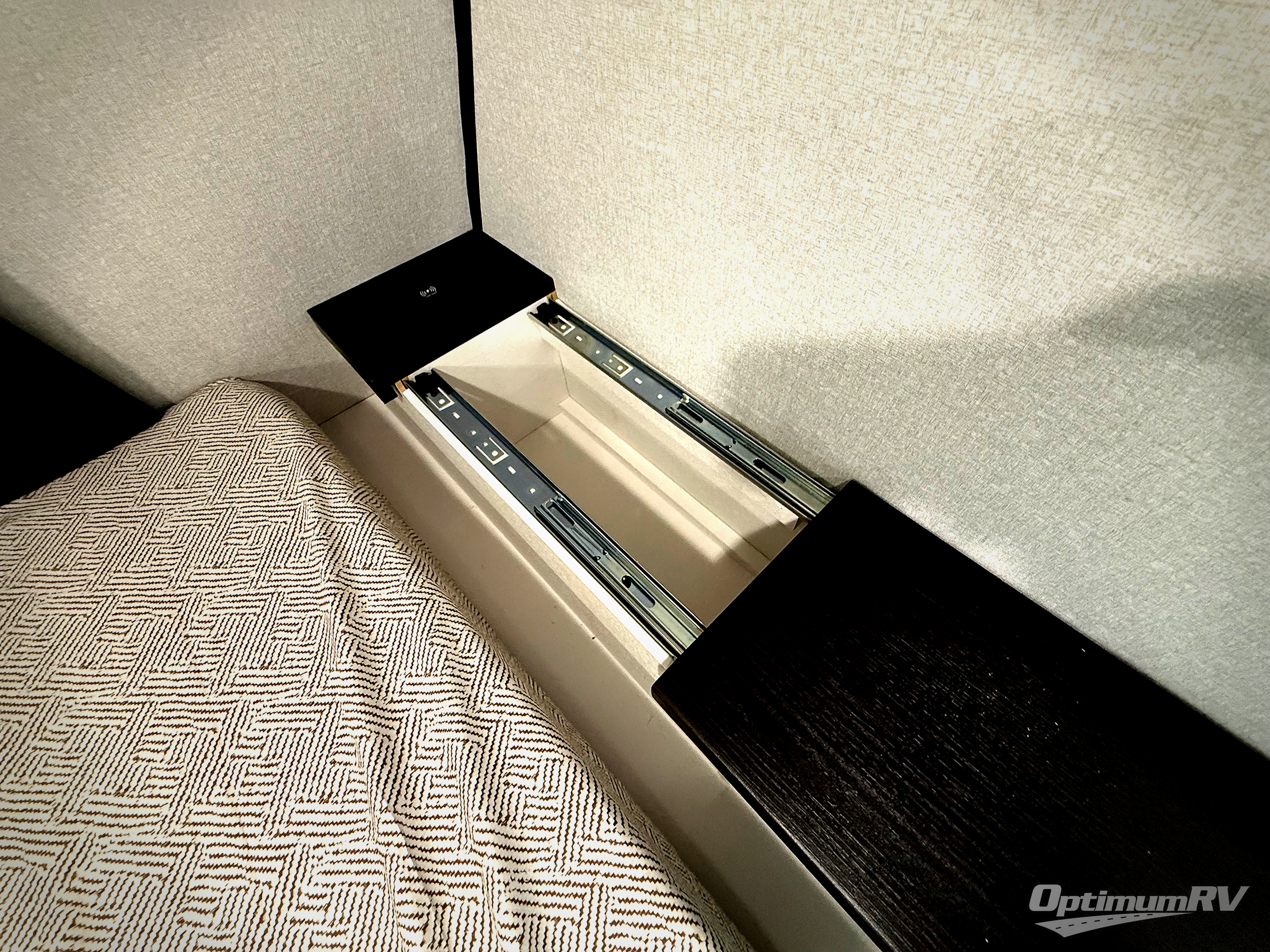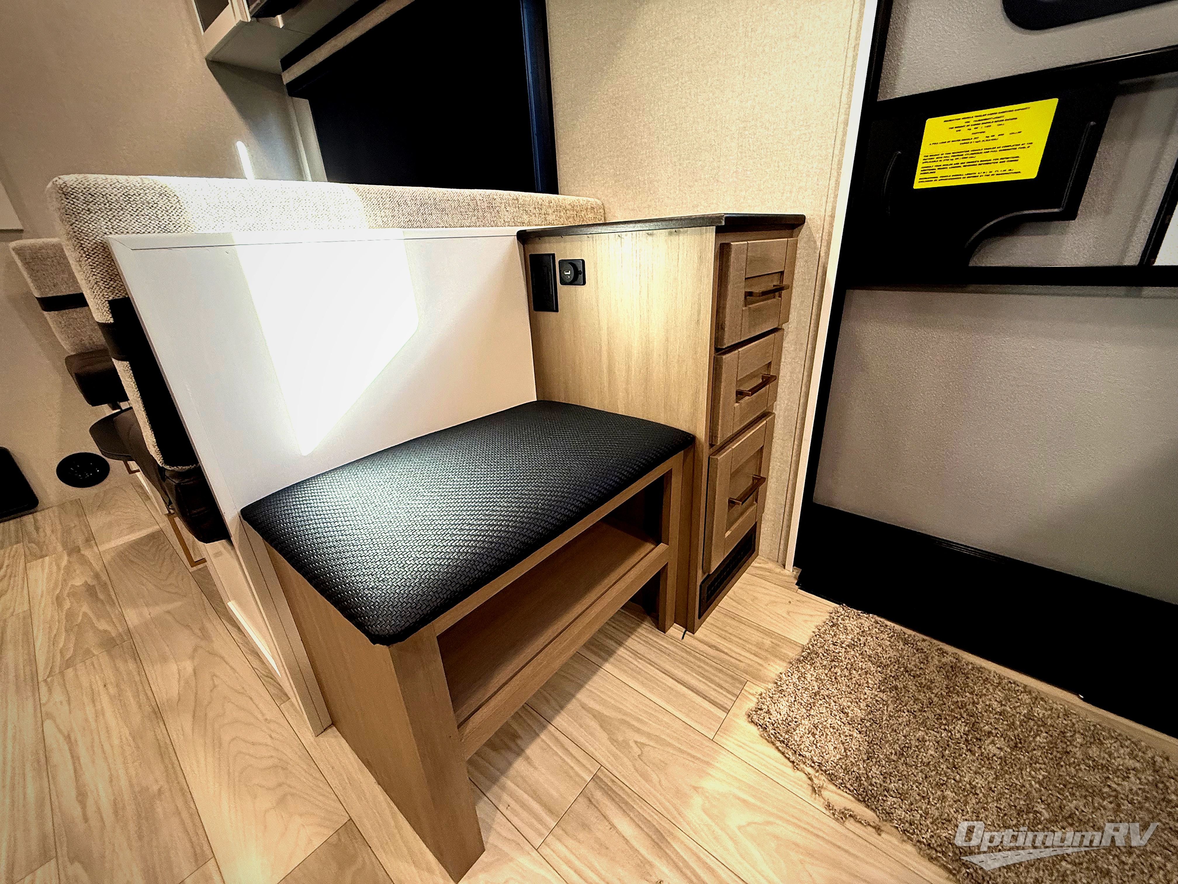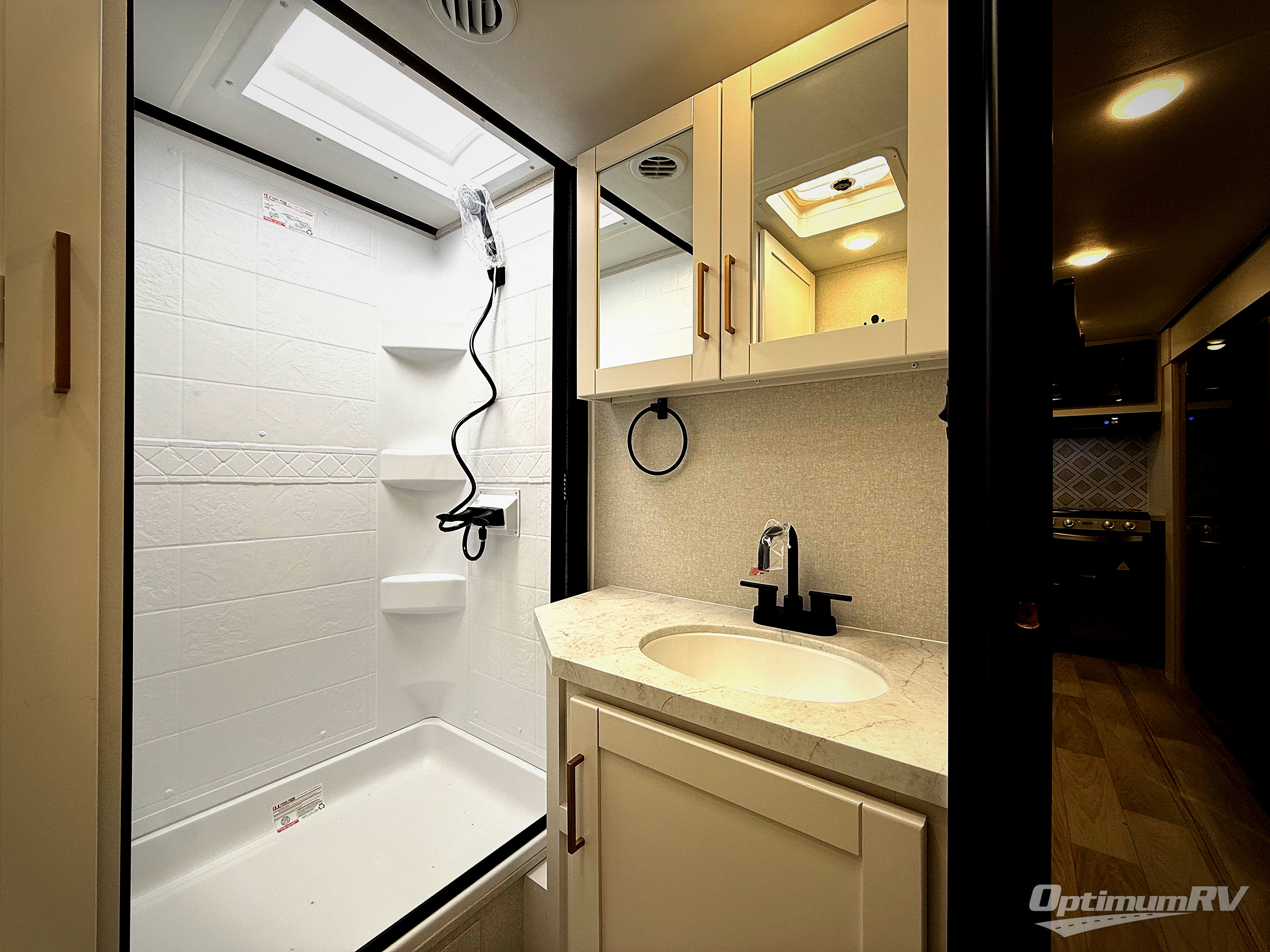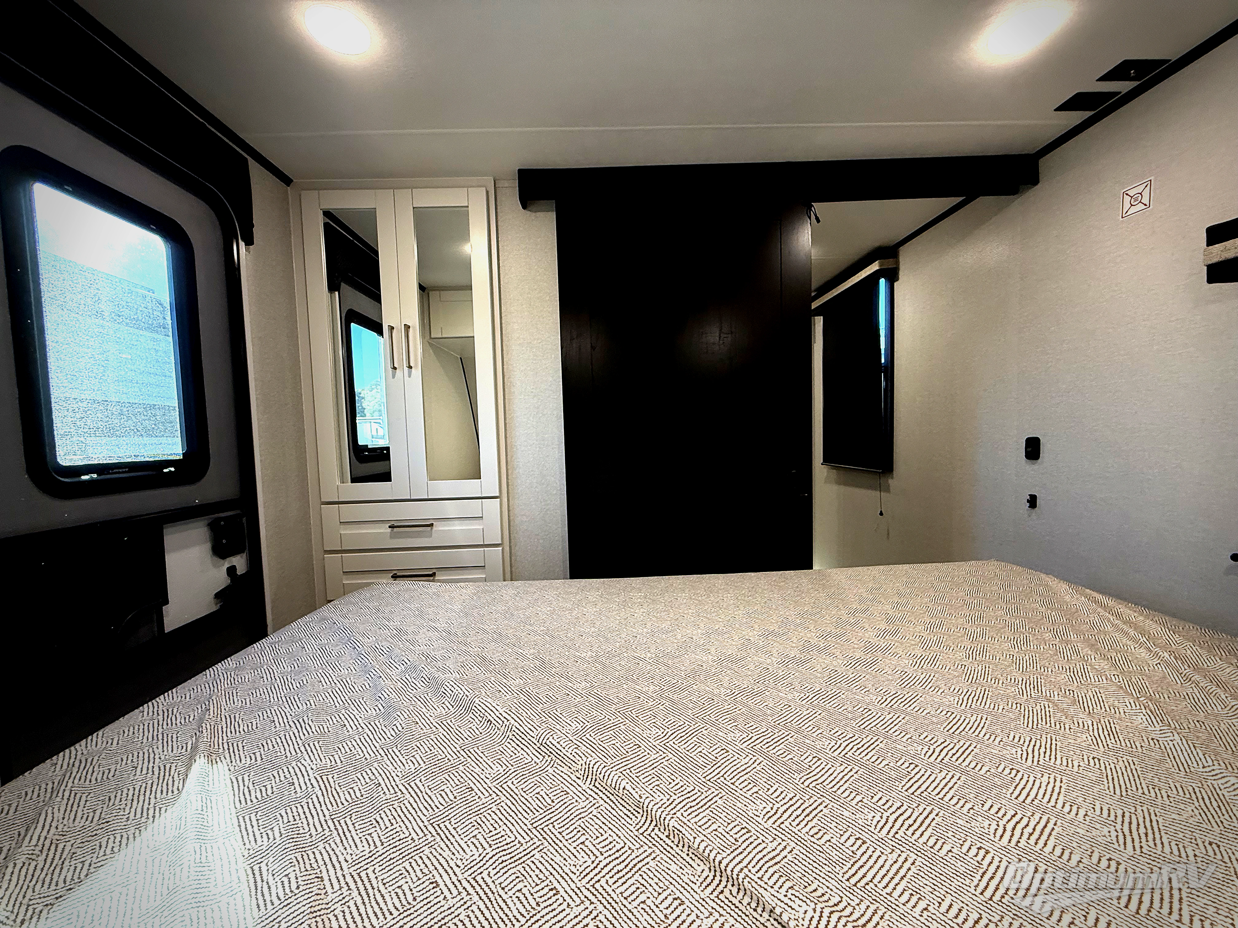 At the front of this travel trailer, you'll find a private bedroom featuring a spacious 60" x 80" queen bed, complete with pull-out nightstands and wardrobes on each side for convenient storage of clothes and essentials. One of the two entry doors is located here, providing added privacy and easy access. Moving down the hall, the full bathroom offers a 30" x 36" shower, a porcelain foot-flush toilet, and a linen cabinet to keep towels and hygiene items neatly organized. In the main living area, you can enjoy meals or game nights at the 38" x 68" booth dinette, while the 60" theater seat in the slide-out provides a cozy spot to relax. At the rear, the kitchen spans the full width of the trailer and includes a stainless-steel single-basin sink with a high-rise pullout faucet and butcher block cutting board, a three-burner range, and generous seamless countertops. Also, in the slide-out are a pantry and an 11-cu. ft. refrigerator, giving you plenty of room to store food, snacks, and leftovers for the whole trip. The second entry door is located in between the kitchen and dinette for your convenience.