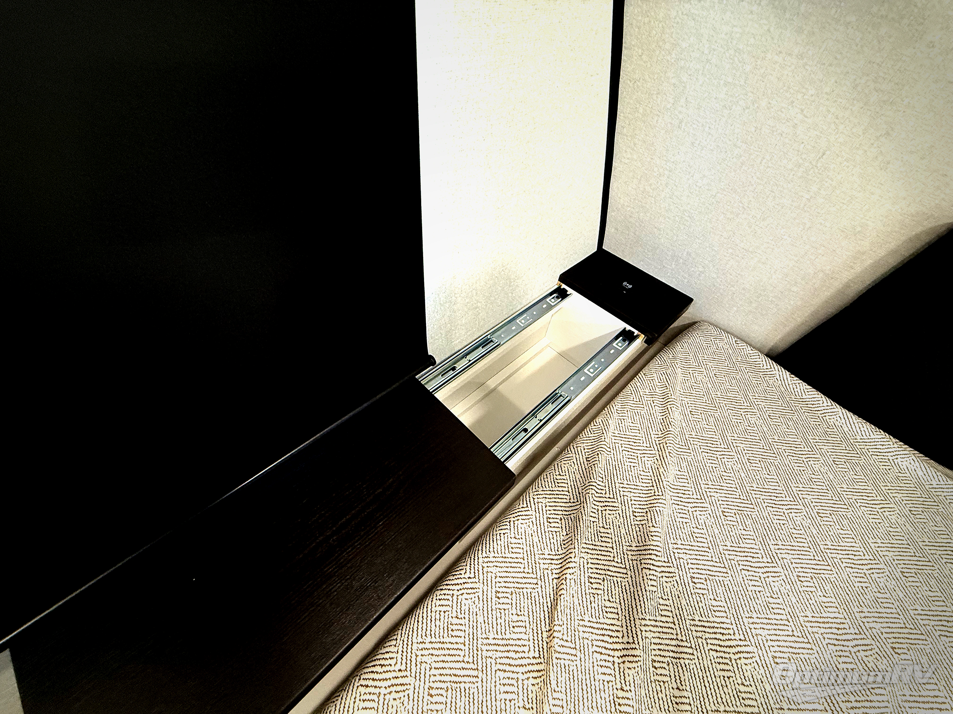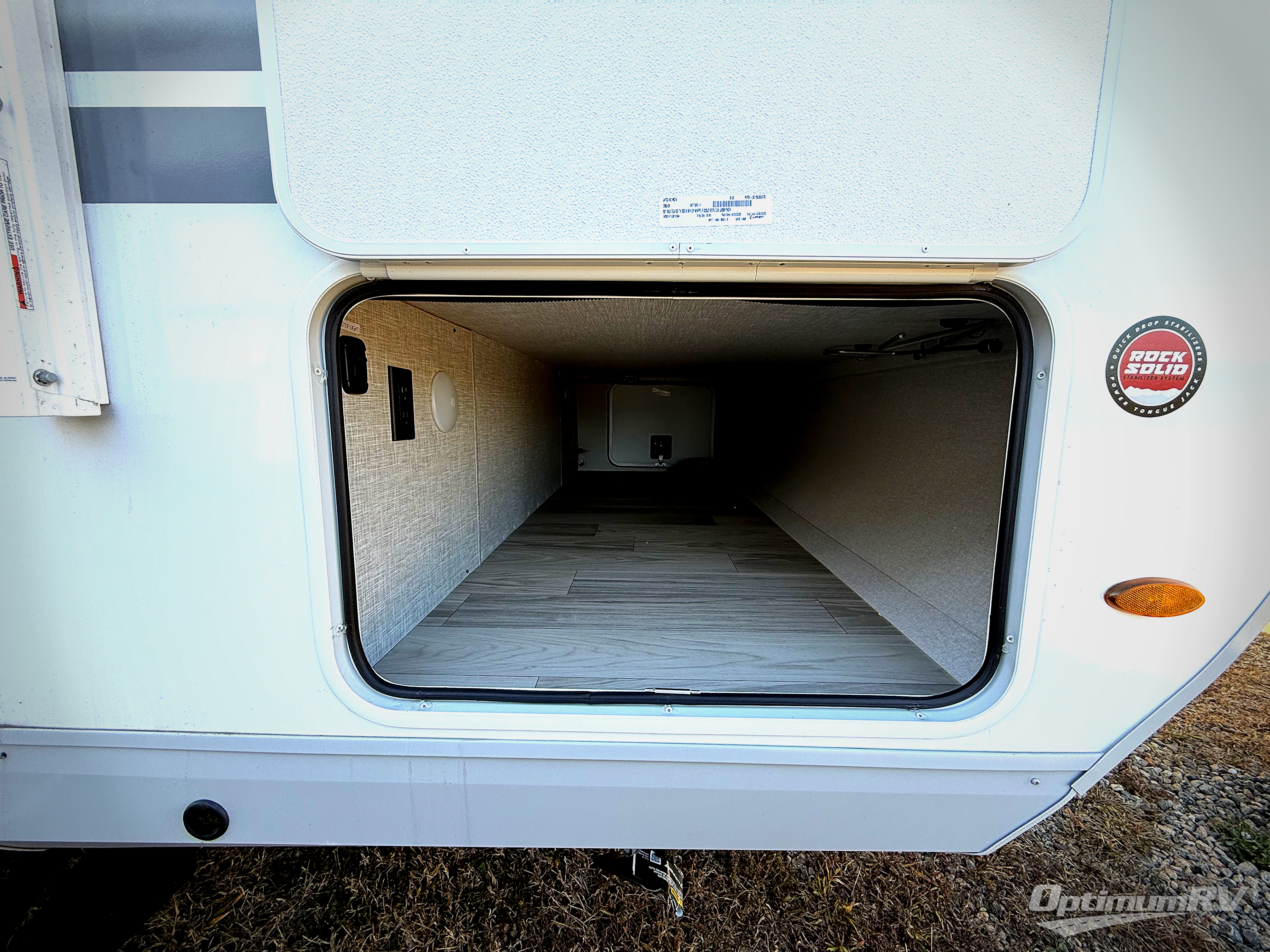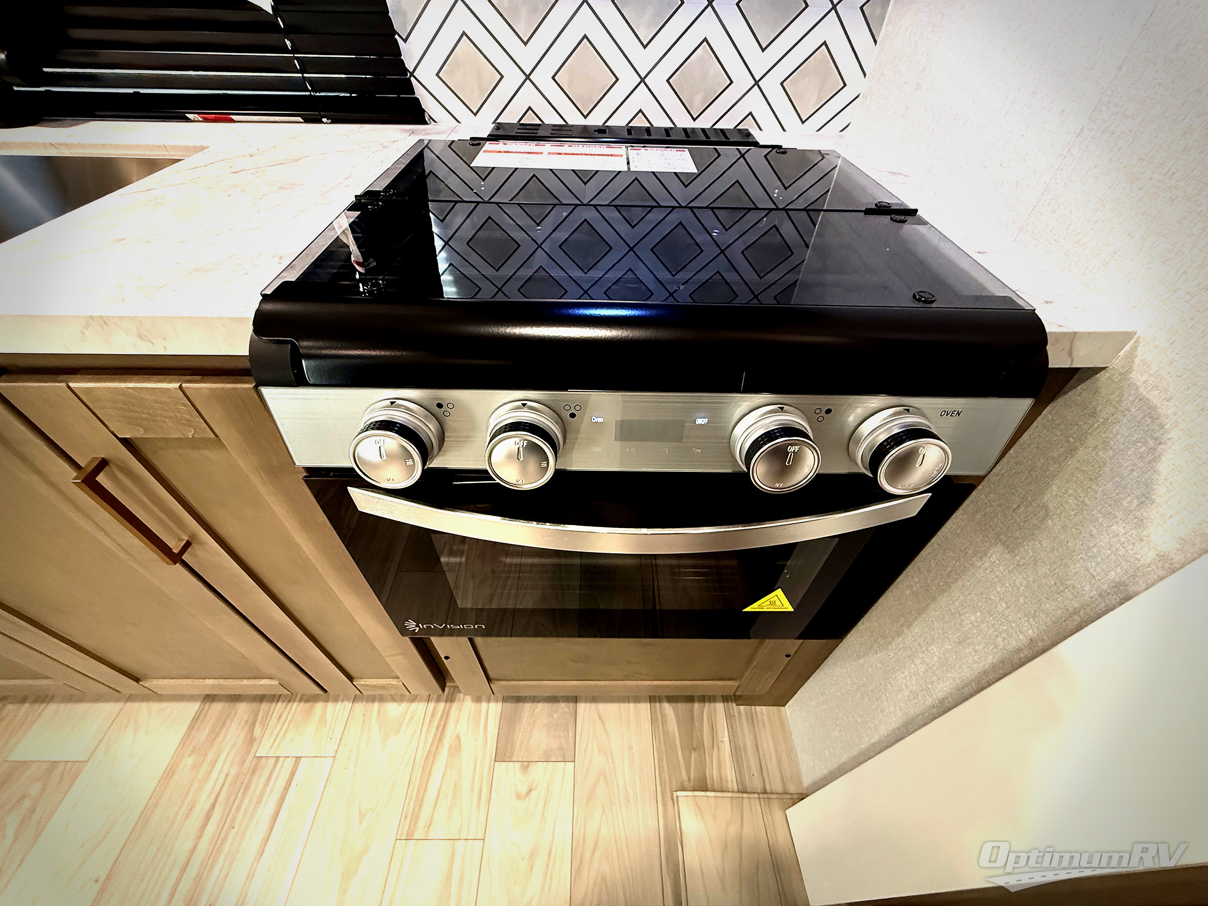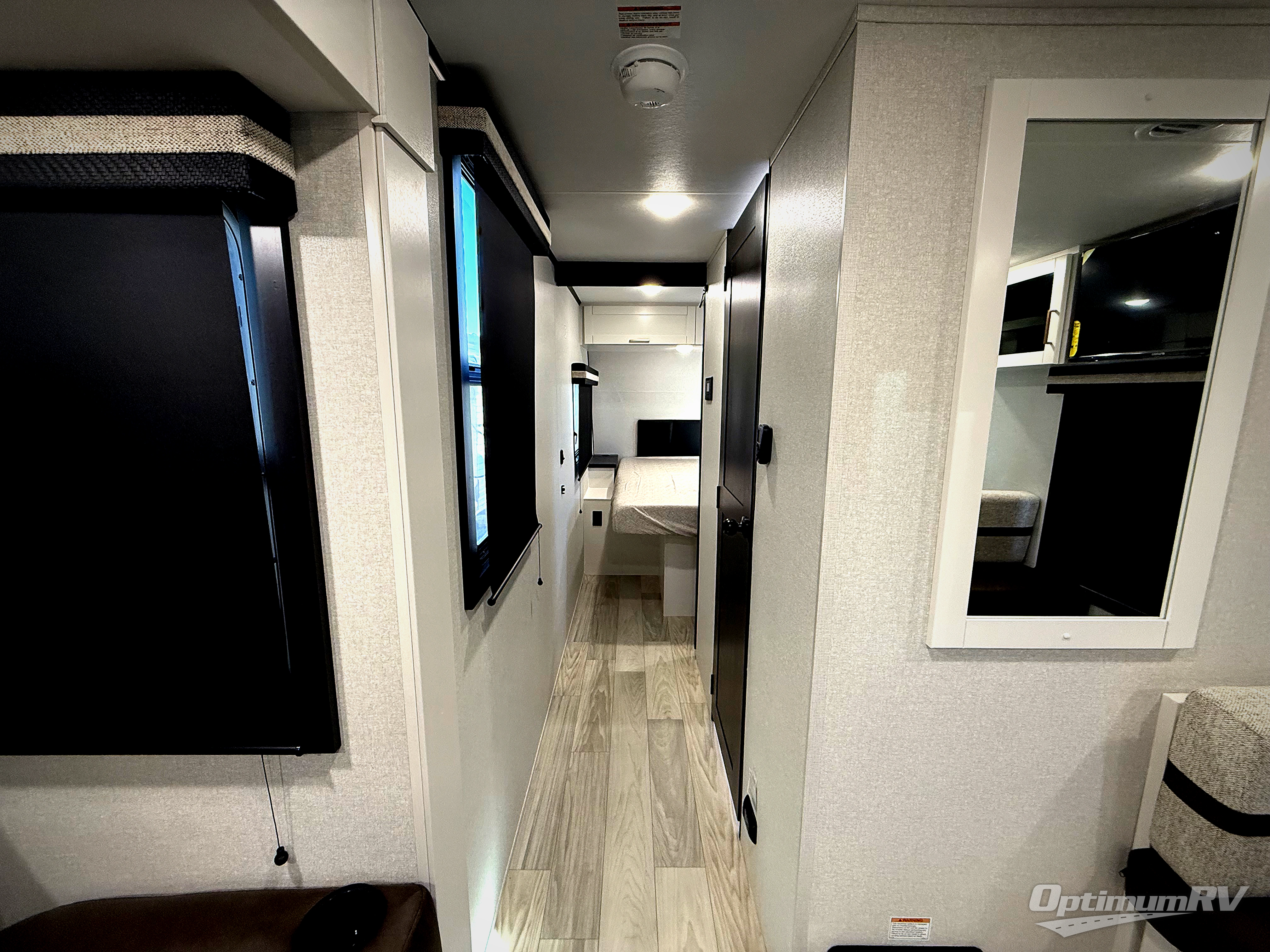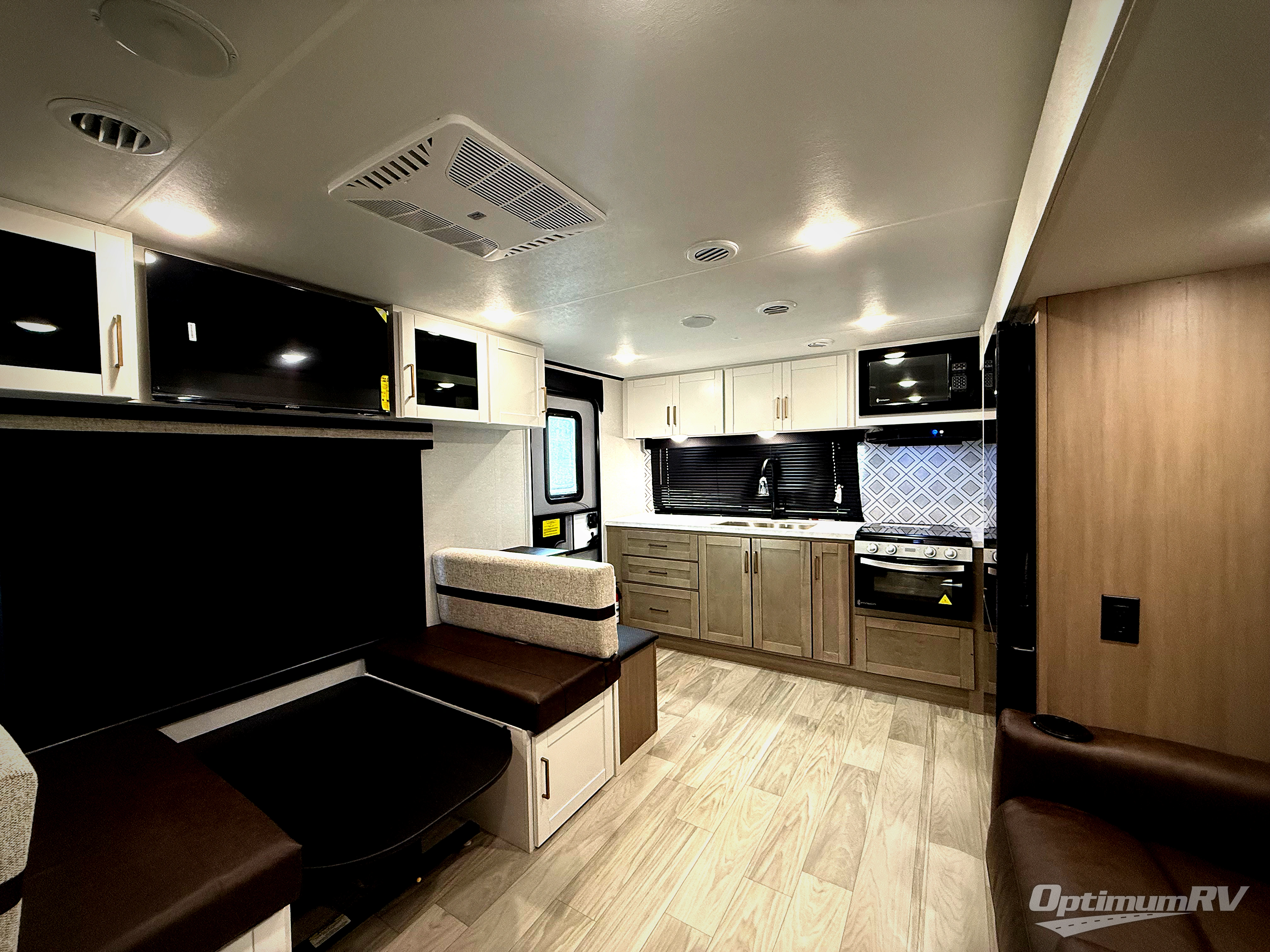 At the front of this travel trailer, you'll find a private bedroom featuring a spacious 60" x 80" queen bed, complete with pull-out nightstands and wardrobes on each side for convenient storage of clothes and essentials. One of the two entry doors is located here, providing added privacy and easy access. Moving down the hall, the full bathroom offers a 30" x 36" shower, a porcelain foot-flush toilet, and a linen cabinet to keep towels and hygiene items neatly organized. In the main living area, you can enjoy meals or game nights at the 38" x 68" booth dinette, while the 60" theater seat in the slide-out provides a cozy spot to relax. At the rear, the kitchen spans the full width of the trailer and includes a stainless-steel single-basin sink with a high-rise pullout faucet and butcher block cutting board, a three-burner range, and generous seamless countertops. Also, in the slide-out are a pantry and an 11-cu. ft. refrigerator, giving you plenty of room to store food, snacks, and leftovers for the whole trip. The second entry door is located in between the kitchen and dinette for your convenience.